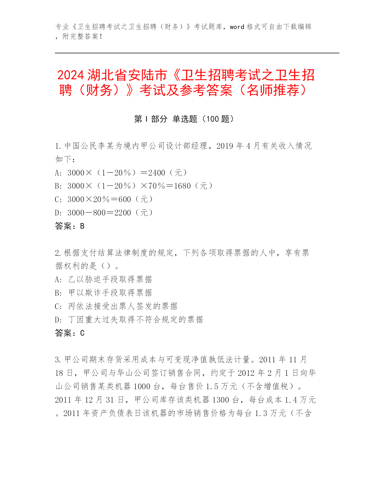 2024湖北省安陆市《卫生招聘考试之卫生招聘(财务)》考试及参考答案(名师推荐)