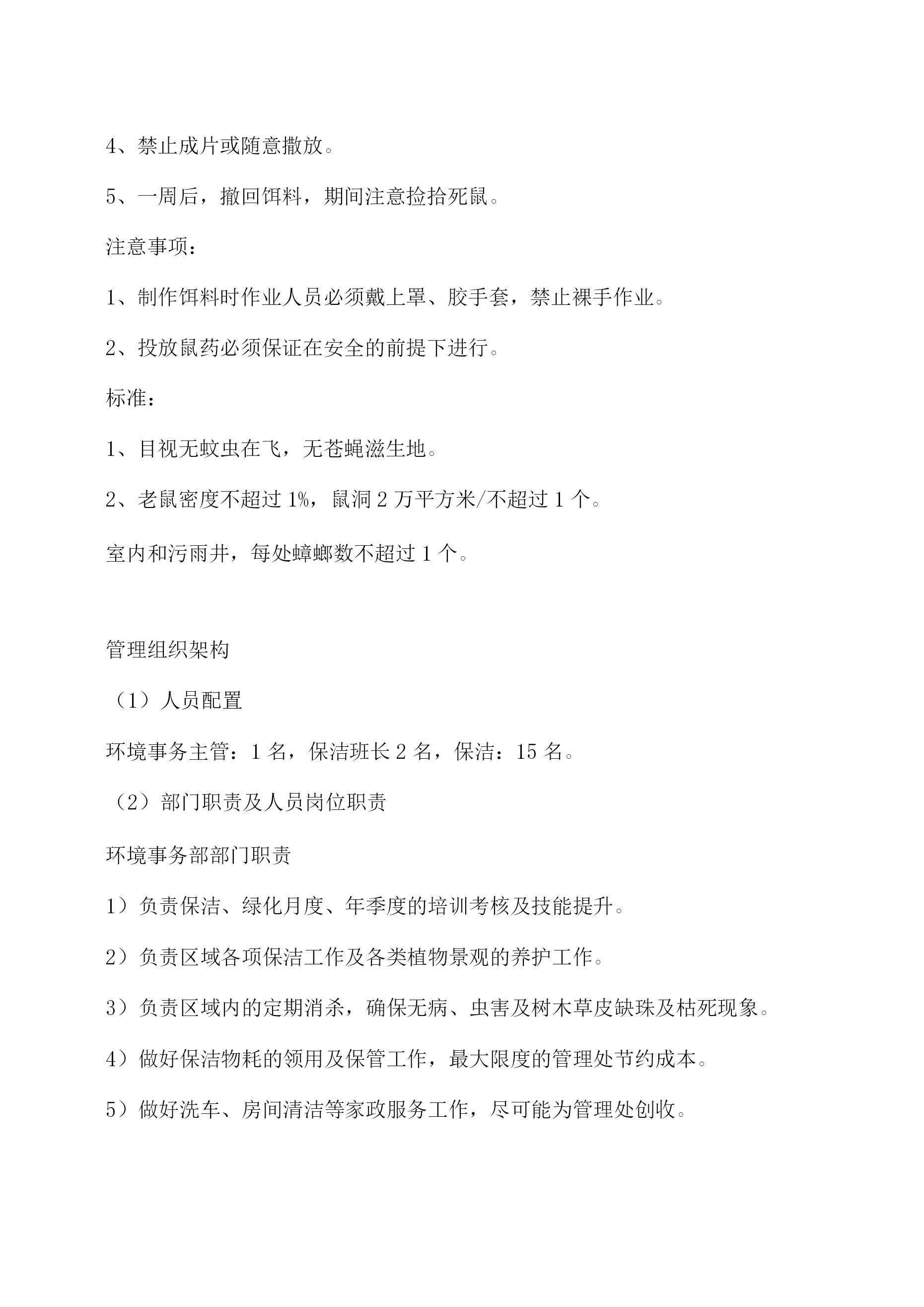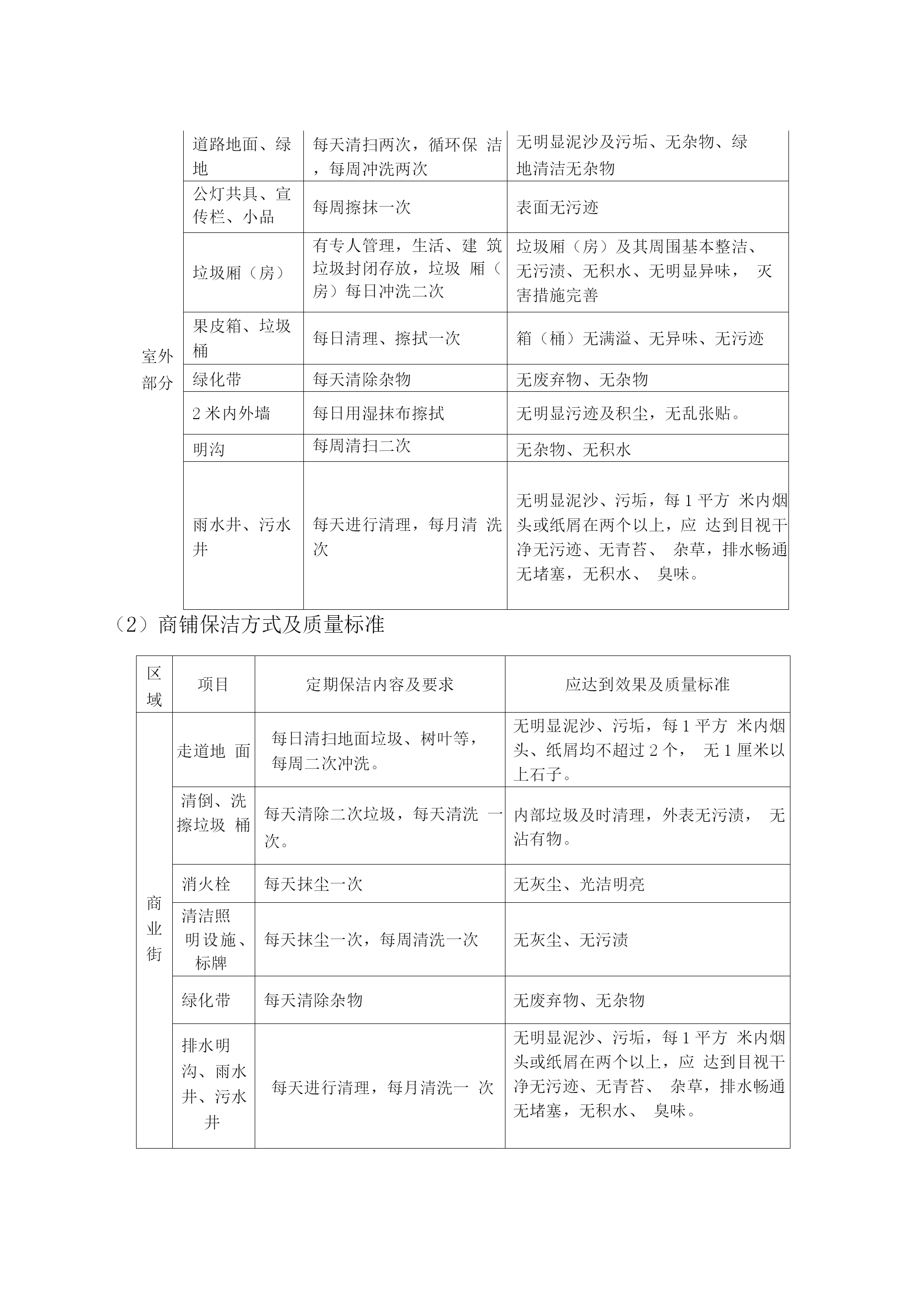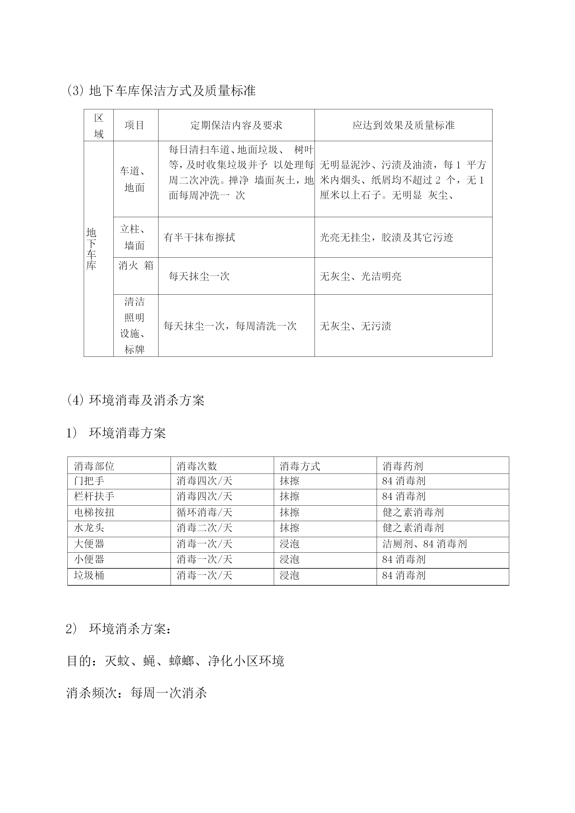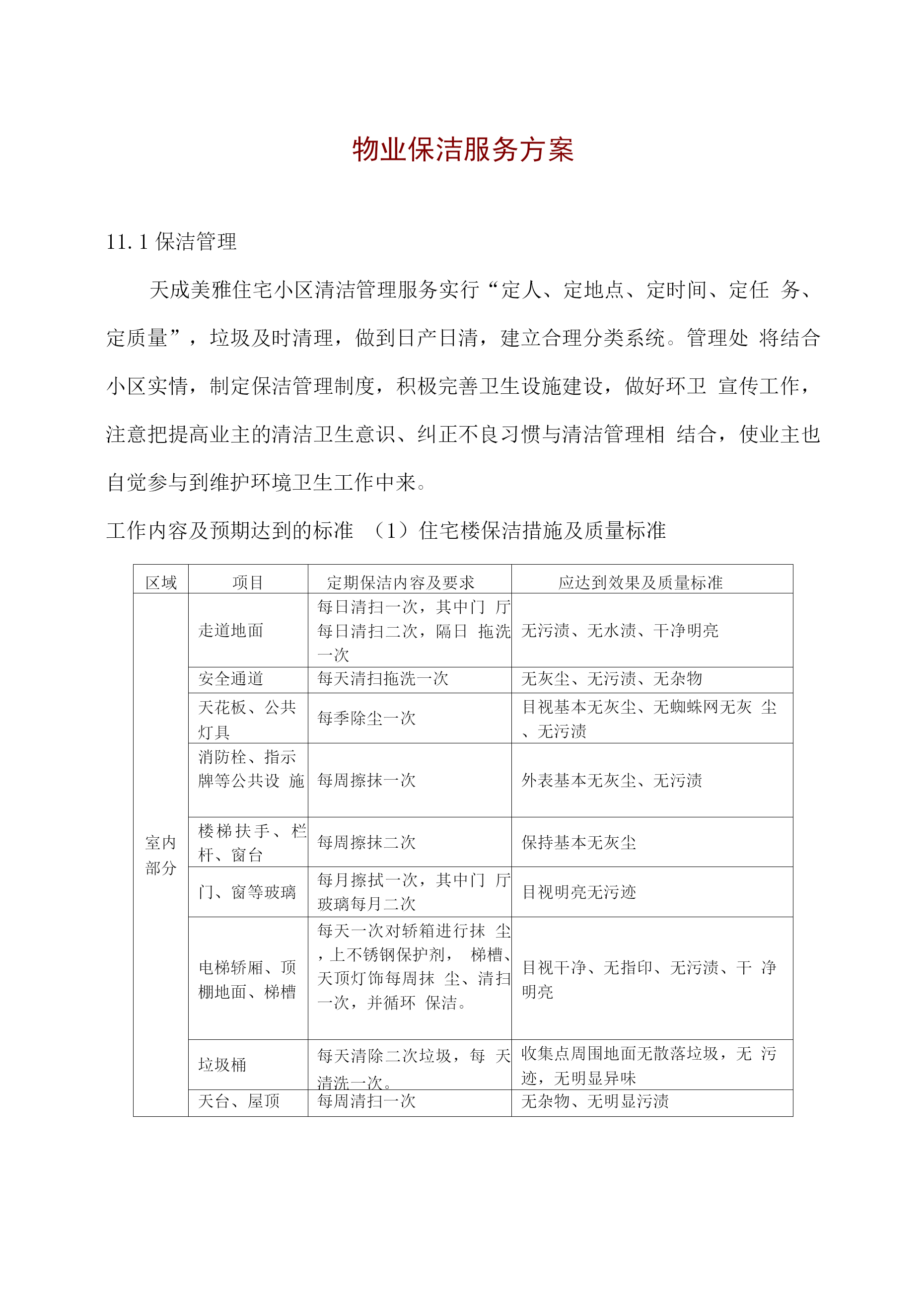 物业保洁服务方案11.1保洁管理天成美雅住宅小区清洁管理服务实行“定人、定地点、定时间、定任务、定质量”,垃圾及时清理,做到日产日清,建立合理分类系统。管理处将结合小区实情,制定保洁管理制度,积极完善卫生设施建设,做好环卫宣传工作,注意把提高业主的清洁卫生意识、纠正不良习惯与清洁管理相结合,使业主也自觉参与到维护环境卫生工作中来。工作内容及预期达到的标准(1)住宅楼保洁措施及质量标准区域项目定期保洁内容及要求应达到效果及质量标准室内部分走道地面每日清扫一次,其中门厅每日清扫二次,隔日拖洗一次无污渍、无水渍、干净明亮安全通道每天清扫拖洗一次无灰尘、无污渍、无杂物天花板、公共灯具每季除尘一次目视基本无灰尘、无蜘蛛网无灰尘、无污渍消防栓、指示牌等公共设施每周擦抹一次外表基本无灰尘、无污渍楼梯扶手、栏杆、窗台每周擦抹二次保持基本无灰尘门、窗等玻璃每月擦拭一次,其中门厅玻璃每月二次目视明亮无污迹电梯轿厢、顶棚地面、梯槽每天一次对轿箱进行抹尘,上不锈钢保护剂,梯槽、天顶灯饰每周抹尘、清扫一次,并循环保洁。目视干净、无指印、无污渍、干净明亮垃圾桶每天清除二次垃圾,每天清洗一次。收集点周围地面无散落垃圾,无污迹,无明显异味天台、屋顶每周清扫一次无杂物、无明显污渍道路地面、绿地每天清扫两次,循环保洁,每周冲洗两次无明显泥沙及污垢、无杂物、绿地清洁无杂物公灯共具、宣传栏、小品每周擦抹一次表面无污迹垃圾厢(房)有专人管理,生活、建筑垃圾封闭存放,垃圾厢(房)每日冲洗二次垃圾厢(房)及其周围基本整洁、无污渍、无积水、无明显异味,灭害措施完善果皮箱、垃圾桶每日清理、擦拭一次箱(桶)无满溢、无异味、无污迹绿化带每天清除杂物无废弃物、无杂物2米内外墙每日用湿抹布擦拭无明显污迹及积尘,无乱张贴。明沟每周清扫二次无杂物、无积水雨水井、污水井每天进行清理,每月清洗次无明显泥沙、污垢,每1平方米内烟头或纸屑在两个以上,应达到目视干净无污迹、无青苔、杂草,排水畅通无堵塞,无积水、臭味。室外部分(2)商铺保洁方式及质量标准区域项目定期保洁内容及要求应达到效果及质量标准商业街走道地面每日清扫地面垃圾、树叶等,每周二次冲洗。无明显泥沙、污垢,每1平方米内烟头、纸屑均不超过2个,无1厘米以上石子。清倒、洗擦垃圾桶每天清除二次垃圾,每天清洗一次。内部垃圾及时清理,外表无污渍,无沾有物。消火栓每天抹尘一次无灰尘、光洁明亮清洁照明设施、标牌每天抹尘一次,每周清洗一次无灰尘、无污渍绿化带每天清除杂物无废弃物、无杂物排水明沟、雨水井、污水井每天进行清理,每月清洗一次无明显泥沙、污垢,每1平方米内烟头或纸屑在两个以上,应达到目视干净无污迹、无青苔、杂草,排水畅通无堵塞,无积水、臭味。地下车库保洁方式及质量标准区域项目定期保洁内容及要求应达到效果及质量标准地下车库车道、地面每日清扫车道、地面垃圾、树叶等,及时收集垃圾并予以处理每周二次冲洗。掸净墙面灰土,地面每周冲洗一次无明显泥沙、污渍及油渍,每1平方米内烟头、纸屑均不超过2个,无1厘米以上石子。无明显灰尘、立柱、墙面有半干抹布擦拭光亮无挂尘,胶渍及其它污迹消火箱每天抹尘一次无灰尘、光洁明亮清洁照明设施、标牌每天抹尘一次,每周清洗一次无灰尘、无污渍环境消毒及消杀方案环境消毒方案消毒部位消毒次数消毒方式消毒药剂门把手消毒四次/天抹擦84消毒剂栏杆扶手消毒四次/天抹擦84消毒剂电梯按扭循环消毒/天抹擦健之素消毒剂水龙头消毒二次/天抹擦健之素消毒剂大便器消毒一次/天浸泡洁厕剂、84消毒剂小便器消毒一次/天浸泡84消毒剂垃圾桶消毒一次/天浸泡84消毒剂环境消杀方案:目的:灭蚊、蝇、蟑螂、净化小区环境消杀频次:每周一次消杀消杀区域:1、各楼宇的梯、梯间及楼宇周围。2、会所及配套的娱乐场所。3、公厕、沙井、化粪池、垃圾箱等室外公共区域。4、员工食堂和宿舍。消杀常用药剂:敌敌畏、灭害灵、敌百虫、拜力坦等喷洒剂。程序:1、好防护衣帽。2、将喷杀药品按要求进行稀释注入喷雾器里。3、对上述区域进行喷杀。注意事项:1、梯间喷杀时不要将药液喷在扶手或业主的门面上。2、员工宿舍喷杀时不要将药液喷洒在餐具及生活用品上。3、食堂喷杀时不要将药液喷洒在食品和器具上。4、不要在业主出入高峰期喷药。3)灭鼠程序:1、先将一张写有“灭鼠专用”的纸片。2、将鼠药成堆状放在纸张上。3、尽量放在隐蔽处或角落等小孩拿不到的地方。4、禁止成片或随意撒放。5、一周后,撤回饵料,期间注意捡拾死鼠。注意事项:1、制作饵料时作业人员必须戴上罩、胶手套,禁止裸手作业。2、投放鼠药必须保证在安全的前提下进行。标准:1、目视无蚊虫在飞,无苍蝇滋生地。2、老鼠密度不超过1%,鼠洞2
