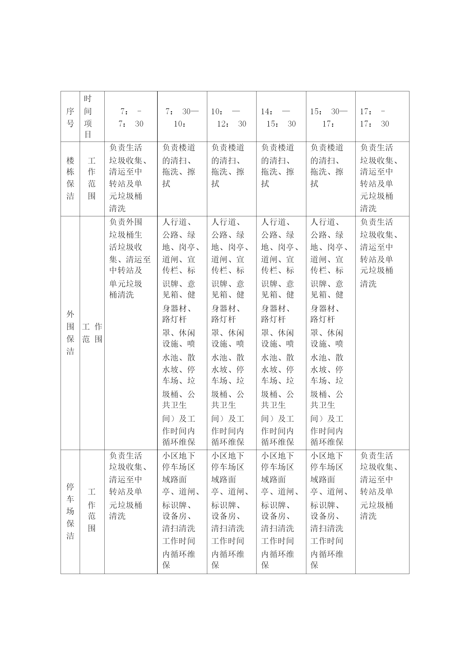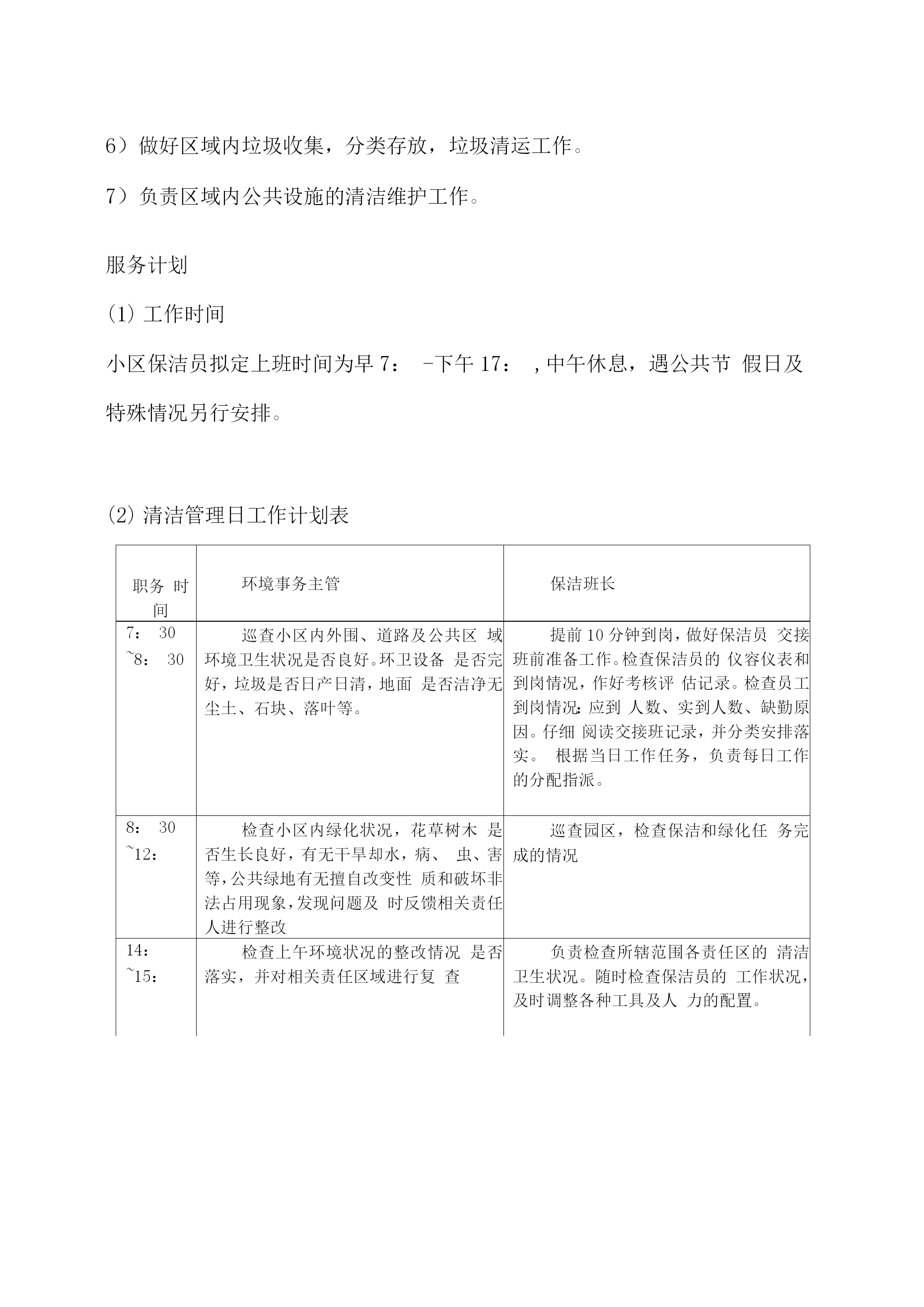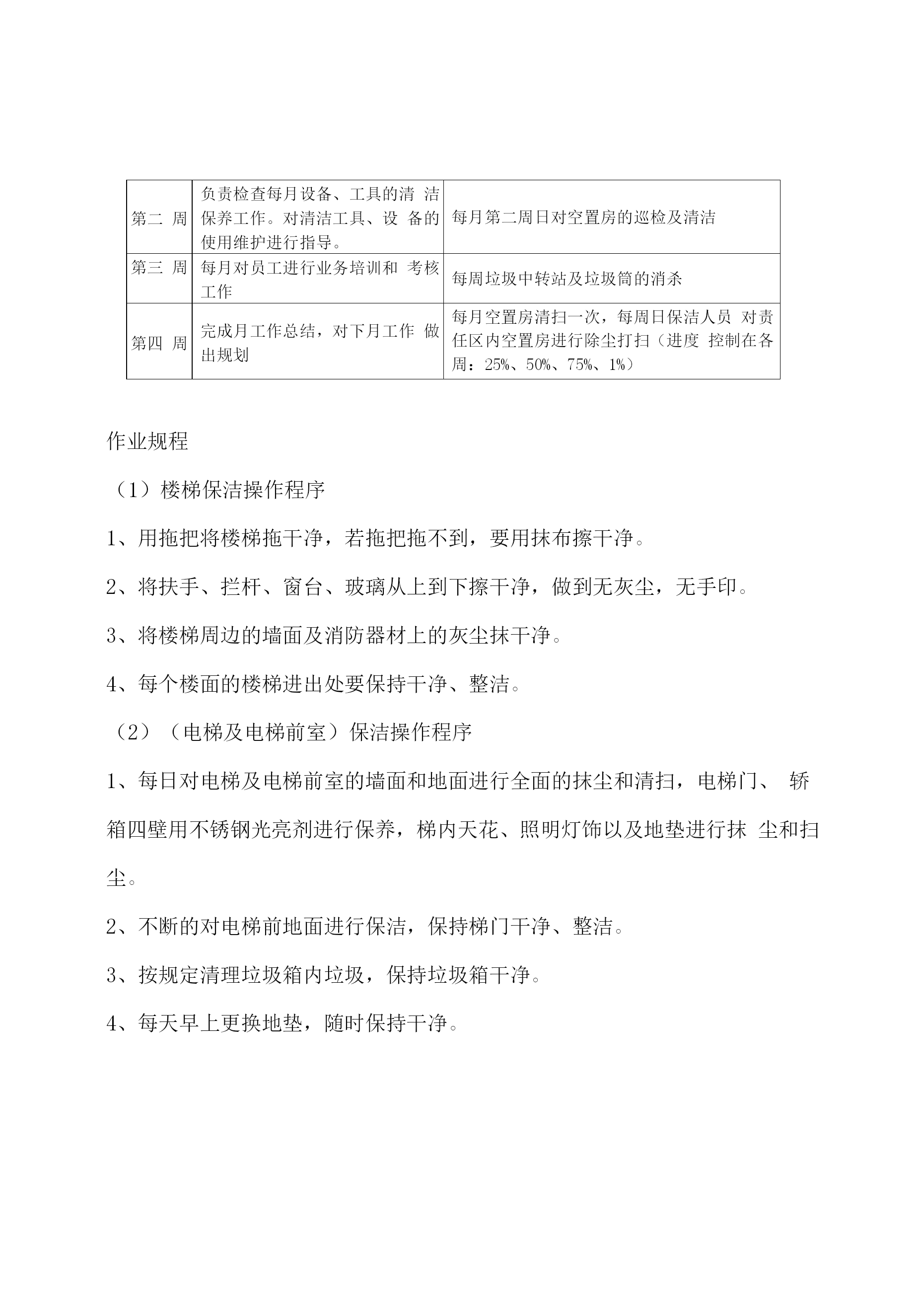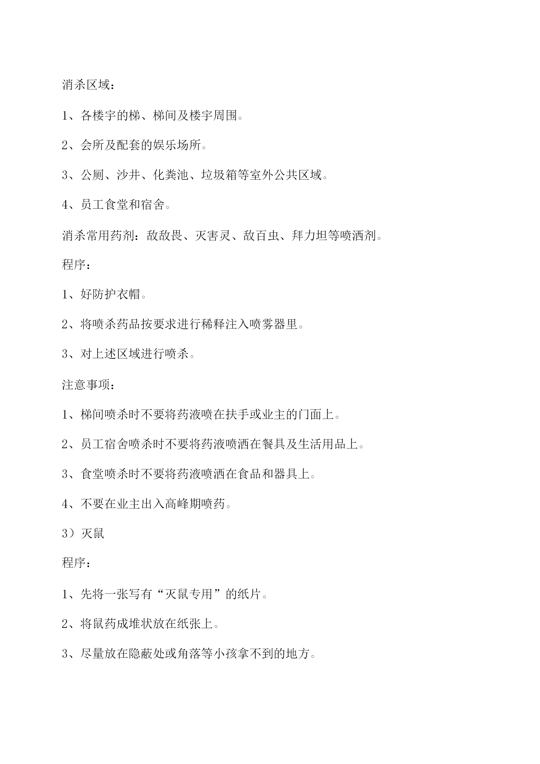 物业保洁服务方案11.1保洁管理天成美雅住宅小区清洁管理服务实行“定人、定地点、定时间、定任务、定质量”,垃圾及时清理,做到日产日清,建立合理分类系统。管理处将结合小区实情,制定保洁管理制度,积极完善卫生设施建设,做好环卫宣传工作,注意把提高业主的清洁卫生意识、纠正不良习惯与清洁管理相结合,使业主也自觉参与到维护环境卫生工作中来。工作内容及预期达到的标准(1)住宅楼保洁措施及质量标准区域项目定期保洁内容及要求应达到效果及质量标准室内部分走道地面每日清扫一次,其中门厅每日清扫二次,隔日拖洗一次无污渍、无水渍、干净明亮安全通道每天清扫拖洗一次无灰尘、无污渍、无杂物天花板、公共灯具每季除尘一次目视基本无灰尘、无蜘蛛网无灰尘、无污渍消防栓、指示牌等公共设施每周擦抹一次外表基本无灰尘、无污渍楼梯扶手、栏杆、窗台每周擦抹二次保持基本无灰尘门、窗等玻璃每月擦拭一次,其中门厅玻璃每月二次目视明亮无污迹电梯轿厢、顶棚地面、梯槽每天一次对轿箱进行抹尘,上不锈钢保护剂,梯槽、天顶灯饰每周抹尘、清扫一次,并循环保洁。目视干净、无指印、无污渍、干净明亮垃圾桶每天清除二次垃圾,每天清洗一次。收集点周围地面无散落垃圾,无污迹,无明显异味天台、屋顶每周清扫一次无杂物、无明显污渍道路地面、绿地每天清扫两次,循环保洁,每周冲洗两次无明显泥沙及污垢、无杂物、绿地清洁无杂物公灯共具、宣传栏、小品每周擦抹一次表面无污迹垃圾厢(房)有专人管理,生活、建筑垃圾封闭存放,垃圾厢(房)每日冲洗二次垃圾厢(房)及其周围基本整洁、无污渍、无积水、无明显异味,灭害措施完善果皮箱、垃圾桶每日清理、擦拭一次箱(桶)无满溢、无异味、无污迹绿化带每天清除杂物无废弃物、无杂物2米内外墙每日用湿抹布擦拭无明显污迹及积尘,无乱张贴。明沟每周清扫二次无杂物、无积水雨水井、污水井每天进行清理,每月清洗次无明显泥沙、污垢,每1平方米内烟头或纸屑在两个以上,应达到目视干净无污迹、无青苔、杂草,排水畅通无堵塞,无积水、臭味。室外部分(2)商铺保洁方式及质量标准区域项目定期保洁内容及要求应达到效果及质量标准商业街走道地面每日清扫地面垃圾、树叶等,每周二次冲洗。无明显泥沙、污垢,每1平方米内烟头、纸屑均不超过2个,无1厘米以上石子。清倒、洗擦垃圾桶每天清除二次垃圾,每天清洗一次。内部垃圾及时清理,外表无污渍,无沾有物。消火栓每天抹尘一次无灰尘、光洁明亮清洁照明设施、标牌每天抹尘一次,每周清洗一次无灰尘、无污渍绿化带每天清除杂物无废弃物、无杂物排水明沟、雨水井、污水井每天进行清理,每月清洗一次无明显泥沙、污垢,每1平方米内烟头或纸屑在两个以上,应达到目视干净无污迹、无青苔、杂草,排水畅通无堵塞,无积水、臭味。地下车库保洁方式及质量标准区域项目定期保洁内容及要求应达到效果及质量标准地下车库车道、地面每日清扫车道、地面垃圾、树叶等,及时收集垃圾并予以处理每周二次冲洗。掸净墙面灰土,地面每周冲洗一次无明显泥沙、污渍及油渍,每1平方米内烟头、纸屑均不超过2个,无1厘米以上石子。无明显灰尘、立柱、墙面有半干抹布擦拭光亮无挂尘,胶渍及其它污迹消火箱每天抹尘一次无灰尘、光洁明亮清洁照明设施、标牌每天抹尘一次,每周清洗一次无灰尘、无污渍环境消毒及消杀方案环境消毒方案消毒部位消毒次数消毒方式消毒药剂门把手消毒四次/天抹擦84消毒剂栏杆扶手消毒四次/天抹擦84消毒剂电梯按扭循环消毒/天抹擦健之素消毒剂水龙头消毒二次/天抹擦健之素消毒剂大便器消毒一次/天浸泡洁厕剂、84消毒剂小便器消毒一次/天浸泡84消毒剂垃圾桶消毒一次/天浸泡84消毒剂环境消杀方案:目的:灭蚊、蝇、蟑螂、净化小区环境消杀频次:每周一次消杀消杀区域:1、各楼宇的梯、梯间及楼宇周围。2、会所及配套的娱乐场所。3、公厕、沙井、化粪池、垃圾箱等室外公共区域。4、员工食堂和宿舍。消杀常用药剂:敌敌畏、灭害灵、敌百虫、拜力坦等喷洒剂。程序:1、好防护衣帽。2、将喷杀药品按要求进行稀释注入喷雾器里。3、对上述区域进行喷杀。注意事项:1、梯间喷杀时不要将药液喷在扶手或业主的门面上。2、员工宿舍喷杀时不要将药液喷洒在餐具及生活用品上。3、食堂喷杀时不要将药液喷洒在食品和器具上。4、不要在业主出入高峰期喷药。3)灭鼠程序:1、先将一张写有“灭鼠专用”的纸片。2、将鼠药成堆状放在纸张上。3、尽量放在隐蔽处或角落等小孩拿不到的地方。4、禁止成片或随意撒放。5、一周后,撤回饵料,期间注意捡拾死鼠。注意事项:1、制作饵料时作业人员必须戴上罩、胶手套,禁止裸手作业。2、投放鼠药必须保证在安全的前提下进行。标准:1、目视无蚊虫在飞,无苍蝇滋生地。2、老鼠密度不超过1%,鼠洞2