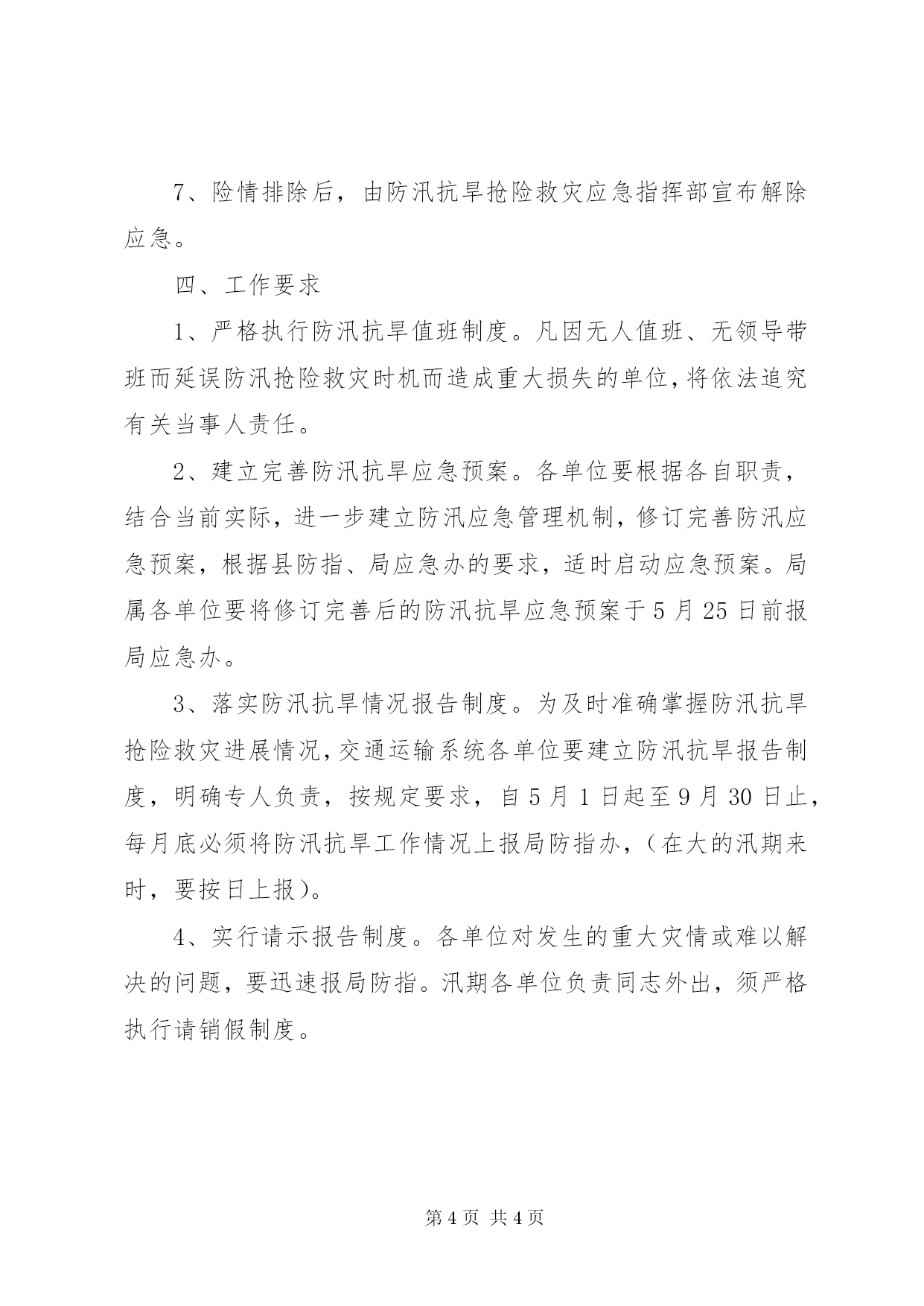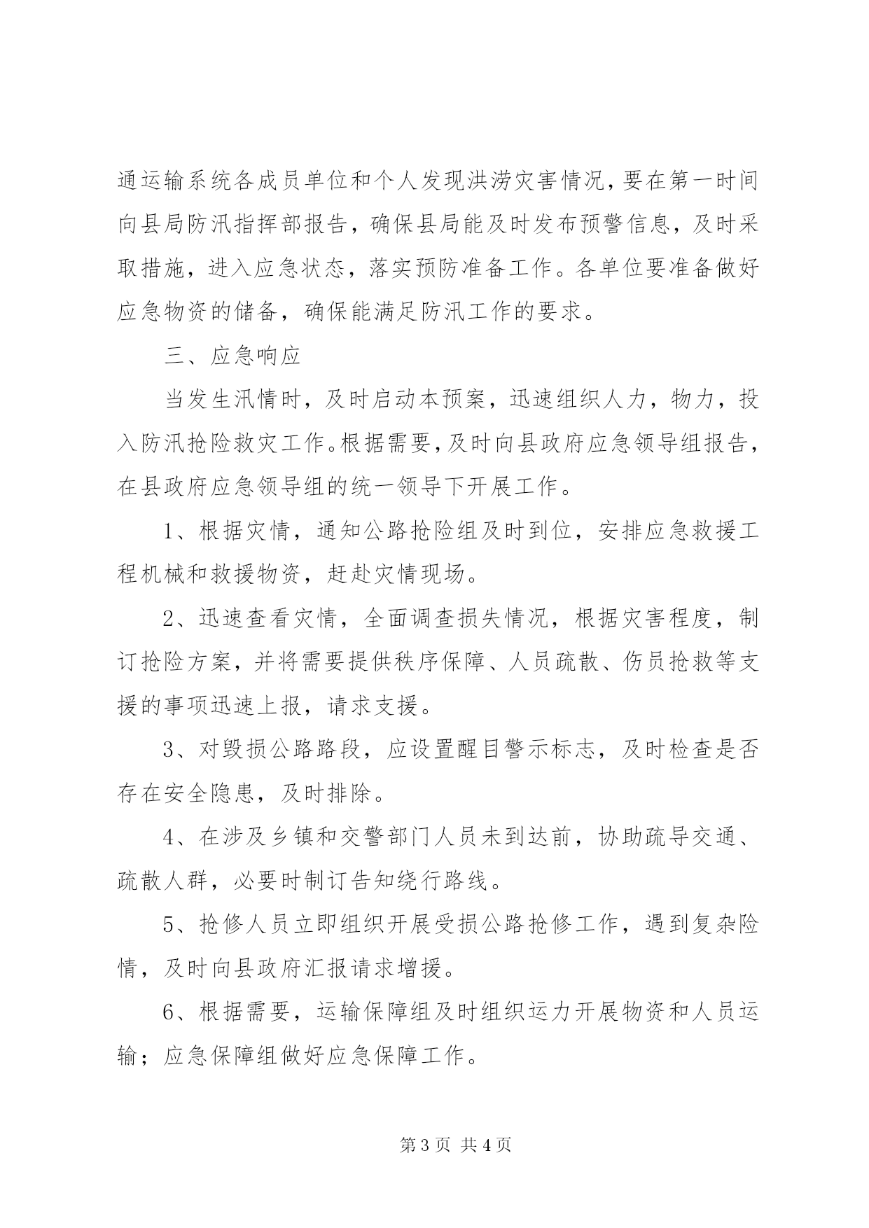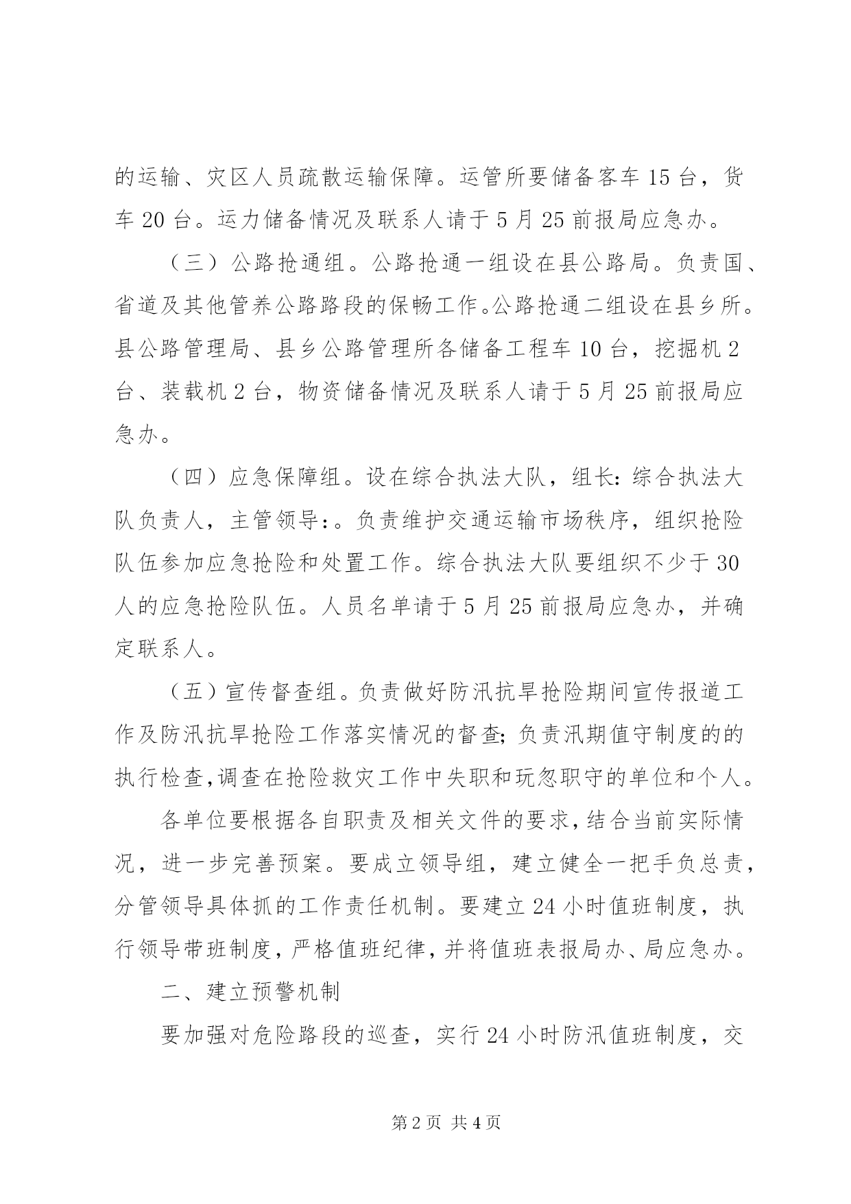 第PAGE\*Arabic\*MERGEFORMAT4页共NUMPAGES\*MERGEFORMAT4页交通局XX年防汛应急预案为认真做好2014年我县交通运输系统防汛抗旱抢险救灾工作,保障人民生命财产安全,快速、有效的应对防汛抗旱抢险救灾,最大限度地控制和解除险情、减轻灾害损失,建立快速反应机制,维护交通运输的安全畅通,根据上级交通运输部门XX县区防汛抗旱指挥部的统一部署要求,结合我县交通运输工作实际,特制定本应急预案。一、组织领导成立县交通运输局防汛抗旱抢险救灾应急指挥部,组成人员如下:主要职责。按照县政府指示和上级交通运输部门的要求,动员、组织、协调全县交通运输部门各项防汛抗旱抢险救灾应急工作,遇到重大汛情,及时向县政府或上级交通运输主管部门报告,请求支援,调用企事业单位和民用运输、抢修力量投入抢险;处理在抢险救灾工作中失职和玩忽职守的单位和个人。防汛抗旱抢险救灾应急指挥部下设办公室、运输保障组、公路抢通组、应急保障组、宣传督查组、防汛抢险专家组。(一)办公室。设在局应急办。具体负责防汛抗旱抢险救灾应急的协调、联系、组织实施以及日常管理工作;负责信息的收集、整理、汇总和分析。(二)运输保障组。设在运管所。负责抢险物资和抢险人员的运输、灾区人员疏散运输保障。运管所要储备客车15台,货车20台。运力储备情况及联系人请于5月25前报局应急办。(三)公路抢通组。公路抢通一组设在县公路局。负责国、省道及其他管养公路路段的保畅工作。公路抢通二组设在县乡所。县公路管理局、县乡公路管理所各储备工程车10台,挖掘机2台、装载机2台,物资储备情况及联系人请于5月25前报局应急办。(四)应急保障组。设在综合执法大队,组长:综合执法大队负责人,主管领导:。负责维护交通运输市场秩序,组织抢险队伍参加应急抢险和处置工作。综合执法大队要组织不少于30人的应急抢险队伍。人员名单请于5月25前报局应急办,并确定联系人。(五)宣传督查组。负责做好防汛抗旱抢险期间宣传报道工作及防汛抗旱抢险工作落实情况的督查;负责汛期值守制度的的执行检查,调查在抢险救灾工作中失职和玩忽职守的单位和个人。各单位要根据各自职责及相关文件的要求,结合当前实际情况,进一步完善预案。要成立领导组,建立健全一把手负总责,分管领导具体抓的工作责任机制。要建立24小时值班制度,执行领导带班制度,严格值班纪律,并将值班表报局办、局应急办。二、建立预警机制要加强对危险路段的巡查,实行24小时防汛值班制度,交通运输系统各成员单位和个人发现洪涝灾害情况,要在第一时间向县局防汛指挥部报告,确保县局能及时发布预警信息,及时采取措施,进入应急状态,落实预防准备工作。各单位要准备做好应急物资的储备,确保能满足防汛工作的要求。三、应急响应当发生汛情时,及时启动本预案,迅速组织人力,物力,投入防汛抢险救灾工作。根据需要,及时向县政府应急领导组报告,在县政府应急领导组的统一领导下开展工作。1、根据灾情,通知公路抢险组及时到位,安排应急救援工程机械和救援物资,赶赴灾情现场。2、迅速查看灾情,全面调查损失情况,根据灾害程度,制订抢险方案,并将需要提供秩序保障、人员疏散、伤员抢救等支援的事项迅速上报,请求支援。3、对毁损公路路段,应设置醒目警示标志,及时检查是否存在安全隐患,及时排除。4、在涉及乡镇和交警部门人员未到达前,协助疏导交通、疏散人群,必要时制订告知绕行路线。5、抢修人员立即组织开展受损公路抢修工作,遇到复杂险情,及时向县政府汇报请求增援。6、根据需要,运输保障组及时组织运力开展物资和人员运输;应急保障组做好应急保障工作。7、险情排除后,由防汛抗旱抢险救灾应急指挥部宣布解除应急。四、工作要求1、严格执行防汛抗旱值班制度。凡因无人值班、无领导带班而延误防汛抢险救灾时机而造成重大损失的单位,将依法追究有关当事人责任。2、建立完善防汛抗旱应急预案。各单位要根据各自职责,结合当前实际,进一步建立防汛应急管理机制,修订完善防汛应急预案,根据县防指、局应急办的要求,适时启动应急预案。局属各单位要将修订完善后的防汛抗旱应急预案于5月25日前报局应急办。3、落实防汛抗旱情况报告制度。为及时准确掌握防汛抗旱抢险救灾进展情况,交通运输系统各单位要建立防汛抗旱报告制度,明确专人负责,按规定要求,自5月1日起至9月30日止,每月底必须将防汛抗旱工作情况上报局防指办,(在大的汛期来时,要按日上报)。4、实行请示报告制度。各单位对发生的重大灾情或难以解决的问题,要迅速报局防指。汛期各单位负责同志外出,须严格执行请销假制度。