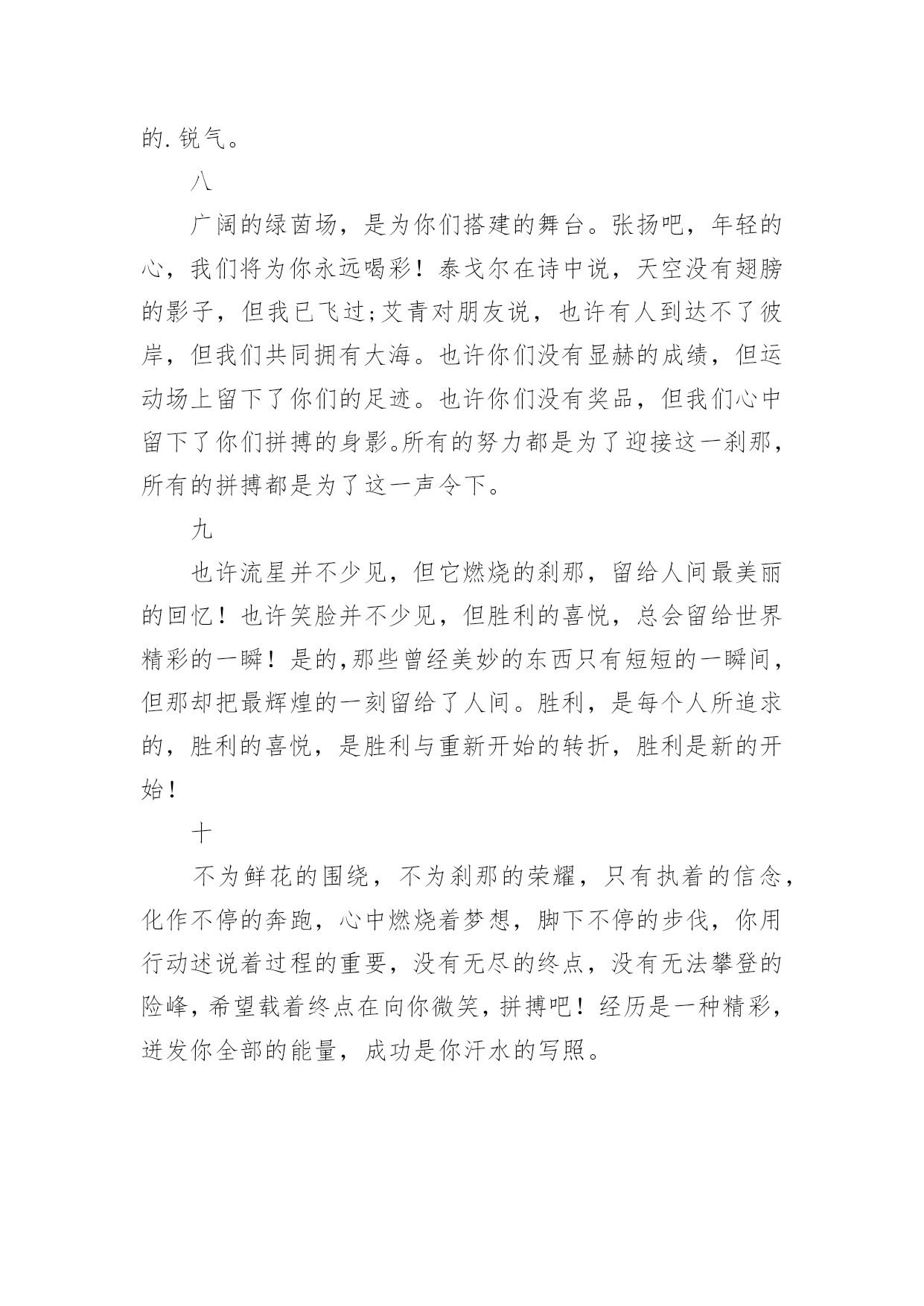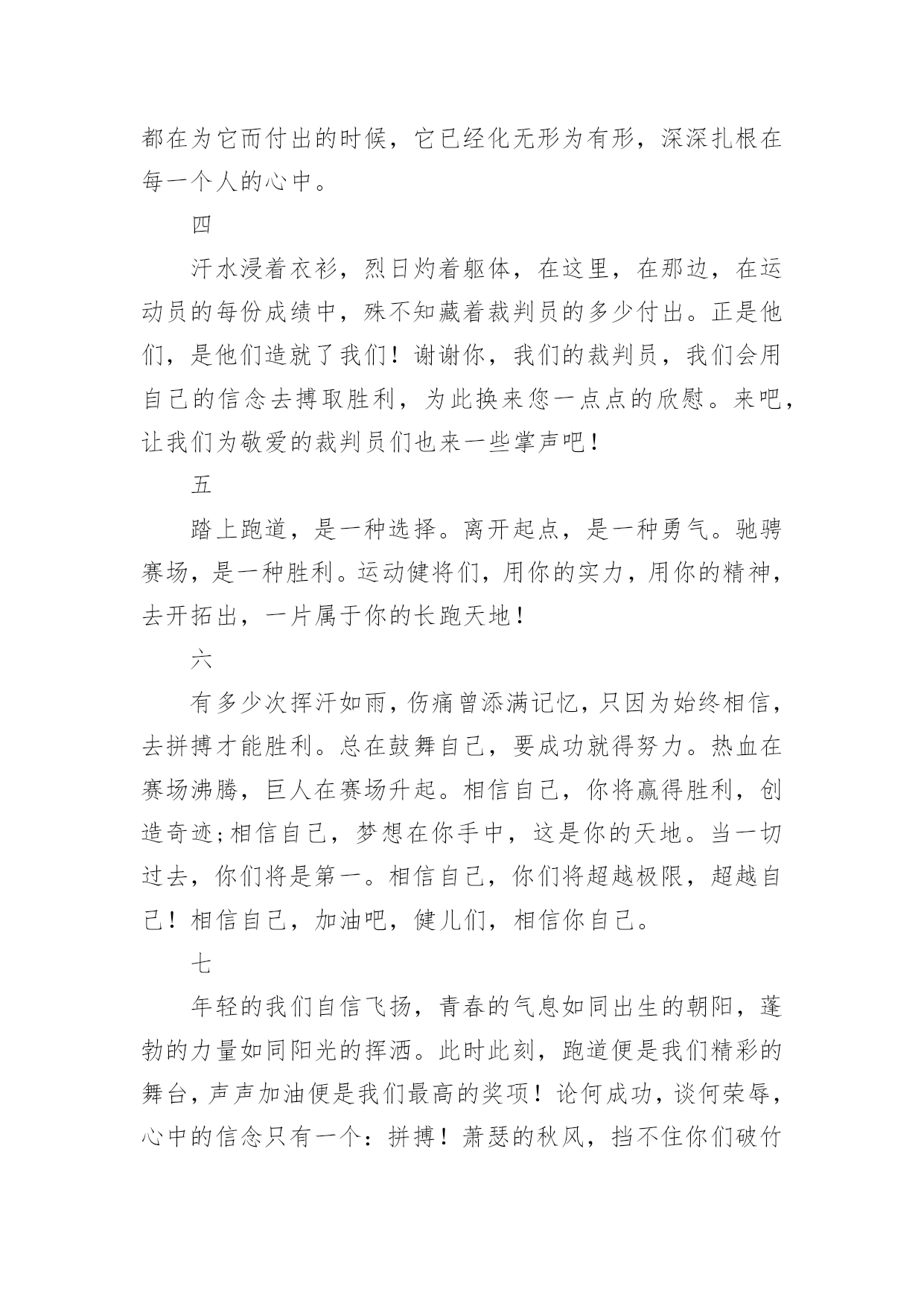 学校运动会加油词学校运动会加油词范文振奋人心的学校运动会开始了,一起来给运动员们准备加油稿吧!下面是小编为大家带来的学校运动会加油词范文,希望能够帮到您!一你的汗水一滴滴的滴落在红色的跑道上,你的步伐渐渐沉重缓慢。想起我曾经对你鼓励的话语,此刻都脆弱的不堪一击。努力坚持。这些话语此时都没有了意义。我只在心底里为你祝福,为你鼓劲。企盼你能微笑着冲过终点,就在眼前的终点!二校运会的召开,牵动着全体师生的心。看那平时伏案备课的老师,此刻也在跑道上跃跃欲试。为学习头疼的同学们,也为夺到第一而雀跃欢呼。严格的体育老师们,现在也细致亲切地为运动员们记录成绩。我不能在运动场上显身手,于是我就用手中的笔记录着美好的瞬间!三此时此刻,第XX届运动会正如火如荼地进行着。呐喊声此起彼伏,震天的喊声和着跳动的脉搏,那么振奋人心。场上的运动员们向着最后的胜利飞奔着。我想,当运动员们站在跑道上的那一刻,心中揣着的就是集体。集体,重在团结,更重在每个人对它权益的维护。当运动场上每位运动员都在为它而付出的时候,它已经化无形为有形,深深扎根在每一个人的心中。四汗水浸着衣衫,烈日灼着躯体,在这里,在那边,在运动员的每份成绩中,殊不知藏着裁判员的多少付出。正是他们,是他们造就了我们!谢谢你,我们的裁判员,我们会用自己的信念去搏取胜利,为此换来您一点点的欣慰。来吧,让我们为敬爱的裁判员们也来一些掌声吧!五踏上跑道,是一种选择。离开起点,是一种勇气。驰骋赛场,是一种胜利。运动健将们,用你的实力,用你的精神,去开拓出,一片属于你的长跑天地!六有多少次挥汗如雨,伤痛曾添满记忆,只因为始终相信,去拼搏才能胜利。总在鼓舞自己,要成功就得努力。热血在赛场沸腾,巨人在赛场升起。相信自己,你将赢得胜利,创造奇迹;相信自己,梦想在你手中,这是你的天地。当一切过去,你们将是第一。相信自己,你们将超越极限,超越自己!相信自己,加油吧,健儿们,相信你自己。七年轻的我们自信飞扬,青春的气息如同出生的朝阳,蓬勃的力量如同阳光的挥洒。此时此刻,跑道便是我们精彩的舞台,声声加油便是我们最高的奖项!论何成功,谈何荣辱,心中的信念只有一个:拼搏!萧瑟的秋风,挡不住你们破竹的.锐气。八广阔的绿茵场,是为你们搭建的舞台。张扬吧,年轻的心,我们将为你永远喝彩!泰戈尔在诗中说,天空没有翅膀的影子,但我已飞过;艾青对朋友说,也许有人到达不了彼岸,但我们共同拥有大海。也许你们没有显赫的成绩,但运动场上留下了你们的足迹。也许你们没有奖品,但我们心中留下了你们拼搏的身影。所有的努力都是为了迎接这一刹那,所有的拼搏都是为了这一声令下。九也许流星并不少见,但它燃烧的刹那,留给人间最美丽的回忆!也许笑脸并不少见,但胜利的喜悦,总会留给世界精彩的一瞬!是的,那些曾经美妙的东西只有短短的一瞬间,但那却把最辉煌的一刻留给了人间。胜利,是每个人所追求的,胜利的喜悦,是胜利与重新开始的转折,胜利是新的开始!十不为鲜花的围绕,不为刹那的荣耀,只有执着的信念,化作不停的奔跑,心中燃烧着梦想,脚下不停的步伐,你用行动述说着过程的重要,没有无尽的终点,没有无法攀登的险峰,希望载着终点在向你微笑,拼搏吧!经历是一种精彩,迸发你全部的能量,成功是你汗水的写照。