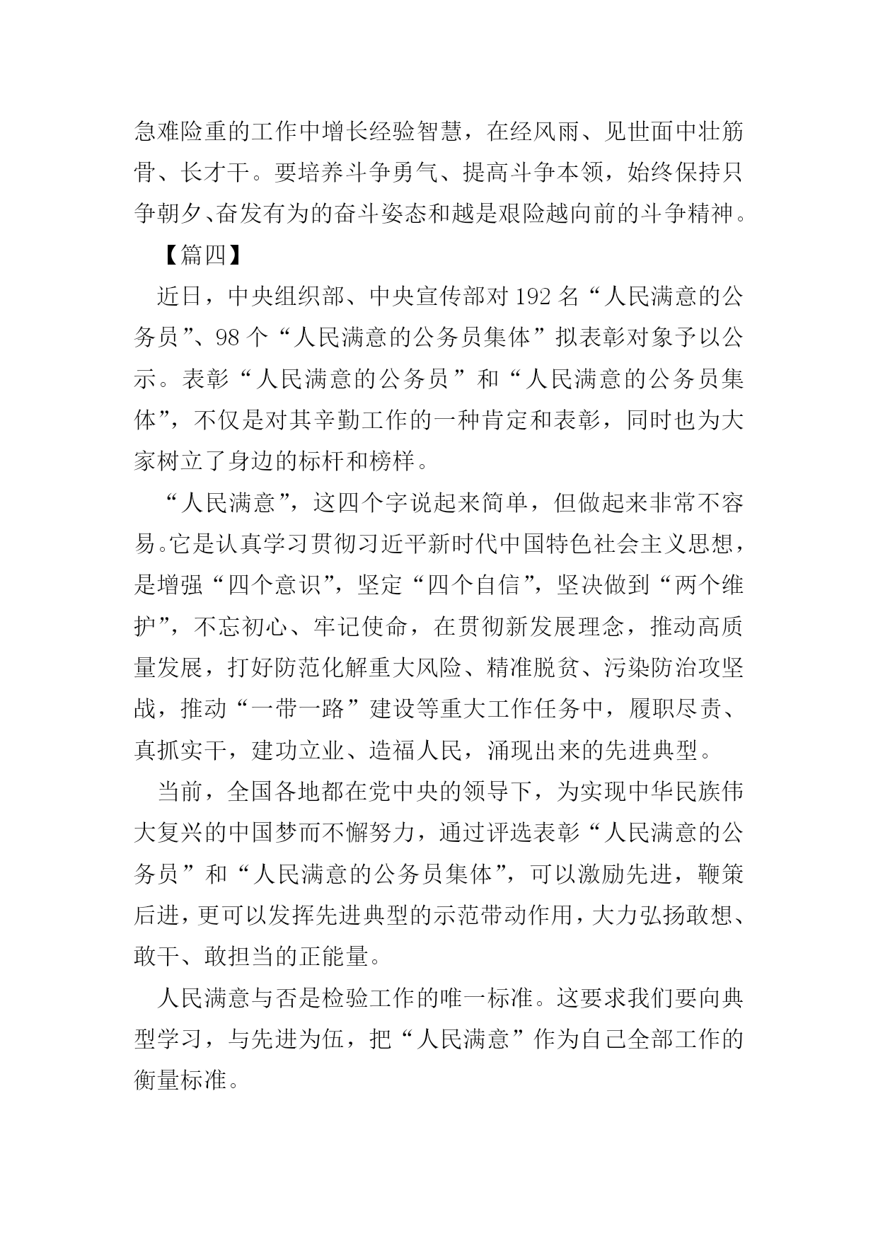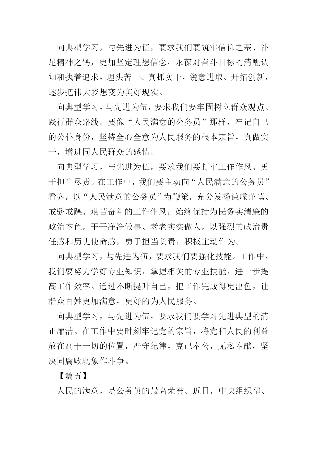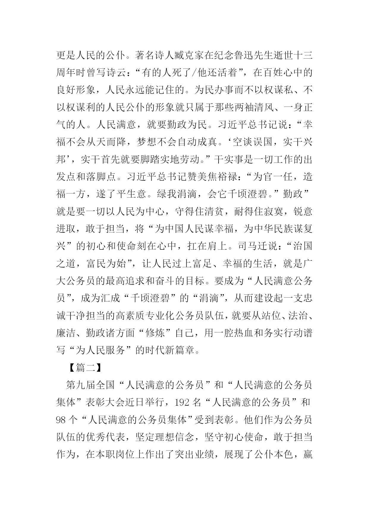 做人民满意的公务员征文五篇【篇一】近日,中央各大媒体发布第九届全国“人民满意的公务员”和“人民满意的公务员集体”名单,对192名“人民满意的公务员”、98个“人民满意的公务员集体”拟表彰对象进行了公示,接收全国人民的审核。作为一名新时期公务员,我们的最高荣誉就是“人民满意”,然而,如何理解“人民满意”,进而做到“人民满意”。人民满意,就是要不断提高政治站位。具有良好的政治素养不仅仅是对党员同志的要求,也是对所有公务员的基本要求。树牢“四个意识”,增强“四个自信”,坚决做到“两个维护”是提高政治站位的前提。能否实现政令畅通,是一个政党、一个国家能否长治久安的关键。作为每个层次的公务员,唯有站稳政治立场,提高政治意识,党的各项方针政策才能不折不扣地传递到老百姓那里,人民才会满意。人民满意,就是要树牢法治理念。“依法治国”不能光靠嘴上,更要落到实处。自觉运用法治思维和法治方式解决问题、推动工作,是公务员“依法行政”的基本前提和工作思路。俗语讲“当官不为民做主,不如回家卖红薯”,道出了古代朝廷倡导的“为官”之本。从此次评选表彰的“人民满意公务员”身上,我们不难看出,正因为他们有将强的法治理念和依法行政办事准则,才能得到人民的认可。人民满意,就是要清正廉洁。我们是人民的公务员,更是人民的公仆。著名诗人臧克家在纪念鲁迅先生逝世十三周年时曾写诗云:“有的人死了/他还活着”,在百姓心中的良好形象,人民永远能记住的。为民办事而不以权谋私、不以权谋利的人民公仆的形象就只属于那些两袖清风、一身正气的人。人民满意,就要勤政为民。习近平总书记说:“幸福不会从天而降,梦想不会自动成真。‘空谈误国,实干兴邦’,实干首先就要脚踏实地劳动。”干实事是一切工作的出发点和落脚点。习近平总书记赞美焦裕禄:“为官一任,造福一方,遂了平生意。绿我涓滴,会它千顷澄碧。”勤政”就是要一切以人民为中心,守得住清贫,耐得住寂寞,锐意进取,敢于担当,将“为中国人民谋幸福,为中华民族谋复兴”的初心和使命刻在心中,扛在肩上。司马迁说:“治国之道,富民为始”,让人民过上富足、幸福的生活,就是广大公务员的最高追求和奋斗的目标。要成为“人民满意公务员”,成为汇成“千顷澄碧”的“涓滴”,从而建设起一支忠诚干净担当的高素质专业化公务员队伍,就要从站位、法治、廉洁、勤政诸方面“修炼”自己,用一腔热血和务实行动谱写“为人民服务”的时代新篇章。【篇二】第九届全国“人民满意的公务员”和“人民满意的公务员集体”表彰大会近日举行,192名“人民满意的公务员”和98个“人民满意的公务员集体”受到表彰。他们作为公务员队伍的优秀代表,坚定理想信念,坚守初心使命,敢于担当作为,在本职岗位上作出了突出业绩,展现了公仆本色,赢得了人民信赖,成为广大公务员学习的标杆,生动诠释了新时代公务员的“标配”。做人民公仆。人民群众是干部的衣食父母,公务员作为干部队伍的重要组成部分,不能高高在上,不能自命不凡,不能瞧不起群众,而要高看群众、低看自己,在感情上贴近群众,在思想上拉近与群众的距离,在行为上深入群众,做到权为民所用、情为民所系、利为民所谋。无论从事什么工作,坚持一切为了群众、一切相信群众、一切依靠群众,切实为群众谋利益、为百姓创业绩,真正想人民之所想、急人民之所急、忧人民之所忧,与人民群众同呼吸、共命运。坚持以人民群众高兴不高兴、满意不满意、答应不答应作为检验工作成效的根本标准,使各项工作符合人民群众的意愿,得到人民群众的认可。为人民服务。人民对美好生活的向往,就是我们的奋斗目标。公务员要坚持把人民群众当亲人来待,把群众的事当成自己的事去办,多办顺应民意、化解民忧、为民谋利的实事,真正把群众的事放在心上、抓在手上,做到想群众之所想、急群众之所急,帮助群众排忧解难。注重把人民需求作为第一目标,把为民服务作为第一职责,注重经常下基层、走村寨、进农家、访百姓,多到田间地头知民情、解民忧、暖民心,切实解决好基层发展中的热点、难点问题,解决好群众生产生活中的实际困难,帮助群众排解操心事、烦心事,为广大群众多办实事、多办好事、多解难事,把为人民造福的事情真正办好办实,让群众有更多的获得感、幸福感和安全感。当人民学员。人民群众中蕴藏着无穷的智慧和力量,决定了公务员要拿出“程门立雪”的精神,始终保持谦虚谨慎的态度,真正虚心向群众学习请教,学习人民群众的活跃思维,学习人民群众的优秀品德,学习人民群众的务实作风,学习人民群众的朴素情感。只有深入基层、深入实际,诚恳地与人民群众交流,虚心听取群众的批评和意见,从人民群众生动的实践创造中提炼经验,才能获取“活知识”、学到“真功夫”、掌握“硬本领”,获得取之不尽的力量之源,不断完善工作思路,改进工作方法,在人民群众的创造性实践中增长政治智慧,增强执政本领,从而不断