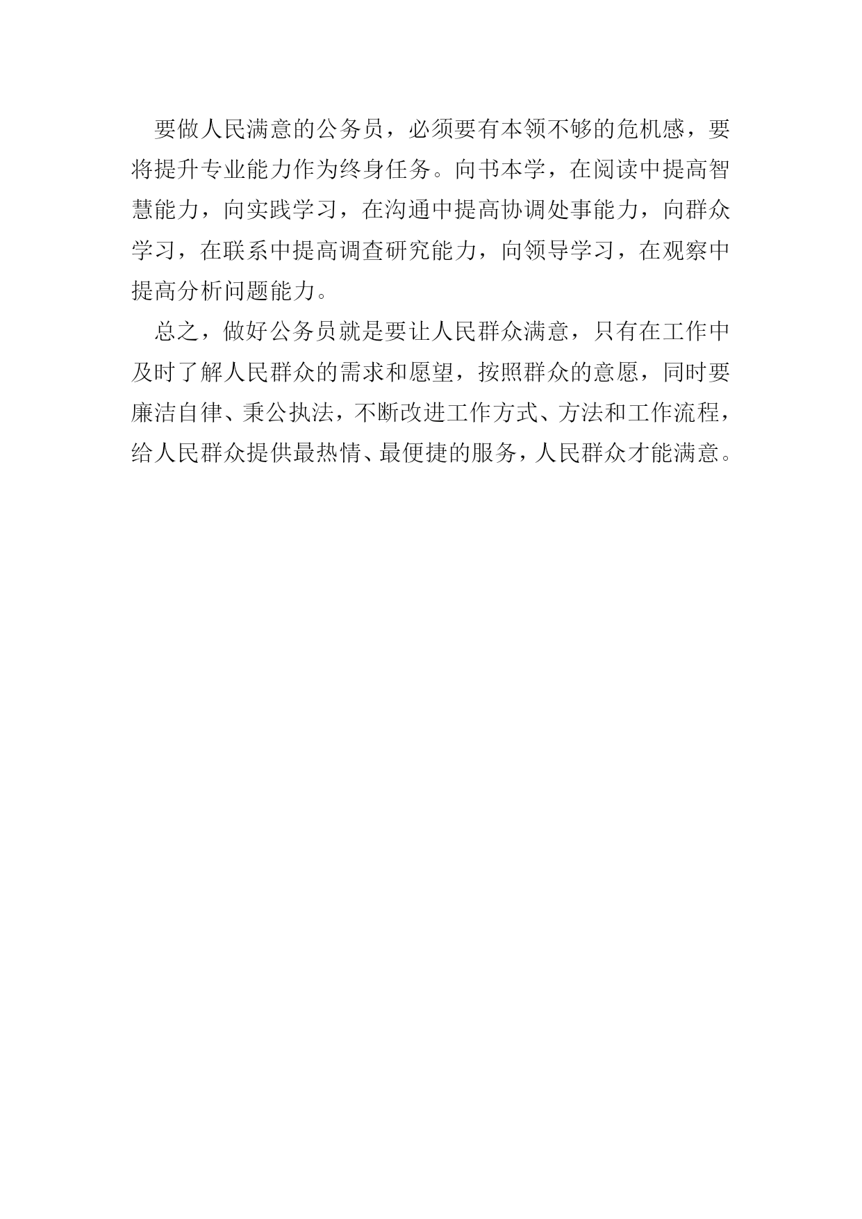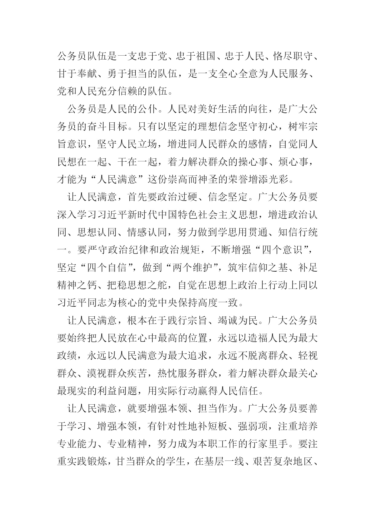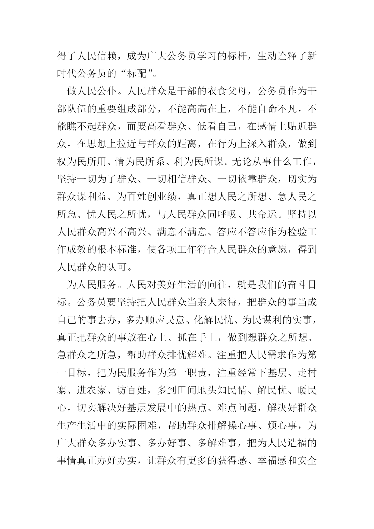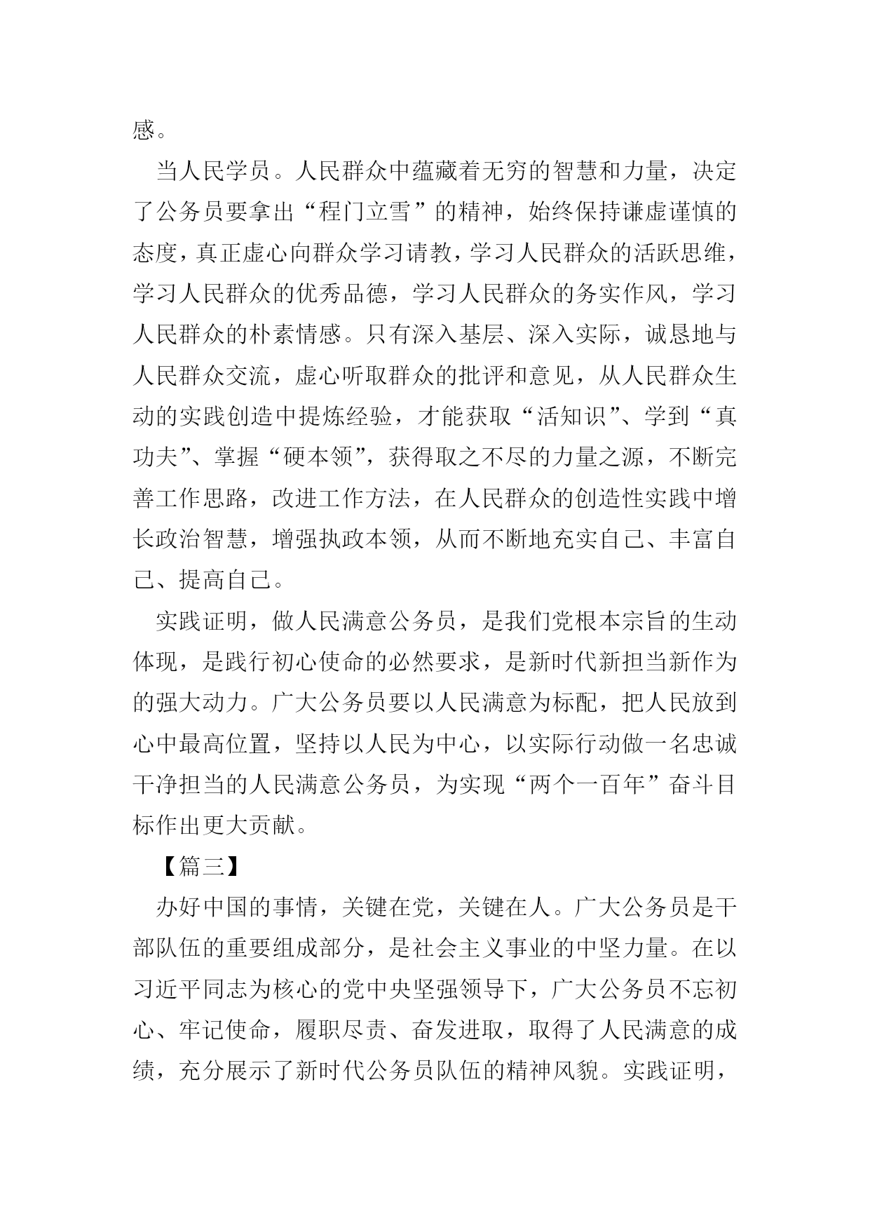 做人民满意的公务员征文五篇【篇一】近日,中央各大媒体发布第九届全国“人民满意的公务员”和“人民满意的公务员集体”名单,对192名“人民满意的公务员”、98个“人民满意的公务员集体”拟表彰对象进行了公示,接收全国人民的审核。作为一名新时期公务员,我们的最高荣誉就是“人民满意”,然而,如何理解“人民满意”,进而做到“人民满意”。人民满意,就是要不断提高政治站位。具有良好的政治素养不仅仅是对党员同志的要求,也是对所有公务员的基本要求。树牢“四个意识”,增强“四个自信”,坚决做到“两个维护”是提高政治站位的前提。能否实现政令畅通,是一个政党、一个国家能否长治久安的关键。作为每个层次的公务员,唯有站稳政治立场,提高政治意识,党的各项方针政策才能不折不扣地传递到老百姓那里,人民才会满意。人民满意,就是要树牢法治理念。“依法治国”不能光靠嘴上,更要落到实处。自觉运用法治思维和法治方式解决问题、推动工作,是公务员“依法行政”的基本前提和工作思路。俗语讲“当官不为民做主,不如回家卖红薯”,道出了古代朝廷倡导的“为官”之本。从此次评选表彰的“人民满意公务员”身上,我们不难看出,正因为他们有将强的法治理念和依法行政办事准则,才能得到人民的认可。人民满意,就是要清正廉洁。我们是人民的公务员,更是人民的公仆。著名诗人臧克家在纪念鲁迅先生逝世十三周年时曾写诗云:“有的人死了/他还活着”,在百姓心中的良好形象,人民永远能记住的。为民办事而不以权谋私、不以权谋利的人民公仆的形象就只属于那些两袖清风、一身正气的人。人民满意,就要勤政为民。习近平总书记说:“幸福不会从天而降,梦想不会自动成真。‘空谈误国,实干兴邦’,实干首先就要脚踏实地劳动。”干实事是一切工作的出发点和落脚点。习近平总书记赞美焦裕禄:“为官一任,造福一方,遂了平生意。绿我涓滴,会它千顷澄碧。”勤政”就是要一切以人民为中心,守得住清贫,耐得住寂寞,锐意进取,敢于担当,将“为中国人民谋幸福,为中华民族谋复兴”的初心和使命刻在心中,扛在肩上。司马迁说:“治国之道,富民为始”,让人民过上富足、幸福的生活,就是广大公务员的最高追求和奋斗的目标。要成为“人民满意公务员”,成为汇成“千顷澄碧”的“涓滴”,从而建设起一支忠诚干净担当的高素质专业化公务员队伍,就要从站位、法治、廉洁、勤政诸方面“修炼”自己,用一腔热血和务实行动谱写“为人民服务”的时代新篇章。【篇二】第九届全国“人民满意的公务员”和“人民满意的公务员集体”表彰大会近日举行,192名“人民满意的公务员”和98个“人民满意的公务员集体”受到表彰。他们作为公务员队伍的优秀代表,坚定理想信念,坚守初心使命,敢于担当作为,在本职岗位上作出了突出业绩,展现了公仆本色,赢得了人民信赖,成为广大公务员学习的标杆,生动诠释了新时代公务员的“标配”。做人民公仆。人民群众是干部的衣食父母,公务员作为干部队伍的重要组成部分,不能高高在上,不能自命不凡,不能瞧不起群众,而要高看群众、低看自己,在感情上贴近群众,在思想上拉近与群众的距离,在行为上深入群众,做到权为民所用、情为民所系、利为民所谋。无论从事什么工作,坚持一切为了群众、一切相信群众、一切依靠群众,切实为群众谋利益、为百姓创业绩,真正想人民之所想、急人民之所急、忧人民之所忧,与人民群众同呼吸、共命运。坚持以人民群众高兴不高兴、满意不满意、答应不答应作为检验工作成效的根本标准,使各项工作符合人民群众的意愿,得到人民群众的认可。为人民服务。人民对美好生活的向往,就是我们的奋斗目标。公务员要坚持把人民群众当亲人来待,把群众的事当成自己的事去办,多办顺应民意、化解民忧、为民谋利的实事,真正把群众的事放在心上、抓在手上,做到想群众之所想、急群众之所急,帮助群众排忧解难。注重把人民需求作为第一目标,把为民服务作为第一职责,注重经常下基层、走村寨、进农家、访百姓,多到田间地头知民情、解民忧、暖民心,切实解决好基层发展中的热点、难点问题,解决好群众生产生活中的实际困难,帮助群众排解操心事、烦心事,为广大群众多办实事、多办好事、多解难事,把为人民造福的事情真正办好办实,让群众有更多的获得感、幸福感和安全感。当人民学员。人民群众中蕴藏着无穷的智慧和力量,决定了公务员要拿出“程门立雪”的精神,始终保持谦虚谨慎的态度,真正虚心向群众学习请教,学习人民群众的活跃思维,学习人民群众的优秀品德,学习人民群众的务实作风,学习人民群众的朴素情感。只有深入基层、深入实际,诚恳地与人民群众交流,虚心听取群众的批评和意见,从人民群众生动的实践创造中提炼经验,才能获取“活知识”、学到“真功夫”、掌握“硬本领”,获得取之不尽的力量之源,不断完善工作思路,改进工作方法,在人民群众的创造性实践中增长政治智慧,增强执政本领,从而不断