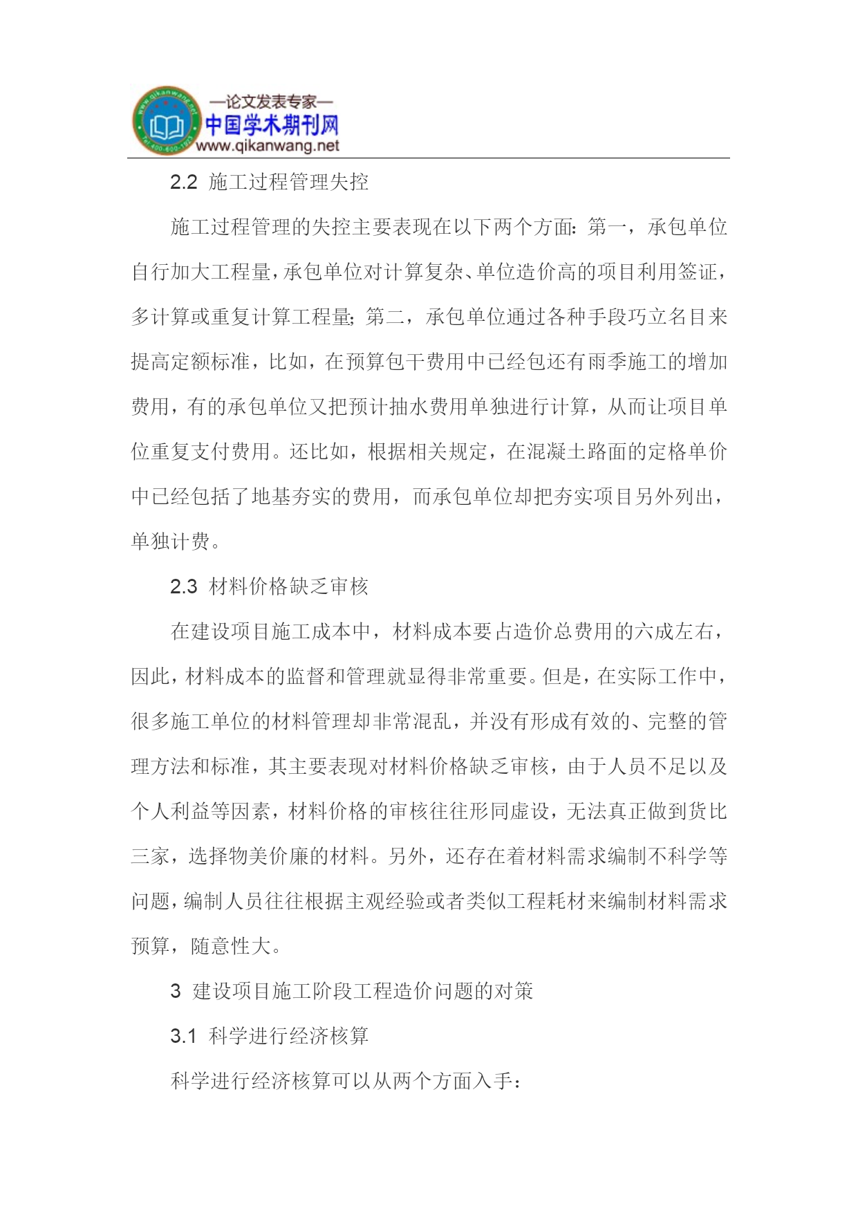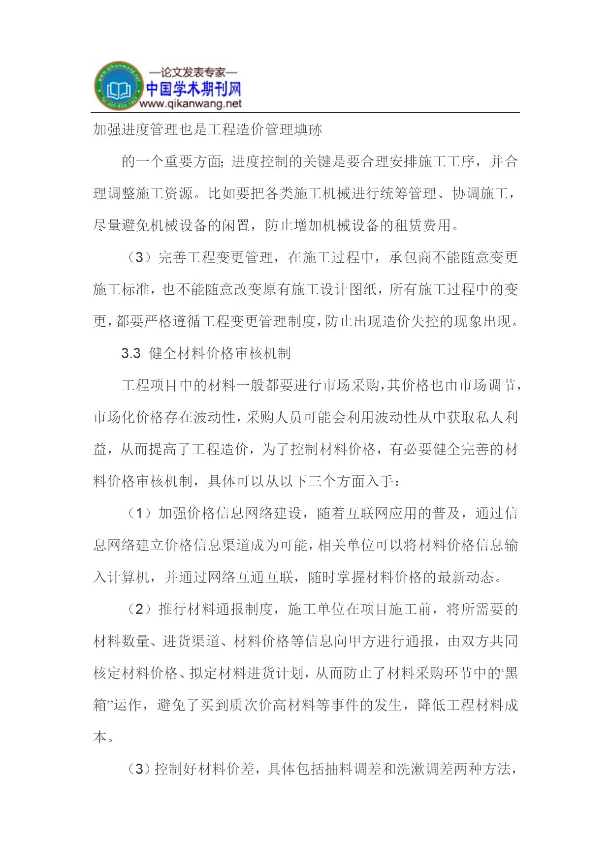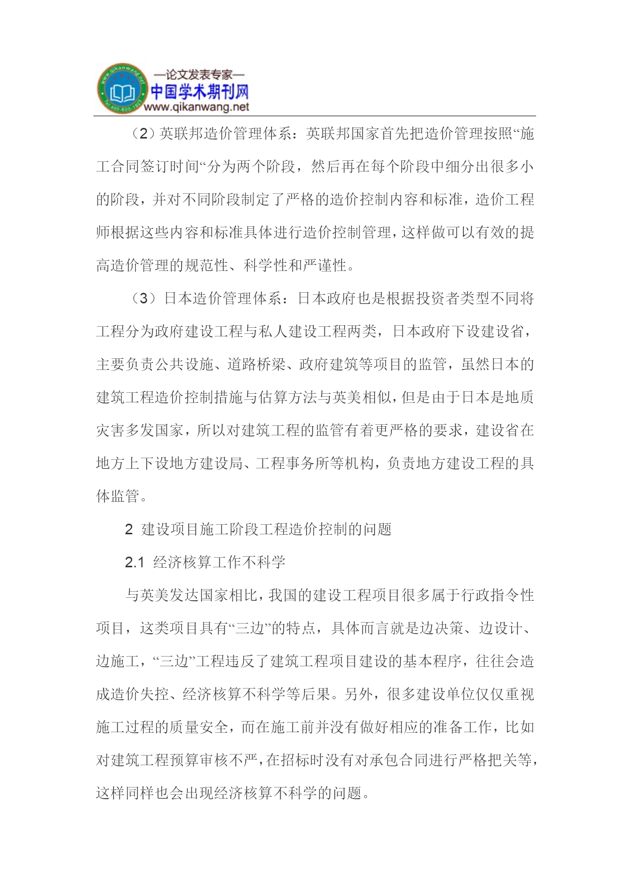 建筑工程造价论文工程造价管理论文:建设项目施工阶段工程造价控制探讨摘要:首先概述了建筑工程造价的基本概念,然后分析了建设项目施工阶段工程造价控制的问题,最后从三个方面研究了解决对策。关键词:建设项目;施工阶段;工程造价;控制1建筑工程造价概述1.1建筑工程造价的概念建筑工程造价,顾名思义就是指完成一项建筑工程所需要花费的所有费用,这些费用不仅包括建筑材料费用、人工费用、管理费用,还包括设计费用、监理费用等。建筑工程的造价与具体的建筑工程项目内容紧密相关,同时也与当地的建设管理水平、建设设计水平和施工技术水平存在着联系。1.2国外工程造价管理借鉴发达国家在建筑工程造价方面有着很多先进和成熟的经验,值得我们学习和借鉴。(1)美国造价管理体系:作为完全市场经济国家,美国在建筑工程项目的运作上也充分体现了市场化的运作模式,美国的建筑工程项目根据投资主体的不同,主要分为政府工程和私人工程两类,政府仅对自己投资的政府建设工程的造价进行管理和控制,而不干涉私人建设工程的造价管理,政府主要对政府工程的安全进度、造价控制、环境影响、社会效果等方面进行监管。(2)英联邦造价管理体系:英联邦国家首先把造价管理按照“施工合同签订时间“分为两个阶段,然后再在每个阶段中细分出很多小的阶段,并对不同阶段制定了严格的造价控制内容和标准,造价工程师根据这些内容和标准具体进行造价控制管理,这样做可以有效的提高造价管理的规范性、科学性和严谨性。(3)日本造价管理体系:日本政府也是根据投资者类型不同将工程分为政府建设工程与私人建设工程两类,日本政府下设建设省,主要负责公共设施、道路桥梁、政府建筑等项目的监管,虽然日本的建筑工程造价控制措施与估算方法与英美相似,但是由于日本是地质灾害多发国家,所以对建筑工程的监管有着更严格的要求,建设省在地方上下设地方建设局、工程事务所等机构,负责地方建设工程的具体监管。2建设项目施工阶段工程造价控制的问题2.1经济核算工作不科学与英美发达国家相比,我国的建设工程项目很多属于行政指令性项目,这类项目具有“三边”的特点,具体而言就是边决策、边设计、边施工,“三边”工程违反了建筑工程项目建设的基本程序,往往会造成造价失控、经济核算不科学等后果。另外,很多建设单位仅仅重视施工过程的质量安全,而在施工前并没有做好相应的准备工作,比如对建筑工程预算审核不严,在招标时没有对承包合同进行严格把关等,这样同样也会出现经济核算不科学的问题。2.2施工过程管理失控施工过程管理的失控主要表现在以下两个方面:第一,承包单位自行加大工程量,承包单位对计算复杂、单位造价高的项目利用签证,多计算或重复计算工程量;第二,承包单位通过各种手段巧立名目来提高定额标准,比如,在预算包干费用中已经包还有雨季施工的增加费用,有的承包单位又把预计抽水费用单独进行计算,从而让项目单位重复支付费用。还比如,根据相关规定,在混凝土路面的定格单价中已经包括了地基夯实的费用,而承包单位却把夯实项目另外列出,单独计费。2.3材料价格缺乏审核在建设项目施工成本中,材料成本要占造价总费用的六成左右,因此,材料成本的监督和管理就显得非常重要。但是,在实际工作中,很多施工单位的材料管理却非常混乱,并没有形成有效的、完整的管理方法和标准,其主要表现对材料价格缺乏审核,由于人员不足以及个人利益等因素,材料价格的审核往往形同虚设,无法真正做到货比三家,选择物美价廉的材料。另外,还存在着材料需求编制不科学等问题,编制人员往往根据主观经验或者类似工程耗材来编制材料需求预算,随意性大。3建设项目施工阶段工程造价问题的对策3.1科学进行经济核算科学进行经济核算可以从两个方面入手:(1)认真进行“两算”对比,“两算”指的是实际施工图预算与设计预算,对施工图预算与设计预算进行认真、细致地对比,有助于找出两者的差异,从而有针对性的实施造价控制,具体对比可以从项目数量、人工成本、材料费用、机械设备消耗量等方面来进行,重点要防止漏算、多算、错算的情况发生,做到及早发现问题、分析问题和解决问题,对产生差异的原因要做到心中有数,这样有利于更加合理的安排调动相关资源,降低造价费用。(2)加强施工成本的核算分析,在完成“两算”对比之后,需要制定相应的费用目标,并在施工过程中加强成本核算及分析,其具体做法是:在施工过程中,对人工、机械、材料的消耗进行认真地检查、记录和核算,并将实际费用结果与进度消耗计划、施工图定额消耗计划进行对比,从而找出其中存在的问题,及时进行纠正,达到节约支出、减少浪费的目的。3.2加强施工过程的管理控制加强施工过程的管理控制具体有以下三方面的内容:(1)加强工程质量控制,加强质量控制可以减少返工现象的出现,返工越多工程造价就越高,质量控制可以从检查监督
