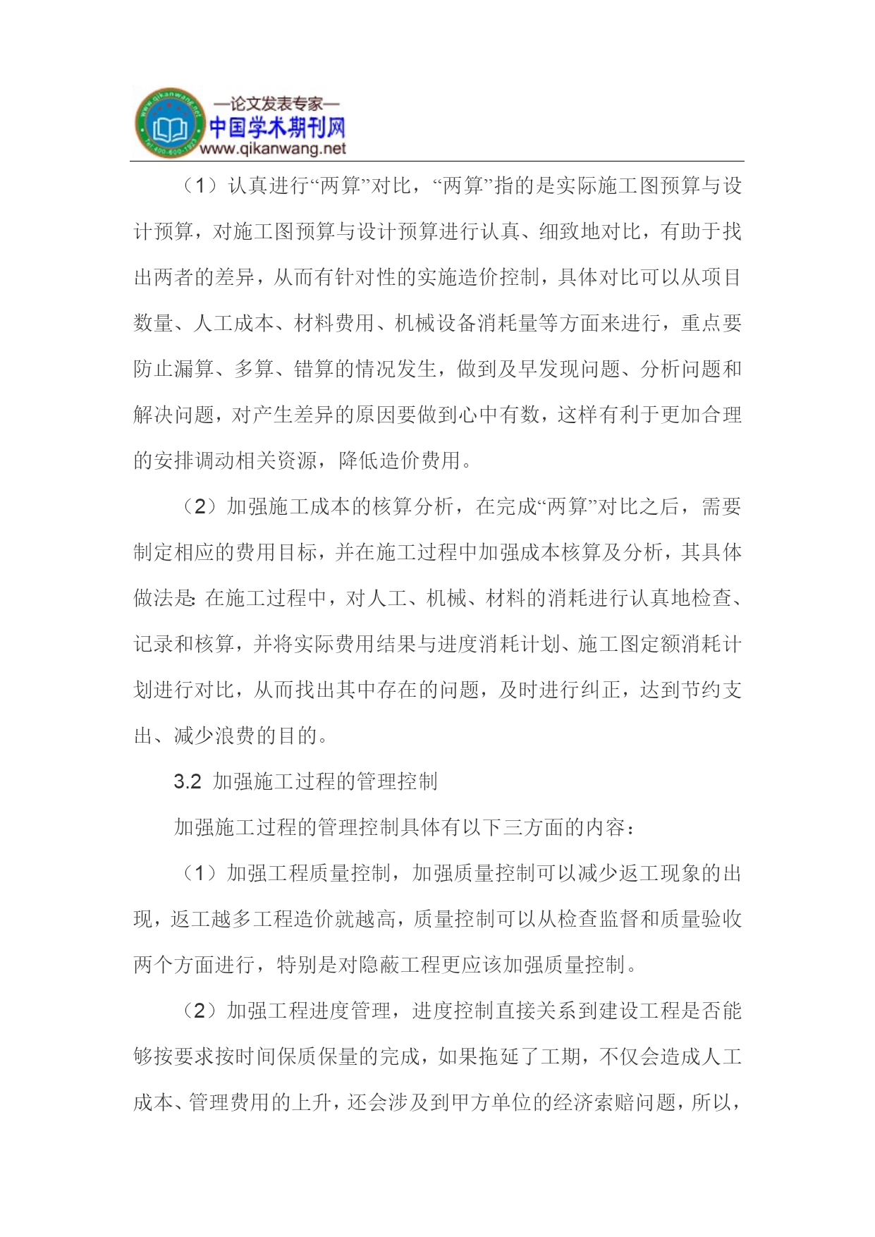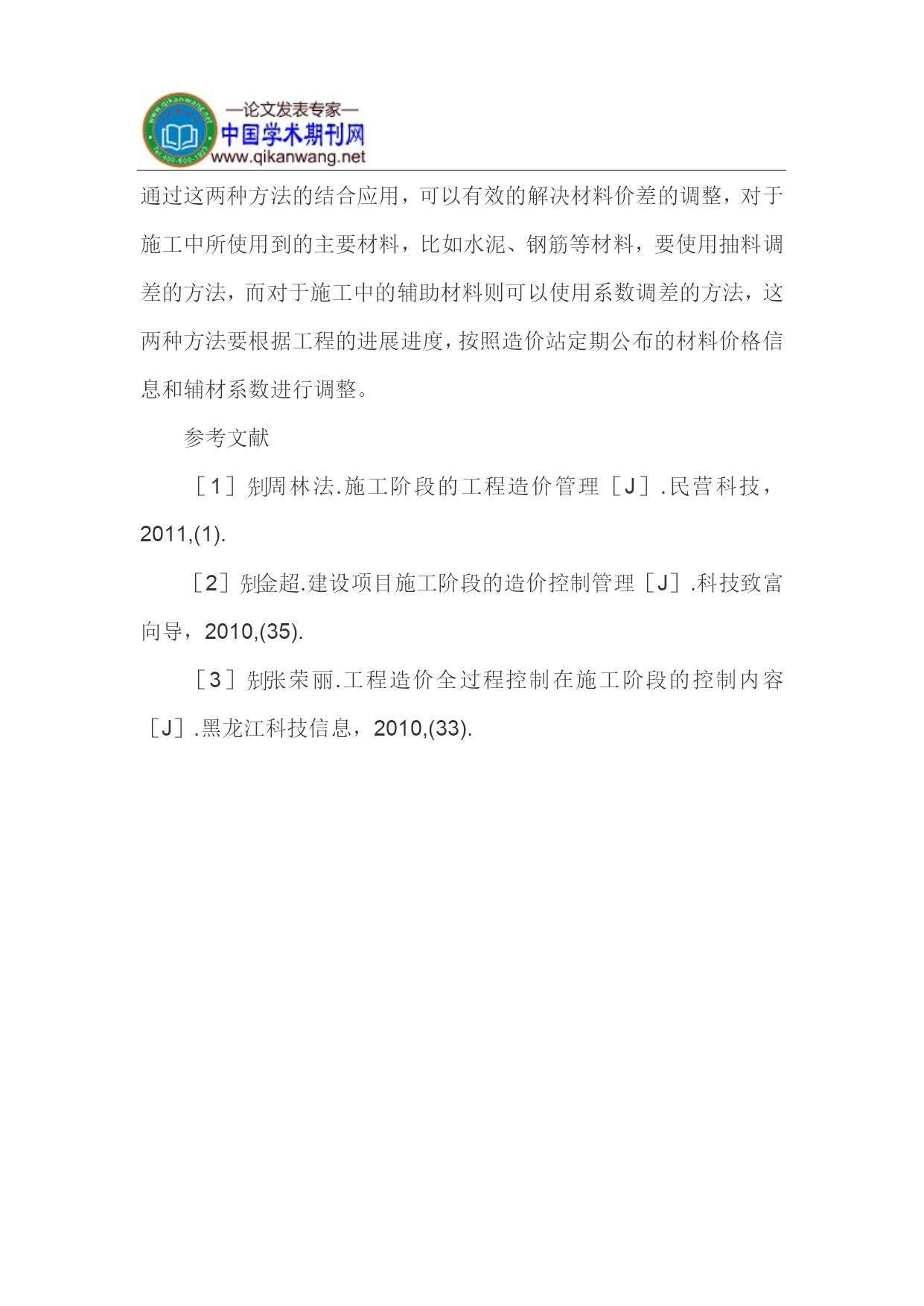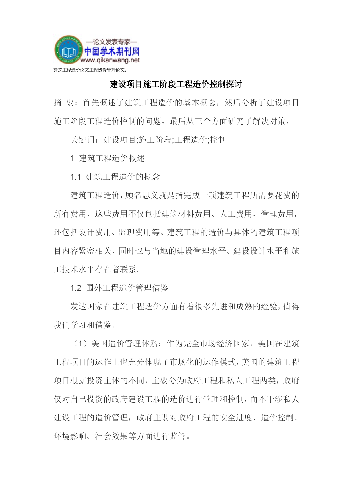 建筑工程造价论文工程造价管理论文:建设项目施工阶段工程造价控制探讨摘要:首先概述了建筑工程造价的基本概念,然后分析了建设项目施工阶段工程造价控制的问题,最后从三个方面研究了解决对策。关键词:建设项目;施工阶段;工程造价;控制1建筑工程造价概述1.1建筑工程造价的概念建筑工程造价,顾名思义就是指完成一项建筑工程所需要花费的所有费用,这些费用不仅包括建筑材料费用、人工费用、管理费用,还包括设计费用、监理费用等。建筑工程的造价与具体的建筑工程项目内容紧密相关,同时也与当地的建设管理水平、建设设计水平和施工技术水平存在着联系。1.2国外工程造价管理借鉴发达国家在建筑工程造价方面有着很多先进和成熟的经验,值得我们学习和借鉴。(1)美国造价管理体系:作为完全市场经济国家,美国在建筑工程项目的运作上也充分体现了市场化的运作模式,美国的建筑工程项目根据投资主体的不同,主要分为政府工程和私人工程两类,政府仅对自己投资的政府建设工程的造价进行管理和控制,而不干涉私人建设工程的造价管理,政府主要对政府工程的安全进度、造价控制、环境影响、社会效果等方面进行监管。(2)英联邦造价管理体系:英联邦国家首先把造价管理按照“施工合同签订时间“分为两个阶段,然后再在每个阶段中细分出很多小的阶段,并对不同阶段制定了严格的造价控制内容和标准,造价工程师根据这些内容和标准具体进行造价控制管理,这样做可以有效的提高造价管理的规范性、科学性和严谨性。(3)日本造价管理体系:日本政府也是根据投资者类型不同将工程分为政府建设工程与私人建设工程两类,日本政府下设建设省,主要负责公共设施、道路桥梁、政府建筑等项目的监管,虽然日本的建筑工程造价控制措施与估算方法与英美相似,但是由于日本是地质灾害多发国家,所以对建筑工程的监管有着更严格的要求,建设省在地方上下设地方建设局、工程事务所等机构,负责地方建设工程的具体监管。2建设项目施工阶段工程造价控制的问题2.1经济核算工作不科学与英美发达国家相比,我国的建设工程项目很多属于行政指令性项目,这类项目具有“三边”的特点,具体而言就是边决策、边设计、边施工,“三边”工程违反了建筑工程项目建设的基本程序,往往会造成造价失控、经济核算不科学等后果。另外,很多建设单位仅仅重视施工过程的质量安全,而在施工前并没有做好相应的准备工作,比如对建筑工程预算审核不严,在招标时没有对承包合同进行严格把关等,这样同样也会出现经济核算不科学的问题。2.2施工过程管理失控施工过程管理的失控主要表现在以下两个方面:第一,承包单位自行加大工程量,承包单位对计算复杂、单位造价高的项目利用签证,多计算或重复计算工程量;第二,承包单位通过各种手段巧立名目来提高定额标准,比如,在预算包干费用中已经包还有雨季施工的增加费用,有的承包单位又把预计抽水费用单独进行计算,从而让项目单位重复支付费用。还比如,根据相关规定,在混凝土路面的定格单价中已经包括了地基夯实的费用,而承包单位却把夯实项目另外列出,单独计费。2.3材料价格缺乏审核在建设项目施工成本中,材料成本要占造价总费用的六成左右,因此,材料成本的监督和管理就显得非常重要。但是,在实际工作中,很多施工单位的材料管理却非常混乱,并没有形成有效的、完整的管理方法和标准,其主要表现对材料价格缺乏审核,由于人员不足以及个人利益等因素,材料价格的审核往往形同虚设,无法真正做到货比三家,选择物美价廉的材料。另外,还存在着材料需求编制不科学等问题,编制人员往往根据主观经验或者类似工程耗材来编制材料需求预算,随意性大。3建设项目施工阶段工程造价问题的对策3.1科学进行经济核算科学进行经济核算可以从两个方面入手:(1)认真进行“两算”对比,“两算”指的是实际施工图预算与设计预算,对施工图预算与设计预算进行认真、细致地对比,有助于找出两者的差异,从而有针对性的实施造价控制,具体对比可以从项目数量、人工成本、材料费用、机械设备消耗量等方面来进行,重点要防止漏算、多算、错算的情况发生,做到及早发现问题、分析问题和解决问题,对产生差异的原因要做到心中有数,这样有利于更加合理的安排调动相关资源,降低造价费用。(2)加强施工成本的核算分析,在完成“两算”对比之后,需要制定相应的费用目标,并在施工过程中加强成本核算及分析,其具体做法是:在施工过程中,对人工、机械、材料的消耗进行认真地检查、记录和核算,并将实际费用结果与进度消耗计划、施工图定额消耗计划进行对比,从而找出其中存在的问题,及时进行纠正,达到节约支出、减少浪费的目的。3.2加强施工过程的管理控制加强施工过程的管理控制具体有以下三方面的内容:(1)加强工程质量控制,加强质量控制可以减少返工现象的出现,返工越多工程造价就越高,质量控制可以从检查监督