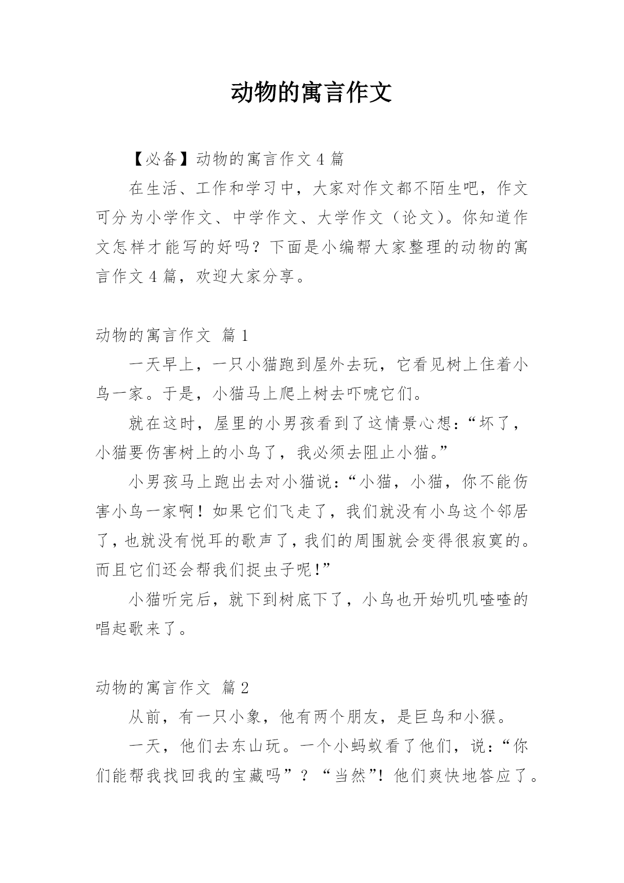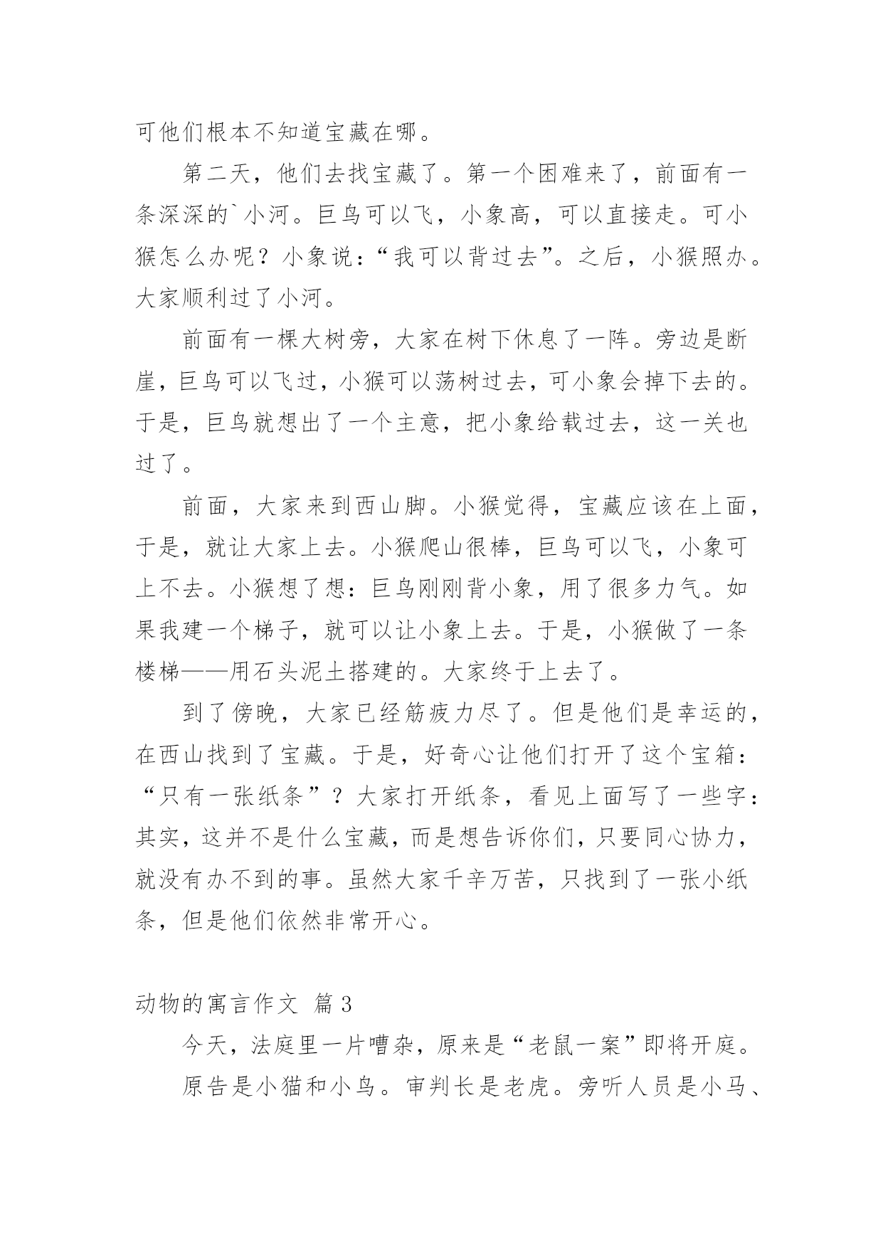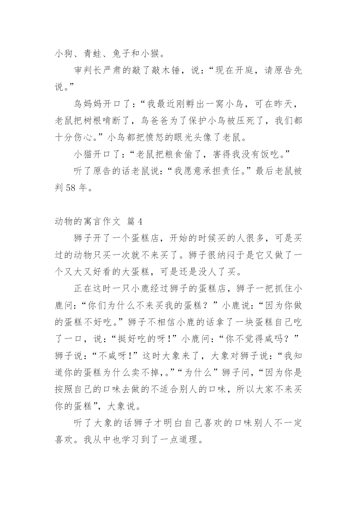 动物的寓言作文【必备】动物的寓言作文4篇在生活、工作和学习中,大家对作文都不陌生吧,作文可分为小学作文、中学作文、大学作文(论文)。你知道作文怎样才能写的好吗?下面是小编帮大家整理的动物的寓言作文4篇,欢迎大家分享。动物的寓言作文篇1一天早上,一只小猫跑到屋外去玩,它看见树上住着小鸟一家。于是,小猫马上爬上树去吓唬它们。就在这时,屋里的小男孩看到了这情景心想:“坏了,小猫要伤害树上的小鸟了,我必须去阻止小猫。”小男孩马上跑出去对小猫说:“小猫,小猫,你不能伤害小鸟一家啊!如果它们飞走了,我们就没有小鸟这个邻居了,也就没有悦耳的歌声了,我们的周围就会变得很寂寞的。而且它们还会帮我们捉虫子呢!”小猫听完后,就下到树底下了,小鸟也开始叽叽喳喳的唱起歌来了。动物的寓言作文篇2从前,有一只小象,他有两个朋友,是巨鸟和小猴。一天,他们去东山玩。一个小蚂蚁看了他们,说:“你们能帮我找回我的宝藏吗”?“当然”!他们爽快地答应了。可他们根本不知道宝藏在哪。第二天,他们去找宝藏了。第一个困难来了,前面有一条深深的`小河。巨鸟可以飞,小象高,可以直接走。可小猴怎么办呢?小象说:“我可以背过去”。之后,小猴照办。大家顺利过了小河。前面有一棵大树旁,大家在树下休息了一阵。旁边是断崖,巨鸟可以飞过,小猴可以荡树过去,可小象会掉下去的。于是,巨鸟就想出了一个主意,把小象给载过去,这一关也过了。前面,大家来到西山脚。小猴觉得,宝藏应该在上面,于是,就让大家上去。小猴爬山很棒,巨鸟可以飞,小象可上不去。小猴想了想:巨鸟刚刚背小象,用了很多力气。如果我建一个梯子,就可以让小象上去。于是,小猴做了一条楼梯——用石头泥土搭建的。大家终于上去了。到了傍晚,大家已经筋疲力尽了。但是他们是幸运的,在西山找到了宝藏。于是,好奇心让他们打开了这个宝箱:“只有一张纸条”?大家打开纸条,看见上面写了一些字:其实,这并不是什么宝藏,而是想告诉你们,只要同心协力,就没有办不到的事。虽然大家千辛万苦,只找到了一张小纸条,但是他们依然非常开心。动物的寓言作文篇3今天,法庭里一片嘈杂,原来是“老鼠一案”即将开庭。原告是小猫和小鸟。审判长是老虎。旁听人员是小马、小狗、青蛙、兔子和小猴。审判长严肃的敲了敲木锤,说:“现在开庭,请原告先说。”鸟妈妈开口了:“我最近刚孵出一窝小鸟,可在昨天,老鼠把树根啃断了,鸟爸爸为了保护小鸟被压死了,我们都十分伤心。”小鸟都把愤怒的眼光头像了老鼠。小猫开口了:“老鼠把粮食偷了,害得我没有饭吃。”听了原告的话老鼠说:“我愿意承担责任。”最后老鼠被判58年。动物的寓言作文篇4狮子开了一个蛋糕店,开始的时候买的人很多,可是买过的动物只买一次就不来买了。狮子很纳闷于是它又做了一个又大又好看的大蛋糕,可是还是没人了买。正在这时一只小鹿经过狮子的蛋糕店,狮子一把抓住小鹿问:“你们为什么不来买我的蛋糕?”小鹿说:“因为你做的蛋糕不好吃。”狮子不相信小鹿的话拿了一块蛋糕自己吃了一口,说:“挺好吃的呀!”小鹿问:“你不觉得咸吗?”狮子说:“不咸呀!”这时大象来了,大象对狮子说:“我知道你的蛋糕为什么卖不掉,。”“为什么”狮子问,“因为你是按照自己的口味去做的不适合别人的口味,所以大家不来买你的蛋糕”,大象说。听了大象的话狮子才明白自己喜欢的口味别人不一定喜欢。我从中也学习到了一点道理。