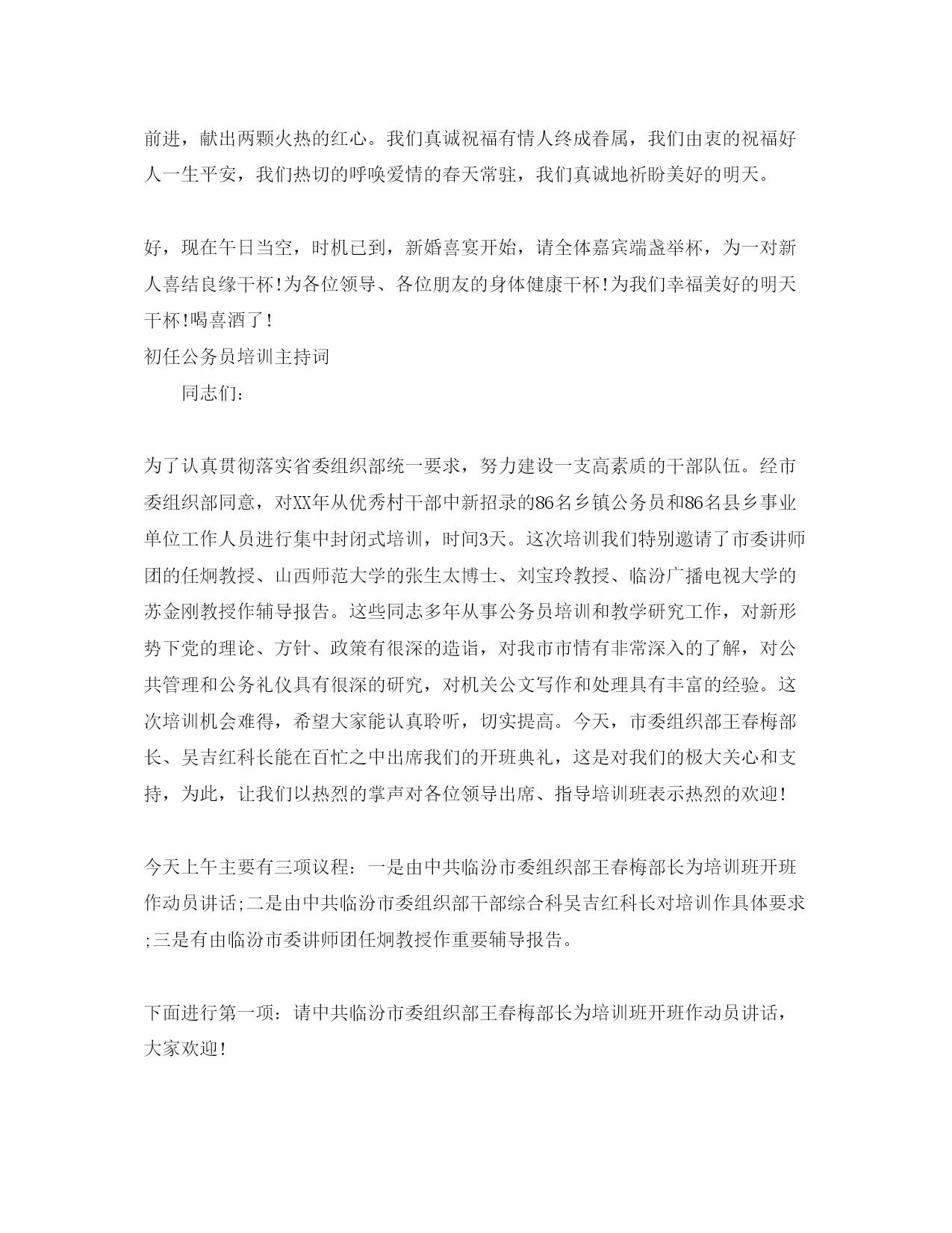 此资料由网络收集而来,如有侵权请告知上传者立即删除。资料共分享,我们负责传递知识。公务员主持词3篇推荐阅读:各位来宾、各位朋友,男人是船、女人是帆,家庭是港湾。结婚是爱情长跑的终点,更是牵手同行漫漫长路的起点。婚前的爱情常常充满着浪漫和幻想,更深的感情要靠婚后去培养。婚姻无戏言,婚姻贵在美满,美满贵在情感结婚典礼主持词(一)一、开场白今天能够亲临现场,到此落座的都是他们的挚爱亲朋,我们会在典礼过程中有很多精彩的场面,一一呈现给大家。在婚礼达到高-潮的时候,还请您伸出热情的双手,用最热烈的掌声、用最真诚的祝福,献给一对新人,大家说好不好!你的热情、你的掌声,就是主持人的兴奋剂,催化剂。在这里我谢谢大家的掌声、谢谢大家的热情。(鞠躬)亲朋好友欢聚一堂,丰润酒店欢庆吉祥,**、**喜结良缘、夫妻恩爱、地久天长。二、开幕词女士们先生们!尊敬的各位来宾朋友们,大家中午好。鲜花盛开,香飘万家。唐山大地祥云彩挂。一代良缘世人皆夸,百年佳偶永传佳话。今天是XX年**月**日,今天是个好日子,好日子伴随着好心情,彩云飞翔,好心情伴随好生活,欢乐吉祥,好生活伴随好家庭,幸福安康!我们因为爱欢聚一堂,这浓浓的亲情、友情让我们相约丰润酒店。同贺一对新人,喜结伉俪,在此我代表新郎新娘以及双方父母,对各位来宾在百忙之中前来捧场道贺表示热烈的欢迎和忠心的感谢。祝小朋友们好梦甜甜;老年朋友们福寿绵绵,祝所有来宾朋友们在新的一年里好运连连。好,吉时已到,我宣布曾小卫先生和王亚萍小姐新婚暨回拜庆典现在开始。三、喜东及新人登场让我们大家用热烈的掌声有请四位主婚人闪亮登常好,来宾朋友们我们把热烈的掌声献给四位主婚人。我们的四位主婚人神采奕奕,甜在心里,笑在脸上,他们的孩子小时侯随身带,搂身旁,今天长大了,结婚了,这多么富有成就感,我建议大家用热烈的掌声,给四位喜东道喜了。好,各位请坐。来宾朋友们激动人心的时刻到来了,让我们共同倒计时来迎接这激动人心的时刻。5、4、3、2、1,青春将在这里展现,浪漫将在这里回荡,来宾朋友们热烈的掌声响起,我们有请新郎新娘步入婚礼殿堂,爱情成就幸福路,幸福路上迎新人。他们像鸳鸯戏水,又似彩蝶纷飞,含情默默,暗送秋波,今天他们终于走到了一起,爱到了一起,让我们把热烈的掌声献给他们。好,我们的主人公新郎新娘已经慢步来到了台前,大家请看我们的新郎高大威武,英俊潇洒,大家说帅不帅。我们的新娘更是温柔靓丽、秀美端庄大家说美不美!他们的结合是天作之合珠联璧合,情投意合、志同道合!接下来,有请新郎新娘共同回答我们一个问题,新郎新娘从今天开始呢,你们相濡以沫、相爱如出永远不离不弃永远呵护对方、爱护对方你们愿意吗?有三个答案a愿意,b非常愿意,c死戚白咧的非常愿意。来宾作证、天地作证,这正是情深谱成连心曲,意合浇开并蒂花,喜看恋人成佳偶,今日共建幸福家。美满姻缘情深意切,和睦家庭地久天长。四、大礼三拜1拜宾朋接下来呢,我们举行中华民族的传统礼拜仪式,有请新郎新娘向前一步,朋友是天、朋友是地,有了朋友顶天立地;朋友是风、朋友是雨,有了朋友呼风唤雨,我们把这第一拜献给在座的所有亲朋好友,一鞠躬。亲相聚、朋满座,感谢大家来祝贺,二鞠躬;鞠个躬、敬个礼,感谢大家来道喜,朋友们掌声不热烈,是不是新郎新娘鞠躬度数不够,是不是?有请来宾朋友们配合,我们的掌声越热烈,新郎新娘鞠躬度数越深,我们的掌声不停呢新郎新娘就不起来,大家说好不好?新郎新娘说好不好?三鞠躬,逢喜事、乐开怀,还望大家多往来,谢谢大家。2拜高堂水有源头,树有根,终生难忘父母恩,能有今朝喜庆日,拜谢父母表孝心,请面向父母,父母用勤劳的双手给了我们幸福的家园,是母亲用甘甜的乳汁哺育我们长大,等就等这一天,盼就盼这一刻,为了儿女们的幸福、为了儿女们有一个温馨的小家,做父母的再苦再累也心甘情愿,这父爱比天高、这母爱比地大,父母的恩情儿女们一辈子也难以报答,今天我们不拜天不拜地就拜这父母深情厚意。一鞠躬,感谢父母的养育之恩;二鞠躬,感谢父母操办婚事;三鞠躬,共同祝愿父母大人也祝愿天下所有父亲母亲福寿安康。3对拜在这温馨浪漫的一天,在这激动人心的一刻,一对新人等啊等、盼啊盼,终于瓜熟蒂落、喜结良缘,这就是天赐的甘露换来了金色的收获;练就的琼浆,酿成了甜蜜的生活,接下来,请新郎新娘相对站好,谁鞠躬的度数深呢,就表示对对方的爱越深。一鞠躬,不打架、不拌嘴、不生气、不后悔,请问新郎打架吗?拌嘴吗?听媳妇话吗?我告诉你,媳妇的话就是圣旨,记住了吗?记住什么了?好,今天你服媳妇管,明年你的事业有发展;二鞠躬,讲道理、明是非、相互信任理解万岁;这三鞠躬一定头碰头,而且要碰出响声来,这是你们夫妻的合声,夫妻头碰头好事才开头,幸福的日子有奔头。好,向前半步,三鞠躬,爱情之花并蒂开,明年喜得双胞