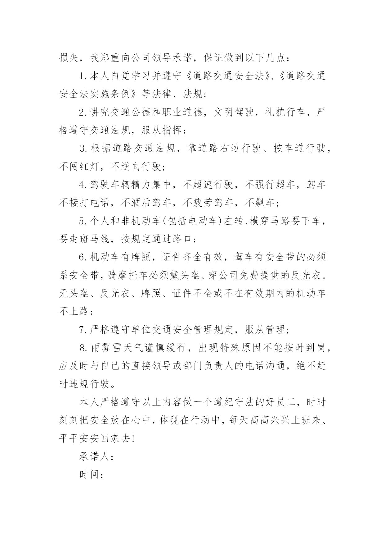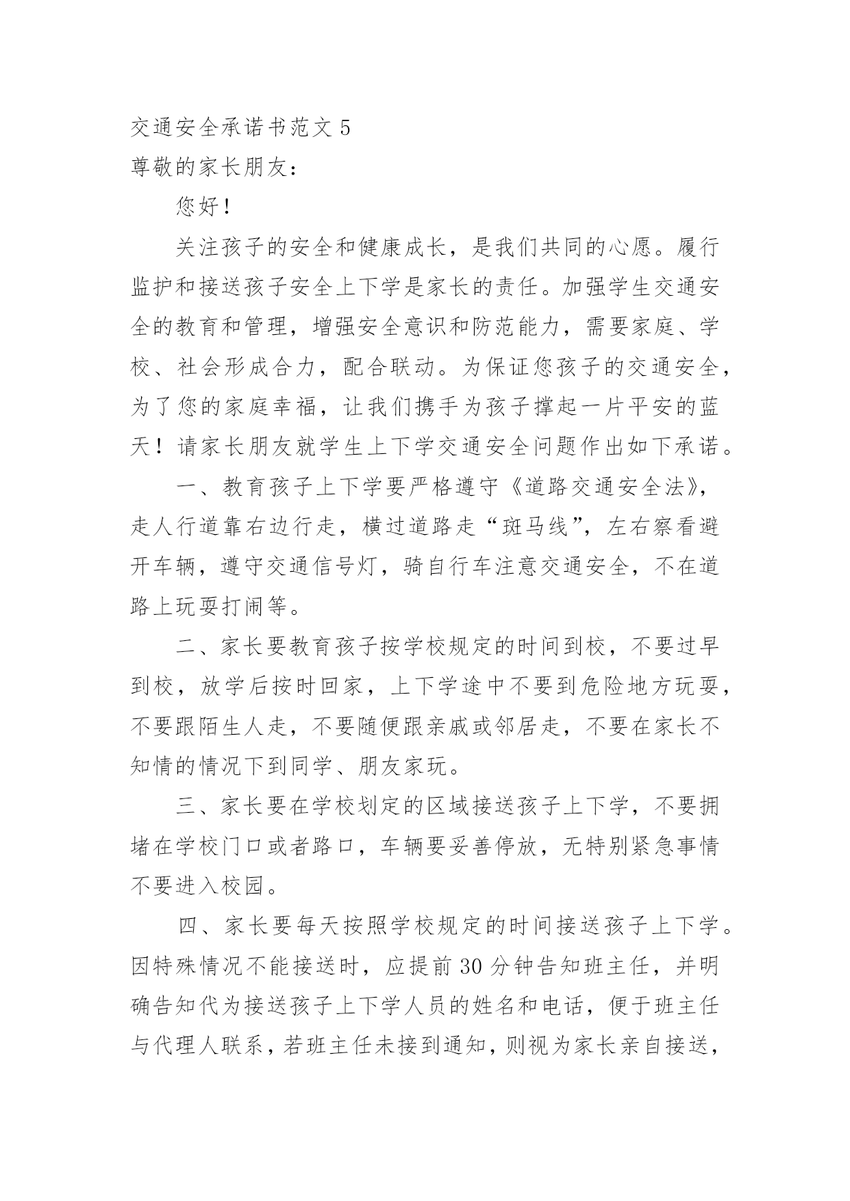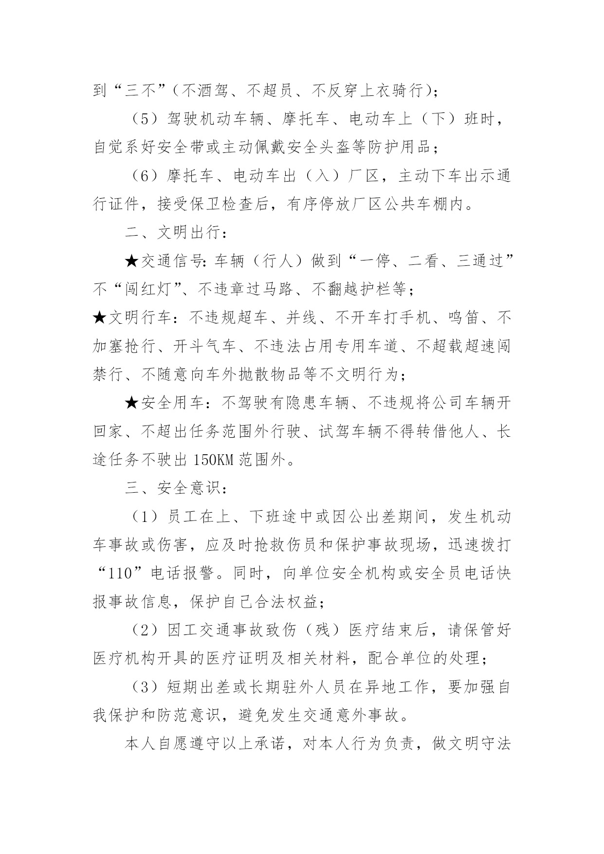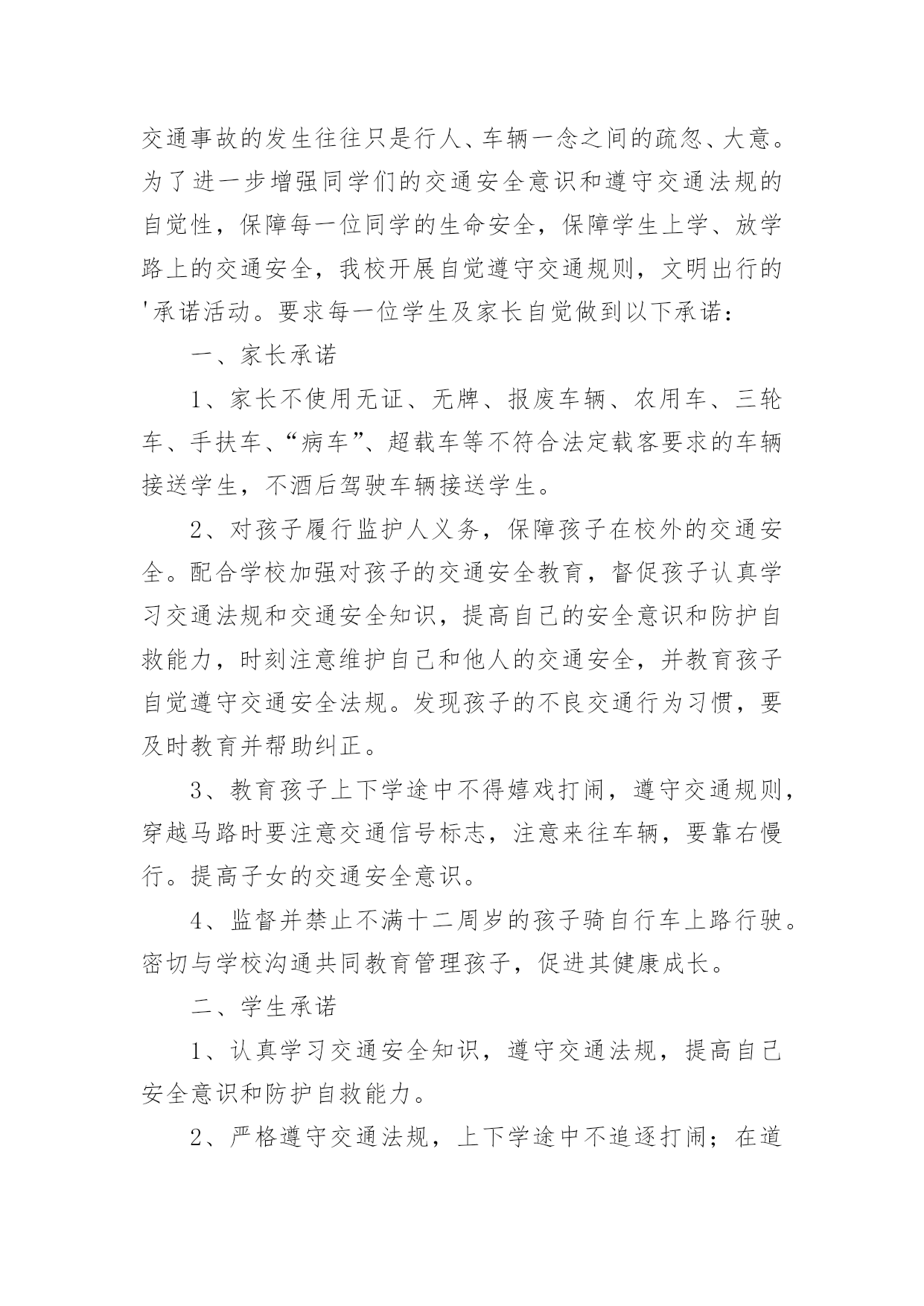 交通安全承诺书交通安全承诺书范文在学习、工作生活中,越来越多地方需要用到承诺书,承诺书必须由受要约人作出,只有受要约人才能取得承诺的权利,受要约人以外的第三人不享有承诺的权利。还是对承诺书一筹莫展吗?以下是小编为大家收集的交通安全承诺书范文,供大家参考借鉴,希望可以帮助到有需要的朋友。交通安全承诺书范文1尊敬的员工和家属:您们好!“生命只有一次,安全从我做起”。交通文明关系到每一个家庭的幸福,也是现代文明人应有的基本素质,每一位干部、职工都有责任和义务来维护交通文明安全,增强自身交通安全意识与遵守交通规则的自觉性。为了维护道路交通安全秩序,预防和减少道路交通事故,确保生命健康安全。一、遵章守法:(1)遵守国家交通法规及厂内交通安全管理规定;(2)主动购买车辆保险或非机动车意外险,减少交通意外事故的经济损失;(3)不驾驶“三无”车辆(证、牌、保险),电动车不挤占机动车道和频繁变道行驶;(4)驾驶机动车辆、非机动车辆在道路行驶,自觉做到“三不”(不酒驾、不超员、不反穿上衣骑行);(5)驾驶机动车辆、摩托车、电动车上(下)班时,自觉系好安全带或主动佩戴安全头盔等防护用品;(6)摩托车、电动车出(入)厂区,主动下车出示通行证件,接受保卫检查后,有序停放厂区公共车棚内。二、文明出行:★交通信号:车辆(行人)做到“一停、二看、三通过”不“闯红灯”、不违章过马路、不翻越护栏等;★文明行车:不违规超车、并线、不开车打手机、鸣笛、不加塞抢行、开斗气车、不违法占用专用车道、不超载超速闯禁行、不随意向车外抛散物品等不文明行为;★安全用车:不驾驶有隐患车辆、不违规将公司车辆开回家、不超出任务范围外行驶、试驾车辆不得转借他人、长途任务不驶出150KM范围外。三、安全意识:(1)员工在上、下班途中或因公出差期间,发生机动车事故或伤害,应及时抢救伤员和保护事故现场,迅速拨打“110”电话报警。同时,向单位安全机构或安全员电话快报事故信息,保护自己合法权益;(2)因工交通事故致伤(残)医疗结束后,请保管好医疗机构开具的医疗证明及相关材料,配合单位的处理;(3)短期出差或长期驻外人员在异地工作,要加强自我保护和防范意识,避免发生交通意外事故。本人自愿遵守以上承诺,对本人行为负责,做文明守法公民。交通安全承诺书范文2“遵章守法,从我做起。”为了维护道路交通安全秩序,预防和减少道路交通事故,确保自身、家庭以及社会公众的平安、幸福,作为一名教师和交通参与者,我承诺做到:一、自觉遵守《中华人民共和国道路交通安全法》、《贵州省道路交通安全条例》及其相关法律、法规,时刻谨记交通安全。二、持证驾车、驾安全车,文明行车,切实做到不酒后驾车,不闯红灯,不超载超速,不开英雄车、斗气车。三、停文明车,切实做到路口不越线停车,不在网格线内停车,不在路口、公交停靠站点停车,不违法占道乱停乱放。四、家庭自用,不营运,不借机运送学生或租赁他人。五、手续齐全、按时年检和缴纳保险。六、珍爱生命、遵章守法、文明驾驶、礼让行车、恪守承诺。七、本人自愿遵守以上承诺,对本人行为负责,做文明守法的教育工作者,与全校师生一起,共建平安校园。八、本承诺书一式两份,甲乙双方各一份。甲方(学校法人代表):乙方(承诺人):交通安全承诺书范文3安全无小事,交通安全从我做起。众多的事实告诉我们,交通事故的发生往往只是行人、车辆一念之间的疏忽、大意。为了进一步增强同学们的交通安全意识和遵守交通法规的自觉性,保障每一位同学的生命安全,保障学生上学、放学路上的交通安全,我校开展自觉遵守交通规则,文明出行的'承诺活动。要求每一位学生及家长自觉做到以下承诺:一、家长承诺1、家长不使用无证、无牌、报废车辆、农用车、三轮车、手扶车、“病车”、超载车等不符合法定载客要求的车辆接送学生,不酒后驾驶车辆接送学生。2、对孩子履行监护人义务,保障孩子在校外的交通安全。配合学校加强对孩子的交通安全教育,督促孩子认真学习交通法规和交通安全知识,提高自己的安全意识和防护自救能力,时刻注意维护自己和他人的交通安全,并教育孩子自觉遵守交通安全法规。发现孩子的不良交通行为习惯,要及时教育并帮助纠正。3、教育孩子上下学途中不得嬉戏打闹,遵守交通规则,穿越马路时要注意交通信号标志,注意来往车辆,要靠右慢行。提高子女的交通安全意识。4、监督并禁止不满十二周岁的孩子骑自行车上路行驶。密切与学校沟通共同教育管理孩子,促进其健康成长。二、学生承诺1、认真学习交通安全知识,遵守交通法规,提高自己安全意识和防护自救能力。2、严格遵守交通法规,上下学途中不追逐打闹;在道路上行走做到:走路靠右行;不违章过马路,在没有交通信号的交叉路口或横穿公路时要慢行;注意观察,看清来往车辆,做到“一停二看三通过”、“红灯停,绿灯行”等。3、严格遵守“五不”原则。乘坐汽车时,不得将头