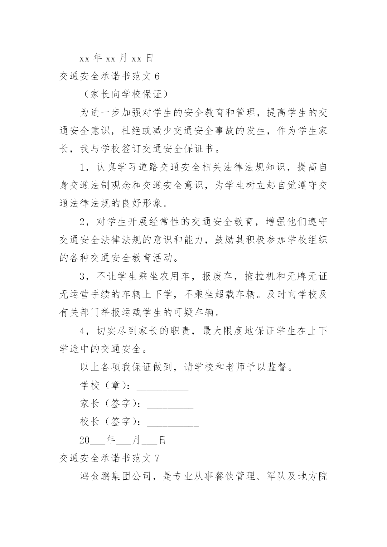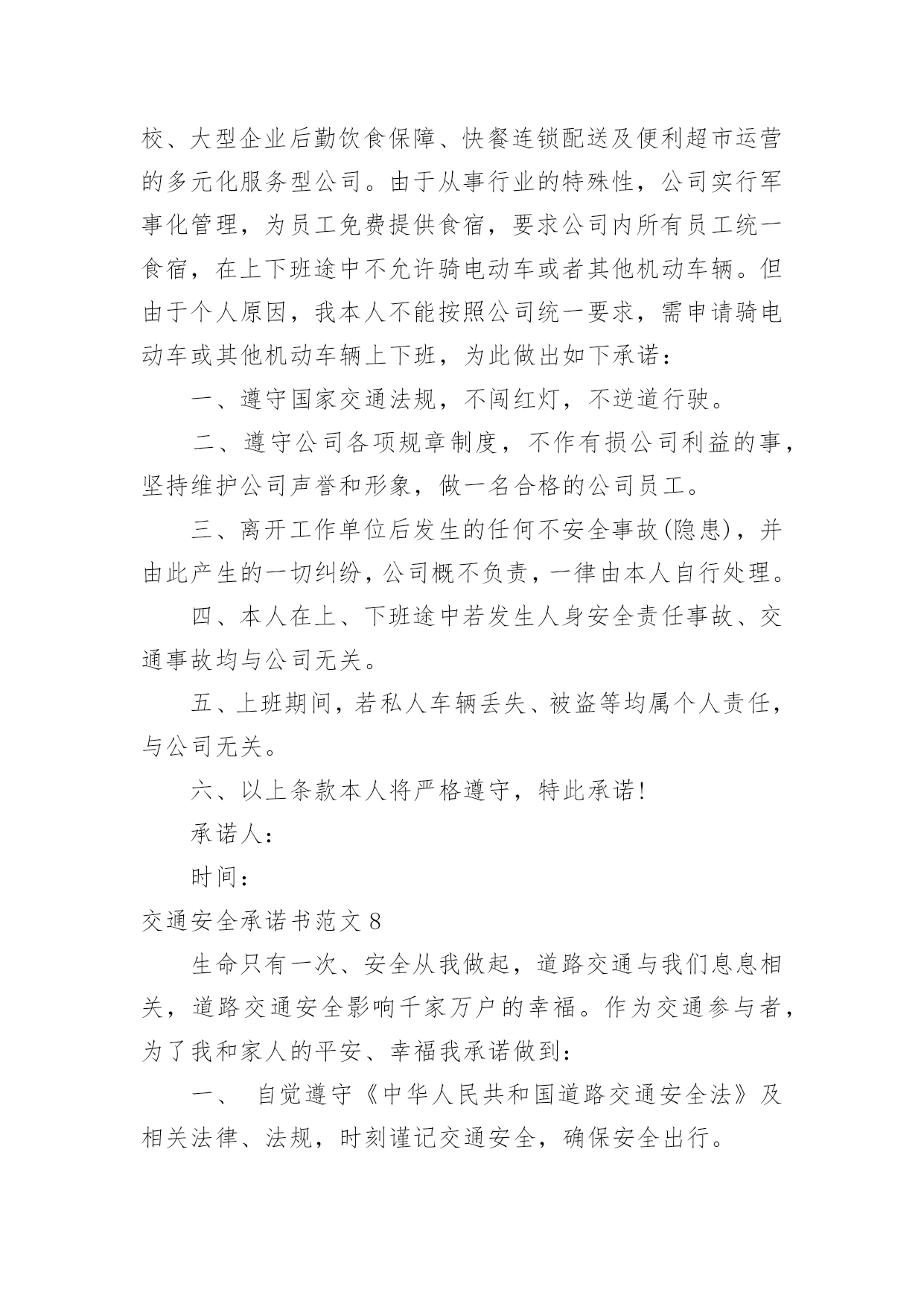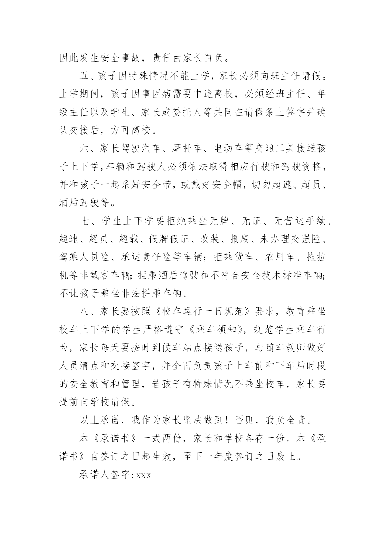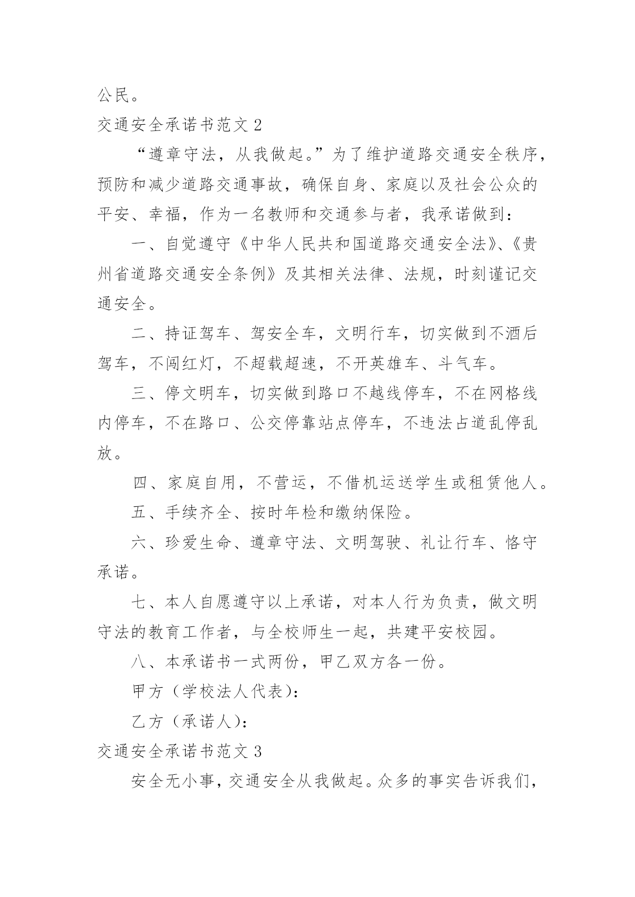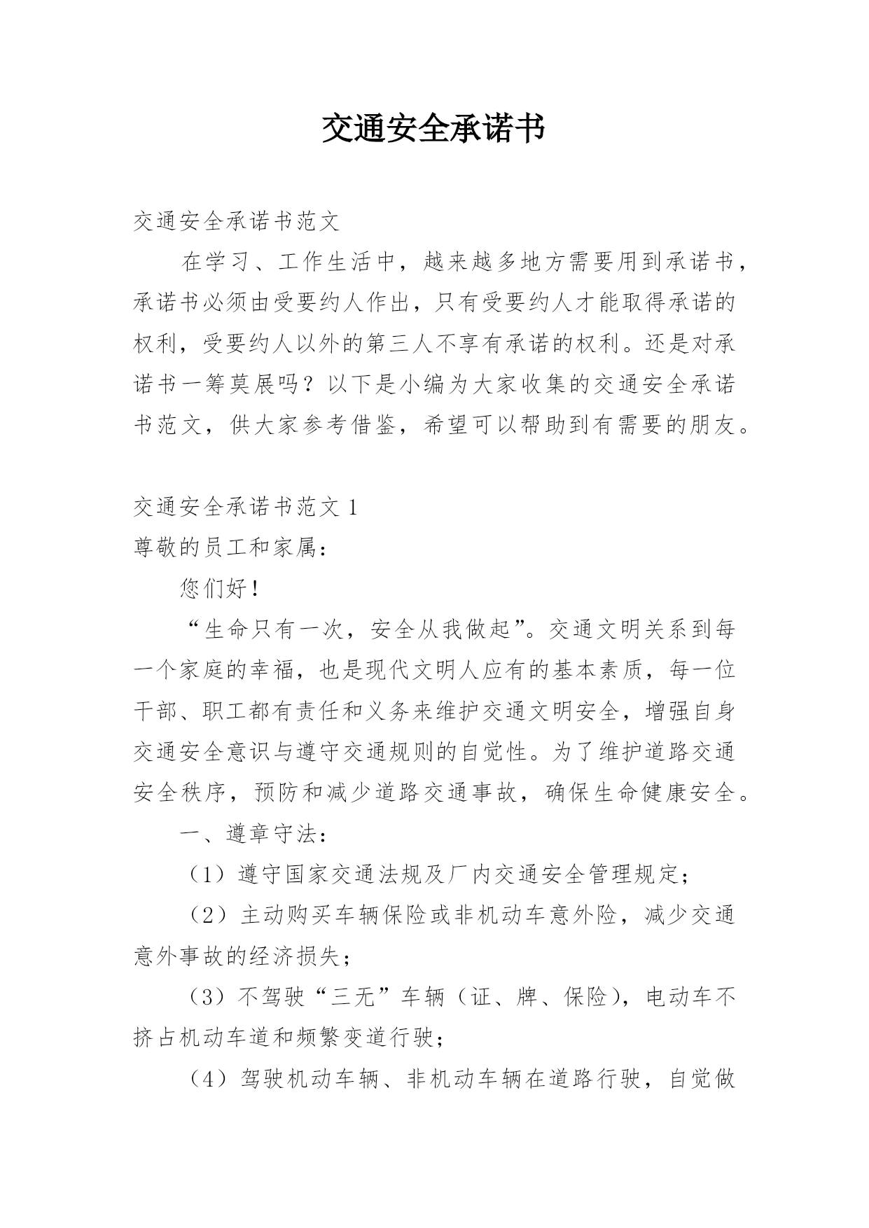 交通安全承诺书交通安全承诺书范文在学习、工作生活中,越来越多地方需要用到承诺书,承诺书必须由受要约人作出,只有受要约人才能取得承诺的权利,受要约人以外的第三人不享有承诺的权利。还是对承诺书一筹莫展吗?以下是小编为大家收集的交通安全承诺书范文,供大家参考借鉴,希望可以帮助到有需要的朋友。交通安全承诺书范文1尊敬的员工和家属:您们好!“生命只有一次,安全从我做起”。交通文明关系到每一个家庭的幸福,也是现代文明人应有的基本素质,每一位干部、职工都有责任和义务来维护交通文明安全,增强自身交通安全意识与遵守交通规则的自觉性。为了维护道路交通安全秩序,预防和减少道路交通事故,确保生命健康安全。一、遵章守法:(1)遵守国家交通法规及厂内交通安全管理规定;(2)主动购买车辆保险或非机动车意外险,减少交通意外事故的经济损失;(3)不驾驶“三无”车辆(证、牌、保险),电动车不挤占机动车道和频繁变道行驶;(4)驾驶机动车辆、非机动车辆在道路行驶,自觉做到“三不”(不酒驾、不超员、不反穿上衣骑行);(5)驾驶机动车辆、摩托车、电动车上(下)班时,自觉系好安全带或主动佩戴安全头盔等防护用品;(6)摩托车、电动车出(入)厂区,主动下车出示通行证件,接受保卫检查后,有序停放厂区公共车棚内。二、文明出行:★交通信号:车辆(行人)做到“一停、二看、三通过”不“闯红灯”、不违章过马路、不翻越护栏等;★文明行车:不违规超车、并线、不开车打手机、鸣笛、不加塞抢行、开斗气车、不违法占用专用车道、不超载超速闯禁行、不随意向车外抛散物品等不文明行为;★安全用车:不驾驶有隐患车辆、不违规将公司车辆开回家、不超出任务范围外行驶、试驾车辆不得转借他人、长途任务不驶出150KM范围外。三、安全意识:(1)员工在上、下班途中或因公出差期间,发生机动车事故或伤害,应及时抢救伤员和保护事故现场,迅速拨打“110”电话报警。同时,向单位安全机构或安全员电话快报事故信息,保护自己合法权益;(2)因工交通事故致伤(残)医疗结束后,请保管好医疗机构开具的医疗证明及相关材料,配合单位的处理;(3)短期出差或长期驻外人员在异地工作,要加强自我保护和防范意识,避免发生交通意外事故。本人自愿遵守以上承诺,对本人行为负责,做文明守法公民。交通安全承诺书范文2“遵章守法,从我做起。”为了维护道路交通安全秩序,预防和减少道路交通事故,确保自身、家庭以及社会公众的平安、幸福,作为一名教师和交通参与者,我承诺做到:一、自觉遵守《中华人民共和国道路交通安全法》、《贵州省道路交通安全条例》及其相关法律、法规,时刻谨记交通安全。二、持证驾车、驾安全车,文明行车,切实做到不酒后驾车,不闯红灯,不超载超速,不开英雄车、斗气车。三、停文明车,切实做到路口不越线停车,不在网格线内停车,不在路口、公交停靠站点停车,不违法占道乱停乱放。四、家庭自用,不营运,不借机运送学生或租赁他人。五、手续齐全、按时年检和缴纳保险。六、珍爱生命、遵章守法、文明驾驶、礼让行车、恪守承诺。七、本人自愿遵守以上承诺,对本人行为负责,做文明守法的教育工作者,与全校师生一起,共建平安校园。八、本承诺书一式两份,甲乙双方各一份。甲方(学校法人代表):乙方(承诺人):交通安全承诺书范文3安全无小事,交通安全从我做起。众多的事实告诉我们,交通事故的发生往往只是行人、车辆一念之间的疏忽、大意。为了进一步增强同学们的交通安全意识和遵守交通法规的自觉性,保障每一位同学的生命安全,保障学生上学、放学路上的交通安全,我校开展自觉遵守交通规则,文明出行的'承诺活动。要求每一位学生及家长自觉做到以下承诺:一、家长承诺1、家长不使用无证、无牌、报废车辆、农用车、三轮车、手扶车、“病车”、超载车等不符合法定载客要求的车辆接送学生,不酒后驾驶车辆接送学生。2、对孩子履行监护人义务,保障孩子在校外的交通安全。配合学校加强对孩子的交通安全教育,督促孩子认真学习交通法规和交通安全知识,提高自己的安全意识和防护自救能力,时刻注意维护自己和他人的交通安全,并教育孩子自觉遵守交通安全法规。发现孩子的不良交通行为习惯,要及时教育并帮助纠正。3、教育孩子上下学途中不得嬉戏打闹,遵守交通规则,穿越马路时要注意交通信号标志,注意来往车辆,要靠右慢行。提高子女的交通安全意识。4、监督并禁止不满十二周岁的孩子骑自行车上路行驶。密切与学校沟通共同教育管理孩子,促进其健康成长。二、学生承诺1、认真学习交通安全知识,遵守交通法规,提高自己安全意识和防护自救能力。2、严格遵守交通法规,上下学途中不追逐打闹;在道路上行走做到:走路靠右行;不违章过马路,在没有交通信号的交叉路口或横穿公路时要慢行;注意观察,看清来往车辆,做到“一停二看三通过”、“红灯停,绿灯行”等。3、严格遵守“五不”原则。乘坐汽车时,不得将头