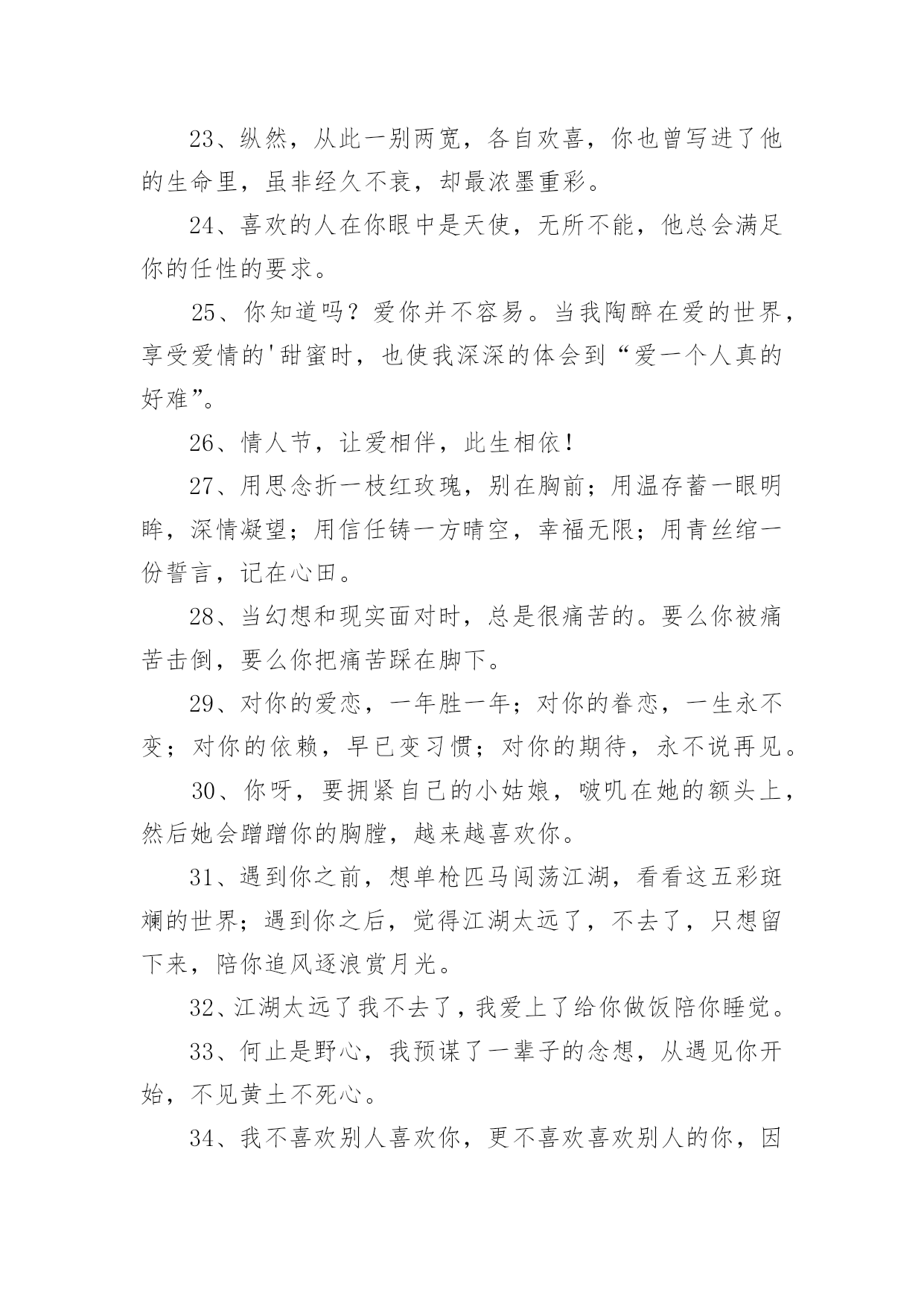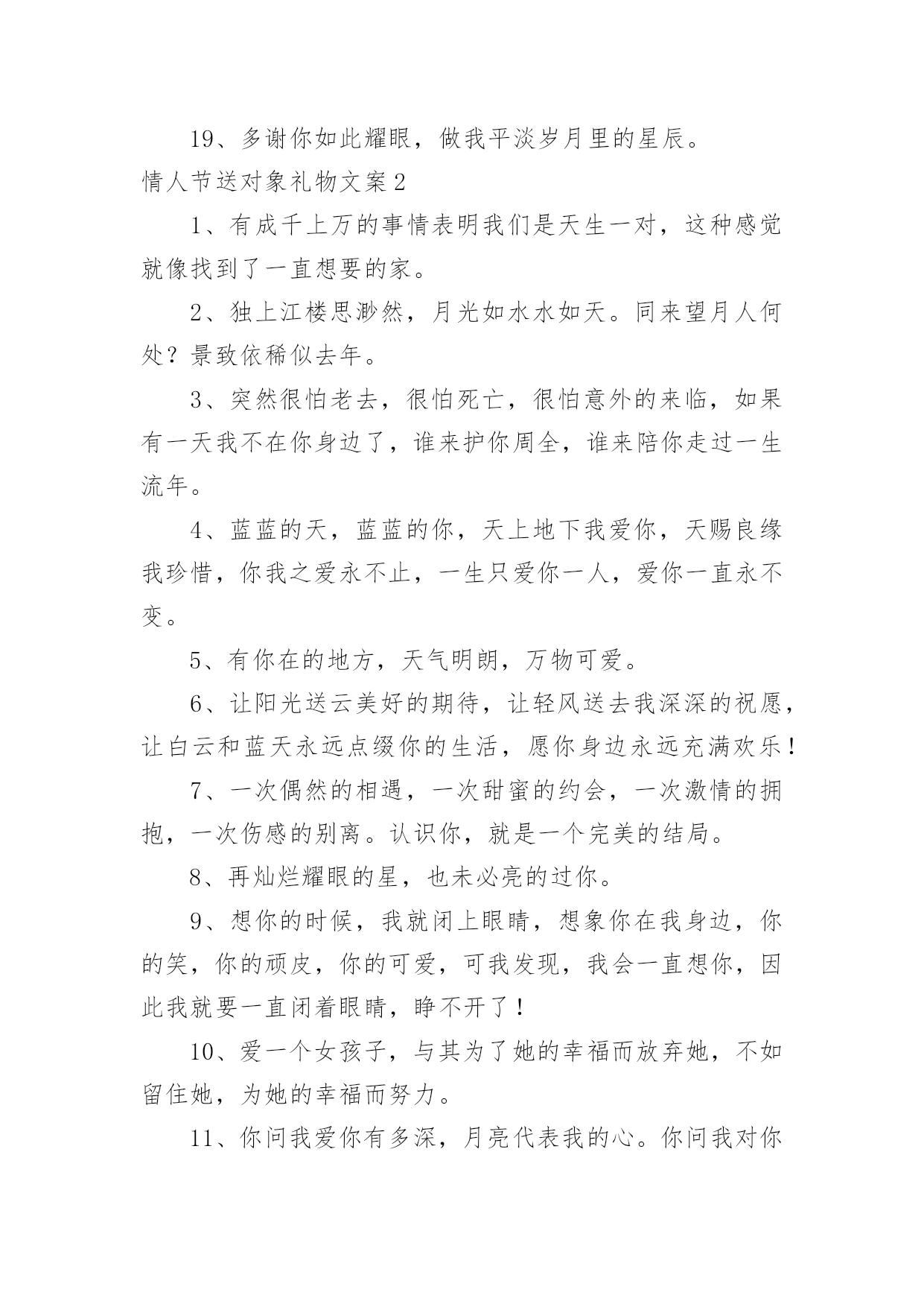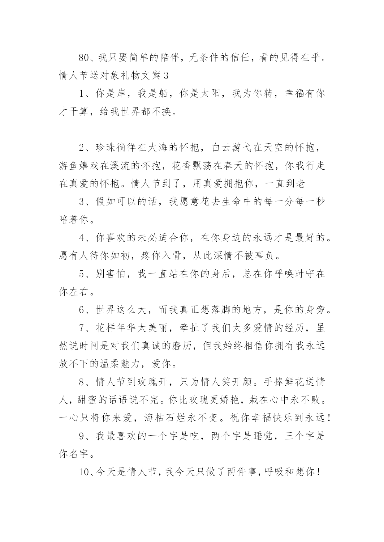 情人节送对象礼物文案情人节送对象礼物文案无论在学习、工作或是生活中,越来越多人习惯于在线上发布文案,文案具有文字简练、意义鲜明的特点。究竟什么样的文案才是特别的呢?以下是小编为大家整理的情人节送对象礼物文案,欢迎大家分享。情人节送对象礼物文案11、一个人就算再好,但不愿陪你走下去,那他就是过客。一个人就算有再多缺点,可能处处忍让你,陪你到最后,那就是终点。因为陪伴与懂得,比爱情更加重要。2、有一些东西错过了,就一辈子错过了。人是会变的,守住一个不变的,却守不住一颗善变的心。3、人生遇到的每个人,出场顺序真的很重要,很多人如果换一个时间认识,就会有不同的结局。有些爱,只能止于唇齿,掩于岁月4、怎么会迷上你我在问自己,我什么都能放弃你居然今天难离去,也许你不曾想到我的'心会疼,如果这是梦,我愿长醉不愿醒。5、爱,从来就是一件千回百转的事。不曾被离弃,不曾受伤害,怎懂得爱人?爱,原来是一种经历,但愿人长久。6、虽然不能满足你的物质生活但我可以把我的心来满足你。7、一片云与一片云之间,是蓝蓝的友情。一簇花蕊与一瓣花朵之间,是粉红的爱情。可我与你的世界,愿你离我最近。8、如果做不了你的,我连最爱也不要做。如果你给我的,也同样给了别人,那我宁愿不要。得不到不可怕,守不住才是个笑话。9、你安静的呆在我身旁,恰就是爱情的模样。10、为什么我脸皮这么厚,还是包不住对你的喜欢呢。11、我遇见你,恰若春风!你遇见我,风平浪静!我心有海啸!你波澜不惊!12、没有完全合适的两个人,只有互相迁就的两颗心。你改一点,我改一点,虽然大家都会失去点自我,却可以成为默契的一对。相爱,从来都不是一个人的事,迟早会有人举着戒指对着你笑,说着余生请多指教。13、爱是一种需要不断被人证明的虚妄,就像烟花需要被点燃才能看到辉煌一样。14、虽然终于遇到了对的人,但是却偏偏在错误的时间里,那只能徒留遗憾,不如没有遇见。15、习惯难受,习惯思念,习惯等你,可是却一直没有习惯看不到你。16、爱一个人,不是一时的牵手,而是一世的牵心。17、你脸上有东西,我的目光。18、你最近是不是又胖了?那为什么在我心里的分量越来越重了。19、多谢你如此耀眼,做我平淡岁月里的星辰。情人节送对象礼物文案21、有成千上万的事情表明我们是天生一对,这种感觉就像找到了一直想要的家。2、独上江楼思渺然,月光如水水如天。同来望月人何处?景致依稀似去年。3、突然很怕老去,很怕死亡,很怕意外的来临,如果有一天我不在你身边了,谁来护你周全,谁来陪你走过一生流年。4、蓝蓝的天,蓝蓝的你,天上地下我爱你,天赐良缘我珍惜,你我之爱永不止,一生只爱你一人,爱你一直永不变。5、有你在的地方,天气明朗,万物可爱。6、让阳光送云美好的期待,让轻风送去我深深的祝愿,让白云和蓝天永远点缀你的生活,愿你身边永远充满欢乐!7、一次偶然的相遇,一次甜蜜的约会,一次激情的拥抱,一次伤感的别离。认识你,就是一个完美的结局。8、再灿烂耀眼的星,也未必亮的过你。9、想你的时候,我就闭上眼睛,想象你在我身边,你的笑,你的顽皮,你的可爱,可我发现,我会一直想你,因此我就要一直闭着眼睛,睁不开了!10、爱一个女孩子,与其为了她的幸福而放弃她,不如留住她,为她的幸福而努力。11、你问我爱你有多深,月亮代表我的心。你问我对你有多真,没有你我就昏。12、我终于发现,这世界上有丰厚的爱,我不能辜负。于是我想对你说,我爱你,请你倾听。13、不想太成熟,也不想过于懂事,就想在你身边做个幼稚鬼,能陪你走过困难,也能被你护在身后。14、白云陪着蓝天,晴雨同伴。星星陪着月亮,同耀灿烂。绿叶陪着红花,从春到秋。用爱呵护妻子,共度年华。情人节了,陪着妻子,一起度过快乐的一天!15、光阴荏苒,激情归于平淡,就让我陪你度过平凡。请你相信,只要我的心还在跳,它便是因你而跳。16、一种缘,让你我相逢;一种情,让你我相恋;一种相思,让你我爱意缠绵;一种眷恋,让我爱你此生不变。情人节,愿你快乐,幸福满满!17、我打算爱你很久很久,没有想要放弃的念头。18、愿我的悄悄话是一把钥匙,打开你心灵的乐园。19、你是我独家的记忆,你是我诗篇的绝句,你是我想要的甜蜜,你是我享受的性格,你是我情人节唯一想要的奇观,你是我生命终点的可贵回想。20、春风十里,不及相遇有你;晴空万里,不及心中有你。21、我拒绝那么多的暧昧,只为了你一个不确定的未来。22、我希望有人疼,有人爱,有人包容,有人抱着我睡,有人让我撒娇,有人可以吃我做的饭,有人可以夸我乖,有人能陪在我身边,有人能过马路的时候拉着我的手。23、纵然,从此一别两宽,各自欢喜,你也曾写进了他的生命里,虽非经久不衰,却最浓墨重彩。24、喜欢的人在你眼中是天使,无所不能,他总会满足你的任性的要求。25、你知道吗?爱你并不容易。当我陶醉在爱的世界,享受