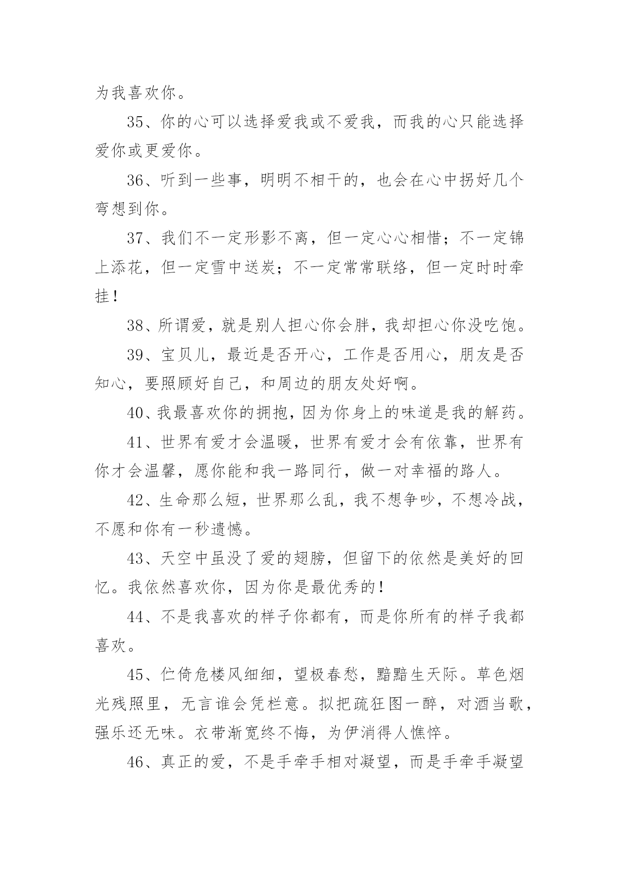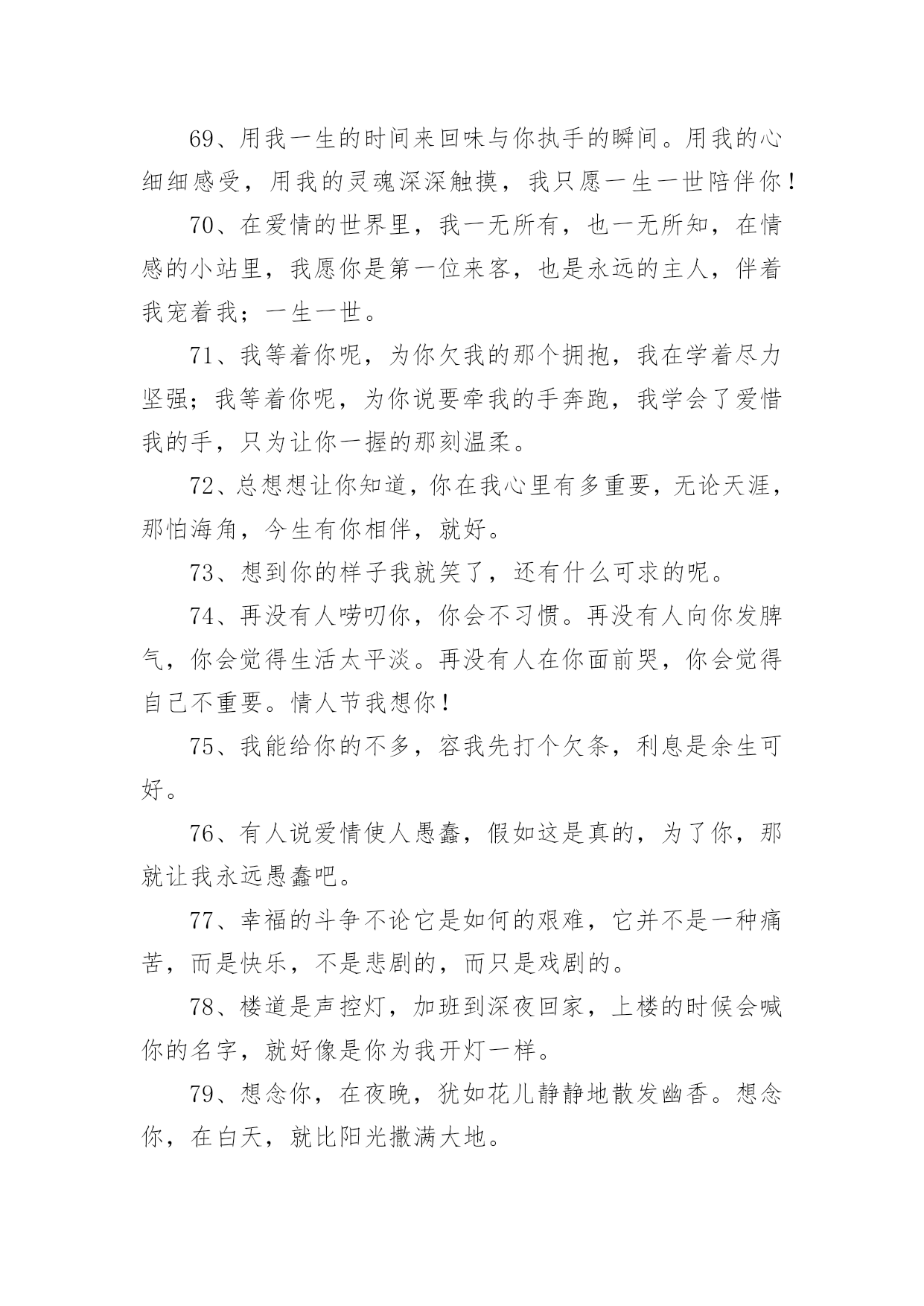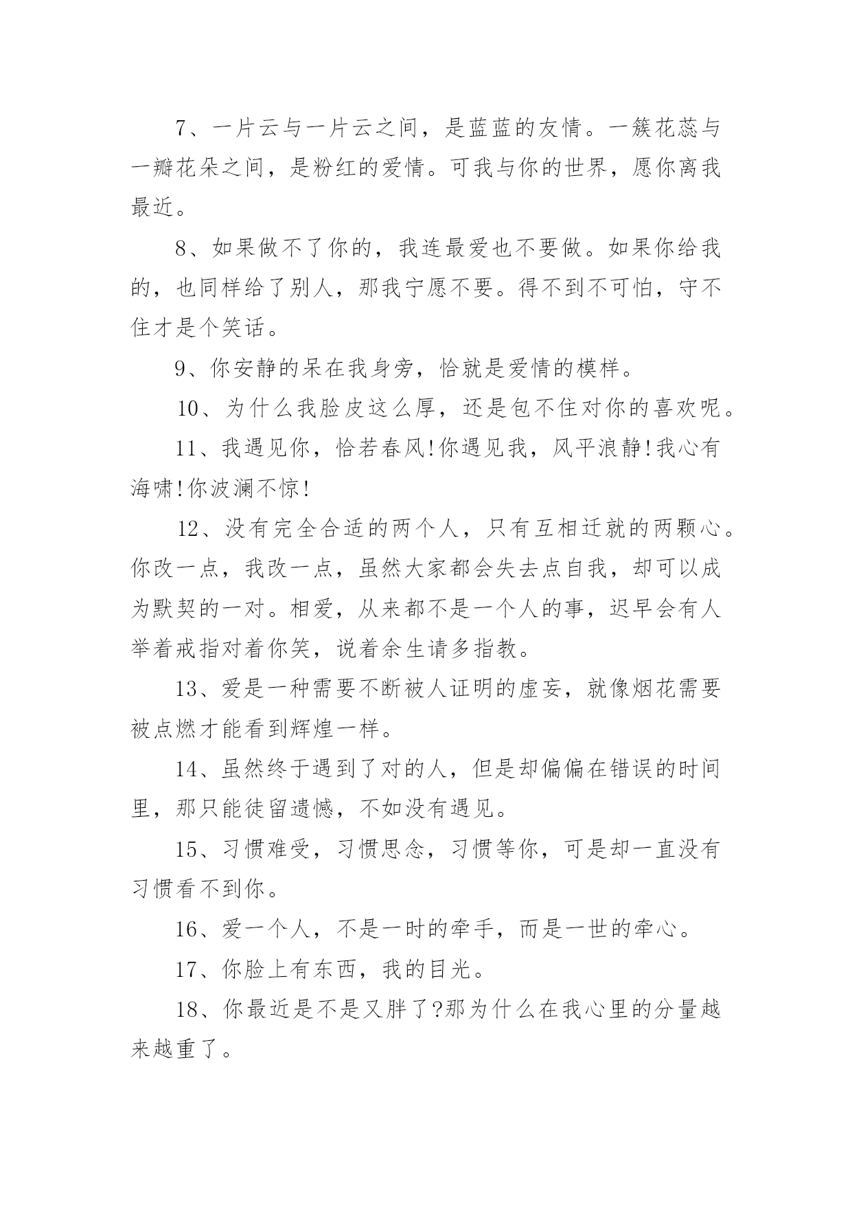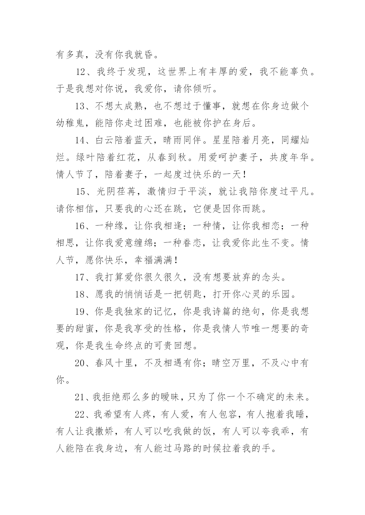 情人节送对象礼物文案情人节送对象礼物文案无论在学习、工作或是生活中,越来越多人习惯于在线上发布文案,文案具有文字简练、意义鲜明的特点。究竟什么样的文案才是特别的呢?以下是小编为大家整理的情人节送对象礼物文案,欢迎大家分享。情人节送对象礼物文案11、一个人就算再好,但不愿陪你走下去,那他就是过客。一个人就算有再多缺点,可能处处忍让你,陪你到最后,那就是终点。因为陪伴与懂得,比爱情更加重要。2、有一些东西错过了,就一辈子错过了。人是会变的,守住一个不变的,却守不住一颗善变的心。3、人生遇到的每个人,出场顺序真的很重要,很多人如果换一个时间认识,就会有不同的结局。有些爱,只能止于唇齿,掩于岁月4、怎么会迷上你我在问自己,我什么都能放弃你居然今天难离去,也许你不曾想到我的'心会疼,如果这是梦,我愿长醉不愿醒。5、爱,从来就是一件千回百转的事。不曾被离弃,不曾受伤害,怎懂得爱人?爱,原来是一种经历,但愿人长久。6、虽然不能满足你的物质生活但我可以把我的心来满足你。7、一片云与一片云之间,是蓝蓝的友情。一簇花蕊与一瓣花朵之间,是粉红的爱情。可我与你的世界,愿你离我最近。8、如果做不了你的,我连最爱也不要做。如果你给我的,也同样给了别人,那我宁愿不要。得不到不可怕,守不住才是个笑话。9、你安静的呆在我身旁,恰就是爱情的模样。10、为什么我脸皮这么厚,还是包不住对你的喜欢呢。11、我遇见你,恰若春风!你遇见我,风平浪静!我心有海啸!你波澜不惊!12、没有完全合适的两个人,只有互相迁就的两颗心。你改一点,我改一点,虽然大家都会失去点自我,却可以成为默契的一对。相爱,从来都不是一个人的事,迟早会有人举着戒指对着你笑,说着余生请多指教。13、爱是一种需要不断被人证明的虚妄,就像烟花需要被点燃才能看到辉煌一样。14、虽然终于遇到了对的人,但是却偏偏在错误的时间里,那只能徒留遗憾,不如没有遇见。15、习惯难受,习惯思念,习惯等你,可是却一直没有习惯看不到你。16、爱一个人,不是一时的牵手,而是一世的牵心。17、你脸上有东西,我的目光。18、你最近是不是又胖了?那为什么在我心里的分量越来越重了。19、多谢你如此耀眼,做我平淡岁月里的星辰。情人节送对象礼物文案21、有成千上万的事情表明我们是天生一对,这种感觉就像找到了一直想要的家。2、独上江楼思渺然,月光如水水如天。同来望月人何处?景致依稀似去年。3、突然很怕老去,很怕死亡,很怕意外的来临,如果有一天我不在你身边了,谁来护你周全,谁来陪你走过一生流年。4、蓝蓝的天,蓝蓝的你,天上地下我爱你,天赐良缘我珍惜,你我之爱永不止,一生只爱你一人,爱你一直永不变。5、有你在的地方,天气明朗,万物可爱。6、让阳光送云美好的期待,让轻风送去我深深的祝愿,让白云和蓝天永远点缀你的生活,愿你身边永远充满欢乐!7、一次偶然的相遇,一次甜蜜的约会,一次激情的拥抱,一次伤感的别离。认识你,就是一个完美的结局。8、再灿烂耀眼的星,也未必亮的过你。9、想你的时候,我就闭上眼睛,想象你在我身边,你的笑,你的顽皮,你的可爱,可我发现,我会一直想你,因此我就要一直闭着眼睛,睁不开了!10、爱一个女孩子,与其为了她的幸福而放弃她,不如留住她,为她的幸福而努力。11、你问我爱你有多深,月亮代表我的心。你问我对你有多真,没有你我就昏。12、我终于发现,这世界上有丰厚的爱,我不能辜负。于是我想对你说,我爱你,请你倾听。13、不想太成熟,也不想过于懂事,就想在你身边做个幼稚鬼,能陪你走过困难,也能被你护在身后。14、白云陪着蓝天,晴雨同伴。星星陪着月亮,同耀灿烂。绿叶陪着红花,从春到秋。用爱呵护妻子,共度年华。情人节了,陪着妻子,一起度过快乐的一天!15、光阴荏苒,激情归于平淡,就让我陪你度过平凡。请你相信,只要我的心还在跳,它便是因你而跳。16、一种缘,让你我相逢;一种情,让你我相恋;一种相思,让你我爱意缠绵;一种眷恋,让我爱你此生不变。情人节,愿你快乐,幸福满满!17、我打算爱你很久很久,没有想要放弃的念头。18、愿我的悄悄话是一把钥匙,打开你心灵的乐园。19、你是我独家的记忆,你是我诗篇的绝句,你是我想要的甜蜜,你是我享受的性格,你是我情人节唯一想要的奇观,你是我生命终点的可贵回想。20、春风十里,不及相遇有你;晴空万里,不及心中有你。21、我拒绝那么多的暧昧,只为了你一个不确定的未来。22、我希望有人疼,有人爱,有人包容,有人抱着我睡,有人让我撒娇,有人可以吃我做的饭,有人可以夸我乖,有人能陪在我身边,有人能过马路的时候拉着我的手。23、纵然,从此一别两宽,各自欢喜,你也曾写进了他的生命里,虽非经久不衰,却最浓墨重彩。24、喜欢的人在你眼中是天使,无所不能,他总会满足你的任性的要求。25、你知道吗?爱你并不容易。当我陶醉在爱的世界,享受