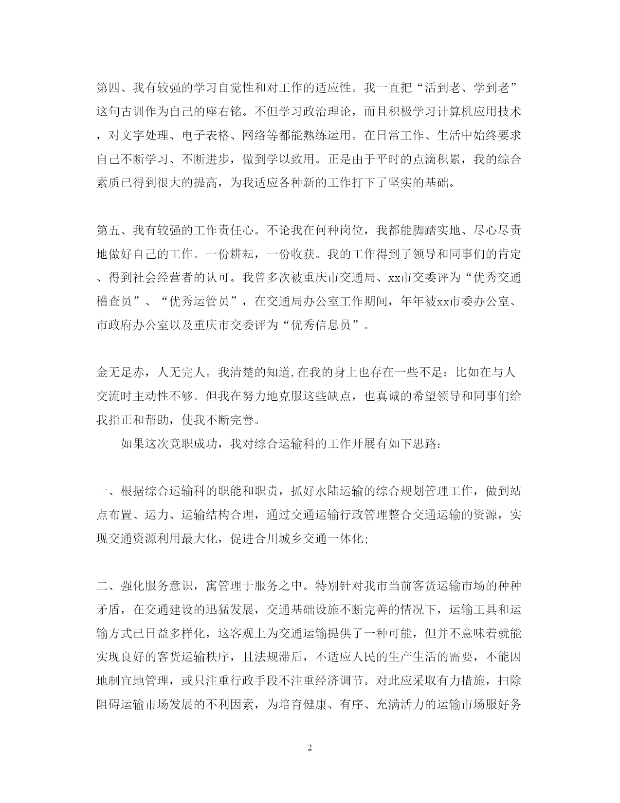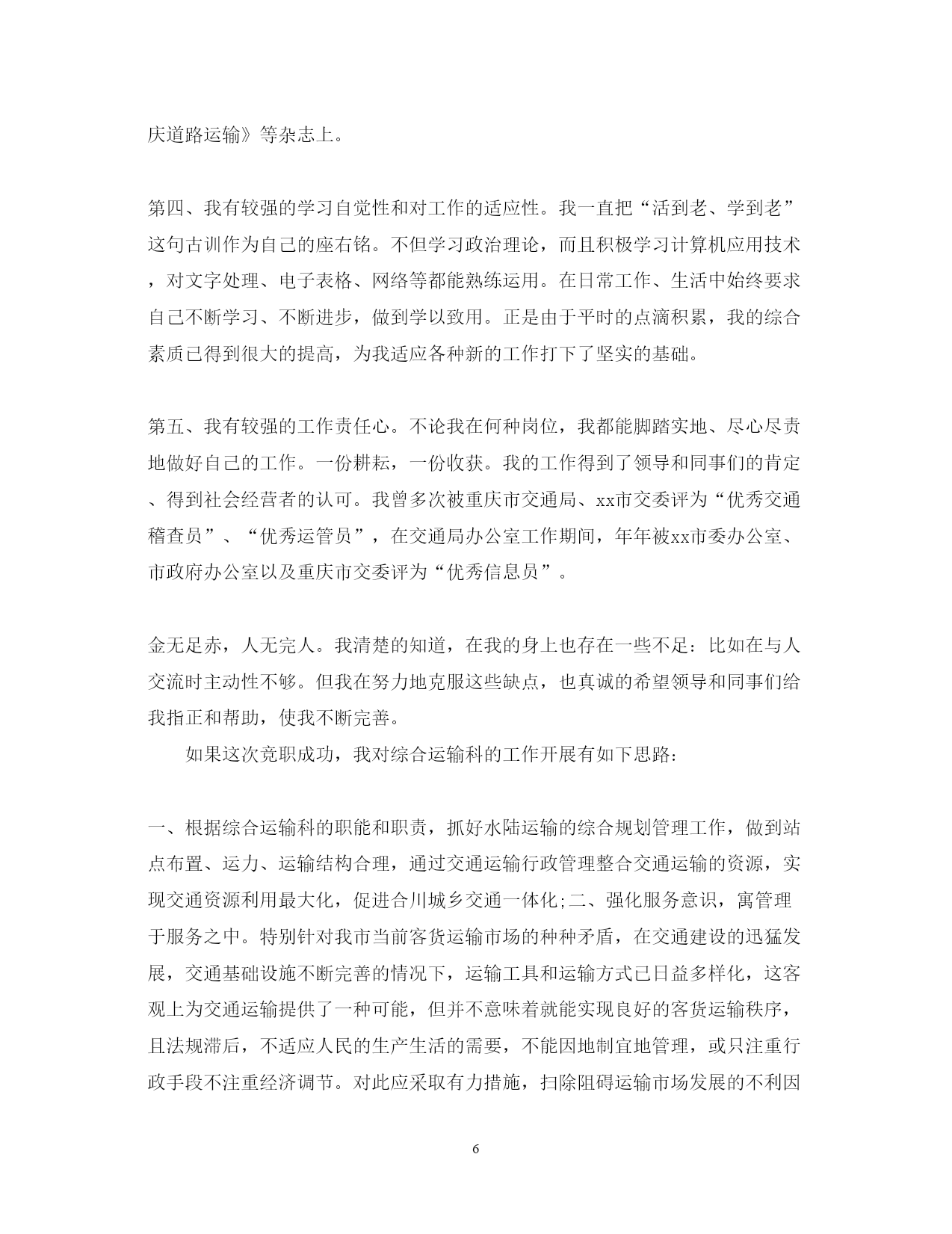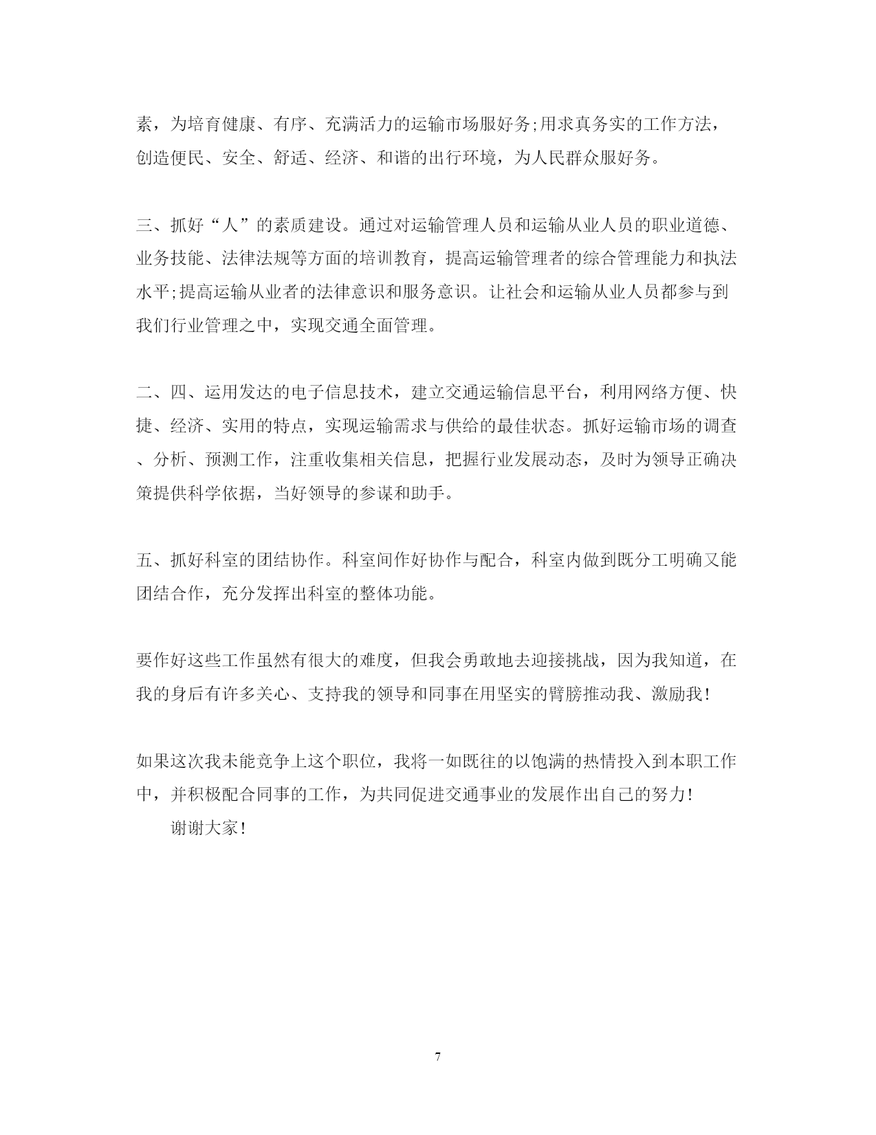 此资料由网络收集而来,如有侵权请告知上传者立即删除。资料共分享,我们负责传递知识。PAGEPAGE7交通局领导竞聘演讲稿演讲稿也叫演说辞,它是在较为隆重的仪式上和某些公众场所发表的讲话文稿。下面是范文网小编给大家整理的交通局领导竞聘演讲稿,仅供参考。交通局领导竞聘演讲稿篇1尊敬的各位领导、各位评委、各位同事:大家好!我叫xx,于年12月参加工作,年至年在交通运输管理所从事运政管理工作,年至年在交通局办公室工作,年至今在交通局财务稽征科工作。今天我所要竞争的职位是综合运输科科长职位。我之所以选择这一职位,是因为我在以下几方面有扎实的基础和条件:第一、我对交通运输管理有深刻的认识和理解。我曾在交管所从事运政管理工作近年,对交通运输管理有比较全面的感性和理性认识,深刻理解行政管理工作对运输的重大影响。通过这段经历,树立了我为人民服务的思想,丰富了我运输管理的经验,提高了我综合运输管理的能力。第二、熟悉行政管理的的各项法规、,亲身实践过行政执法,熟悉各个环节和程序,特别对运输管理的有关法规、规定、条例等尤为熟悉。再加上近年在局机关从事办公室工作、财务稽征科从事稽查、征费工作,这些都为交通运输管理提供了十分有利的条件。第三、我善于总结,勤于思考。在工作中,我善于及时总结经验教训,并能对工作进行一些探索性的思考。在交管所工作期间,我曾就客运市场管理、运政执法等问题进行过有益的探索性思考,并形成文字,刊载在《中国道路运输》、《重庆道路运输》等杂志上。第四、我有较强的学习自觉性和对工作的适应性。我一直把“活到老、学到老”这句古训作为自己的座右铭。不但学习政治理论,而且积极学习计算机应用技术,对文字处理、电子表格、网络等都能熟练运用。在日常工作、生活中始终要求自己不断学习、不断进步,做到学以致用。正是由于平时的点滴积累,我的综合素质已得到很大的提高,为我适应各种新的工作打下了坚实的基础。第五、我有较强的工作责任心。不论我在何种岗位,我都能脚踏实地、尽心尽责地做好自己的工作。一份耕耘,一份收获。我的工作得到了领导和同事们的肯定、得到社会经营者的认可。我曾多次被重庆市交通局、xx市交委评为“优秀交通稽查员”、“优秀运管员”,在交通局办公室工作期间,年年被xx市委办公室、市政府办公室以及重庆市交委评为“优秀信息员”。金无足赤,人无完人。我清楚的知道,在我的身上也存在一些不足:比如在与人交流时主动性不够。但我在努力地克服这些缺点,也真诚的希望领导和同事们给我指正和帮助,使我不断完善。如果这次竞职成功,我对综合运输科的工作开展有如下思路:一、根据综合运输科的职能和职责,抓好水陆运输的综合规划管理工作,做到站点布置、运力、运输结构合理,通过交通运输行政管理整合交通运输的资源,实现交通资源利用最大化,促进合川城乡交通一体化;二、强化服务意识,寓管理于服务之中。特别针对我市当前客货运输市场的种种矛盾,在交通建设的迅猛发展,交通基础设施不断完善的情况下,运输工具和运输方式已日益多样化,这客观上为交通运输提供了一种可能,但并不意味着就能实现良好的客货运输秩序,且法规滞后,不适应人民的生产生活的需要,不能因地制宜地管理,或只注重行政手段不注重经济调节。对此应采取有力措施,扫除阻碍运输市场发展的不利因素,为培育健康、有序、充满活力的运输市场服好务;用求真务实的工作方法,创造便民、安全、舒适、经济、和谐的出行环境,为人民群众服好务。三、抓好“人”的素质建设。通过对运输管理人员和运输从业人员的职业道德、业务技能、法律法规等方面的培训教育,提高运输管理者的综合管理能力和执法水平;提高运输从业者的法律意识和服务意识。让社会和运输从业人员都参与到我们行业管理之中,实现交通全面管理。交通局领导竞聘演讲稿篇2尊敬的各位领导、同仁:大家好!首先,感谢局领导给我这次参加竞聘的机会,我今天竞聘的岗位是养计科科长一职。首先,我进行自我介绍,我叫,现年岁,大专文化,同年分配至市公路管理局工作至今。工作期间,任过局工程技术员、养计科统计员、政工科劳资员,对于工作不敢妄言成绩,但在自己认真工作下,所任本职工作,都能圆满完成。其次,我就本次竞聘的工作岗位谈一下我自己的几点看法,养计工作在我局所处位置较重,就目前来看,由于年公路体制下放,各种衔接工作的暂没到位,我局各养护线路路况有明显下降趋势,作为养计科科长这个岗位:1、要充分掌握我局各养护线路的路况,编制养护计划,协助局领导与各部门衔接好养护经费,争取各级领导对养护工作的重视,保证养护工作的顺利开展,使我局路况稳中上升。2、抓好养护职工的管理工作,制定好各项管理措施和制度,在抓好养护职工的劳动纪律和劳动工效的同时,在下放之初的今年,做好我局养护职工的思想工作,在保证搞好养护工作的同时,最