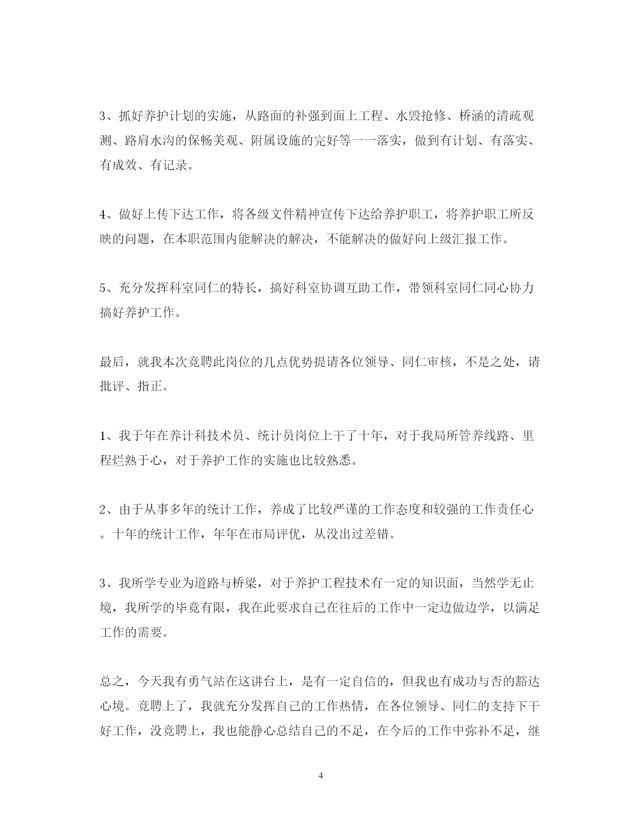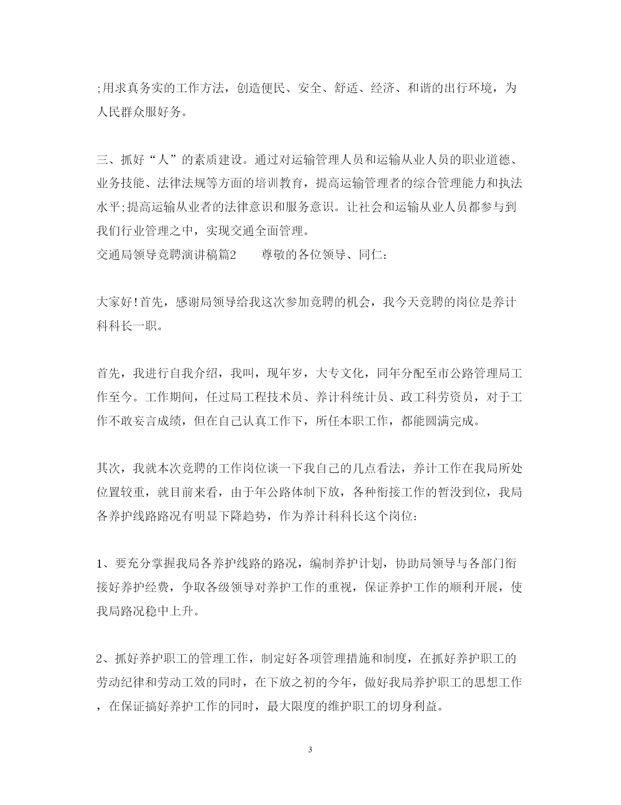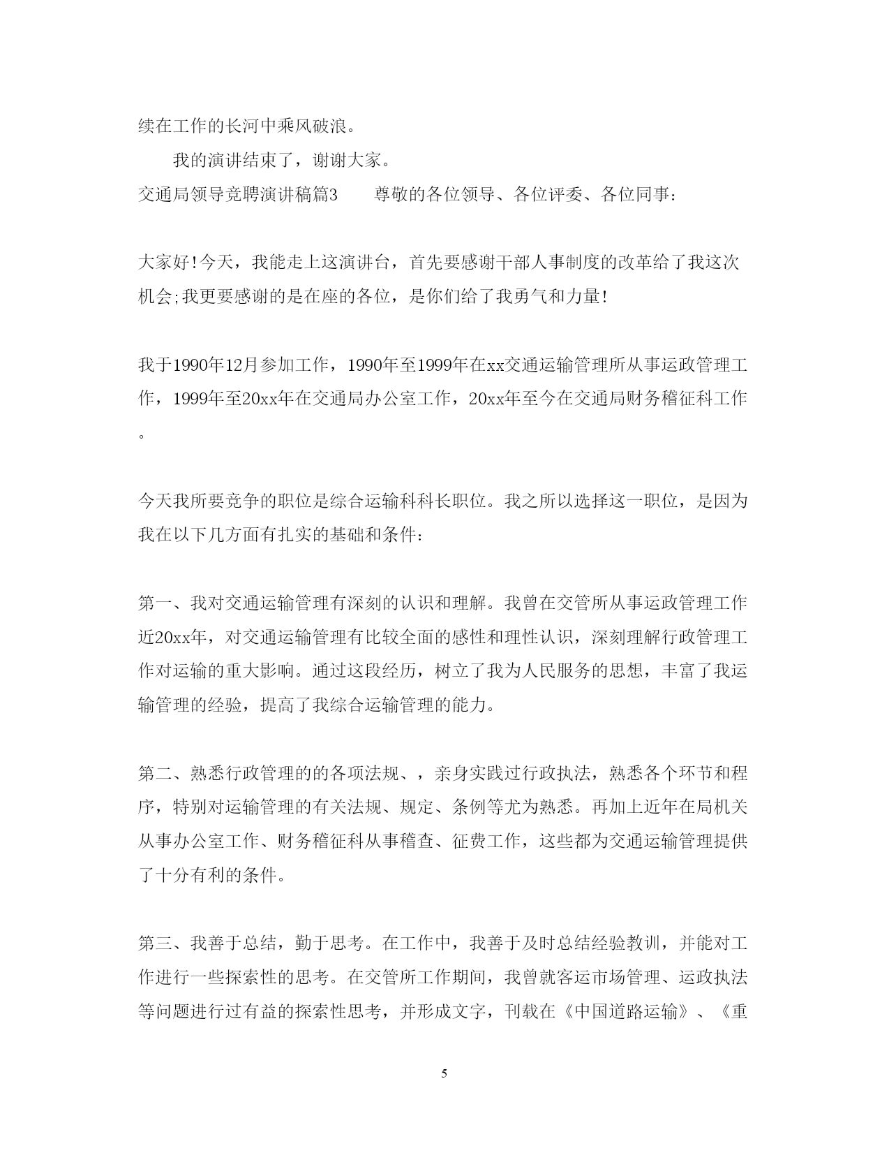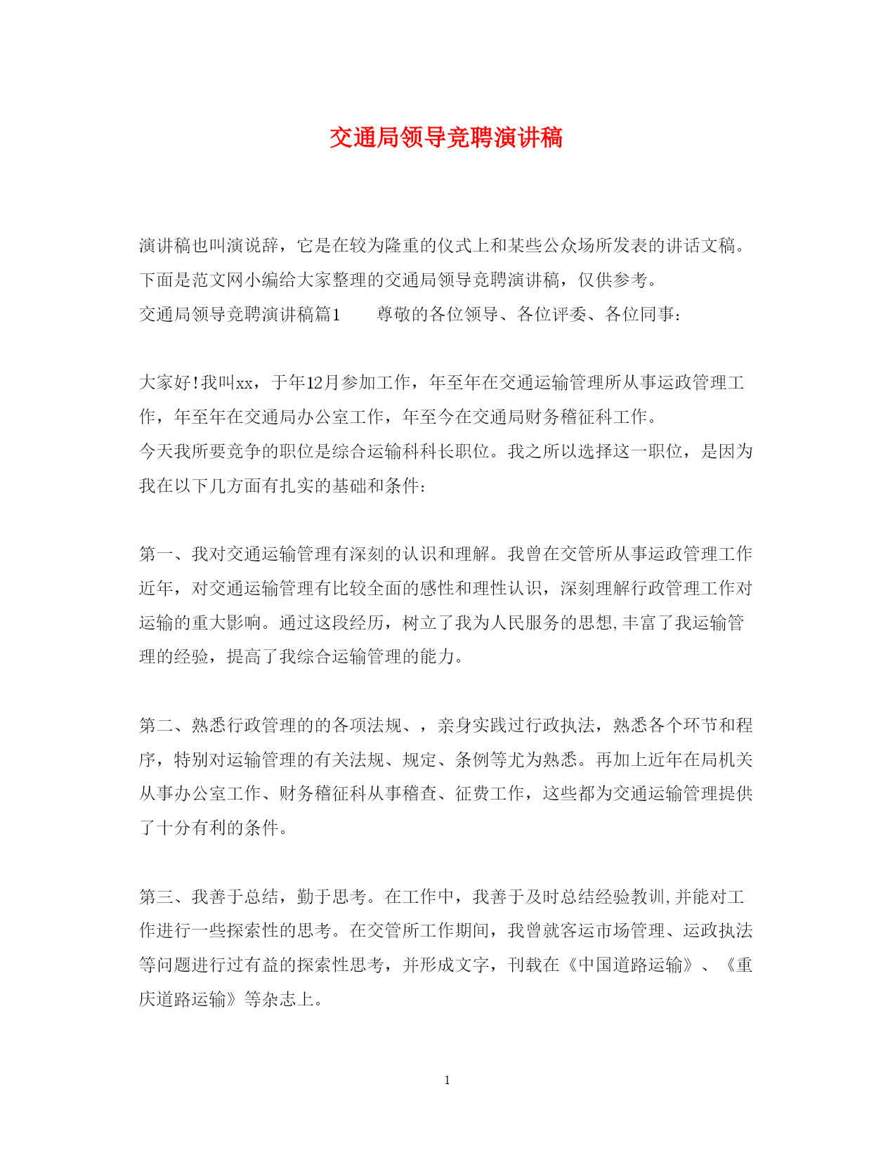 此资料由网络收集而来,如有侵权请告知上传者立即删除。资料共分享,我们负责传递知识。PAGEPAGE7交通局领导竞聘演讲稿演讲稿也叫演说辞,它是在较为隆重的仪式上和某些公众场所发表的讲话文稿。下面是范文网小编给大家整理的交通局领导竞聘演讲稿,仅供参考。交通局领导竞聘演讲稿篇1尊敬的各位领导、各位评委、各位同事:大家好!我叫xx,于年12月参加工作,年至年在交通运输管理所从事运政管理工作,年至年在交通局办公室工作,年至今在交通局财务稽征科工作。今天我所要竞争的职位是综合运输科科长职位。我之所以选择这一职位,是因为我在以下几方面有扎实的基础和条件:第一、我对交通运输管理有深刻的认识和理解。我曾在交管所从事运政管理工作近年,对交通运输管理有比较全面的感性和理性认识,深刻理解行政管理工作对运输的重大影响。通过这段经历,树立了我为人民服务的思想,丰富了我运输管理的经验,提高了我综合运输管理的能力。第二、熟悉行政管理的的各项法规、,亲身实践过行政执法,熟悉各个环节和程序,特别对运输管理的有关法规、规定、条例等尤为熟悉。再加上近年在局机关从事办公室工作、财务稽征科从事稽查、征费工作,这些都为交通运输管理提供了十分有利的条件。第三、我善于总结,勤于思考。在工作中,我善于及时总结经验教训,并能对工作进行一些探索性的思考。在交管所工作期间,我曾就客运市场管理、运政执法等问题进行过有益的探索性思考,并形成文字,刊载在《中国道路运输》、《重庆道路运输》等杂志上。第四、我有较强的学习自觉性和对工作的适应性。我一直把“活到老、学到老”这句古训作为自己的座右铭。不但学习政治理论,而且积极学习计算机应用技术,对文字处理、电子表格、网络等都能熟练运用。在日常工作、生活中始终要求自己不断学习、不断进步,做到学以致用。正是由于平时的点滴积累,我的综合素质已得到很大的提高,为我适应各种新的工作打下了坚实的基础。第五、我有较强的工作责任心。不论我在何种岗位,我都能脚踏实地、尽心尽责地做好自己的工作。一份耕耘,一份收获。我的工作得到了领导和同事们的肯定、得到社会经营者的认可。我曾多次被重庆市交通局、xx市交委评为“优秀交通稽查员”、“优秀运管员”,在交通局办公室工作期间,年年被xx市委办公室、市政府办公室以及重庆市交委评为“优秀信息员”。金无足赤,人无完人。我清楚的知道,在我的身上也存在一些不足:比如在与人交流时主动性不够。但我在努力地克服这些缺点,也真诚的希望领导和同事们给我指正和帮助,使我不断完善。如果这次竞职成功,我对综合运输科的工作开展有如下思路:一、根据综合运输科的职能和职责,抓好水陆运输的综合规划管理工作,做到站点布置、运力、运输结构合理,通过交通运输行政管理整合交通运输的资源,实现交通资源利用最大化,促进合川城乡交通一体化;二、强化服务意识,寓管理于服务之中。特别针对我市当前客货运输市场的种种矛盾,在交通建设的迅猛发展,交通基础设施不断完善的情况下,运输工具和运输方式已日益多样化,这客观上为交通运输提供了一种可能,但并不意味着就能实现良好的客货运输秩序,且法规滞后,不适应人民的生产生活的需要,不能因地制宜地管理,或只注重行政手段不注重经济调节。对此应采取有力措施,扫除阻碍运输市场发展的不利因素,为培育健康、有序、充满活力的运输市场服好务;用求真务实的工作方法,创造便民、安全、舒适、经济、和谐的出行环境,为人民群众服好务。三、抓好“人”的素质建设。通过对运输管理人员和运输从业人员的职业道德、业务技能、法律法规等方面的培训教育,提高运输管理者的综合管理能力和执法水平;提高运输从业者的法律意识和服务意识。让社会和运输从业人员都参与到我们行业管理之中,实现交通全面管理。交通局领导竞聘演讲稿篇2尊敬的各位领导、同仁:大家好!首先,感谢局领导给我这次参加竞聘的机会,我今天竞聘的岗位是养计科科长一职。首先,我进行自我介绍,我叫,现年岁,大专文化,同年分配至市公路管理局工作至今。工作期间,任过局工程技术员、养计科统计员、政工科劳资员,对于工作不敢妄言成绩,但在自己认真工作下,所任本职工作,都能圆满完成。其次,我就本次竞聘的工作岗位谈一下我自己的几点看法,养计工作在我局所处位置较重,就目前来看,由于年公路体制下放,各种衔接工作的暂没到位,我局各养护线路路况有明显下降趋势,作为养计科科长这个岗位:1、要充分掌握我局各养护线路的路况,编制养护计划,协助局领导与各部门衔接好养护经费,争取各级领导对养护工作的重视,保证养护工作的顺利开展,使我局路况稳中上升。2、抓好养护职工的管理工作,制定好各项管理措施和制度,在抓好养护职工的劳动纪律和劳动工效的同时,在下放之初的今年,做好我局养护职工的思想工作,在保证搞好养护工作的同时,最
