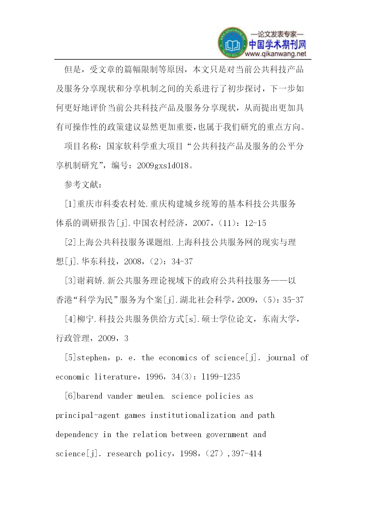 公共科技产品及服务分享机制研究摘要:本文针对当前公共科技产品及服务分享现状进行了深入分析,一方面对现有公共产品及服务的内涵进行了重新界定,另一方面提出了公共科技产品及服务分享机制的构成,即为了实现公共科技产品及服务的公平分享,可以从决策供给、管理运行和考核激励等方面入手,推动并实现公共科技产品及服务的公平分享。关键词:公共科技产品及服务公平分享机制1.公共科技产品及服务1.1公共科技产品及服务的内涵“公共科技产品及服务”一词最早见于2006年10月中共十六届六中全会通过的《中共中央关于构建社会主义和谐社会若干重大问题的决定》中。但该文件并没有对科技公共服务作出明确的界定,到目前为止,学术界对于公共科技产品及服务的界定也没有形成一个完整的共识[1][2][3][4]。实质上,公共科技产品及服务就是指在一定的时期内,在技术条件既定的情况下,政府或非政府公共组织依照法律规定,综合运用科技政策、财政供给等手段以直接或间接方式提供给社会共同需要的科技类物质形态产品和非物质形态的服务。1.2公共科技产品及服务的构成本文根据政府在公共产品及服务生产过程中角色的不同,将公共科技产品及服务分为两大类。一类是公共科技成果,对应于传统的公共科技技术,政府仅为公共科技产品及服务的管理者,具体生产则是委托给相关机构和组织,然后,整个公共科技产品及服务的成果为特定的区域、行业所共享,其本身具有较强的市场化行为,也就是企业行为,讲究效率原则,表现在政府资助方式方面,主要依赖于竞争性项目。其包括了绝大部分带有典型公益性质的科技成果及其推广服务。另一类是公共科技平台,也就是一般意义上的公共科技服务,包括科技普及、科技基础设施、科技基础条件平台、科技发展重点实验室等。其中,政府不仅是简单的公共科技产品及服务的生产者或管理者,也是公共科技产品及服务的消费者,而机构基本上可以根据其按照自己认为合适的任何方式、不附带任何条件地自由支配政府相关经费。这也是当前基础研究领域普遍存在的现象。同时,不可否认,这两种公共科技产品及服务在现实中往往难以独存,更多的是相互依存、相互发展的。2.公共科技产品及服务分享现状及所存在的问题2.1公共科技产品及服务分享现状经过多年发展,我国公共科技产品及服务分享范围更是扩大,越来越多的公共科技产品及服务为社会大众所共享,如:继气象科学数据共享工程之后,科技部又启动了五个科学数据中心和三个共享服务网。由此,包括气象科学数据共享在内九大行业的科学数据共享工程开始有条不紊地推进。到目前为止,全国已经建成了几千个科学数据库。2004年8月,气象科学数据共享服务的基础平台“中国气象科学数据共享服务网”开通;2004年8月“国家对地观测系统modis共享平台网站”开通,打破了区域科技发展的界限,扩大了现有公共科技产品及服务分享的范围。此外,公共科技产品及服务的分享程度也不断提高。一是依托特定公共科技服务平台的对外合作项目,尤其是企业合作项目越来越多。二是人才培养交流程度逐步加大,越来越多的人开始走出国门,积极参加和举办国际国内学术会议次数;三是服务水平显著提升,如京津地区协议相互开放国家级和市级重点实验室、工程技术研究中心、以及软件评测等大型公共仪器设备等科技基础设施,面向广大社会大众提供相应的服务、保证了公共科技产品及服务的成果能够真正惠及广大民众、惠及民生。2.2公共科技产品及服务分享的主要问题*经费供给相对不足很多时候,政府财政供给相对不足的情况严重制约了其公平分享目标的实现。这是因为,任何公共科技产品及服务的开放共享都产生相应的成本费用,而这方面还是主要依赖于政府财政和单位自筹,几乎没有社会资金、金融资金、风险资金、个人资金等的参与。*仪器设备重复购置现象严重,实际利用率低一些单位开放共享意识不强,追求自有设备的购置,导致单位间同类设备的重复购置现象严重,设备实际使用率低,发挥不出设备应有的功能。相关研究表明,我国大型科学仪器设备的平均利用率不足50%,而国外发达国家尤其是欧美国家的大型科学仪器设备的利用率高达170%-200%完全的超负荷运行。*实际供给和需求脱节,区域发展水平差异明显当前,由于缺乏统一合理的规划和安排,导致公共科技产品及服务的实际供给和需求严重脱节,某些领域或者区域的公共科技产品及服务发展水平可能相对较好,反之,某些领域或者区域的公共科技产品及服务发展水平可能相对较差,造成区域发展水平差异明显。*缺乏高素质的人才队伍公共科技产品及服务相对其他产品及服务来说其科技含量较高、专业性较强,尤其是重点实验室、工程技术研究中心、大型科学仪器设备等,其科技含量要高、专业性要强。我国虽是世界上第一人口大国,但是科技人才尤其是高层次创新型科技人才缺乏