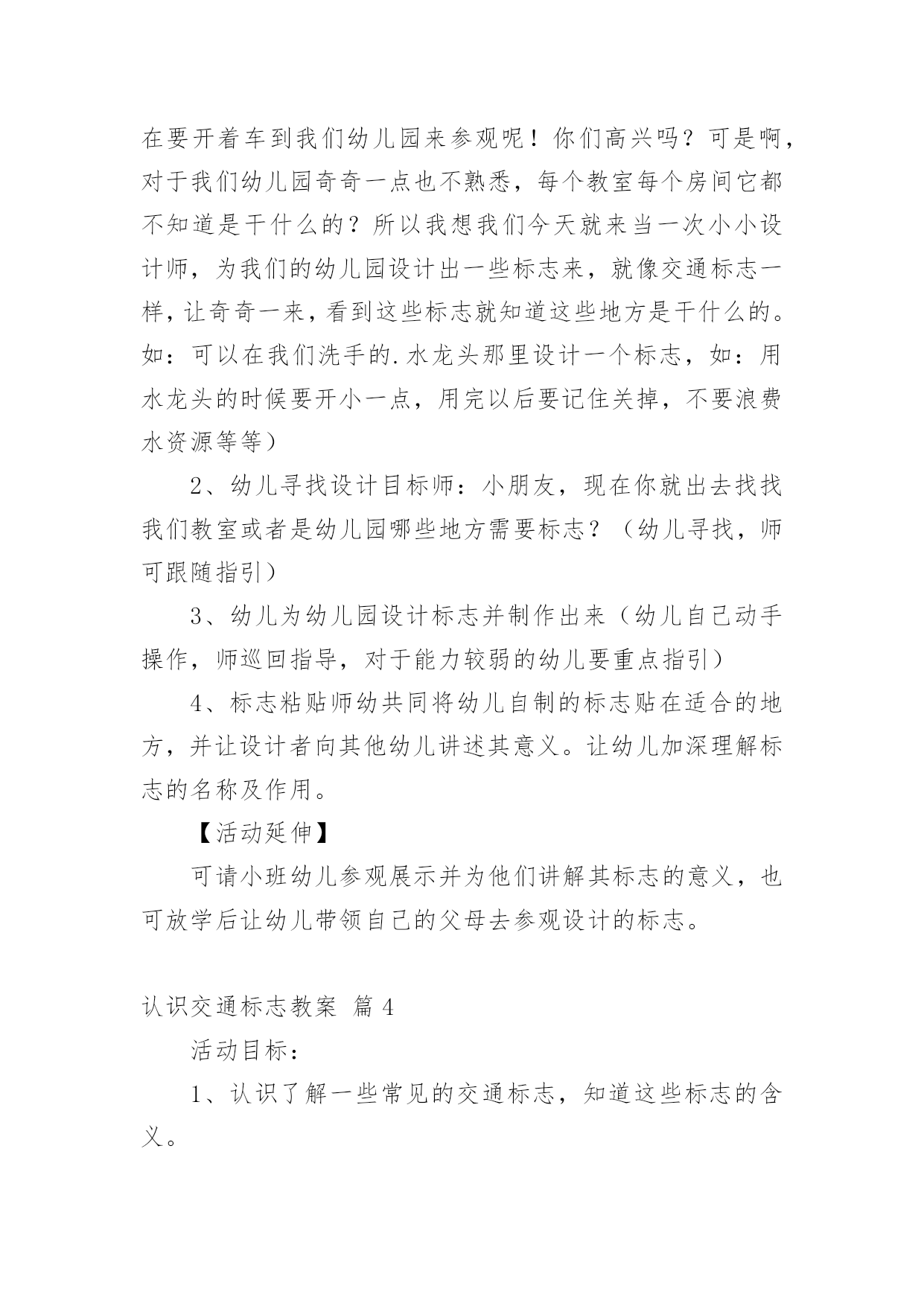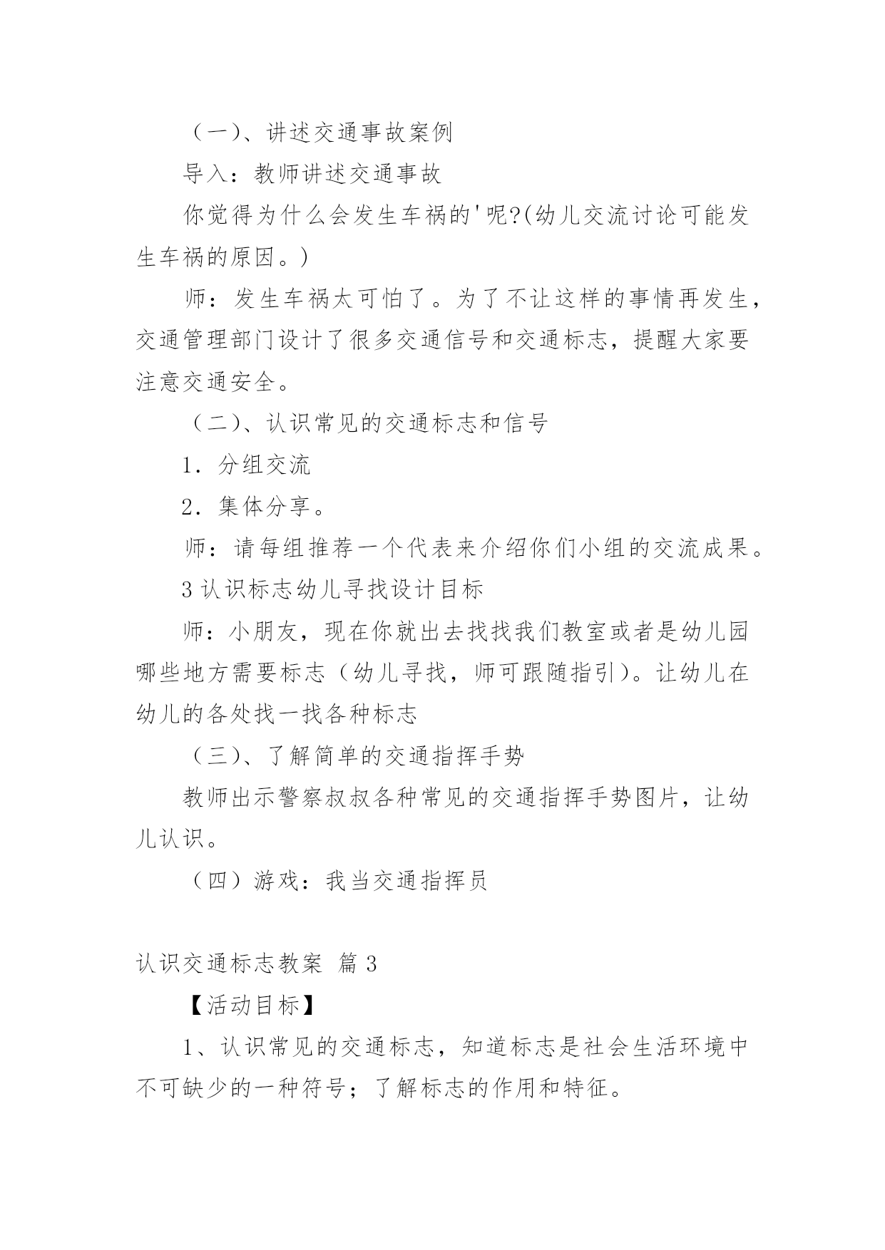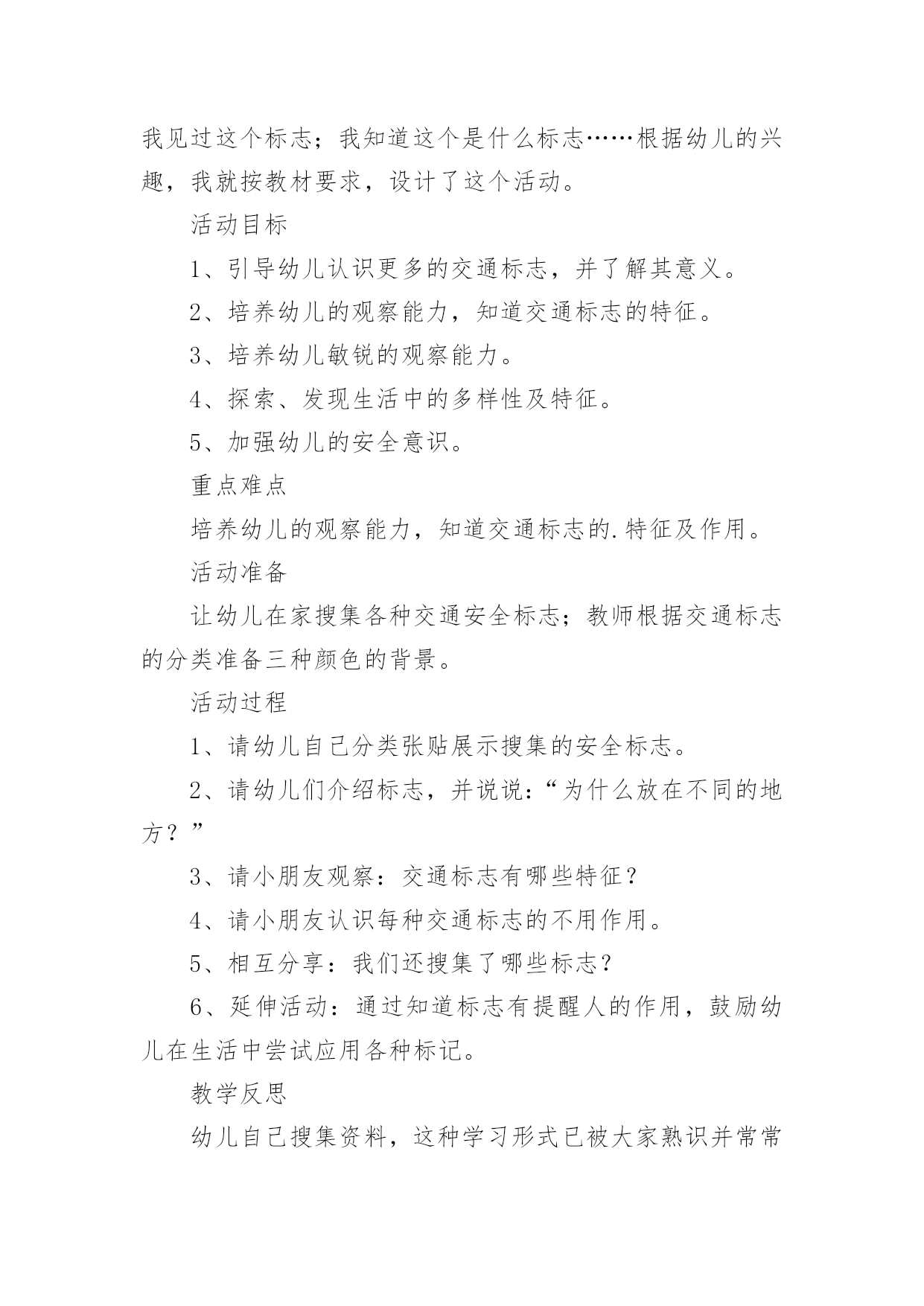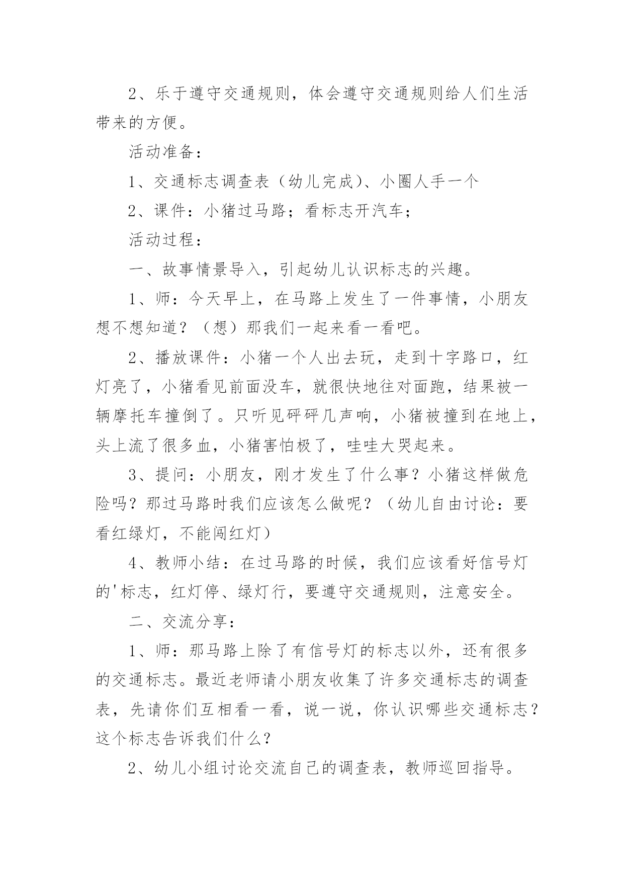 认识交通标志教案认识交通标志教案集锦七篇作为一位杰出的教职工,常常要根据教学需要编写教案,教案是保证教学取得成功、提高教学质量的基本条件。我们该怎么去写教案呢?以下是小编收集整理的认识交通标志教案8篇,欢迎大家借鉴与参考,希望对大家有所帮助。认识交通标志教案篇1活动目标:1、认识常见的交通标志,知道车辆行驶时有特定的范围和特定的规则。2、懂得人们必须自觉遵守交通规则,注意安全,培养看标志的良好习惯。3、培养幼儿思考问题、解决问题的能力及快速应答能力。4、培养幼儿勇敢、活泼的个性。活动准备:1、交通标志图片。2、音乐《去郊游》。3、PPT课件。活动重难点:1、活动重点:认识常见的交通标志,懂得人们必须自觉遵守交通规则,注意安全。2、活动难点:知道车辆行使时有特定的.范围和特定的规则。3、指导要点:以生动的故事激发幼儿学习的兴趣,引导幼儿认识常见的交通标志,懂得人们必须自觉遵守交通规则,主意安全。活动过程1、教师讲述故事,激发起幼儿兴趣,让幼儿欣赏故事,理解故事内容。(1)提出问题,激发兴趣。师:有一只小老鼠开车进城玩,可是却没钱上公园,这是为什么呢?(2)小结:小老鼠不认识交通标志,违反了交通规则,所以被罚款了,罚了钱就没有钱上幼儿园。2、结合图片,认识一些常见的交通标志。(1)师:你们愿意教小老鼠认识马路上的交通标志吗?让我们一起来看看。(2)依次出示标识卡,提问:这是什么标志?你们认识它吗?标志上画有什么?表示什么意思?3、讨论:在马路上还要听从谁的指挥?小结:有了交通标志,马路上的车和行人就不会随意乱行,这样就安全多了。小朋友们出门的时候要注意看是什么交通标志,注意安全,做一个遵守交通工具规则的乖宝宝!4、游戏:去郊游师:小朋友认识了这么多的标志,那我们一起开车去郊游吧!郊游的路上会有很多标志,小朋友们要注意看是什么标志,千万别违反了交通规矩哦!玩法:教师创设马路的情景,把幼儿分成两组,教师出示标志,引导幼儿看标志并遵守交通规则。教学反思:在社会活动《交通标志》中我首先提出问题,激发幼儿的兴趣,然后通过听故事《乡下老鼠逛公园》让幼儿了解小老鼠因不认识交通规则所带来的不便。接着结合图片认识一些常见的交通标志,引导幼儿观察,有斜线的标志就是不能做的事情,是禁止性标志;引导幼儿结合现实生活,进一步理解认识一些常见的标志,注意了知识与实际的结合。最后通过游戏《去郊游》结束本次活动。本次教育活动动静交替、由浅入深、层层递进,幼儿参与积极性高。认识交通标志教案篇2一、活动目标1.认识并了解一些常见的交通信号、交通标志和交通标线的作用。2.知道出行要按交通标志行走,要服从交警指挥,有初步的交通安全意识。3.学习收集整理材料的方法,通过交流分享主动获取新知识。二、活动准备安全事例,幼儿搜集的交通标志记录单三、活动过程(一)、讲述交通事故案例导入:教师讲述交通事故你觉得为什么会发生车祸的'呢?(幼儿交流讨论可能发生车祸的原因。)师:发生车祸太可怕了。为了不让这样的事情再发生,交通管理部门设计了很多交通信号和交通标志,提醒大家要注意交通安全。(二)、认识常见的交通标志和信号1.分组交流2.集体分享。师:请每组推荐一个代表来介绍你们小组的交流成果。3认识标志幼儿寻找设计目标师:小朋友,现在你就出去找找我们教室或者是幼儿园哪些地方需要标志(幼儿寻找,师可跟随指引)。让幼儿在幼儿的各处找一找各种标志(三)、了解简单的交通指挥手势教师出示警察叔叔各种常见的交通指挥手势图片,让幼儿认识。(四)游戏:我当交通指挥员认识交通标志教案篇3【活动目标】1、认识常见的交通标志,知道标志是社会生活环境中不可缺少的一种符号;了解标志的作用和特征。2、使幼儿学会按标志行动3、激发幼儿的想象创造标志,培养幼儿的创造能力。【活动准备】1、准备各种交通标志图片、书籍若干。2、准备自制标志所需要的各种材料。卡纸、铅笔、彩笔等。3、布娃娃一个。【活动过程】一、故事导入:师:小朋友,今天早上有个小朋友委托我们帮他一个忙。到底是谁呢?她又遇到了什么困难呢?我们快一起来看看吧!(师出示布偶表演情景戏)师:前几天布娃娃奇奇新买了一辆小汽车,这不今天早上她就开着她的小车来我们广饶游玩,但是一进城,她发现我们的马路上到处有着很多她不认识的标志,这些标志她从来没有看见过,也不知道是什么意思,所以她不敢开车进城,只好来请教我们小朋友来帮忙了!二、认识交通标志师瞧!布娃娃奇奇把这些交通标志都给画了下来,我们快一起来看看它们都代表着什么意思吧!(师出示各种交通标志的图片,请幼儿自由发表自己的意见,试着说出这些分别是什么标志,分别代表着什么意思)幼儿举手回答:红绿灯、禁止停车、禁止行人通行、禁止非机动车辆通行等。师:刚才小朋友都说出这些标志的意义,那到底说的对不对呢?老师来告诉你吧!(师详细讲解
