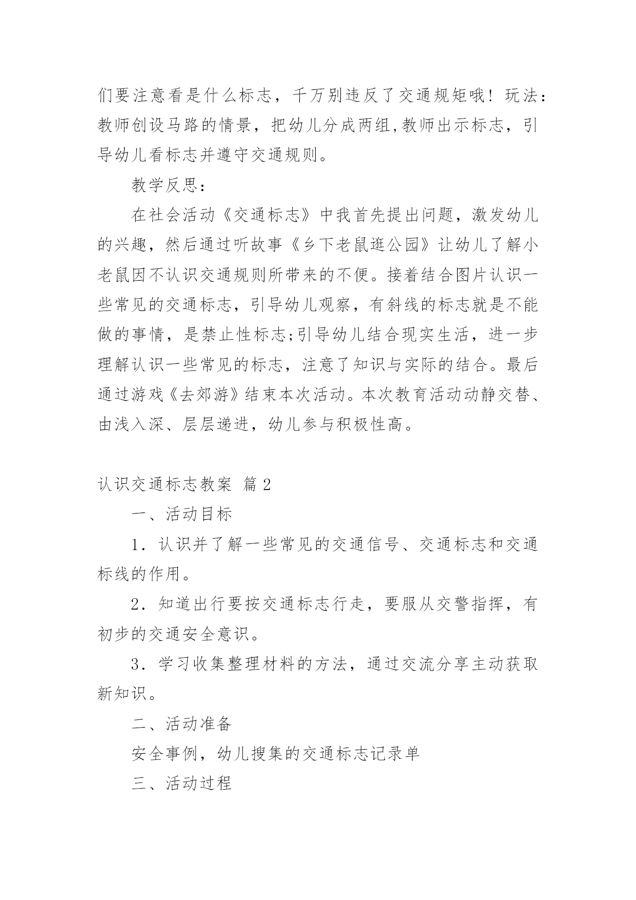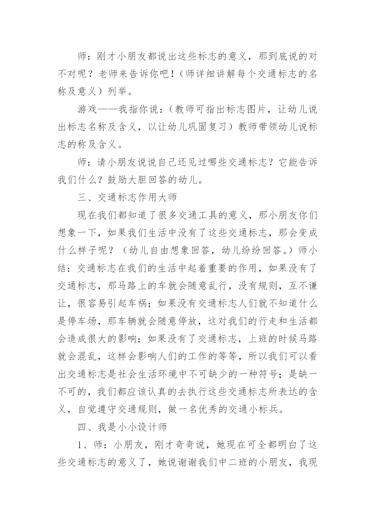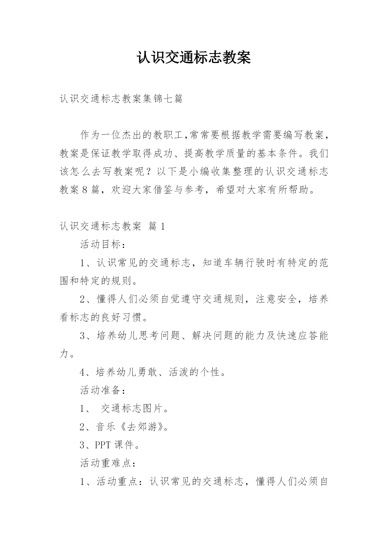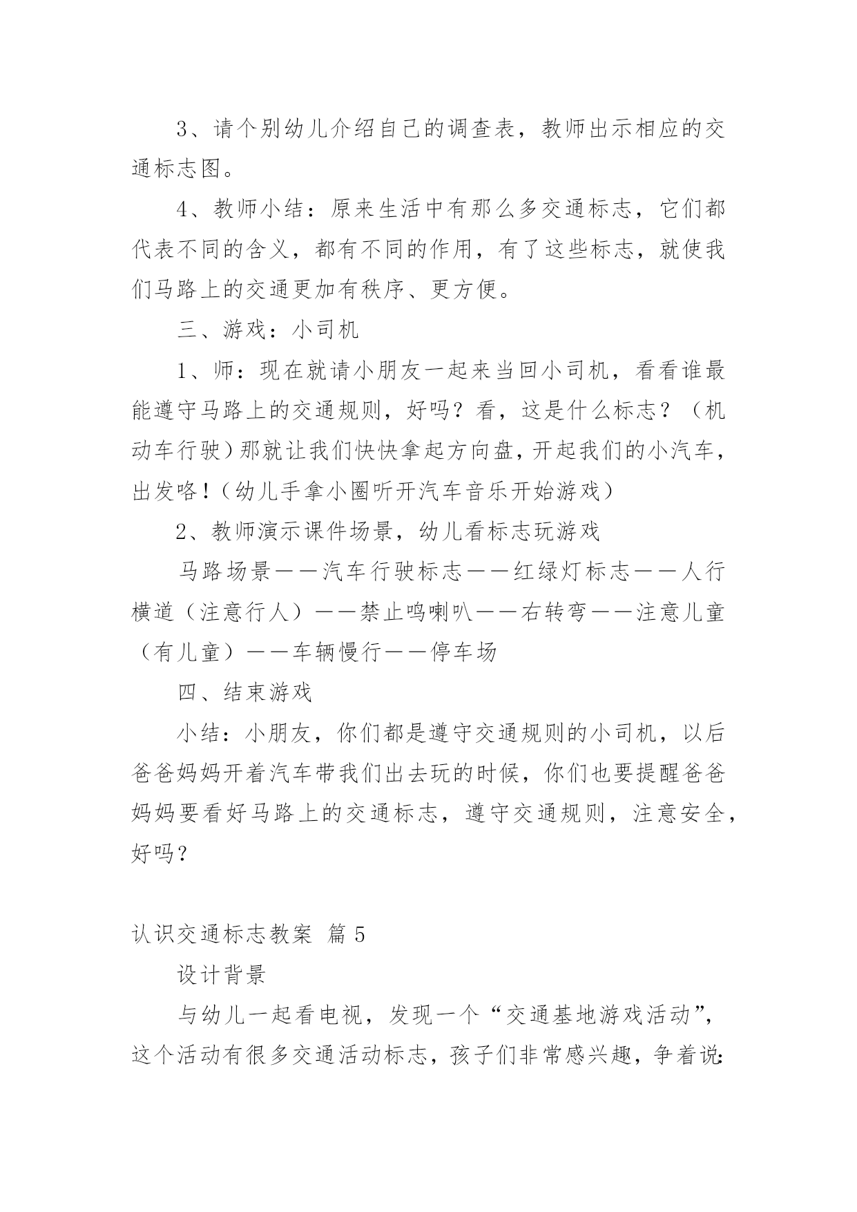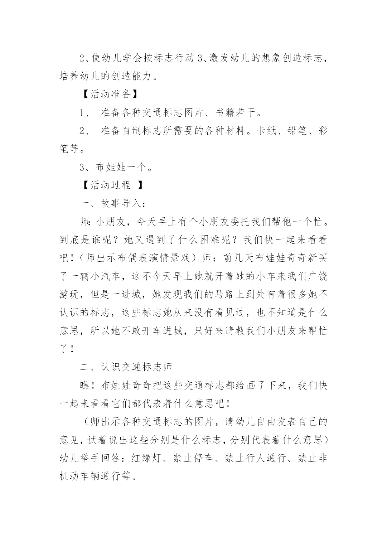 认识交通标志教案认识交通标志教案集锦七篇作为一位杰出的教职工,常常要根据教学需要编写教案,教案是保证教学取得成功、提高教学质量的基本条件。我们该怎么去写教案呢?以下是小编收集整理的认识交通标志教案8篇,欢迎大家借鉴与参考,希望对大家有所帮助。认识交通标志教案篇1活动目标:1、认识常见的交通标志,知道车辆行驶时有特定的范围和特定的规则。2、懂得人们必须自觉遵守交通规则,注意安全,培养看标志的良好习惯。3、培养幼儿思考问题、解决问题的能力及快速应答能力。4、培养幼儿勇敢、活泼的个性。活动准备:1、交通标志图片。2、音乐《去郊游》。3、PPT课件。活动重难点:1、活动重点:认识常见的交通标志,懂得人们必须自觉遵守交通规则,注意安全。2、活动难点:知道车辆行使时有特定的.范围和特定的规则。3、指导要点:以生动的故事激发幼儿学习的兴趣,引导幼儿认识常见的交通标志,懂得人们必须自觉遵守交通规则,主意安全。活动过程1、教师讲述故事,激发起幼儿兴趣,让幼儿欣赏故事,理解故事内容。(1)提出问题,激发兴趣。师:有一只小老鼠开车进城玩,可是却没钱上公园,这是为什么呢?(2)小结:小老鼠不认识交通标志,违反了交通规则,所以被罚款了,罚了钱就没有钱上幼儿园。2、结合图片,认识一些常见的交通标志。(1)师:你们愿意教小老鼠认识马路上的交通标志吗?让我们一起来看看。(2)依次出示标识卡,提问:这是什么标志?你们认识它吗?标志上画有什么?表示什么意思?3、讨论:在马路上还要听从谁的指挥?小结:有了交通标志,马路上的车和行人就不会随意乱行,这样就安全多了。小朋友们出门的时候要注意看是什么交通标志,注意安全,做一个遵守交通工具规则的乖宝宝!4、游戏:去郊游师:小朋友认识了这么多的标志,那我们一起开车去郊游吧!郊游的路上会有很多标志,小朋友们要注意看是什么标志,千万别违反了交通规矩哦!玩法:教师创设马路的情景,把幼儿分成两组,教师出示标志,引导幼儿看标志并遵守交通规则。教学反思:在社会活动《交通标志》中我首先提出问题,激发幼儿的兴趣,然后通过听故事《乡下老鼠逛公园》让幼儿了解小老鼠因不认识交通规则所带来的不便。接着结合图片认识一些常见的交通标志,引导幼儿观察,有斜线的标志就是不能做的事情,是禁止性标志;引导幼儿结合现实生活,进一步理解认识一些常见的标志,注意了知识与实际的结合。最后通过游戏《去郊游》结束本次活动。本次教育活动动静交替、由浅入深、层层递进,幼儿参与积极性高。认识交通标志教案篇2一、活动目标1.认识并了解一些常见的交通信号、交通标志和交通标线的作用。2.知道出行要按交通标志行走,要服从交警指挥,有初步的交通安全意识。3.学习收集整理材料的方法,通过交流分享主动获取新知识。二、活动准备安全事例,幼儿搜集的交通标志记录单三、活动过程(一)、讲述交通事故案例导入:教师讲述交通事故你觉得为什么会发生车祸的'呢?(幼儿交流讨论可能发生车祸的原因。)师:发生车祸太可怕了。为了不让这样的事情再发生,交通管理部门设计了很多交通信号和交通标志,提醒大家要注意交通安全。(二)、认识常见的交通标志和信号1.分组交流2.集体分享。师:请每组推荐一个代表来介绍你们小组的交流成果。3认识标志幼儿寻找设计目标师:小朋友,现在你就出去找找我们教室或者是幼儿园哪些地方需要标志(幼儿寻找,师可跟随指引)。让幼儿在幼儿的各处找一找各种标志(三)、了解简单的交通指挥手势教师出示警察叔叔各种常见的交通指挥手势图片,让幼儿认识。(四)游戏:我当交通指挥员认识交通标志教案篇3【活动目标】1、认识常见的交通标志,知道标志是社会生活环境中不可缺少的一种符号;了解标志的作用和特征。2、使幼儿学会按标志行动3、激发幼儿的想象创造标志,培养幼儿的创造能力。【活动准备】1、准备各种交通标志图片、书籍若干。2、准备自制标志所需要的各种材料。卡纸、铅笔、彩笔等。3、布娃娃一个。【活动过程】一、故事导入:师:小朋友,今天早上有个小朋友委托我们帮他一个忙。到底是谁呢?她又遇到了什么困难呢?我们快一起来看看吧!(师出示布偶表演情景戏)师:前几天布娃娃奇奇新买了一辆小汽车,这不今天早上她就开着她的小车来我们广饶游玩,但是一进城,她发现我们的马路上到处有着很多她不认识的标志,这些标志她从来没有看见过,也不知道是什么意思,所以她不敢开车进城,只好来请教我们小朋友来帮忙了!二、认识交通标志师瞧!布娃娃奇奇把这些交通标志都给画了下来,我们快一起来看看它们都代表着什么意思吧!(师出示各种交通标志的图片,请幼儿自由发表自己的意见,试着说出这些分别是什么标志,分别代表着什么意思)幼儿举手回答:红绿灯、禁止停车、禁止行人通行、禁止非机动车辆通行等。师:刚才小朋友都说出这些标志的意义,那到底说的对不对呢?老师来告诉你吧!(师详细讲解