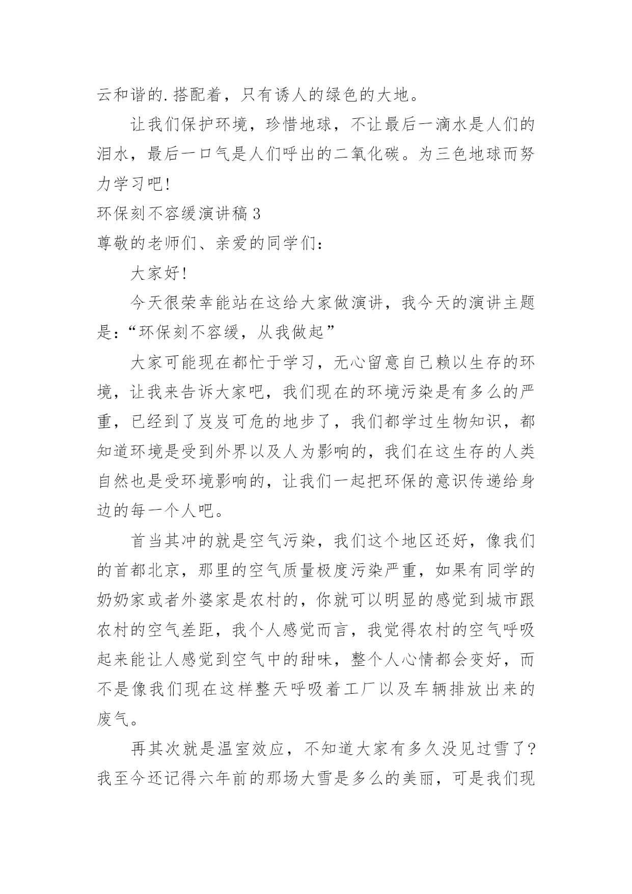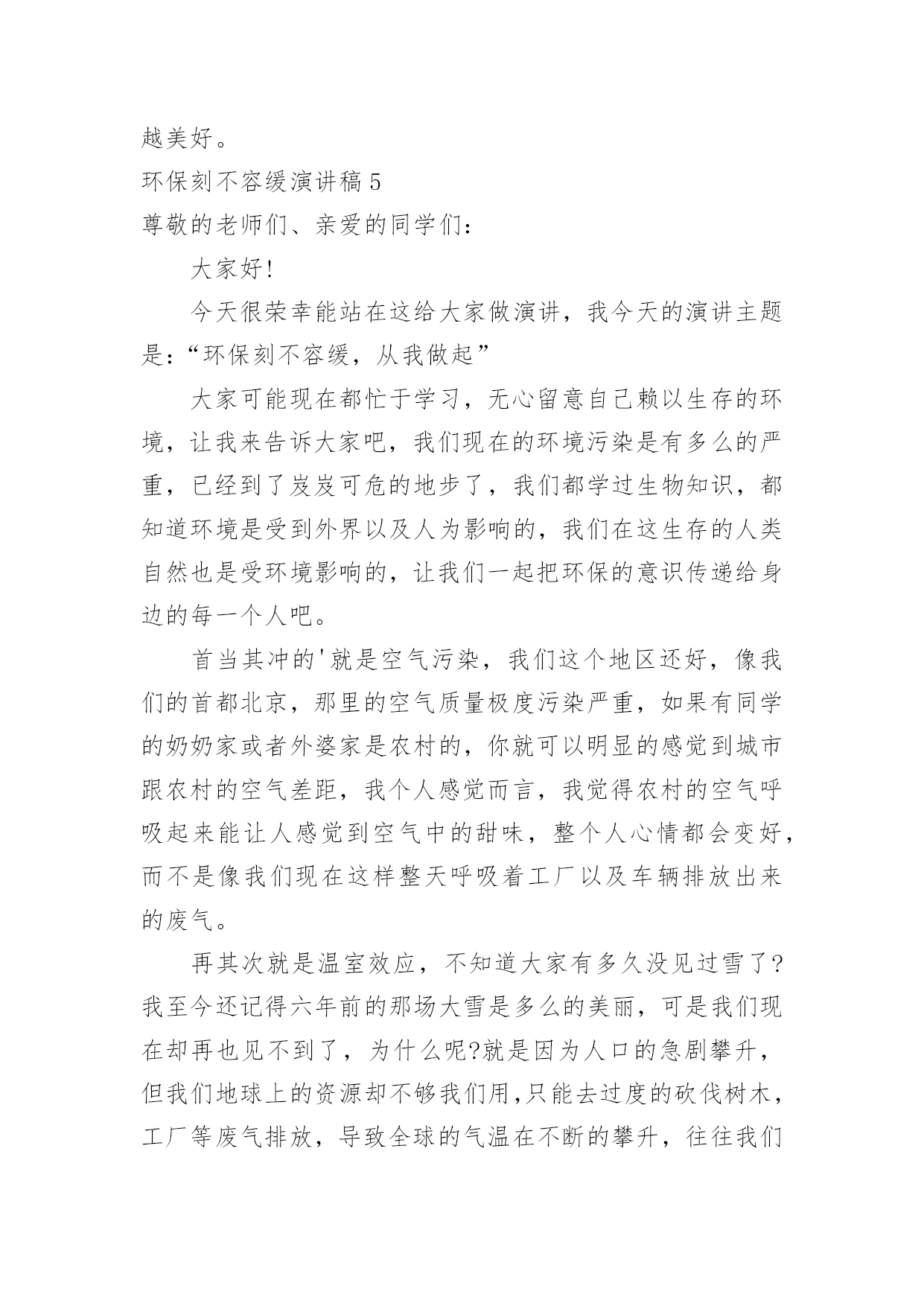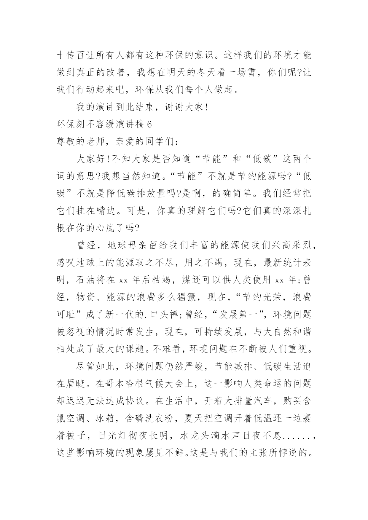 环保刻不容缓演讲稿环保刻不容缓演讲稿演讲稿是作为在特定的情境中供口语表达使用的文稿。在日常生活和工作中,很多地方都会使用到演讲稿,为了让您在写演讲稿时更加简单方便,下面是小编帮大家整理的环保刻不容缓演讲稿,供大家参考借鉴,希望可以帮助到有需要的朋友。环保刻不容缓演讲稿1尊敬的老师,亲爱的同学们:大家好!今天我演讲的题目是:低碳环保,人人有责。近几年,“低碳环保”这个词语越来越热门,因为“低碳与环保”是一种生活方式。那些低碳环保人士正在努力的呼吁每一个人做到环保的生活。解释“低碳与环保”这个词很简单,就是指生活作息中所耗用的能量要尽量的减少,从而减低碳排放,特别是二氧化碳的排放。人人都知道,我们吸入氧气,呼出二氧化碳。我们不可以不喘气。但我们可以从生活方面来控制它。现在,越来越多的环境问题出现,温室气体让地球发高烧,本世纪末海平面可能会升高xxx米。生物物种会减少,甚至影响到形体的变化。这些问题都与我们的生活息息相关,它们在提醒我们要爱护地球母亲,不该让它背负太多的垃圾。”地球是我们赖以生存的家园“这句话每个人都耳熟能详,但对于地球来说,我们能做的真的很少。我们生活在地球上,就对它有了责任,所以环保,早就应该尽力的开始了。国家也在呼吁节能减排,倡导全社会低碳出行,绿色环保。有人认为”低碳“生活很艰难,其实不然,降低碳排放量有很多办法。在我们日常生活中就可以轻易做到。夏天快到了,现在的气温比往年都高,许多人会一回家就把空调打开,并且把空调的温度调到最低。这一举动又给了二氧化碳重出江湖创造了机会。每开一小时就增加了0.621KG的碳。我们每一个人开一个小时的空调,那你可以想象二氧化碳的排放有多少,那数目将是大道惊人。所以我们在夏天,还是要做到尽量开风扇,既省电,又低碳。一举两得。如果非要开空调,那么,空调的.温度最好控制在26度。汽车的废气排放量也是非常巨大的,现在越来越多的人家配置了小汽车,小汽车越多,废气的排放量就越大。交通工具的废气排放量占到温室气体排放的xxx%。这是多么恐怖的一个数字啊。所以,减少此类气体排放的最好办法就是低碳出行,那就是骑自行车或乘坐公交车,更是可以步行,同时也锻炼身体。对于我们学生一代来说,我们也可以从很多方面做起,担当起该有的责任。我们可以用学生的力量,大力宣传低碳环保的重要性,学校也可以组织相应的活动来提高学生们的环保意识。同学们可以在学习与生活中学会低碳环保,我们可以从衣食住行等各个方面来体现低碳环保。生活在这个世纪,低碳环保生活很快就会成为一种体现个人品味的生活方式。走进低碳,改造环境。做到”低碳环保“,更是”人人有责“。我的演讲到此结束,谢谢大家!环保刻不容缓演讲稿2同学们:我今天发言的主题是《保护环境,珍惜地球》。我们生活在地球上,因为她是我们唯一能生存的地方。我们离不开阳光,离不开植物,离不开氧气,也离不开水。可是同学们知道吗?地球这位母亲的身上的绿,正一点一点地变黄,科学家们测算,在不久的将来,母亲的绿色会消失,我也曾作过一个真实的梦,梦见全球已被沙漠化,一眼望去,只能看见无边的沙子和黑色的天空,而我向一架飞船走去……可是同学们知道吗?母亲将面临一场灾难----全球气候变暖,南北极冰雪融化,海平面升高,大地淹没,南极上空出现臭氧空洞,空气一点点的流逝,动物大量灭绝……可是同学们知道吗?我们可以直接利用的水只占世界总水量的十万分之七,可以说是微乎其微。可是这些水害不断地被污染着,大地上水的颜色,正不停的变换着……我前几天看电视得知,在长江里,中国独有的中华鲟已经绝种,令几十代中国人自豪的活化石已从我们眼前消失。我有一个愿望,我要一个三色地球,水是蓝色的、大地是绿色的、云是白色的,森林覆盖率是百分之百,蓝天和白云和谐的.搭配着,只有诱人的绿色的大地。让我们保护环境,珍惜地球,不让最后一滴水是人们的泪水,最后一口气是人们呼出的二氧化碳。为三色地球而努力学习吧!环保刻不容缓演讲稿3尊敬的老师们、亲爱的同学们:大家好!今天很荣幸能站在这给大家做演讲,我今天的演讲主题是:“环保刻不容缓,从我做起”大家可能现在都忙于学习,无心留意自己赖以生存的环境,让我来告诉大家吧,我们现在的环境污染是有多么的严重,已经到了岌岌可危的地步了,我们都学过生物知识,都知道环境是受到外界以及人为影响的,我们在这生存的人类自然也是受环境影响的,让我们一起把环保的意识传递给身边的每一个人吧。首当其冲的就是空气污染,我们这个地区还好,像我们的首都北京,那里的空气质量极度污染严重,如果有同学的奶奶家或者外婆家是农村的,你就可以明显的感觉到城市跟农村的空气差距,我个人感觉而言,我觉得农村的空气呼吸起来能让人感觉到空气中的甜味,整个人心情都会变好,而不是像我们现在这样整天呼吸着工厂以及车辆排放出来的废气。再其次就是温室效应,不知道