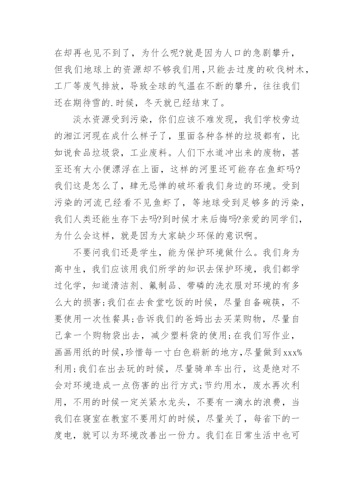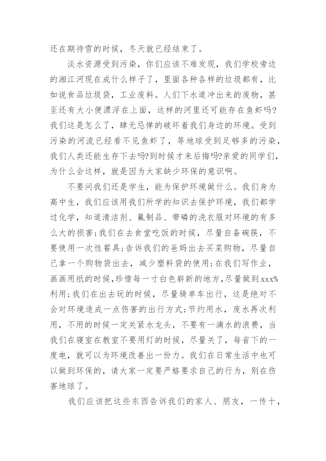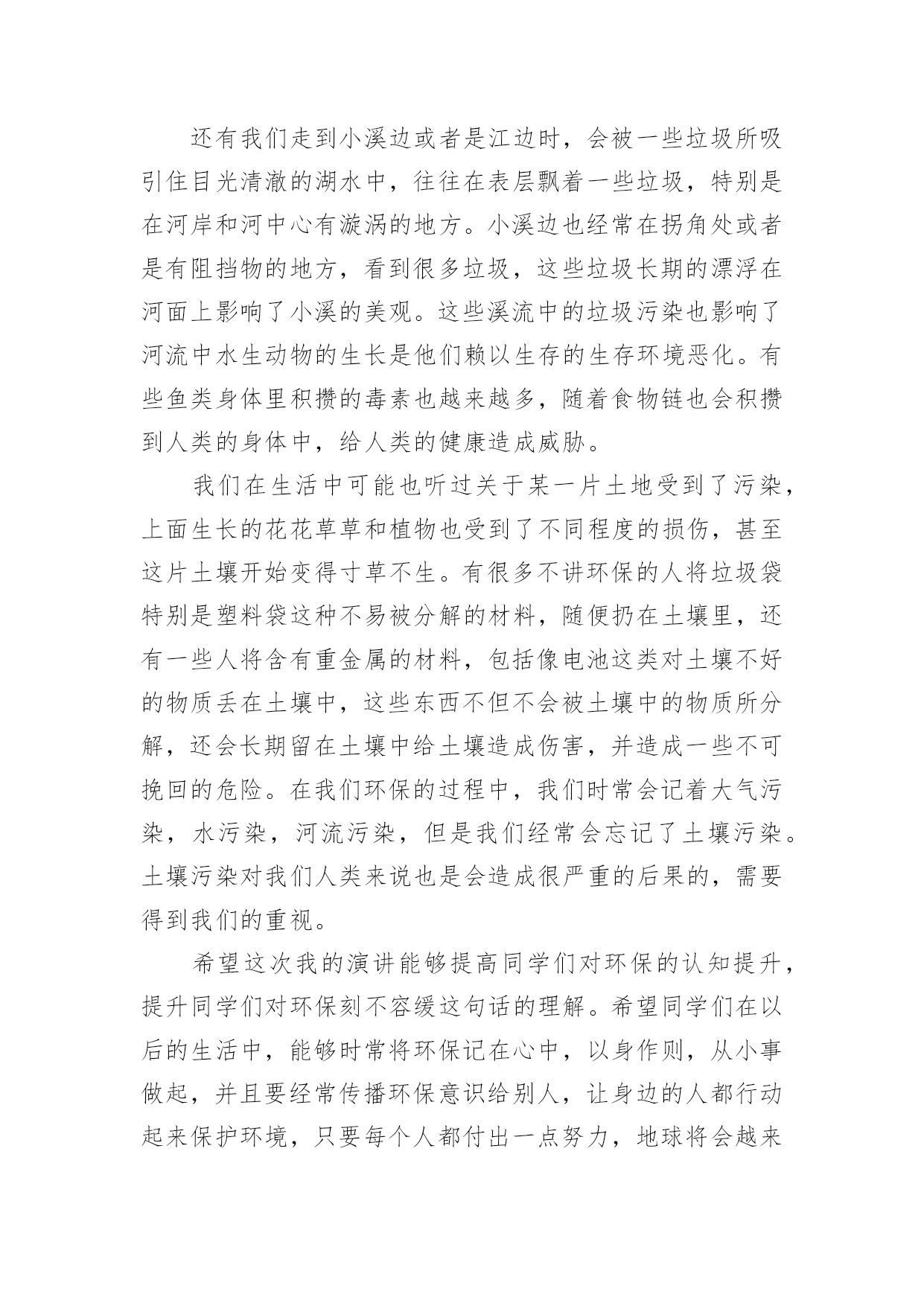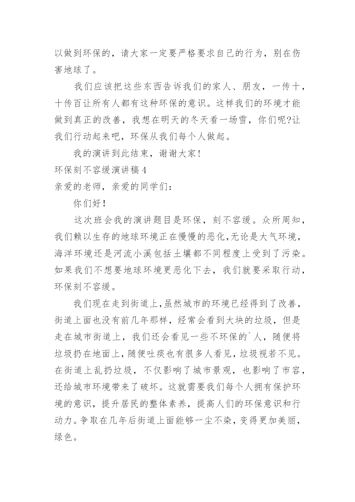 环保刻不容缓演讲稿环保刻不容缓演讲稿演讲稿是作为在特定的情境中供口语表达使用的文稿。在日常生活和工作中,很多地方都会使用到演讲稿,为了让您在写演讲稿时更加简单方便,下面是小编帮大家整理的环保刻不容缓演讲稿,供大家参考借鉴,希望可以帮助到有需要的朋友。环保刻不容缓演讲稿1尊敬的老师,亲爱的同学们:大家好!今天我演讲的题目是:低碳环保,人人有责。近几年,“低碳环保”这个词语越来越热门,因为“低碳与环保”是一种生活方式。那些低碳环保人士正在努力的呼吁每一个人做到环保的生活。解释“低碳与环保”这个词很简单,就是指生活作息中所耗用的能量要尽量的减少,从而减低碳排放,特别是二氧化碳的排放。人人都知道,我们吸入氧气,呼出二氧化碳。我们不可以不喘气。但我们可以从生活方面来控制它。现在,越来越多的环境问题出现,温室气体让地球发高烧,本世纪末海平面可能会升高xxx米。生物物种会减少,甚至影响到形体的变化。这些问题都与我们的生活息息相关,它们在提醒我们要爱护地球母亲,不该让它背负太多的垃圾。”地球是我们赖以生存的家园“这句话每个人都耳熟能详,但对于地球来说,我们能做的真的很少。我们生活在地球上,就对它有了责任,所以环保,早就应该尽力的开始了。国家也在呼吁节能减排,倡导全社会低碳出行,绿色环保。有人认为”低碳“生活很艰难,其实不然,降低碳排放量有很多办法。在我们日常生活中就可以轻易做到。夏天快到了,现在的气温比往年都高,许多人会一回家就把空调打开,并且把空调的温度调到最低。这一举动又给了二氧化碳重出江湖创造了机会。每开一小时就增加了0.621KG的碳。我们每一个人开一个小时的空调,那你可以想象二氧化碳的排放有多少,那数目将是大道惊人。所以我们在夏天,还是要做到尽量开风扇,既省电,又低碳。一举两得。如果非要开空调,那么,空调的.温度最好控制在26度。汽车的废气排放量也是非常巨大的,现在越来越多的人家配置了小汽车,小汽车越多,废气的排放量就越大。交通工具的废气排放量占到温室气体排放的xxx%。这是多么恐怖的一个数字啊。所以,减少此类气体排放的最好办法就是低碳出行,那就是骑自行车或乘坐公交车,更是可以步行,同时也锻炼身体。对于我们学生一代来说,我们也可以从很多方面做起,担当起该有的责任。我们可以用学生的力量,大力宣传低碳环保的重要性,学校也可以组织相应的活动来提高学生们的环保意识。同学们可以在学习与生活中学会低碳环保,我们可以从衣食住行等各个方面来体现低碳环保。生活在这个世纪,低碳环保生活很快就会成为一种体现个人品味的生活方式。走进低碳,改造环境。做到”低碳环保“,更是”人人有责“。我的演讲到此结束,谢谢大家!环保刻不容缓演讲稿2同学们:我今天发言的主题是《保护环境,珍惜地球》。我们生活在地球上,因为她是我们唯一能生存的地方。我们离不开阳光,离不开植物,离不开氧气,也离不开水。可是同学们知道吗?地球这位母亲的身上的绿,正一点一点地变黄,科学家们测算,在不久的将来,母亲的绿色会消失,我也曾作过一个真实的梦,梦见全球已被沙漠化,一眼望去,只能看见无边的沙子和黑色的天空,而我向一架飞船走去……可是同学们知道吗?母亲将面临一场灾难----全球气候变暖,南北极冰雪融化,海平面升高,大地淹没,南极上空出现臭氧空洞,空气一点点的流逝,动物大量灭绝……可是同学们知道吗?我们可以直接利用的水只占世界总水量的十万分之七,可以说是微乎其微。可是这些水害不断地被污染着,大地上水的颜色,正不停的变换着……我前几天看电视得知,在长江里,中国独有的中华鲟已经绝种,令几十代中国人自豪的活化石已从我们眼前消失。我有一个愿望,我要一个三色地球,水是蓝色的、大地是绿色的、云是白色的,森林覆盖率是百分之百,蓝天和白云和谐的.搭配着,只有诱人的绿色的大地。让我们保护环境,珍惜地球,不让最后一滴水是人们的泪水,最后一口气是人们呼出的二氧化碳。为三色地球而努力学习吧!环保刻不容缓演讲稿3尊敬的老师们、亲爱的同学们:大家好!今天很荣幸能站在这给大家做演讲,我今天的演讲主题是:“环保刻不容缓,从我做起”大家可能现在都忙于学习,无心留意自己赖以生存的环境,让我来告诉大家吧,我们现在的环境污染是有多么的严重,已经到了岌岌可危的地步了,我们都学过生物知识,都知道环境是受到外界以及人为影响的,我们在这生存的人类自然也是受环境影响的,让我们一起把环保的意识传递给身边的每一个人吧。首当其冲的就是空气污染,我们这个地区还好,像我们的首都北京,那里的空气质量极度污染严重,如果有同学的奶奶家或者外婆家是农村的,你就可以明显的感觉到城市跟农村的空气差距,我个人感觉而言,我觉得农村的空气呼吸起来能让人感觉到空气中的甜味,整个人心情都会变好,而不是像我们现在这样整天呼吸着工厂以及车辆排放出来的废气。再其次就是温室效应,不知道