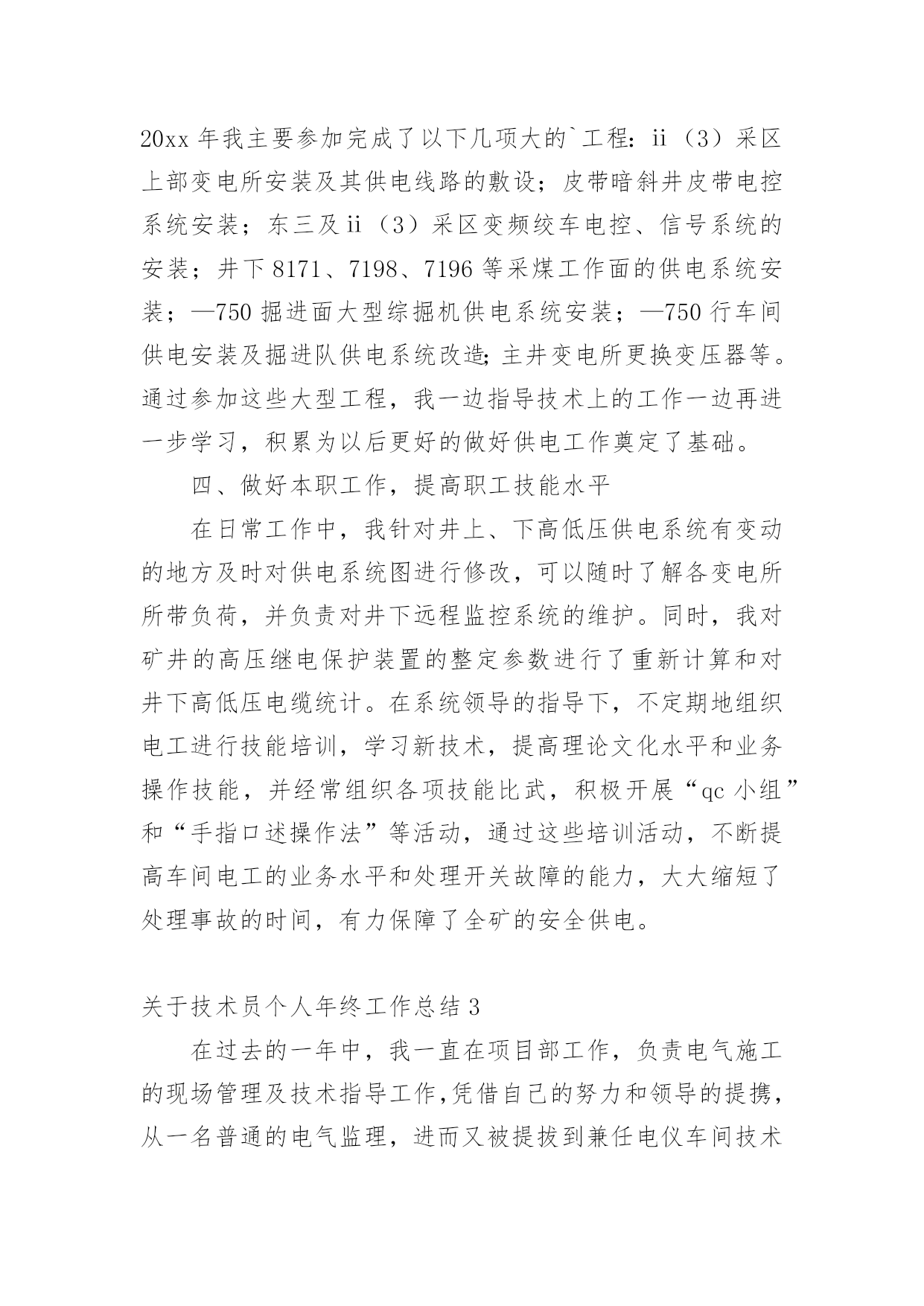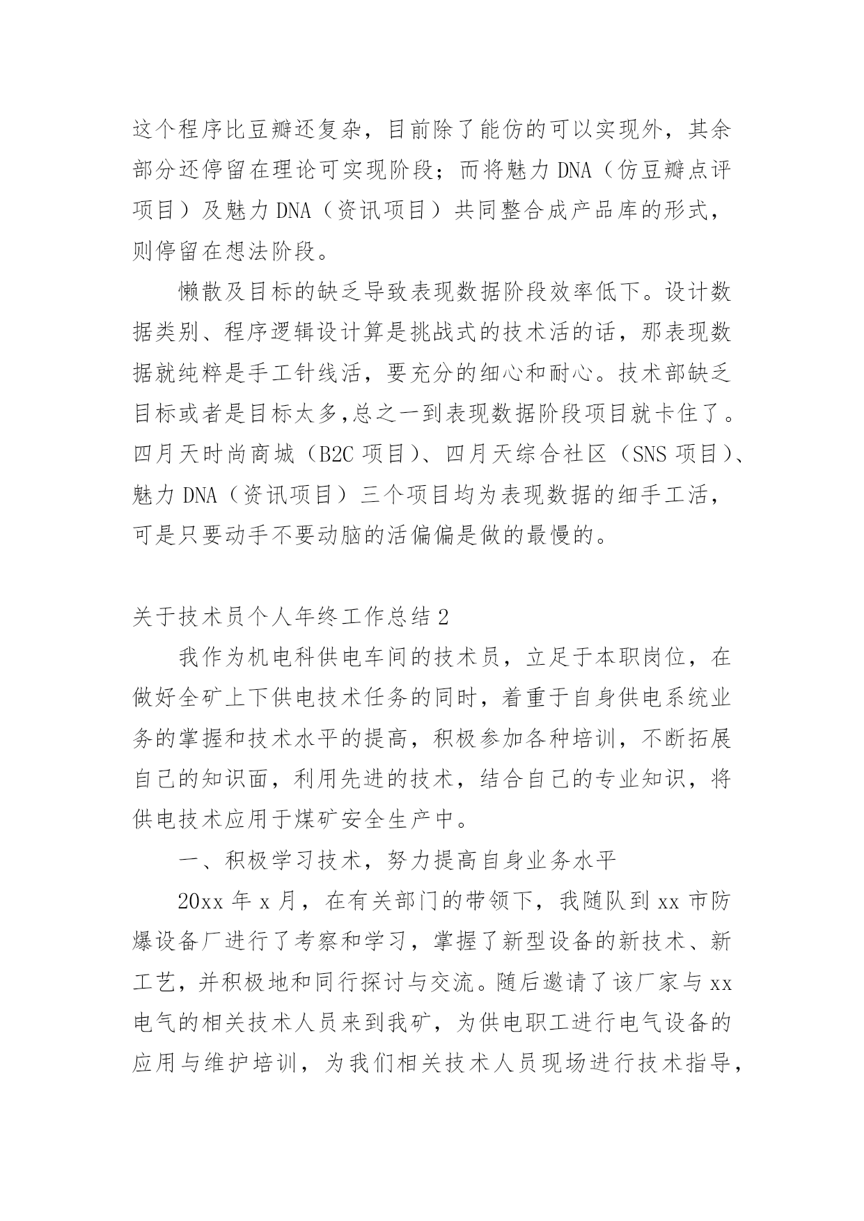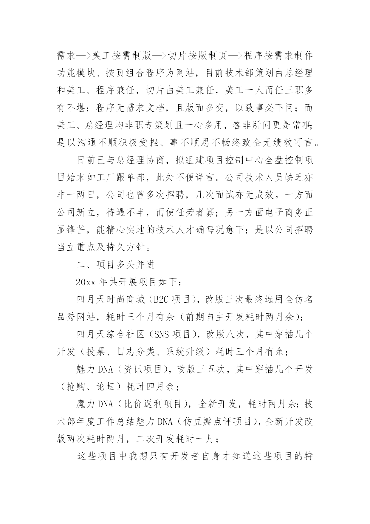 技术员个人年终工作总结关于技术员个人年终工作总结总结是把一定阶段内的有关情况分析研究,做出有指导性结论的书面材料,通过它可以正确认识以往学习和工作中的优缺点,因此十分有必须要写一份总结哦。总结怎么写才能发挥它的作用呢?以下是小编整理的关于技术员个人年终工作总结,欢迎阅读,希望大家能够喜欢。关于技术员个人年终工作总结1温故而知新,前行回望更知曲直,20xx平静悄无声息的过去,但是作为一个锐意进取的人来说过去的不是结束,而是新起点爆发力的积累。在此辞旧迎新之际展翅欲飞时,将技术部门在20xx年的工作做一个回顾,旨在去疑窦、组纲目、立主脑,为20xx年能具有绩效的工作,打下坚实的基础。20xx年技术部门各工作人员善处于单兵据点各自为战的磨合期,而主要工作任务也是学习各优秀站点成功的技术应用和运营方式。在这里我对技术部目前遇到的困难及解决方式作个总结:一、专业技术队伍薄弱由于新公司成立不久,存在人才奇缺的严重不足。作为新兴的信息科技公司目前公司技术部共三人,美工一人、程序两人。看似稳定的三角组合先且不论稳定与否,其合理性就有待商酌。专业网建公司建网站的流程一般为:策划分析需求—>美工按需制版—>切片按版制页—>程序按需求制作功能模块、按页组合程序为网站,目前技术部策划由总经理和美工、程序兼任,切片由美工兼任,美工一人而任三职多有不堪;程序无需求文档,且版面多变,以致事必下问;而美工、总经理均非职专策划且一心多用,答非所问更是常事;是以沟通不顺积极受挫、事不顺思不畅终致全无绩效可言。日前已与总经理协商,拟组建项目控制中心全盘控制项目始末如工厂跟单部,此处不便详言。公司技术人员缺乏亦非一两日,公司也曾多次招聘,几次面试亦无成效。一方面公司新立,待遇不丰,而使任劳者寡;另一方面电子商务正显锋芒,能精心实地的技术人才确每况愈下;是以公司招聘当立重点及持久方针。二、项目多头并进20xx年共开展项目如下:四月天时尚商城(B2C项目),改版三次最终选用全仿名品秀网站,耗时三个月有余(前期自主开发耗时两月余);四月天综合社区(SNS项目),改版八次,其中穿插几个开发(投票、日志分类、系统升级)耗时三个月有余;魅力DNA(资讯项目),改版三五次,其中穿插几个开发(抢购、论坛)耗时四月余;魔力DNA(比价返利项目),全新开发,耗时两月余;技术部年度工作总结魅力DNA(仿豆瓣点评项目),全新开发改版两次耗时两月,二次开发耗时一月;这些项目中我想只有开发者自身才知道这些项目的特性或许有些特性开发者也已经忘记或被混淆了。这些项目只有“仿豆瓣点评项目”和“资讯项目”是符合最初构思目标和目的的。项目的多头并进是任何一个追求绩效的公司的忌讳,缺乏单纯动机的多项目开发往往使得开发人员多不可估算的项目产生恐惧。三、技术不过关网站不是一堆网页的集合,而是现实生活中的`可见的或不可见的数据的集合并以一定可变的逻辑表现出来。技术部的任务大致可以分为三类:设计数据类别以便存储数据、归纳常用逻辑、表现数据,目前技术部三块均存在问题。设计数据类别:技术部门没有专业市场认识,对可能出现的数据类型缺乏预见性,以致开发的系统不能如同行网站一样运营。其中技术部美工对市场缺乏认识,导致前台界面与后台数据不吻合被迫改版或导致图片版与最终效果不一致;另技术部程序对系统数据设计和开发时间缺乏安排,导致魅力DNA(仿豆瓣点评项目)和魔力DNA(比价返利项目)均不同程度的进行二次开发。程序逻辑设计:四月天时尚商城(B2C项目)、四月天综合社区(SNS项目)、魅力DNA(资讯项目)这三个项目开源程序涉及的仅简单的页面显示逻辑;魔力DNA(比价返利项目)程序逻辑设计目前仅实现比价逻辑,返利、产品搜索、与其它平台同步价格这几快程序逻辑均因技术部程序见识不够、想法不够而不能实现;魅力DNA(仿豆瓣点评项目)这个程序比豆瓣还复杂,目前除了能仿的可以实现外,其余部分还停留在理论可实现阶段;而将魅力DNA(仿豆瓣点评项目)及魅力DNA(资讯项目)共同整合成产品库的形式,则停留在想法阶段。懒散及目标的缺乏导致表现数据阶段效率低下。设计数据类别、程序逻辑设计算是挑战式的技术活的话,那表现数据就纯粹是手工针线活,要充分的细心和耐心。技术部缺乏目标或者是目标太多,总之一到表现数据阶段项目就卡住了。四月天时尚商城(B2C项目)、四月天综合社区(SNS项目)、魅力DNA(资讯项目)三个项目均为表现数据的细手工活,可是只要动手不要动脑的活偏偏是做的最慢的。关于技术员个人年终工作总结2我作为机电科供电车间的技术员,立足于本职岗位,在做好全矿上下供电技术任务的同时,着重于自身供电系统业务的掌握和技术水平的提高,积极参加各种培训,不断拓展自己的知识面,利用先进的技术,结合自己的专业知识,将供电技术应用于煤矿安全生产中。一、积极学习