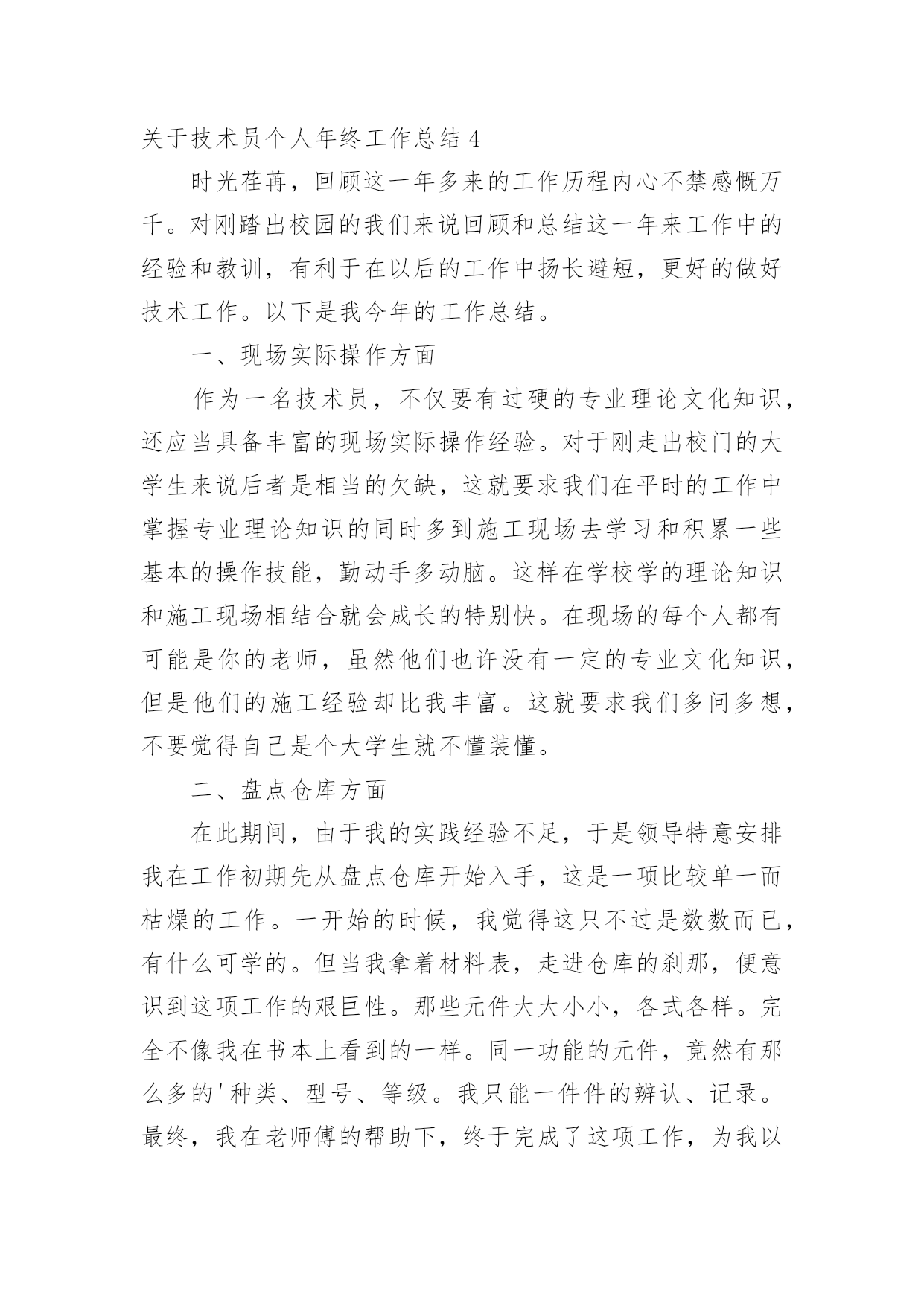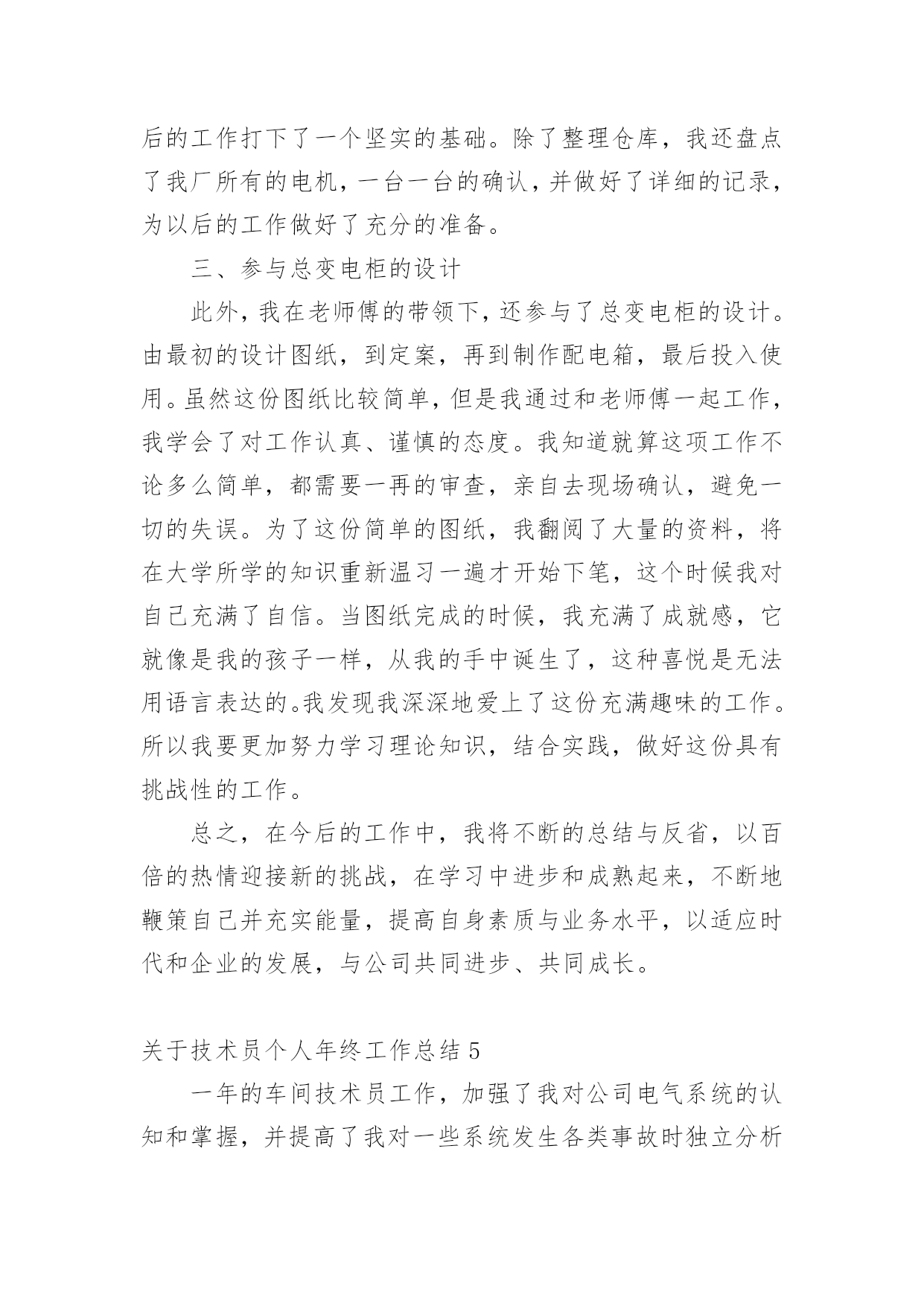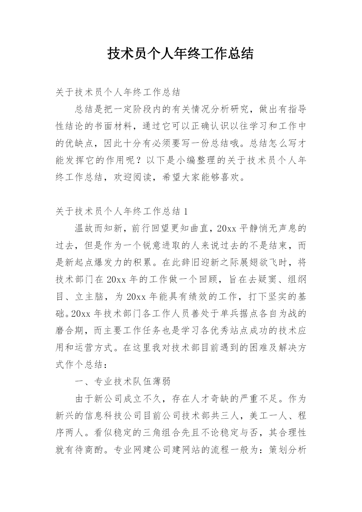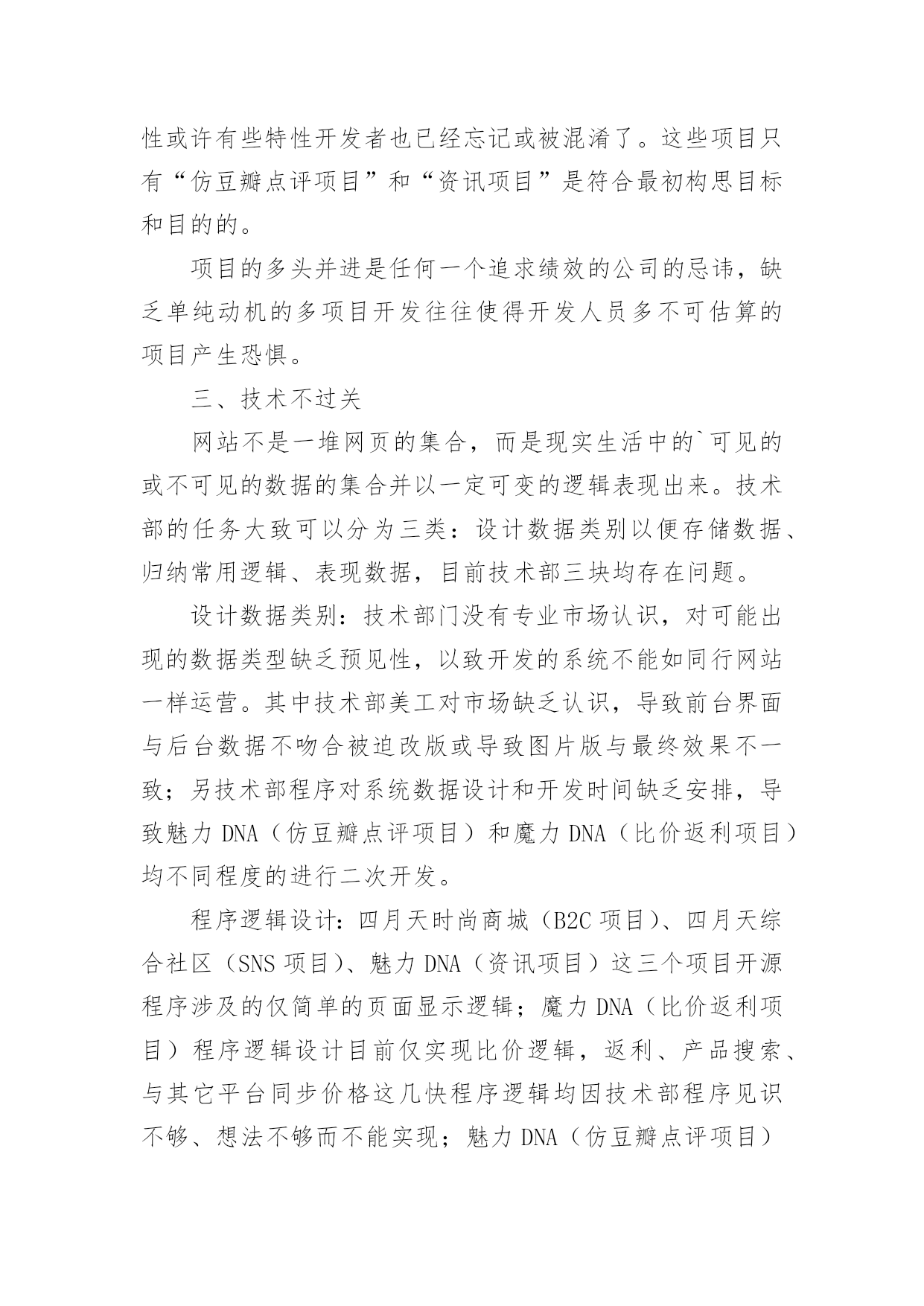 技术员个人年终工作总结关于技术员个人年终工作总结总结是把一定阶段内的有关情况分析研究,做出有指导性结论的书面材料,通过它可以正确认识以往学习和工作中的优缺点,因此十分有必须要写一份总结哦。总结怎么写才能发挥它的作用呢?以下是小编整理的关于技术员个人年终工作总结,欢迎阅读,希望大家能够喜欢。关于技术员个人年终工作总结1温故而知新,前行回望更知曲直,20xx平静悄无声息的过去,但是作为一个锐意进取的人来说过去的不是结束,而是新起点爆发力的积累。在此辞旧迎新之际展翅欲飞时,将技术部门在20xx年的工作做一个回顾,旨在去疑窦、组纲目、立主脑,为20xx年能具有绩效的工作,打下坚实的基础。20xx年技术部门各工作人员善处于单兵据点各自为战的磨合期,而主要工作任务也是学习各优秀站点成功的技术应用和运营方式。在这里我对技术部目前遇到的困难及解决方式作个总结:一、专业技术队伍薄弱由于新公司成立不久,存在人才奇缺的严重不足。作为新兴的信息科技公司目前公司技术部共三人,美工一人、程序两人。看似稳定的三角组合先且不论稳定与否,其合理性就有待商酌。专业网建公司建网站的流程一般为:策划分析需求—>美工按需制版—>切片按版制页—>程序按需求制作功能模块、按页组合程序为网站,目前技术部策划由总经理和美工、程序兼任,切片由美工兼任,美工一人而任三职多有不堪;程序无需求文档,且版面多变,以致事必下问;而美工、总经理均非职专策划且一心多用,答非所问更是常事;是以沟通不顺积极受挫、事不顺思不畅终致全无绩效可言。日前已与总经理协商,拟组建项目控制中心全盘控制项目始末如工厂跟单部,此处不便详言。公司技术人员缺乏亦非一两日,公司也曾多次招聘,几次面试亦无成效。一方面公司新立,待遇不丰,而使任劳者寡;另一方面电子商务正显锋芒,能精心实地的技术人才确每况愈下;是以公司招聘当立重点及持久方针。二、项目多头并进20xx年共开展项目如下:四月天时尚商城(B2C项目),改版三次最终选用全仿名品秀网站,耗时三个月有余(前期自主开发耗时两月余);四月天综合社区(SNS项目),改版八次,其中穿插几个开发(投票、日志分类、系统升级)耗时三个月有余;魅力DNA(资讯项目),改版三五次,其中穿插几个开发(抢购、论坛)耗时四月余;魔力DNA(比价返利项目),全新开发,耗时两月余;技术部年度工作总结魅力DNA(仿豆瓣点评项目),全新开发改版两次耗时两月,二次开发耗时一月;这些项目中我想只有开发者自身才知道这些项目的特性或许有些特性开发者也已经忘记或被混淆了。这些项目只有“仿豆瓣点评项目”和“资讯项目”是符合最初构思目标和目的的。项目的多头并进是任何一个追求绩效的公司的忌讳,缺乏单纯动机的多项目开发往往使得开发人员多不可估算的项目产生恐惧。三、技术不过关网站不是一堆网页的集合,而是现实生活中的`可见的或不可见的数据的集合并以一定可变的逻辑表现出来。技术部的任务大致可以分为三类:设计数据类别以便存储数据、归纳常用逻辑、表现数据,目前技术部三块均存在问题。设计数据类别:技术部门没有专业市场认识,对可能出现的数据类型缺乏预见性,以致开发的系统不能如同行网站一样运营。其中技术部美工对市场缺乏认识,导致前台界面与后台数据不吻合被迫改版或导致图片版与最终效果不一致;另技术部程序对系统数据设计和开发时间缺乏安排,导致魅力DNA(仿豆瓣点评项目)和魔力DNA(比价返利项目)均不同程度的进行二次开发。程序逻辑设计:四月天时尚商城(B2C项目)、四月天综合社区(SNS项目)、魅力DNA(资讯项目)这三个项目开源程序涉及的仅简单的页面显示逻辑;魔力DNA(比价返利项目)程序逻辑设计目前仅实现比价逻辑,返利、产品搜索、与其它平台同步价格这几快程序逻辑均因技术部程序见识不够、想法不够而不能实现;魅力DNA(仿豆瓣点评项目)这个程序比豆瓣还复杂,目前除了能仿的可以实现外,其余部分还停留在理论可实现阶段;而将魅力DNA(仿豆瓣点评项目)及魅力DNA(资讯项目)共同整合成产品库的形式,则停留在想法阶段。懒散及目标的缺乏导致表现数据阶段效率低下。设计数据类别、程序逻辑设计算是挑战式的技术活的话,那表现数据就纯粹是手工针线活,要充分的细心和耐心。技术部缺乏目标或者是目标太多,总之一到表现数据阶段项目就卡住了。四月天时尚商城(B2C项目)、四月天综合社区(SNS项目)、魅力DNA(资讯项目)三个项目均为表现数据的细手工活,可是只要动手不要动脑的活偏偏是做的最慢的。关于技术员个人年终工作总结2我作为机电科供电车间的技术员,立足于本职岗位,在做好全矿上下供电技术任务的同时,着重于自身供电系统业务的掌握和技术水平的提高,积极参加各种培训,不断拓展自己的知识面,利用先进的技术,结合自己的专业知识,将供电技术应用于煤矿安全生产中。一、积极学习