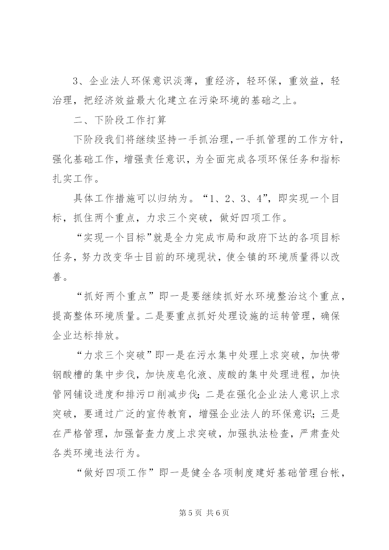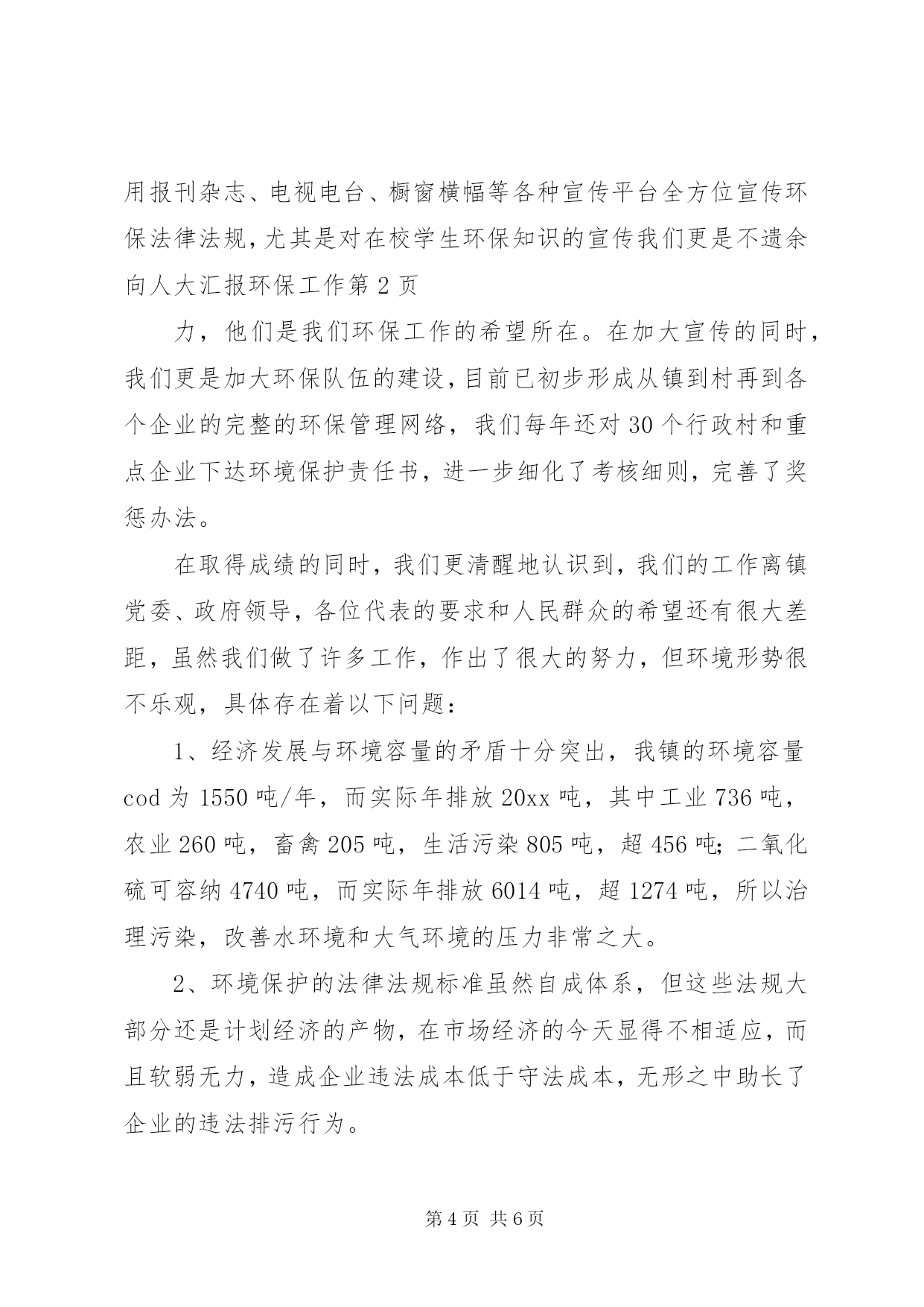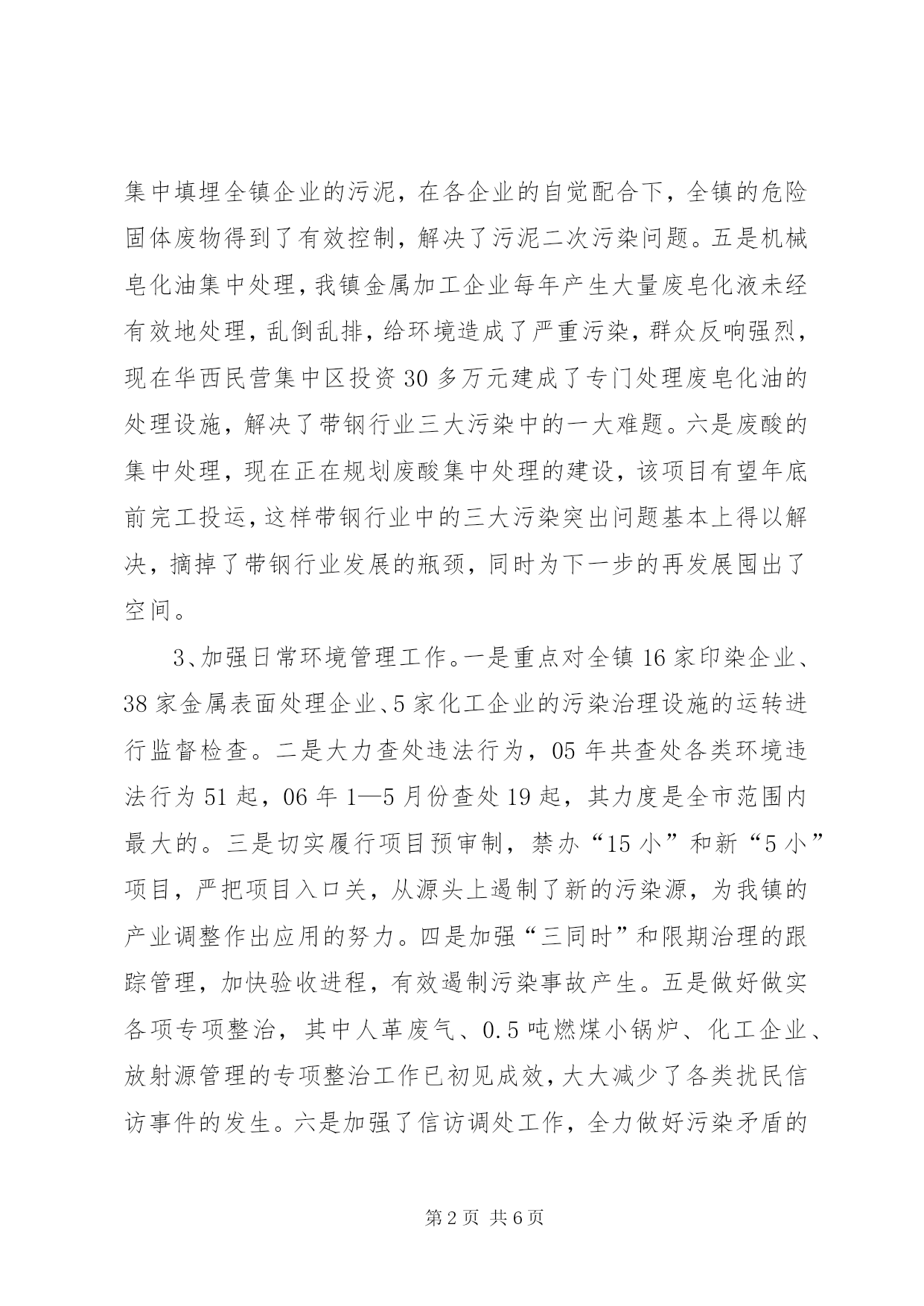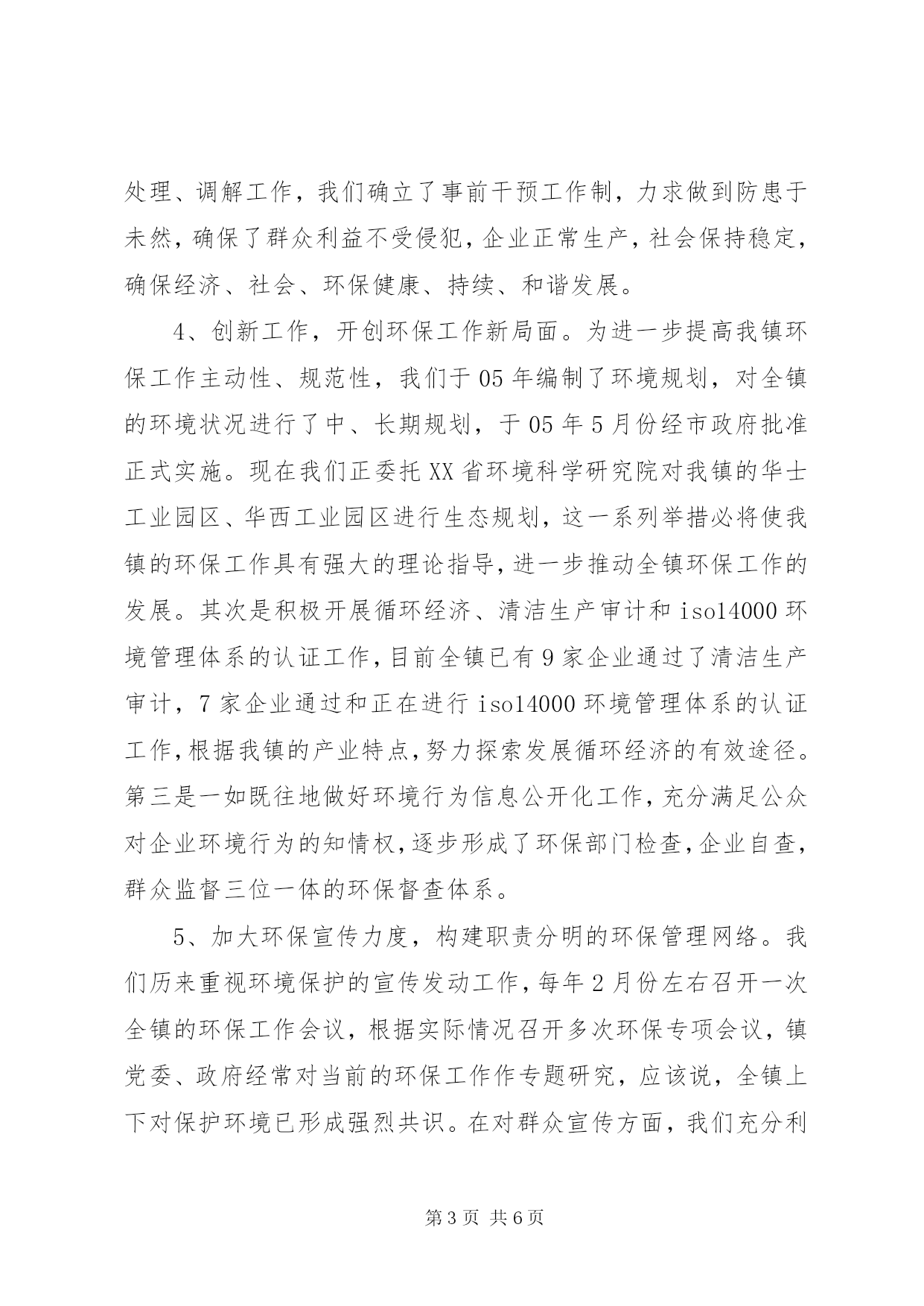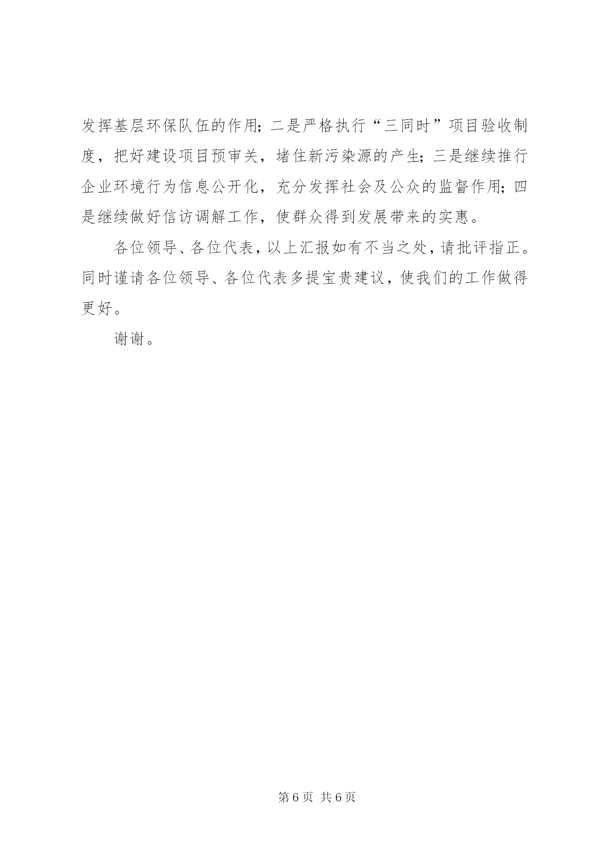 第PAGE\*Arabic\*MERGEFORMAT6页共NUMPAGES\*MERGEFORMAT6页向人大汇报环保工作向人大汇报环保工作各位领导、各位人大代表:今天,我向各位领导及代表简单汇报一下全镇近阶段的环保工作,同时对一直关心和支持环保事业的各位代表表示衷心感谢。镇党委、政府一贯重视环境保护工作,坚持以科学发展观为指导有条不紊地开展各项工作,以改善全镇水环境为抓手,以削减排污口为重点,以带钢酸洗集中处理为突破口,大力度开展环境综合整治,努力改善我镇的人居环境。下面,我讲两个问题。一、工作回顾2、进一步加大环保投入。近两年,我镇的环保投入是前所未有的。05年,全镇的环保投入为4178万元;今年1至5月,污水处理厂排出管道已投入100多万元。一是污水处理厂及管网建设,目前我镇各污水处理厂均运行正常,在此基础上,集中力量进行管网建设,拓宽纳污范围,减少排污口,累计排污管网铺设12公里,其中生活污水主管网1.8公里,减少工业排污口17个。二是龙砂私营小区综合整治,对小区内酸洗槽和排污管网进行重新改造,基本解决跑、冒、滴、漏这个老大难问题,整个改造耗资1000余万元。三是带钢集中酸洗,目前华西民营小区、华丰集中酸洗点已部分投用,24条小、远、散酸槽彻底关停后可减少6条酸槽。四是污泥集中处置,我们利用龙河村废弃石宕集中填埋全镇企业的污泥,在各企业的自觉配合下,全镇的危险固体废物得到了有效控制,解决了污泥二次污染问题。五是机械皂化油集中处理,我镇金属加工企业每年产生大量废皂化液未经有效地处理,乱倒乱排,给环境造成了严重污染,群众反响强烈,现在华西民营集中区投资30多万元建成了专门处理废皂化油的处理设施,解决了带钢行业三大污染中的一大难题。六是废酸的集中处理,现在正在规划废酸集中处理的建设,该项目有望年底前完工投运,这样带钢行业中的三大污染突出问题基本上得以解决,摘掉了带钢行业发展的瓶颈,同时为下一步的再发展囤出了空间。3、加强日常环境管理工作。一是重点对全镇16家印染企业、38家金属表面处理企业、5家化工企业的污染治理设施的运转进行监督检查。二是大力查处违法行为,05年共查处各类环境违法行为51起,06年1—5月份查处19起,其力度是全市范围内最大的。三是切实履行项目预审制,禁办“15小”和新“5小”项目,严把项目入口关,从源头上遏制了新的污染源,为我镇的产业调整作出应用的努力。四是加强“三同时”和限期治理的跟踪管理,加快验收进程,有效遏制污染事故产生。五是做好做实各项专项整治,其中人革废气、0.5吨燃煤小锅炉、化工企业、放射源管理的专项整治工作已初见成效,大大减少了各类扰民信访事件的发生。六是加强了信访调处工作,全力做好污染矛盾的处理、调解工作,我们确立了事前干预工作制,力求做到防患于未然,确保了群众利益不受侵犯,企业正常生产,社会保持稳定,确保经济、社会、环保健康、持续、和谐发展。4、创新工作,开创环保工作新局面。为进一步提高我镇环保工作主动性、规范性,我们于05年编制了环境规划,对全镇的环境状况进行了中、长期规划,于05年5月份经市政府批准正式实施。现在我们正委托XX省环境科学研究院对我镇的华士工业园区、华西工业园区进行生态规划,这一系列举措必将使我镇的环保工作具有强大的理论指导,进一步推动全镇环保工作的发展。其次是积极开展循环经济、清洁生产审计和iso14000环境管理体系的认证工作,目前全镇已有9家企业通过了清洁生产审计,7家企业通过和正在进行iso14000环境管理体系的认证工作,根据我镇的产业特点,努力探索发展循环经济的有效途径。第三是一如既往地做好环境行为信息公开化工作,充分满足公众对企业环境行为的知情权,逐步形成了环保部门检查,企业自查,群众监督三位一体的环保督查体系。5、加大环保宣传力度,构建职责分明的环保管理网络。我们历来重视环境保护的宣传发动工作,每年2月份左右召开一次全镇的环保工作会议,根据实际情况召开多次环保专项会议,镇党委、政府经常对当前的环保工作作专题研究,应该说,全镇上下对保护环境已形成强烈共识。在对群众宣传方面,我们充分利用报刊杂志、电视电台、橱窗横幅等各种宣传平台全方位宣传环保法律法规,尤其是对在校学生环保知识的宣传我们更是不遗余向人大汇报环保工作力,他们是我们环保工作的希望所在。在加大宣传的同时,我们更是加大环保队伍的建设,目前已初步形成从镇到村再到各个企业的完整的环保管理网络,我们每年还对30个行政村和重点企业下达环境保护责任书,进一步细化了考核细则,完善了奖惩办法。在取得成绩的同时,我们更清醒地认识到,我们的工作离镇党委、政府领导,各位代表的要求和人民群众的希望还有很大差距,虽然我们做了许多工作,作出了很大的努力,但环境形势很不乐观,具体存在着以下问题:1、经济