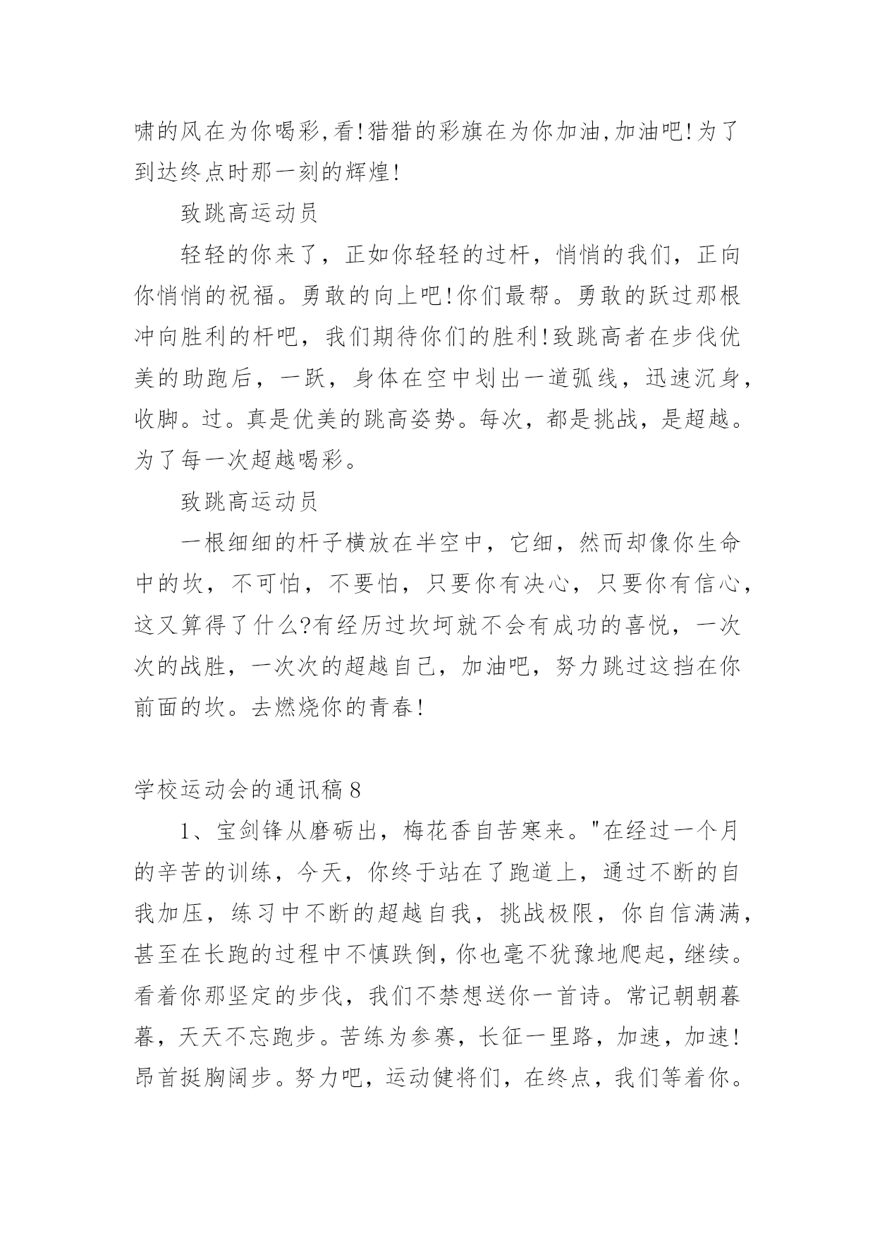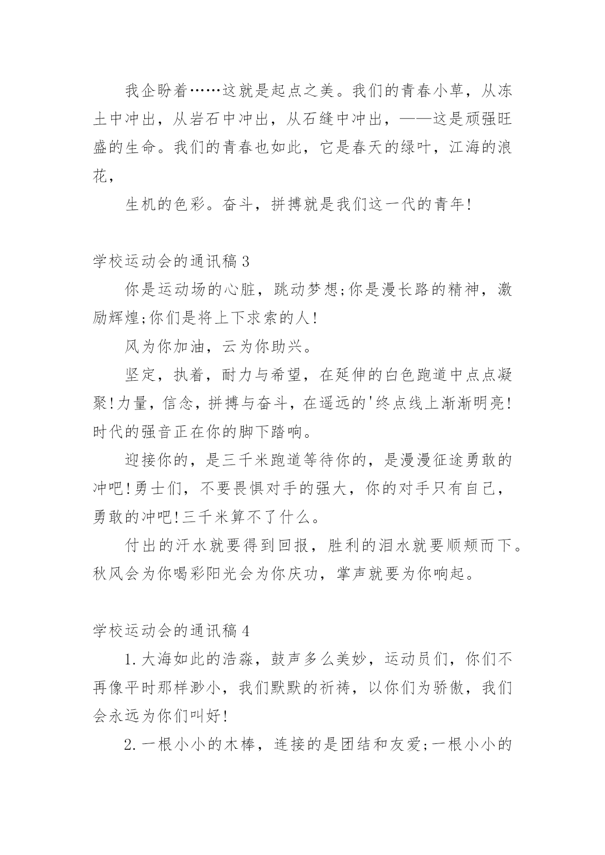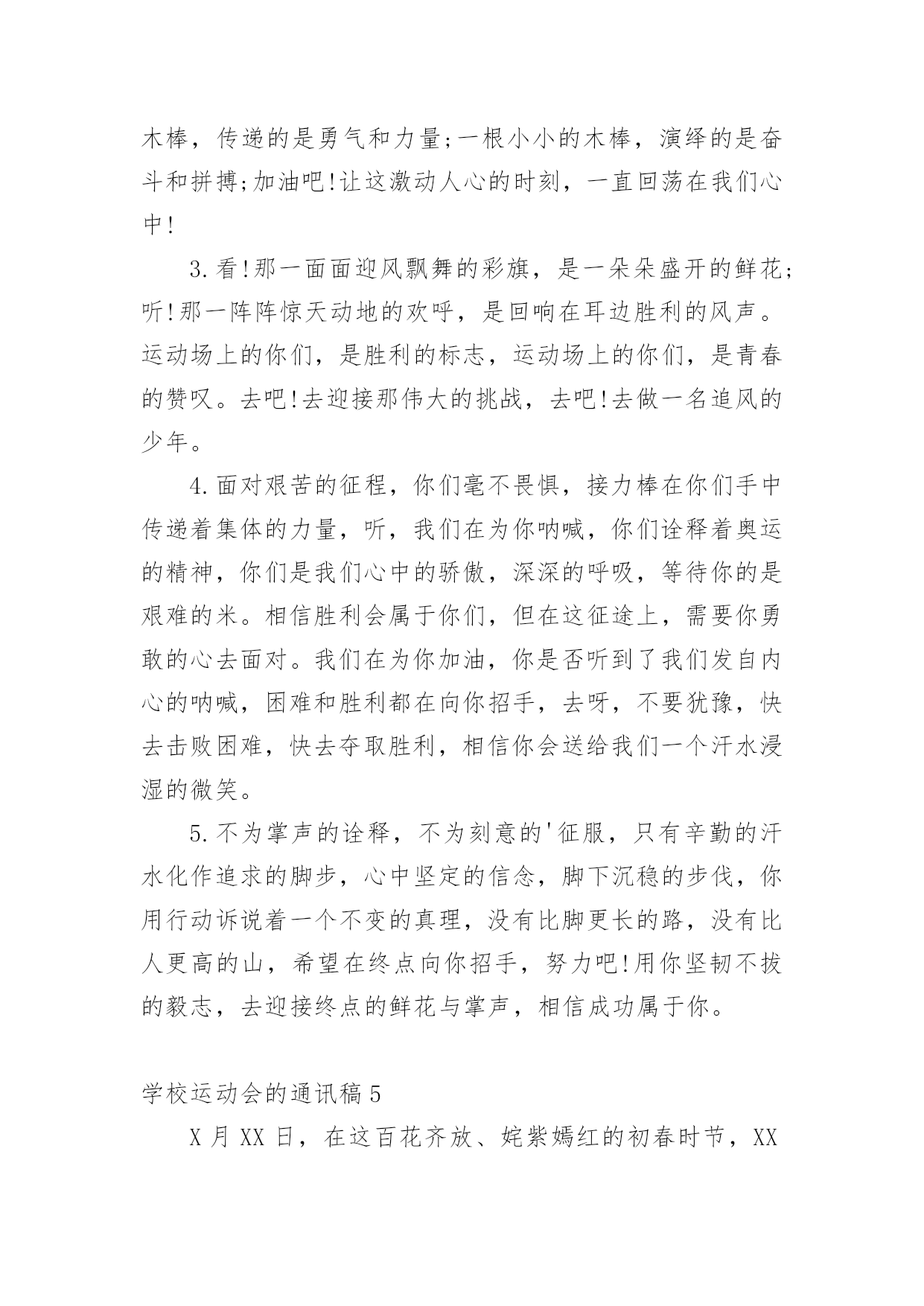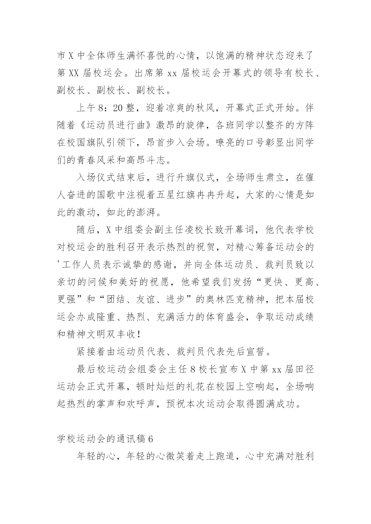 学校运动会的通讯稿相信大家对通讯稿都再熟悉不过了吧,很多情况下我们都会接触到通讯稿,无论是在学校的学生会还是工作单位,有时候写通讯稿是必不可少的。你写通讯稿时总是没有新意?以下是小编为大家收集的学校运动会的通讯稿,希望能够帮助到大家。学校运动会的通讯稿11.有多少次挥泪如雨,伤痛曾添满记忆,只因为始终相信,去拼搏才能胜利。总在鼓舞自己,要成功就得努力。热血在赛场沸腾,巨人在赛场升起。相信自己,你将赢得胜利,创造奇迹,相信自己,梦想在你手中,这是你的天地。当一切过去,你们将是第一。相信自己,你们将超越极限,相信自己,你们将超越自我!2.只有拼搏,才会取得辉煌的成绩;只有播种,才能收获丰硕的果实;只有追求,才能品味真正的人生。金牌和花环从来不是撞树的`兔子,骄傲和自豪,也从来不是天上掉下来的馅饼,只瞄准而不射击的猎手不是好猎手,只呐喊不冲锋的士兵不是好士兵。运动健儿们,加油!无论成功还是失败,只要为之奋斗!3.你是一叶小舟,运动是你的港湾。你是一叶小舟,四肢是你的桅杆。你是一叶小舟,身体是你的风帆。你是一叶小舟,正驶向体育的海洋,让我们同心协力,向体育勇敢出发吧!4.因为你们,xxx班运动员不再劳累,因为你们,使他们疲惫的心得到慰藉,一瓶水,展示着你们无限的关怀,一次次奔跑,展现着你们的风采。有了你们,五班会更强。5.挫折能够毁灭一个人,也能够造就一个人,这只是看你们自己的想法而已。如果遇到挫折只会逃避的人注定会终身失败。只有战胜自己,才能超越别人,只有完善自我,才能挑战人生。运动健儿们,向前冲吧!企管班的每一位同学都在背后默默的支持着你们!6.金秋送爽,丹桂飘香!望京实验学校最后迎来了第二届秋季运动会,我们三(xx)班全体师生感谢学校为我们带给这次锻炼身体和检阅成绩的机会。学校运动会的通讯稿2初升的朝阳给予我们新的希望,在充满火样的热情中,我们迎接一个新的挑战。生命原是一幅未动笔的画卷,但有志者却能描绘出绚丽多姿的动人画卷,我们应当充满希望的迎接挑战,成功的精彩毕竟需要自己的双手去获得,加油吧!为了创造不平凡的精彩,去傲视任何一个挑战,因为我们,是最强的`。起点之美当运动员站到起点那一瞬间,太阳的光辉顿时洒到他的身上,一个伟大光辉的身影屹立在北方。看着他那凝聚的眼神,充满着胜利的信念,那一刻时间仿佛凝固,一切静静地,只是,在人们心中有一个永远不可磨灭的印象。我企盼着……这就是起点之美。我们的青春小草,从冻土中冲出,从岩石中冲出,从石缝中冲出,——这是顽强旺盛的生命。我们的青春也如此,它是春天的绿叶,江海的浪花,生机的色彩。奋斗,拼搏就是我们这一代的青年!学校运动会的通讯稿3你是运动场的心脏,跳动梦想;你是漫长路的精神,激励辉煌;你们是将上下求索的人!风为你加油,云为你助兴。坚定,执着,耐力与希望,在延伸的白色跑道中点点凝聚!力量,信念,拼搏与奋斗,在遥远的'终点线上渐渐明亮!时代的强音正在你的脚下踏响。迎接你的,是三千米跑道等待你的,是漫漫征途勇敢的冲吧!勇士们,不要畏惧对手的强大,你的对手只有自己,勇敢的冲吧!三千米算不了什么。付出的汗水就要得到回报,胜利的泪水就要顺颊而下。秋风会为你喝彩阳光会为你庆功,掌声就要为你响起。学校运动会的通讯稿41.大海如此的浩淼,鼓声多么美妙,运动员们,你们不再像平时那样渺小,我们默默的祈祷,以你们为骄傲,我们会永远为你们叫好!2.一根小小的木棒,连接的是团结和友爱;一根小小的木棒,传递的是勇气和力量;一根小小的木棒,演绎的是奋斗和拼搏;加油吧!让这激动人心的时刻,一直回荡在我们心中!3.看!那一面面迎风飘舞的彩旗,是一朵朵盛开的鲜花;听!那一阵阵惊天动地的欢呼,是回响在耳边胜利的风声。运动场上的你们,是胜利的标志,运动场上的你们,是青春的赞叹。去吧!去迎接那伟大的挑战,去吧!去做一名追风的少年。4.面对艰苦的征程,你们毫不畏惧,接力棒在你们手中传递着集体的力量,听,我们在为你呐喊,你们诠释着奥运的精神,你们是我们心中的骄傲,深深的呼吸,等待你的是艰难的米。相信胜利会属于你们,但在这征途上,需要你勇敢的心去面对。我们在为你加油,你是否听到了我们发自内心的呐喊,困难和胜利都在向你招手,去呀,不要犹豫,快去击败困难,快去夺取胜利,相信你会送给我们一个汗水浸湿的微笑。5.不为掌声的诠释,不为刻意的'征服,只有辛勤的汗水化作追求的脚步,心中坚定的信念,脚下沉稳的步伐,你用行动诉说着一个不变的真理,没有比脚更长的路,没有比人更高的山,希望在终点向你招手,努力吧!用你坚韧不拔的毅志,去迎接终点的鲜花与掌声,相信成功属于你。学校运动会的通讯稿5X月XX日,在这百花齐放、姹紫嫣红的初春时节,XX市X中全体师生满怀喜悦的心情,以饱满的精神状态迎来了第XX届校运会。出席第xx届校运会开幕式的领导有校长、副校长、