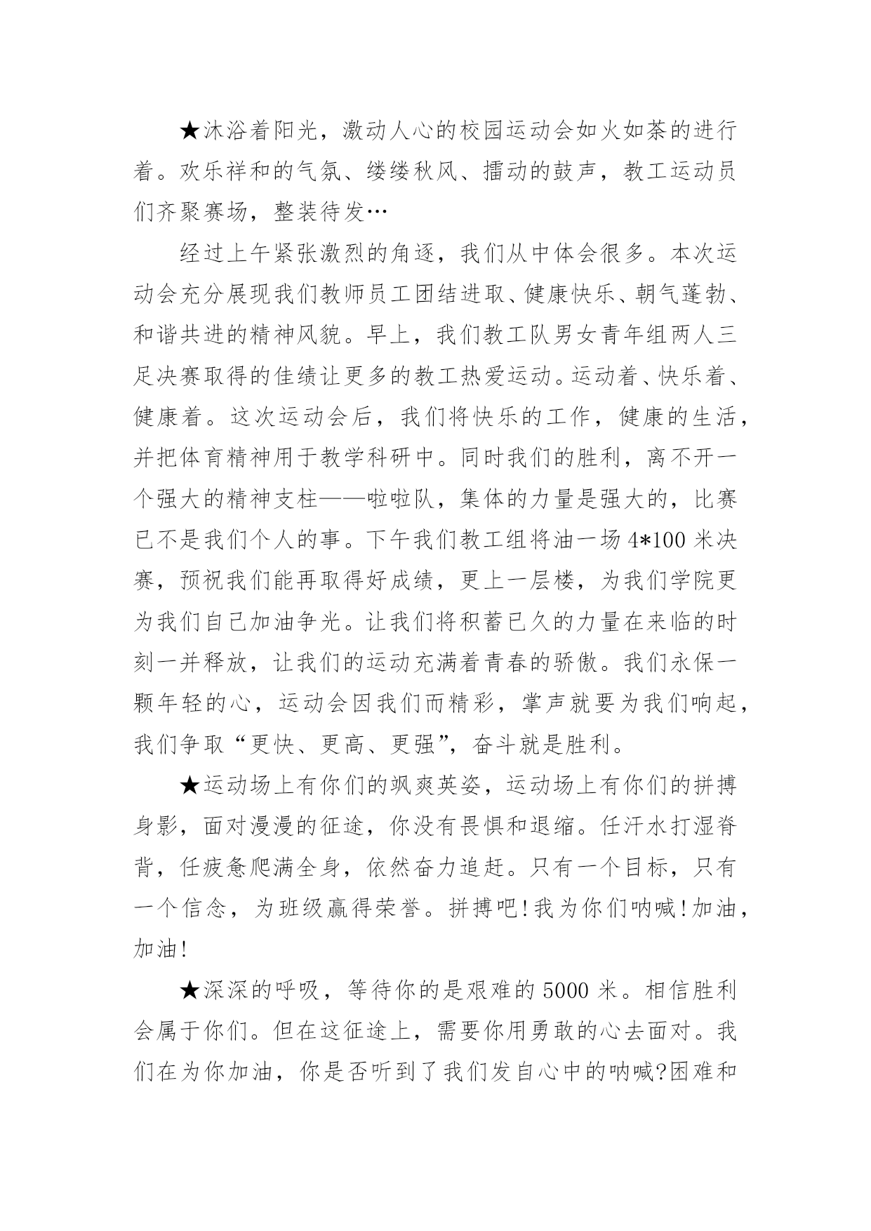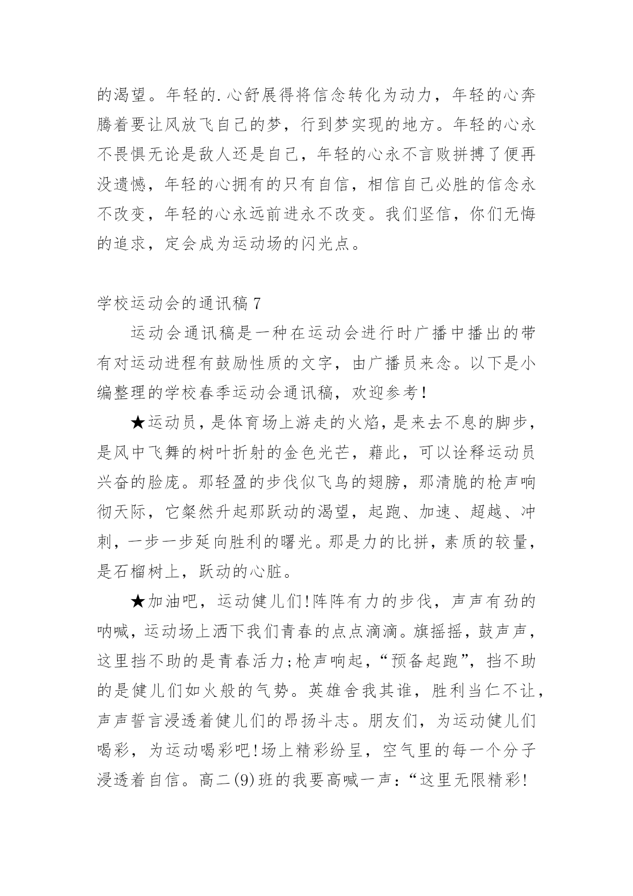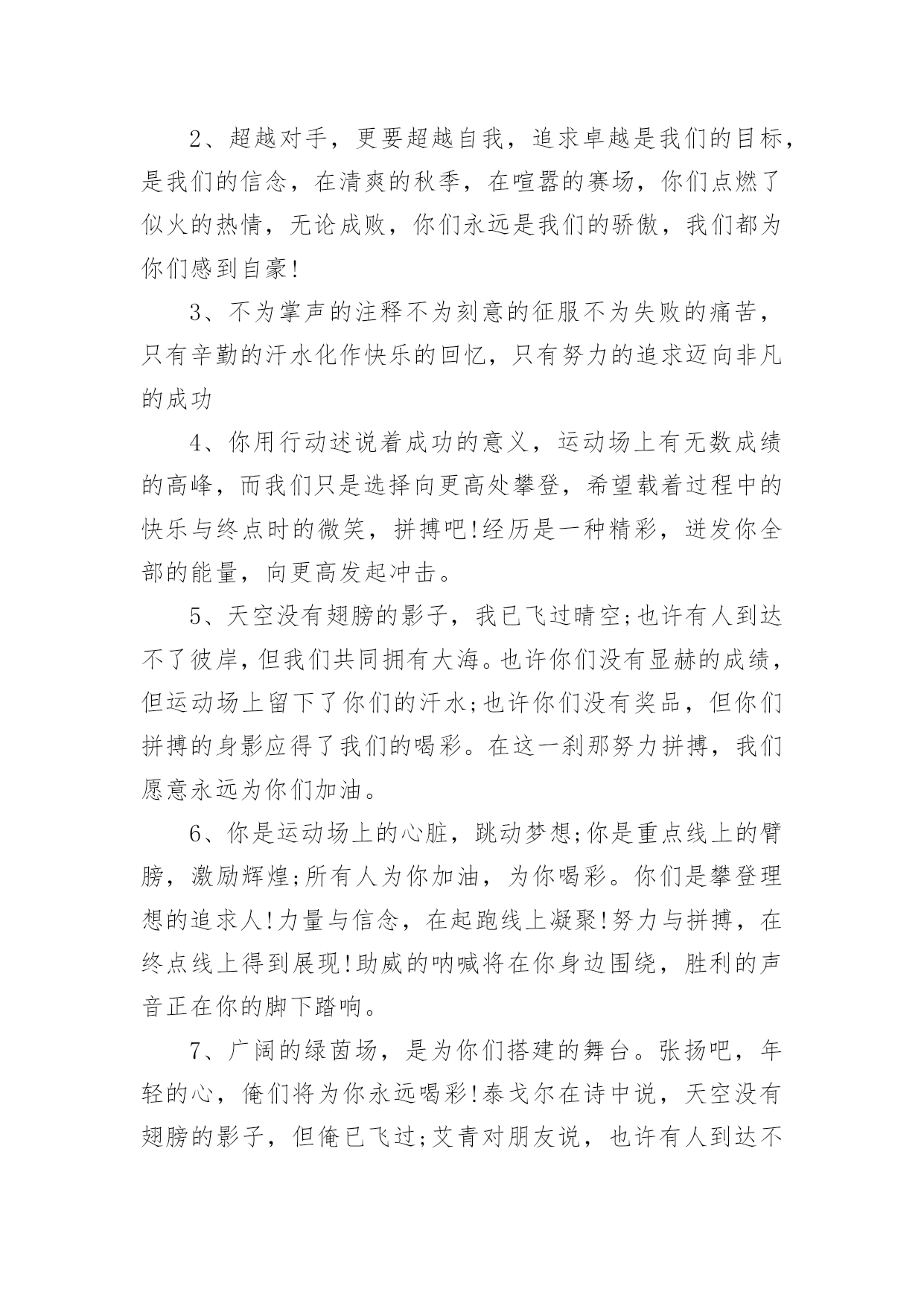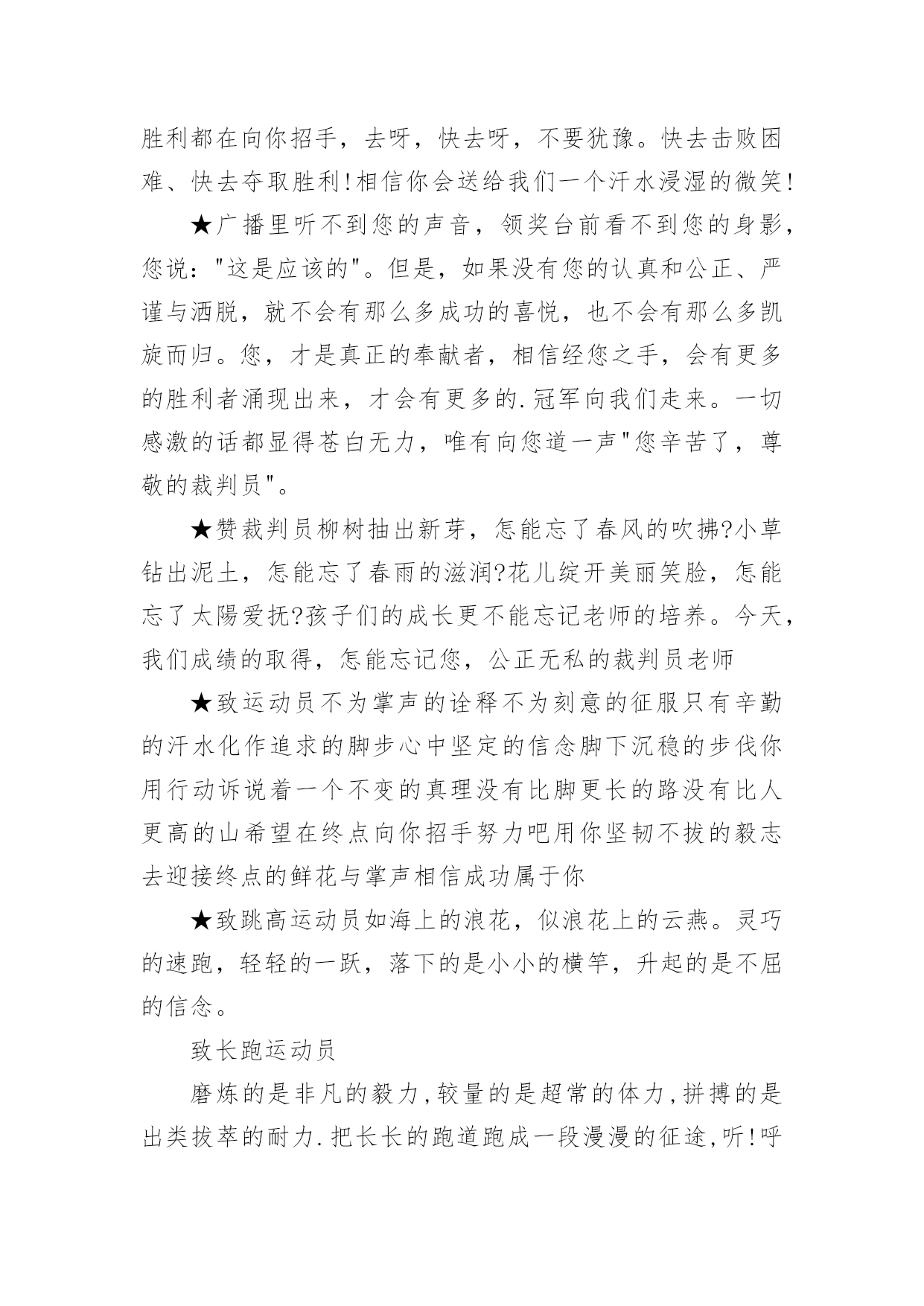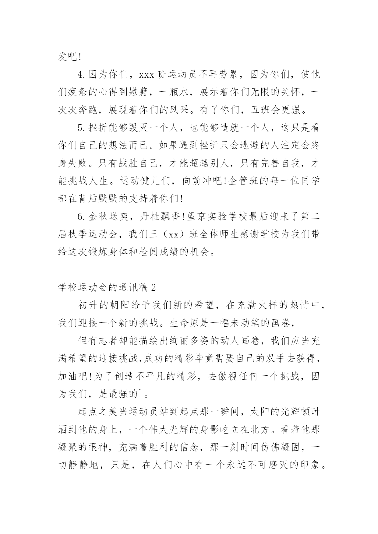 学校运动会的通讯稿相信大家对通讯稿都再熟悉不过了吧,很多情况下我们都会接触到通讯稿,无论是在学校的学生会还是工作单位,有时候写通讯稿是必不可少的。你写通讯稿时总是没有新意?以下是小编为大家收集的学校运动会的通讯稿,希望能够帮助到大家。学校运动会的通讯稿11.有多少次挥泪如雨,伤痛曾添满记忆,只因为始终相信,去拼搏才能胜利。总在鼓舞自己,要成功就得努力。热血在赛场沸腾,巨人在赛场升起。相信自己,你将赢得胜利,创造奇迹,相信自己,梦想在你手中,这是你的天地。当一切过去,你们将是第一。相信自己,你们将超越极限,相信自己,你们将超越自我!2.只有拼搏,才会取得辉煌的成绩;只有播种,才能收获丰硕的果实;只有追求,才能品味真正的人生。金牌和花环从来不是撞树的`兔子,骄傲和自豪,也从来不是天上掉下来的馅饼,只瞄准而不射击的猎手不是好猎手,只呐喊不冲锋的士兵不是好士兵。运动健儿们,加油!无论成功还是失败,只要为之奋斗!3.你是一叶小舟,运动是你的港湾。你是一叶小舟,四肢是你的桅杆。你是一叶小舟,身体是你的风帆。你是一叶小舟,正驶向体育的海洋,让我们同心协力,向体育勇敢出发吧!4.因为你们,xxx班运动员不再劳累,因为你们,使他们疲惫的心得到慰藉,一瓶水,展示着你们无限的关怀,一次次奔跑,展现着你们的风采。有了你们,五班会更强。5.挫折能够毁灭一个人,也能够造就一个人,这只是看你们自己的想法而已。如果遇到挫折只会逃避的人注定会终身失败。只有战胜自己,才能超越别人,只有完善自我,才能挑战人生。运动健儿们,向前冲吧!企管班的每一位同学都在背后默默的支持着你们!6.金秋送爽,丹桂飘香!望京实验学校最后迎来了第二届秋季运动会,我们三(xx)班全体师生感谢学校为我们带给这次锻炼身体和检阅成绩的机会。学校运动会的通讯稿2初升的朝阳给予我们新的希望,在充满火样的热情中,我们迎接一个新的挑战。生命原是一幅未动笔的画卷,但有志者却能描绘出绚丽多姿的动人画卷,我们应当充满希望的迎接挑战,成功的精彩毕竟需要自己的双手去获得,加油吧!为了创造不平凡的精彩,去傲视任何一个挑战,因为我们,是最强的`。起点之美当运动员站到起点那一瞬间,太阳的光辉顿时洒到他的身上,一个伟大光辉的身影屹立在北方。看着他那凝聚的眼神,充满着胜利的信念,那一刻时间仿佛凝固,一切静静地,只是,在人们心中有一个永远不可磨灭的印象。我企盼着……这就是起点之美。我们的青春小草,从冻土中冲出,从岩石中冲出,从石缝中冲出,——这是顽强旺盛的生命。我们的青春也如此,它是春天的绿叶,江海的浪花,生机的色彩。奋斗,拼搏就是我们这一代的青年!学校运动会的通讯稿3你是运动场的心脏,跳动梦想;你是漫长路的精神,激励辉煌;你们是将上下求索的人!风为你加油,云为你助兴。坚定,执着,耐力与希望,在延伸的白色跑道中点点凝聚!力量,信念,拼搏与奋斗,在遥远的'终点线上渐渐明亮!时代的强音正在你的脚下踏响。迎接你的,是三千米跑道等待你的,是漫漫征途勇敢的冲吧!勇士们,不要畏惧对手的强大,你的对手只有自己,勇敢的冲吧!三千米算不了什么。付出的汗水就要得到回报,胜利的泪水就要顺颊而下。秋风会为你喝彩阳光会为你庆功,掌声就要为你响起。学校运动会的通讯稿41.大海如此的浩淼,鼓声多么美妙,运动员们,你们不再像平时那样渺小,我们默默的祈祷,以你们为骄傲,我们会永远为你们叫好!2.一根小小的木棒,连接的是团结和友爱;一根小小的木棒,传递的是勇气和力量;一根小小的木棒,演绎的是奋斗和拼搏;加油吧!让这激动人心的时刻,一直回荡在我们心中!3.看!那一面面迎风飘舞的彩旗,是一朵朵盛开的鲜花;听!那一阵阵惊天动地的欢呼,是回响在耳边胜利的风声。运动场上的你们,是胜利的标志,运动场上的你们,是青春的赞叹。去吧!去迎接那伟大的挑战,去吧!去做一名追风的少年。4.面对艰苦的征程,你们毫不畏惧,接力棒在你们手中传递着集体的力量,听,我们在为你呐喊,你们诠释着奥运的精神,你们是我们心中的骄傲,深深的呼吸,等待你的是艰难的米。相信胜利会属于你们,但在这征途上,需要你勇敢的心去面对。我们在为你加油,你是否听到了我们发自内心的呐喊,困难和胜利都在向你招手,去呀,不要犹豫,快去击败困难,快去夺取胜利,相信你会送给我们一个汗水浸湿的微笑。5.不为掌声的诠释,不为刻意的'征服,只有辛勤的汗水化作追求的脚步,心中坚定的信念,脚下沉稳的步伐,你用行动诉说着一个不变的真理,没有比脚更长的路,没有比人更高的山,希望在终点向你招手,努力吧!用你坚韧不拔的毅志,去迎接终点的鲜花与掌声,相信成功属于你。学校运动会的通讯稿5X月XX日,在这百花齐放、姹紫嫣红的初春时节,XX市X中全体师生满怀喜悦的心情,以饱满的精神状态迎来了第XX届校运会。出席第xx届校运会开幕式的领导有校长、副校长、