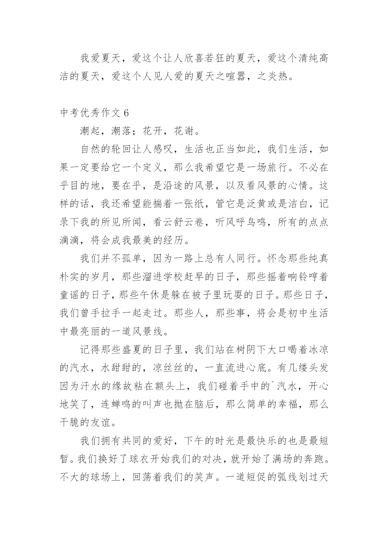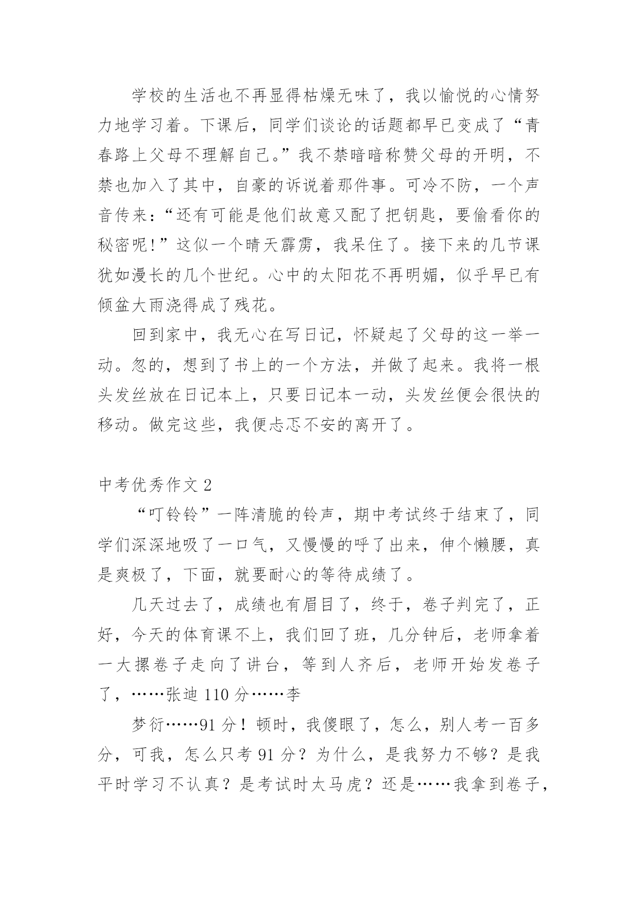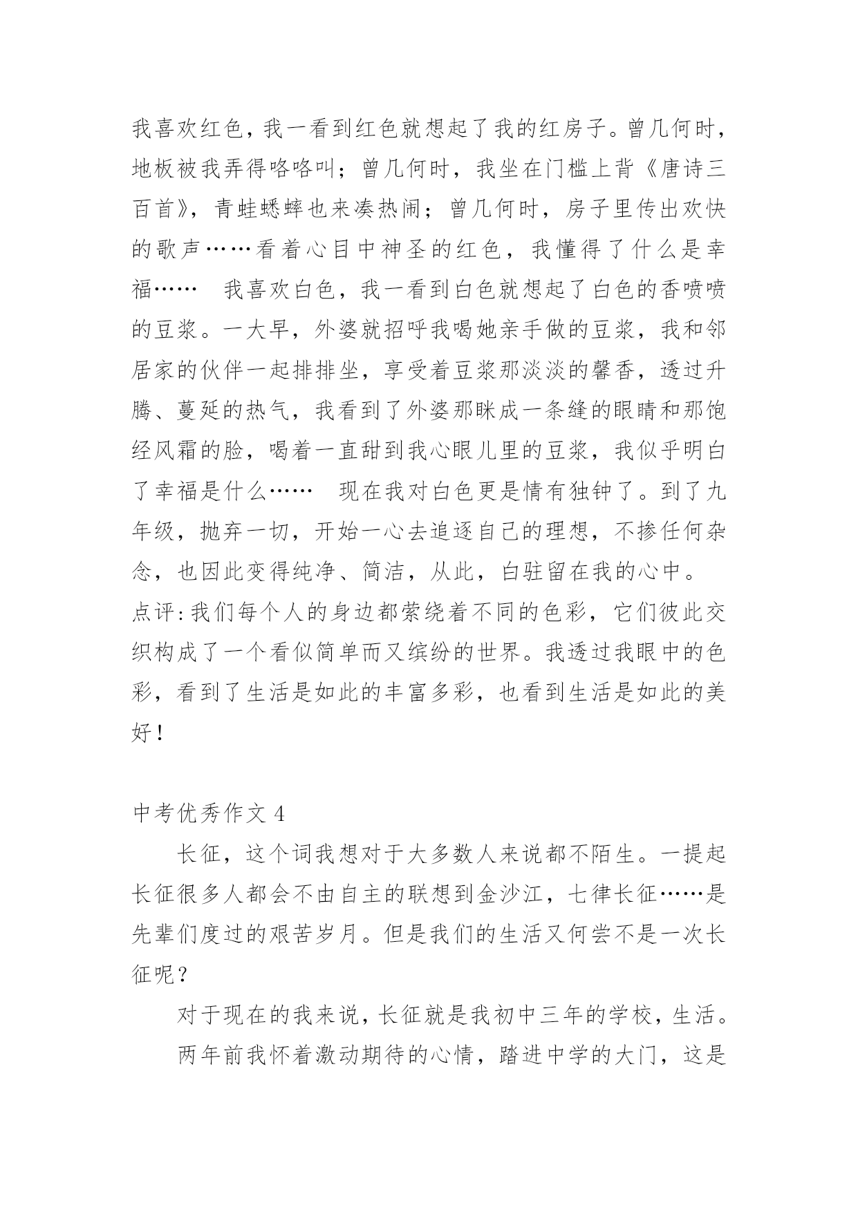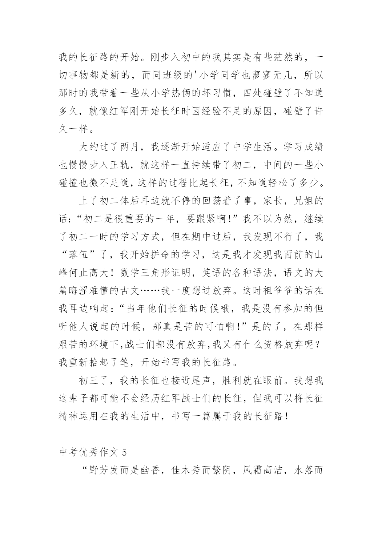 中考优秀作文中考优秀作文(精选15篇)无论在学习、工作或是生活中,大家都写过作文吧,写作文是培养人们的观察力、联想力、想象力、思考力和记忆力的重要手段。那么一般作文是怎么写的呢?以下是小编为大家收集的中考优秀作文,欢迎大家借鉴与参考,希望对大家有所帮助。中考优秀作文1青春的路上,总会有痛。但一路上,总会有芬芳的花朵,是它们,是青春的这一路不再烦恼。它们,一直默默的鼓励着你,爱护着你。——题记那年,我的生日。那天的我,心里像开着一朵芬芳的太阳花:父母把我带到了一个灰白的书柜前,对我说:“喏,这是我们送给你的生日礼物,你长大了,心里应该有了不少的小秘密,只有有倾诉,你才会成熟懂事。这个书柜,可以倾听你的.一切烦恼与快乐,它会成为你的好朋友。”黄昏的余光折射到了那串钥匙上,开出了一朵朵金色的太阳花。那天,我由衷的笑了。从此,书柜真的成为了我的好朋友,我见我的烦恼与欢乐一股脑的都塞了过去。心中的那棵亲情的太阳花,也在不断的吸取阳光与营养,不停地生长着。学校的生活也不再显得枯燥无味了,我以愉悦的心情努力地学习着。下课后,同学们谈论的话题都早已变成了“青春路上父母不理解自己。”我不禁暗暗称赞父母的开明,不禁也加入了其中,自豪的诉说着那件事。可冷不防,一个声音传来:“还有可能是他们故意又配了把钥匙,要偷看你的秘密呢!”这似一个晴天霹雳,我呆住了。接下来的几节课犹如漫长的几个世纪。心中的太阳花不再明媚,似乎早已有倾盆大雨浇得成了残花。回到家中,我无心在写日记,怀疑起了父母的这一举一动。忽的,想到了书上的一个方法,并做了起来。我将一根头发丝放在日记本上,只要日记本一动,头发丝便会很快的移动。做完这些,我便忐忑不安的离开了。中考优秀作文2“叮铃铃”一阵清脆的铃声,期中考试终于结束了,同学们深深地吸了一口气,又慢慢的呼了出来,伸个懒腰,真是爽极了,下面,就要耐心的等待成绩了。几天过去了,成绩也有眉目了,终于,卷子判完了,正好,今天的体育课不上,我们回了班,几分钟后,老师拿着一大摞卷子走向了讲台,等到人齐后,老师开始发卷子了,……张迪110分……李梦衍……91分!顿时,我傻眼了,怎么,别人考一百多分,可我,怎么只考91分?为什么,是我努力不够?是我平时学习不认真?是考试时太马虎?还是……我拿到卷子,看了看,基础没减几分,只是作文,把记事的看成写景的了……唉~我真应该看清要求在写,不能再这样马虎了。当时我的心情谁会知道呢?又过了几天,成绩表列出来了,我的心情既激动又害怕,自己想知道成绩,却怕考得不好被老师指责,受到同学们的鄙视,最后,经过极其复杂的心理,终于,我带着沉重的步子走向办公室,一看,啊!怎么,总分才493?怎么这么少?这不可能是我的.水平,一看卷子,不该丢得分丢了学多,算起来至少有100分,加上这点分,我就能考600多了,临走时,老师叫住我,对我说:“梦衍,你要记住,‘莫等闲,白了少年头,空悲切’。”我拿着试卷走出办公室,老师的话仿佛是一把小锤子敲打着我的心,不断地在我耳边回荡,我手中拿着这几张卷子,仿佛有千斤重,步子一顿一顿的回了教室。中考优秀作文3我眼中的色彩虽然各种各样,但都绚丽无比。它们构成了我丰富多彩的生活。我喜欢绿色,一看到绿色就会想起我的乐园。我的乐园是我家后园的一片菜地,地里种满一畦畦碧绿的菠菜、油菜……地头种着一棵棵绿荫浓浓的.桑树和槐树,每当节假日,便与邻居的孩子们追逐打闹;每当烦恼来临,我便来到菜地散步,与那些绿油油的蔬菜谈心,此时,那满目的绿色啊,就像一把把绿色的巨伞,遮住了夏日的骄阳,挡住了冬日的寒风……假如你问我什么是幸福,此时的心境便是最好的回答。我喜欢红色,我一看到红色就想起了我的红房子。曾几何时,地板被我弄得咯咯叫;曾几何时,我坐在门槛上背《唐诗三百首》,青蛙蟋蟀也来凑热闹;曾几何时,房子里传出欢快的歌声……看着心目中神圣的红色,我懂得了什么是幸福……我喜欢白色,我一看到白色就想起了白色的香喷喷的豆浆。一大早,外婆就招呼我喝她亲手做的豆浆,我和邻居家的伙伴一起排排坐,享受着豆浆那淡淡的馨香,透过升腾、蔓延的热气,我看到了外婆那眯成一条缝的眼睛和那饱经风霜的脸,喝着一直甜到我心眼儿里的豆浆,我似乎明白了幸福是什么……现在我对白色更是情有独钟了。到了九年级,抛弃一切,开始一心去追逐自己的理想,不掺任何杂念,也因此变得纯净、简洁,从此,白驻留在我的心中。点评:我们每个人的身边都萦绕着不同的色彩,它们彼此交织构成了一个看似简单而又缤纷的世界。我透过我眼中的色彩,看到了生活是如此的丰富多彩,也看到生活是如此的美好!中考优秀作文4长征,这个词我想对于大多数人来说都不陌生。一提起长征很多人都会不由自主的联想到金沙江,七律长征……是先辈们度过的艰苦岁月。但是我们的生活又何尝不是一次长征呢?对于现在的我来说,长征就是我初中