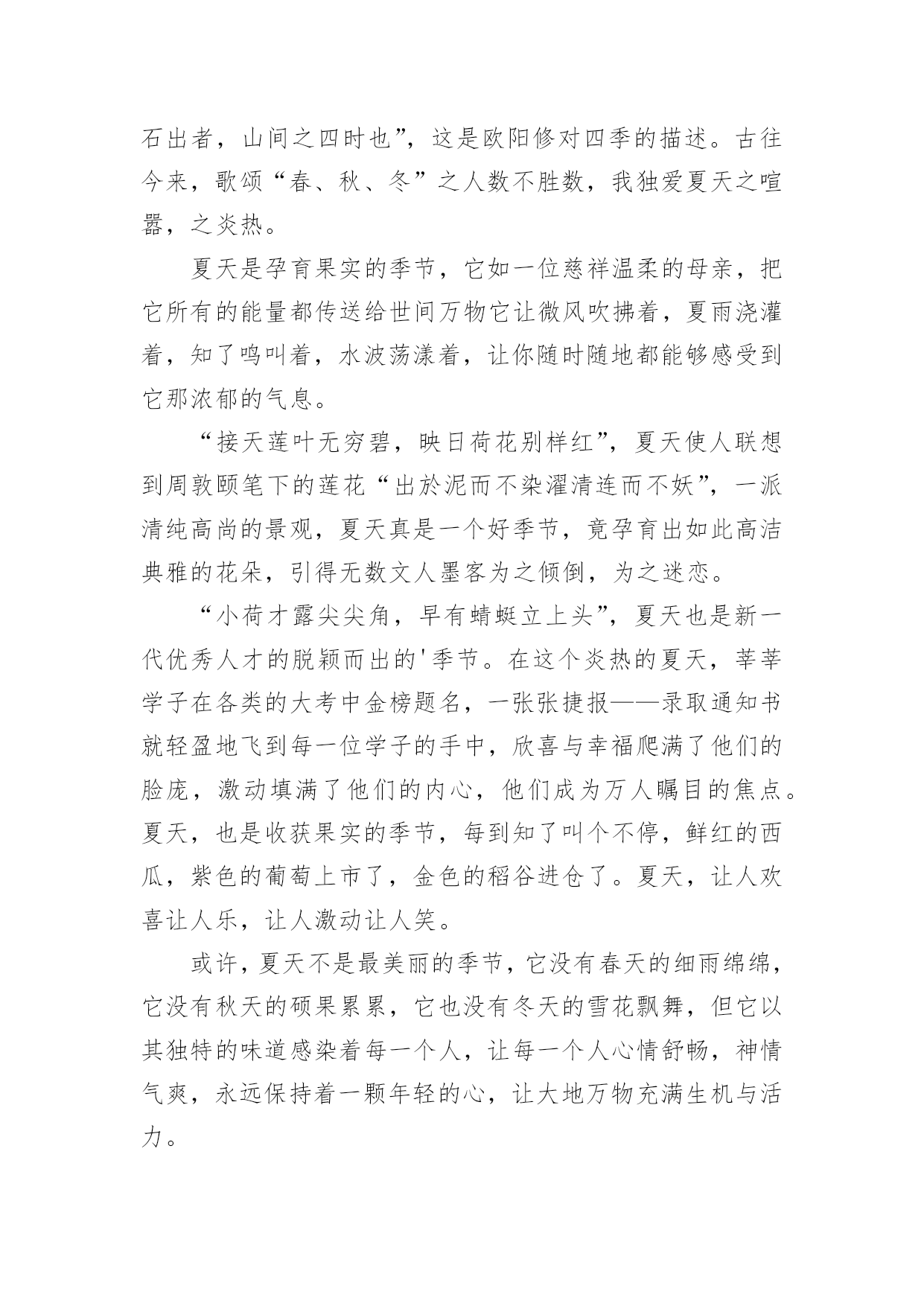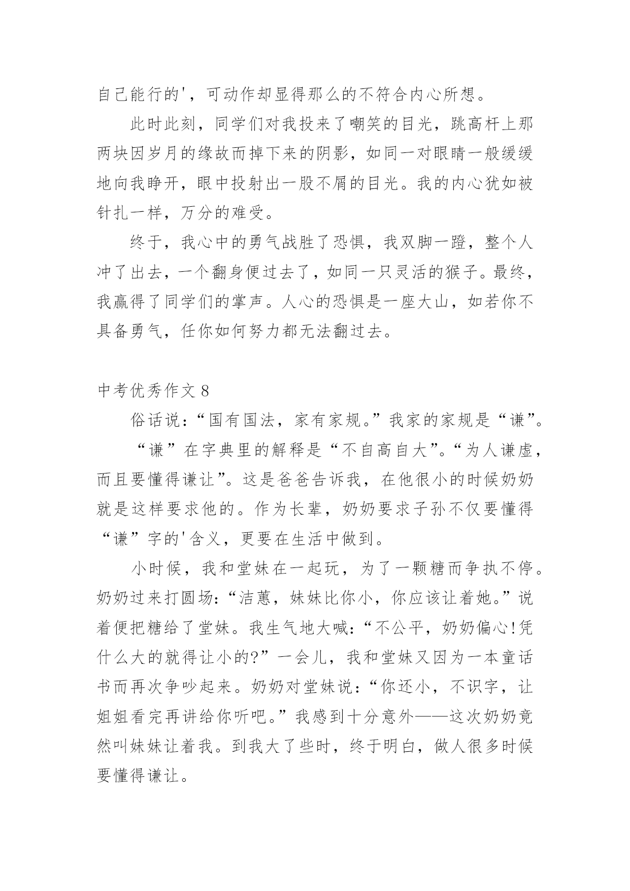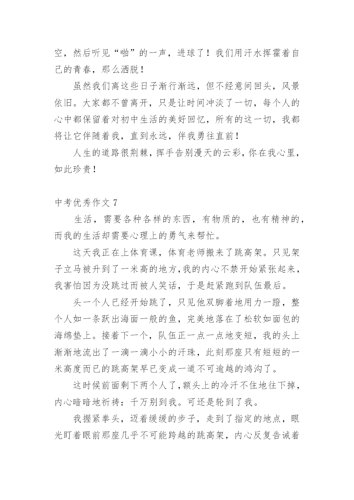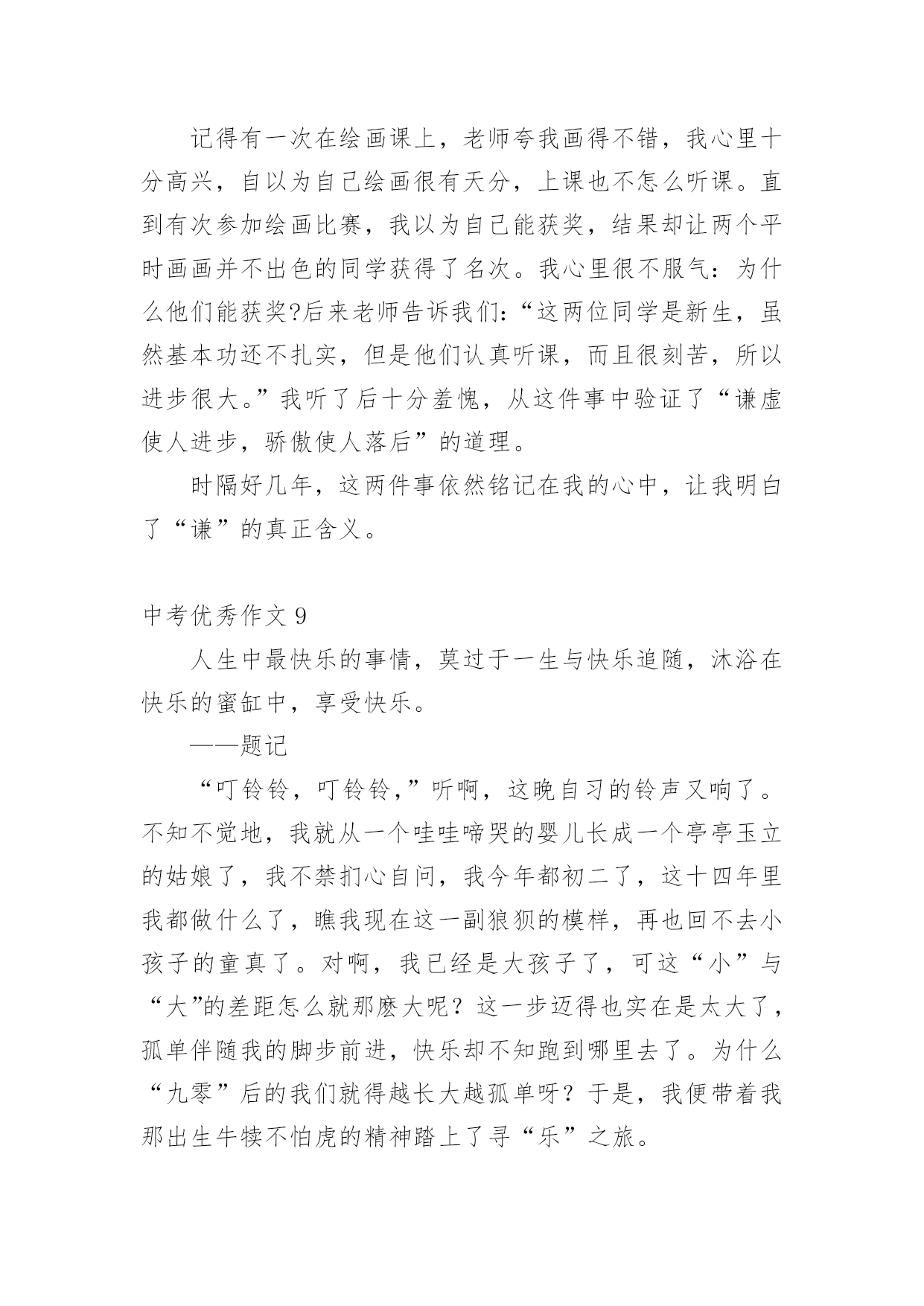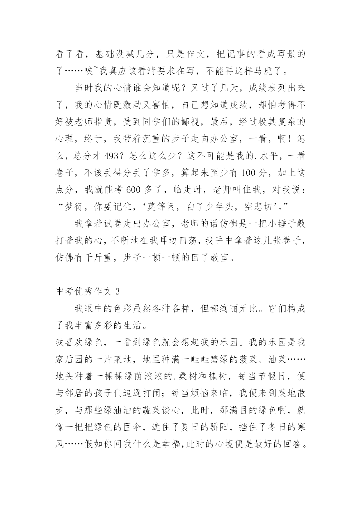 中考优秀作文中考优秀作文(精选15篇)无论在学习、工作或是生活中,大家都写过作文吧,写作文是培养人们的观察力、联想力、想象力、思考力和记忆力的重要手段。那么一般作文是怎么写的呢?以下是小编为大家收集的中考优秀作文,欢迎大家借鉴与参考,希望对大家有所帮助。中考优秀作文1青春的路上,总会有痛。但一路上,总会有芬芳的花朵,是它们,是青春的这一路不再烦恼。它们,一直默默的鼓励着你,爱护着你。——题记那年,我的生日。那天的我,心里像开着一朵芬芳的太阳花:父母把我带到了一个灰白的书柜前,对我说:“喏,这是我们送给你的生日礼物,你长大了,心里应该有了不少的小秘密,只有有倾诉,你才会成熟懂事。这个书柜,可以倾听你的.一切烦恼与快乐,它会成为你的好朋友。”黄昏的余光折射到了那串钥匙上,开出了一朵朵金色的太阳花。那天,我由衷的笑了。从此,书柜真的成为了我的好朋友,我见我的烦恼与欢乐一股脑的都塞了过去。心中的那棵亲情的太阳花,也在不断的吸取阳光与营养,不停地生长着。学校的生活也不再显得枯燥无味了,我以愉悦的心情努力地学习着。下课后,同学们谈论的话题都早已变成了“青春路上父母不理解自己。”我不禁暗暗称赞父母的开明,不禁也加入了其中,自豪的诉说着那件事。可冷不防,一个声音传来:“还有可能是他们故意又配了把钥匙,要偷看你的秘密呢!”这似一个晴天霹雳,我呆住了。接下来的几节课犹如漫长的几个世纪。心中的太阳花不再明媚,似乎早已有倾盆大雨浇得成了残花。回到家中,我无心在写日记,怀疑起了父母的这一举一动。忽的,想到了书上的一个方法,并做了起来。我将一根头发丝放在日记本上,只要日记本一动,头发丝便会很快的移动。做完这些,我便忐忑不安的离开了。中考优秀作文2“叮铃铃”一阵清脆的铃声,期中考试终于结束了,同学们深深地吸了一口气,又慢慢的呼了出来,伸个懒腰,真是爽极了,下面,就要耐心的等待成绩了。几天过去了,成绩也有眉目了,终于,卷子判完了,正好,今天的体育课不上,我们回了班,几分钟后,老师拿着一大摞卷子走向了讲台,等到人齐后,老师开始发卷子了,……张迪110分……李梦衍……91分!顿时,我傻眼了,怎么,别人考一百多分,可我,怎么只考91分?为什么,是我努力不够?是我平时学习不认真?是考试时太马虎?还是……我拿到卷子,看了看,基础没减几分,只是作文,把记事的看成写景的了……唉~我真应该看清要求在写,不能再这样马虎了。当时我的心情谁会知道呢?又过了几天,成绩表列出来了,我的心情既激动又害怕,自己想知道成绩,却怕考得不好被老师指责,受到同学们的鄙视,最后,经过极其复杂的心理,终于,我带着沉重的步子走向办公室,一看,啊!怎么,总分才493?怎么这么少?这不可能是我的.水平,一看卷子,不该丢得分丢了学多,算起来至少有100分,加上这点分,我就能考600多了,临走时,老师叫住我,对我说:“梦衍,你要记住,‘莫等闲,白了少年头,空悲切’。”我拿着试卷走出办公室,老师的话仿佛是一把小锤子敲打着我的心,不断地在我耳边回荡,我手中拿着这几张卷子,仿佛有千斤重,步子一顿一顿的回了教室。中考优秀作文3我眼中的色彩虽然各种各样,但都绚丽无比。它们构成了我丰富多彩的生活。我喜欢绿色,一看到绿色就会想起我的乐园。我的乐园是我家后园的一片菜地,地里种满一畦畦碧绿的菠菜、油菜……地头种着一棵棵绿荫浓浓的.桑树和槐树,每当节假日,便与邻居的孩子们追逐打闹;每当烦恼来临,我便来到菜地散步,与那些绿油油的蔬菜谈心,此时,那满目的绿色啊,就像一把把绿色的巨伞,遮住了夏日的骄阳,挡住了冬日的寒风……假如你问我什么是幸福,此时的心境便是最好的回答。我喜欢红色,我一看到红色就想起了我的红房子。曾几何时,地板被我弄得咯咯叫;曾几何时,我坐在门槛上背《唐诗三百首》,青蛙蟋蟀也来凑热闹;曾几何时,房子里传出欢快的歌声……看着心目中神圣的红色,我懂得了什么是幸福……我喜欢白色,我一看到白色就想起了白色的香喷喷的豆浆。一大早,外婆就招呼我喝她亲手做的豆浆,我和邻居家的伙伴一起排排坐,享受着豆浆那淡淡的馨香,透过升腾、蔓延的热气,我看到了外婆那眯成一条缝的眼睛和那饱经风霜的脸,喝着一直甜到我心眼儿里的豆浆,我似乎明白了幸福是什么……现在我对白色更是情有独钟了。到了九年级,抛弃一切,开始一心去追逐自己的理想,不掺任何杂念,也因此变得纯净、简洁,从此,白驻留在我的心中。点评:我们每个人的身边都萦绕着不同的色彩,它们彼此交织构成了一个看似简单而又缤纷的世界。我透过我眼中的色彩,看到了生活是如此的丰富多彩,也看到生活是如此的美好!中考优秀作文4长征,这个词我想对于大多数人来说都不陌生。一提起长征很多人都会不由自主的联想到金沙江,七律长征……是先辈们度过的艰苦岁月。但是我们的生活又何尝不是一次长征呢?对于现在的我来说,长征就是我初中