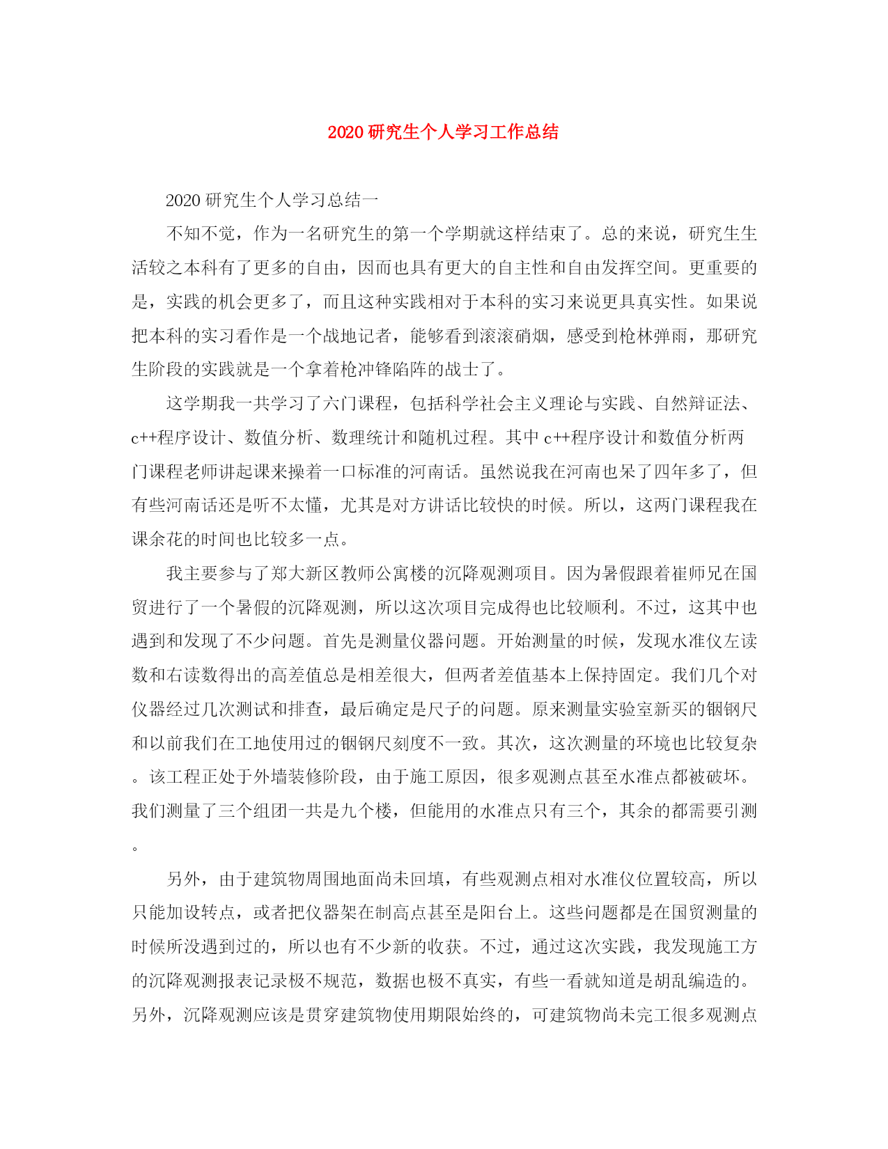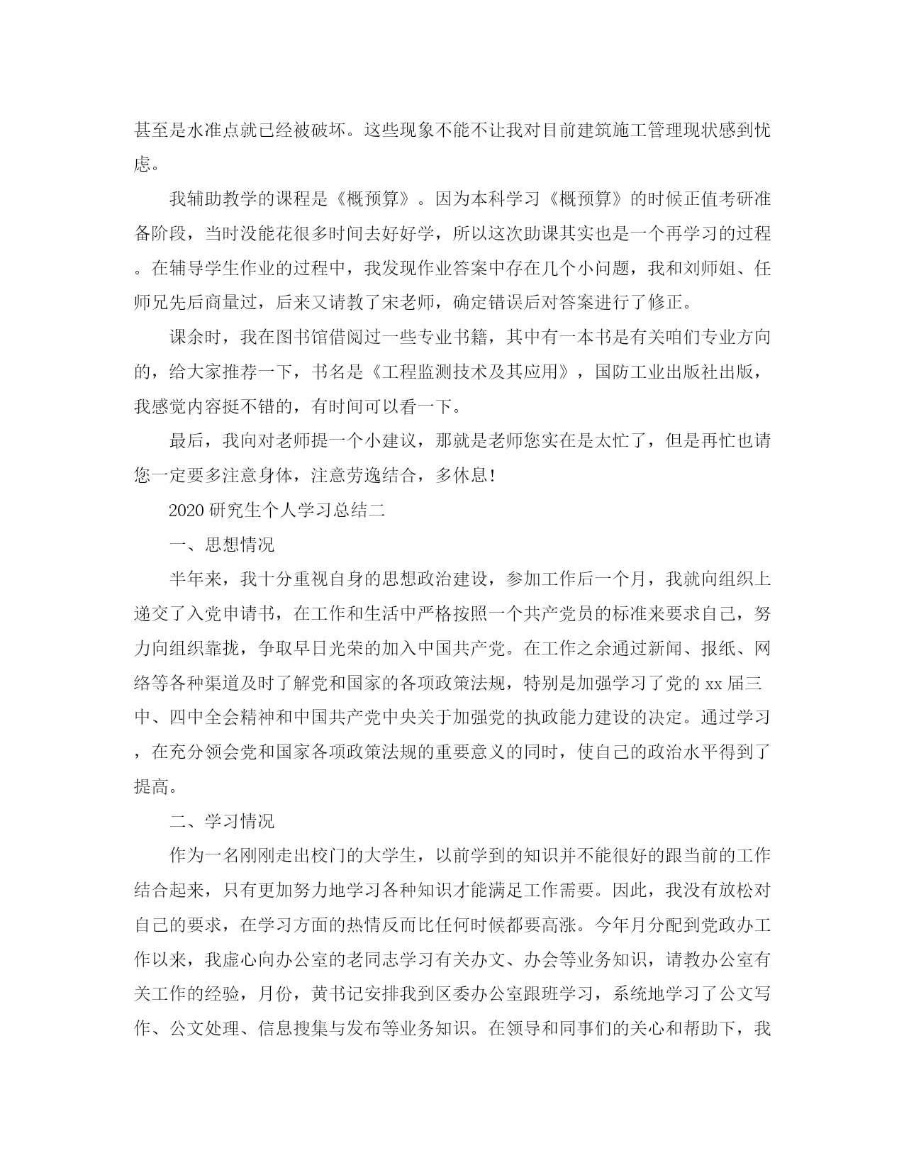 此资料由网络收集而来,如有侵权请告知上传者立即删除。资料共分享,我们负责传递知识。2020研究生个人学习工作总结2020研究生个人学习总结一不知不觉,作为一名研究生的第一个学期就这样结束了。总的来说,研究生生活较之本科有了更多的自由,因而也具有更大的自主性和自由发挥空间。更重要的是,实践的机会更多了,而且这种实践相对于本科的实习来说更具真实性。如果说把本科的实习看作是一个战地记者,能够看到滚滚硝烟,感受到枪林弹雨,那研究生阶段的实践就是一个拿着枪冲锋陷阵的战士了。这学期我一共学习了六门课程,包括科学社会主义理论与实践、自然辩证法、c++程序设计、数值分析、数理统计和随机过程。其中c++程序设计和数值分析两门课程老师讲起课来操着一口标准的河南话。虽然说我在河南也呆了四年多了,但有些河南话还是听不太懂,尤其是对方讲话比较快的时候。所以,这两门课程我在课余花的时间也比较多一点。我主要参与了郑大新区教师公寓楼的沉降观测项目。因为暑假跟着崔师兄在国贸进行了一个暑假的沉降观测,所以这次项目完成得也比较顺利。不过,这其中也遇到和发现了不少问题。首先是测量仪器问题。开始测量的时候,发现水准仪左读数和右读数得出的高差值总是相差很大,但两者差值基本上保持固定。我们几个对仪器经过几次测试和排查,最后确定是尺子的问题。原来测量实验室新买的铟钢尺和以前我们在工地使用过的铟钢尺刻度不一致。其次,这次测量的环境也比较复杂。该工程正处于外墙装修阶段,由于施工原因,很多观测点甚至水准点都被破坏。我们测量了三个组团一共是九个楼,但能用的水准点只有三个,其余的都需要引测。另外,由于建筑物周围地面尚未回填,有些观测点相对水准仪位置较高,所以只能加设转点,或者把仪器架在制高点甚至是阳台上。这些问题都是在国贸测量的时候所没遇到过的,所以也有不少新的收获。不过,通过这次实践,我发现施工方的沉降观测报表记录极不规范,数据也极不真实,有些一看就知道是胡乱编造的。另外,沉降观测应该是贯穿建筑物使用期限始终的,可建筑物尚未完工很多观测点甚至是水准点就已经被破坏。这些现象不能不让我对目前建筑施工管理现状感到忧虑。我辅助教学的课程是《概预算》。因为本科学习《概预算》的时候正值考研准备阶段,当时没能花很多时间去好好学,所以这次助课其实也是一个再学习的过程。在辅导学生作业的过程中,我发现作业答案中存在几个小问题,我和刘师姐、任师兄先后商量过,后来又请教了宋老师,确定错误后对答案进行了修正。课余时,我在图书馆借阅过一些专业书籍,其中有一本书是有关咱们专业方向的,给大家推荐一下,书名是《工程监测技术及其应用》,国防工业出版社出版,我感觉内容挺不错的,有时间可以看一下。最后,我向对老师提一个小建议,那就是老师您实在是太忙了,但是再忙也请您一定要多注意身体,注意劳逸结合,多休息!2020研究生个人学习总结二一、思想情况半年来,我十分重视自身的思想政治建设,参加工作后一个月,我就向组织上递交了入党申请书,在工作和生活中严格按照一个共产党员的标准来要求自己,努力向组织靠拢,争取早日光荣的加入中国共产党。在工作之余通过新闻、报纸、网络等各种渠道及时了解党和国家的各项政策法规,特别是加强学习了党的xx届三中、四中全会精神和中国共产党中央关于加强党的执政能力建设的决定。通过学习,在充分领会党和国家各项政策法规的重要意义的同时,使自己的政治水平得到了提高。二、学习情况作为一名刚刚走出校门的大学生,以前学到的知识并不能很好的跟当前的工作结合起来,只有更加努力地学习各种知识才能满足工作需要。因此,我没有放松对自己的要求,在学习方面的热情反而比任何时候都要高涨。今年月分配到党政办工作以来,我虚心向办公室的老同志学习有关办文、办会等业务知识,请教办公室有关工作的经验,月份,黄书记安排我到区委办公室跟班学习,系统地学习了公文写作、公文处理、信息搜集与发布等业务知识。在领导和同事们的关心和帮助下,我迅速适应了从学校到机关的转变,提高了自己的业务水平,基本熟悉了办公室的相关工作。三、工作情况一个从事办公室工作多年的老前辈曾对我说过,搞办公室工作"无过便是功"从他的话里我深刻体会到办公室的工作真的十分重要却又十分繁琐,做好办公室工作需要付出不懈的努力。今年月分配到党政办以来,我虚心学习各种相关知识,并在工作中得到了实践,取得了一定的成绩。一是参与了洪家山省级森林公园挂牌暨管理处成立庆典、企石公路通车庆典等活动的组织和准备工作;二是按领导要求撰写了各种报告、典型材料等余篇;三是参与编写了第一、二、三期的《简报》,其中发表各类通讯篇;四是积极锻炼自己的写作水平,在《XX日报》、《XX晚报》上发表了篇通讯。半年来,我努力学习各种知识和经验,在思想上对自己严格要求,在工作中积极肯干,取得了一定的成