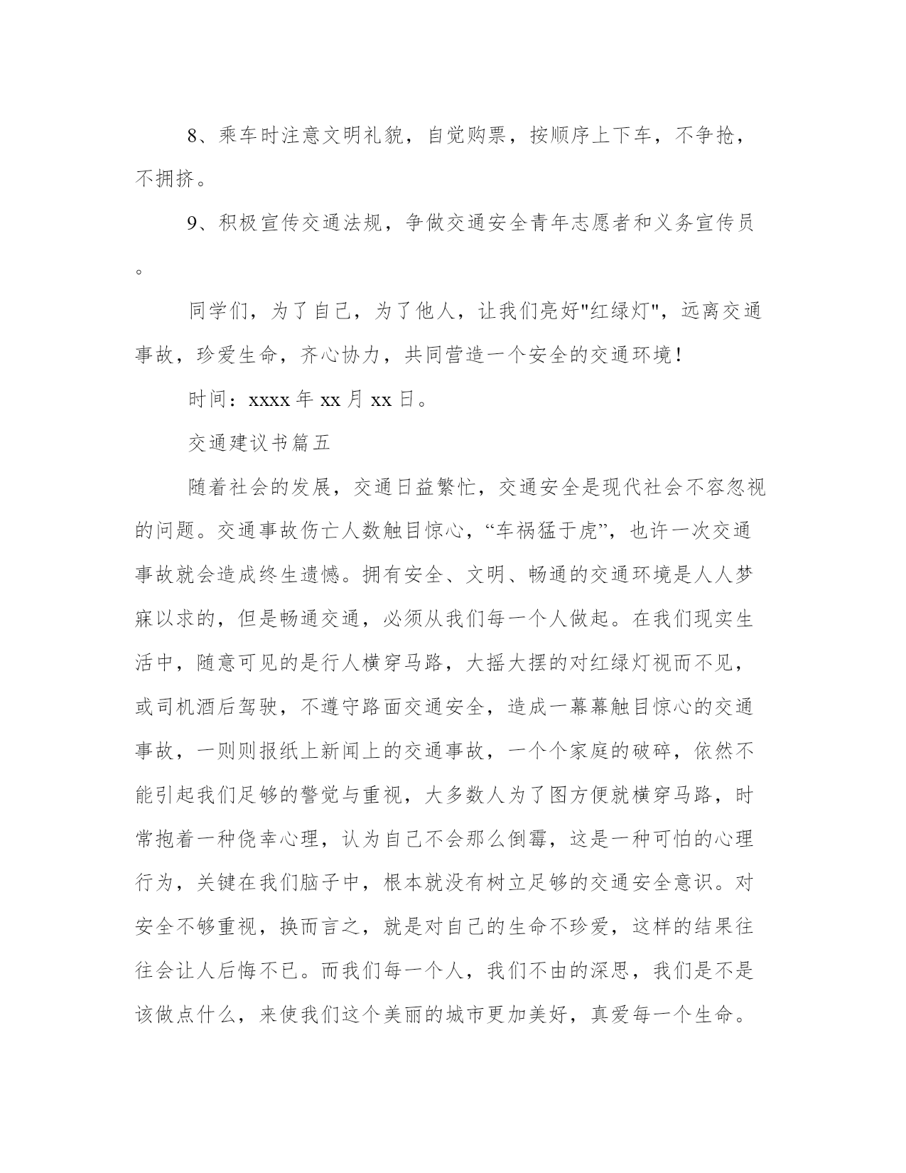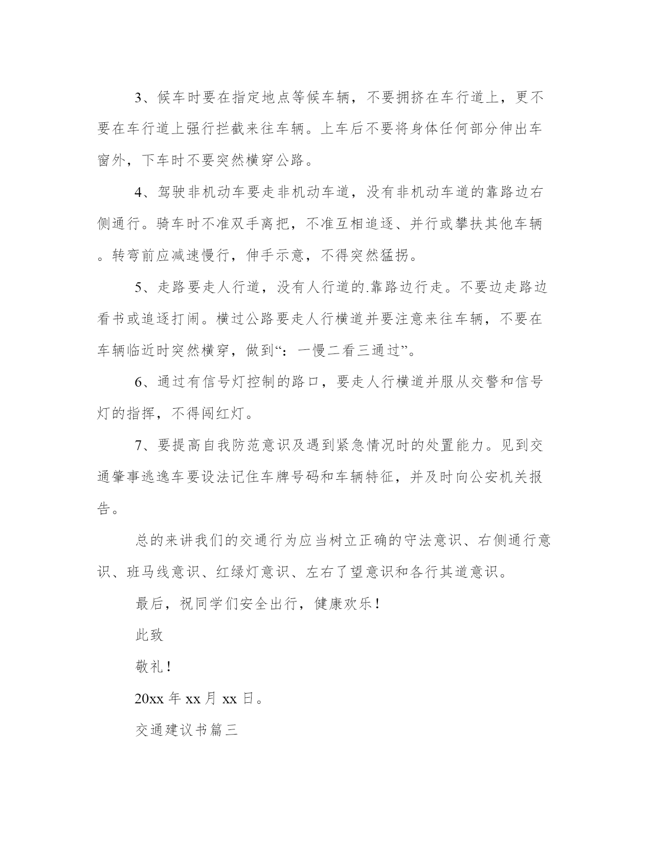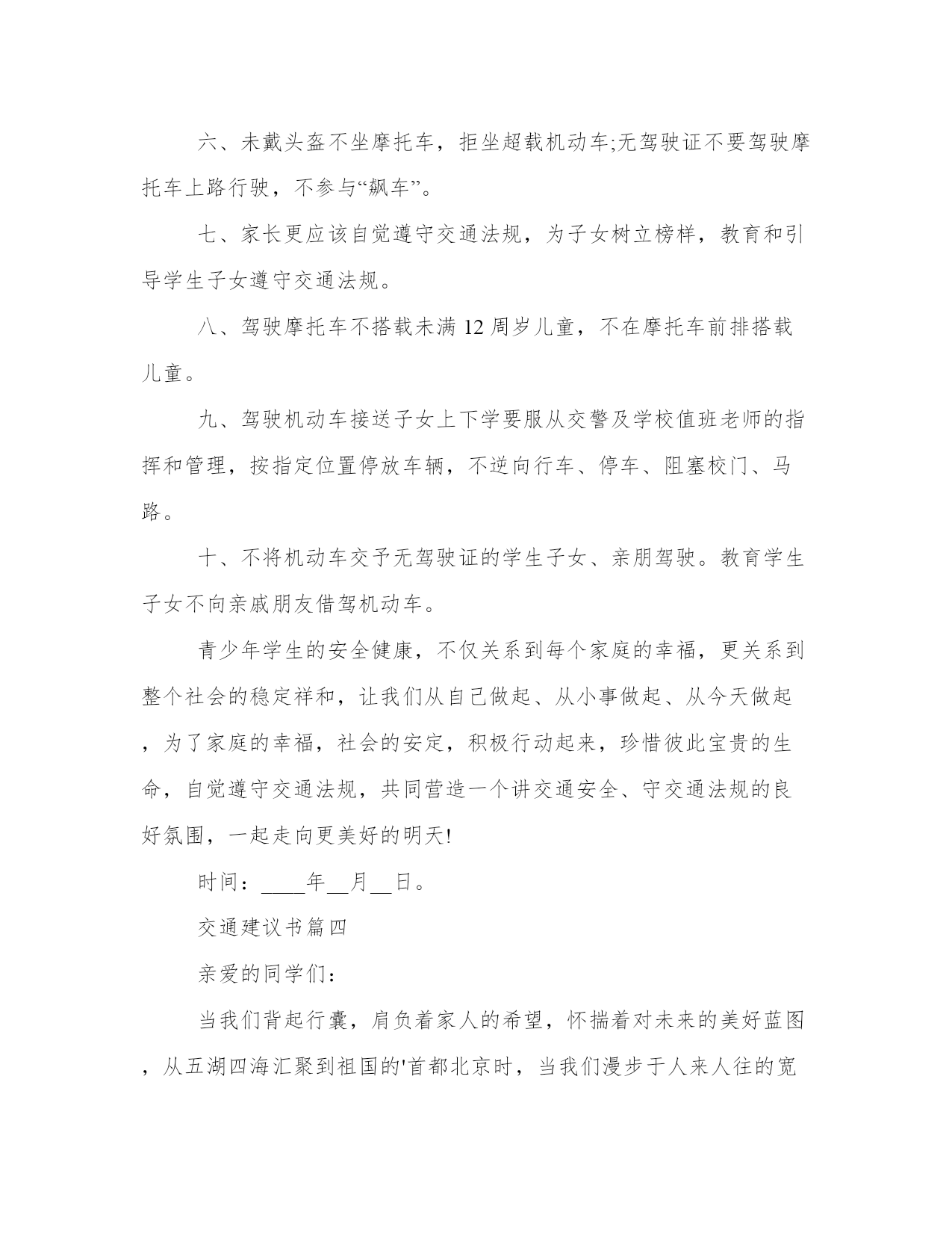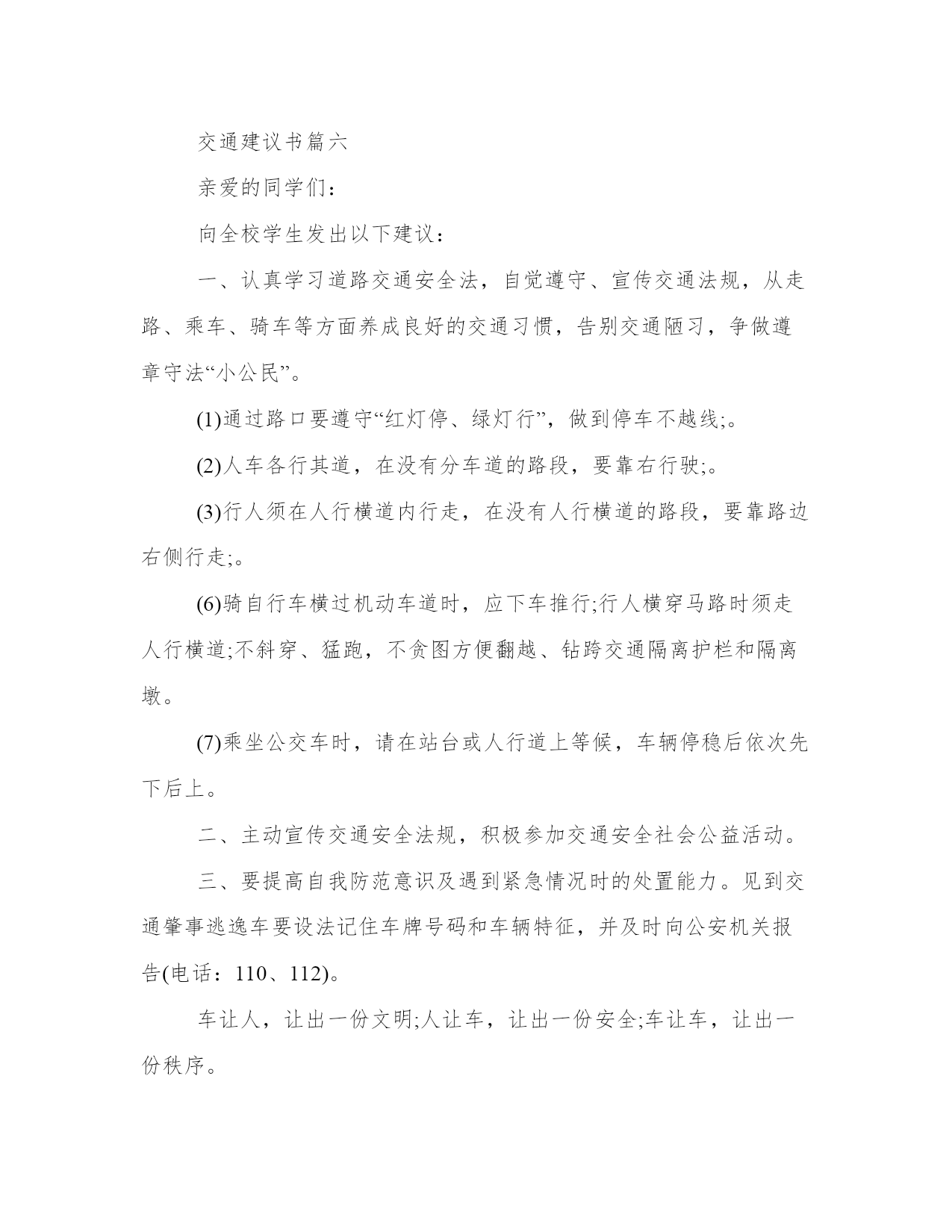 交通建议书(实用11篇)人的记忆力会随着岁月的流逝而衰退,写作可以弥补记忆的不足,将曾经的人生经历和感悟记录下来,也便于保存一份美好的回忆。相信许多人会觉得范文很难写?这里我整理了一些优秀的范文,希望对大家有所帮助,下面我们就来了解一下吧。交通建议书篇一同学们:生命对于我们每个人只有一次,请珍视和关爱自己和他人的生命,多少惨痛的教训和血的代价已让我们深深地体悟到维护交通安全的重要性。遵守交通法规是我们应尽的责任和义务。只有遵章守法,平安才会伴您一生;只有文明交通,事故才会与您无缘。在此,为了你我和他人的生命安全,我们郑重向全体中学生及其家长们提出几点建议:一、认真学习交通法规知识,自觉遵守新交通法规,不乘坐无牌照以及非客运车辆,养成良好的交通习惯,告别交通陋习,争做遵章守法“小公民”。二、文明交通、各行其道,遵守交通信号,不抢车道,不闯红灯,服从交通警察的指挥和管理。三、行路走人行道,过马路走斑马线或人行天桥,不贪图方便翻越、钻跨交通隔离护栏;不在马路上追逐玩耍,不三五成群并肩行走或聚集停留;不在道路上使用滑板、滑行车、旱冰鞋等滑行工具。四、未满12周岁的不骑自行车,骑自行车要走非机动车道,横过机动车道时应下车推行;骑自行车不载人、不戴耳塞听音乐、不双手离把、不打手机、不吃零食、不搭肩并行、曲线行驶。五、请在站台或人行道上等候公交车,车辆停稳后,依次先下后上;不在机动车道上拦乘机动车。六、未戴头盔不坐摩托车,拒坐超载机动车;无驾驶证不要驾驶摩托车上路行驶,不参与“飙车”。七、家长更应该自觉遵守交通法规,为子女树立榜样,教育和引导学生子女遵守交通法规。八、驾驶摩托车不搭载未满12周岁儿童,不在摩托车前排搭载儿童。九、驾驶机动车接送子女上下学要服从交警及学校值班老师的指挥和管理,按指定位置停放车辆,不逆向行车、停车、阻塞校门、马路。十、不将机动车交予无驾驶证的学生子女、亲朋驾驶。教育学生子女不向亲戚朋友借驾机动车。青少年学生的安全健康,不仅关系到每个家庭的幸福,更关系到整个社会的稳定祥和,让我们从自己做起、从小事做起、从今天做起,为了家庭的幸福,社会的安定,积极行动起来,珍惜彼此宝贵的生命,自觉遵守交通法规,共同营造一个讲交通安全、守交通法规的良好氛围,一起走向更美好的明天!此致敬礼!建议人:日期:交通建议书篇二亲爱的同学们:你们好!改革开放以来,我国的经济得到了迅速的发展,但道路交通与经济发展不相适应,制约了社会的进步发展。交通安全形势十分严峻,每年的道路交通事故持续上升。我区07年1月至11月共发生道路交通事故293宗;死亡人数:39人;受伤人数:389人;经济损失:75万;据有关部门的统计数字显示,交通参与者的不良交通行为是引发道路交通事故的主要原因。为确保安全出行,请同学们要自觉遵守交通法规,养成良好的交通行为习惯。在此,我们倡议:1、认真学习道路交通安全法,掌握交通安全知识,增强交通安全观念,培养文明交通意识。2、乘车时,不要乘坐无牌或由无证人员驾驶的车辆;搭乘二轮摩托车时必须戴好安全头盔,加强自我保护意识。3、候车时要在指定地点等候车辆,不要拥挤在车行道上,更不要在车行道上强行拦截来往车辆。上车后不要将身体任何部分伸出车窗外,下车时不要突然横穿公路。4、驾驶非机动车要走非机动车道,没有非机动车道的靠路边右侧通行。骑车时不准双手离把,不准互相追逐、并行或攀扶其他车辆。转弯前应减速慢行,伸手示意,不得突然猛拐。5、走路要走人行道,没有人行道的.靠路边行走。不要边走路边看书或追逐打闹。横过公路要走人行横道并要注意来往车辆,不要在车辆临近时突然横穿,做到“:一慢二看三通过”。6、通过有信号灯控制的路口,要走人行横道并服从交警和信号灯的指挥,不得闯红灯。7、要提高自我防范意识及遇到紧急情况时的处置能力。见到交通肇事逃逸车要设法记住车牌号码和车辆特征,并及时向公安机关报告。总的来讲我们的交通行为应当树立正确的守法意识、右侧通行意识、班马线意识、红绿灯意识、左右了望意识和各行其道意识。最后,祝同学们安全出行,健康欢乐!此致敬礼!20xx年xx月xx日。交通建议书篇三___:生命对于我们每个人只有一次,请珍视和关爱自己和他人的生命,多少惨痛的教训和血的代价已让我们深深地体悟到维护交通安全的重要性。遵守交通法规是我们应尽的责任和义务。只有遵章守法,平安才会伴您一生;只有文明交通,事故才会与您无缘。在此,为了你我和他人的生命安全,我们郑重向全体中学生及其家长们提出几点建议:一、认真学习交通法规知识,自觉遵守新交通法规,不乘坐无牌照以及非客运车辆,养成良好的交通习惯,告别交通陋习,争做遵章守法“小公民”。二、文明交通、各行其道,遵守交通信号,不抢车道,不闯红灯,