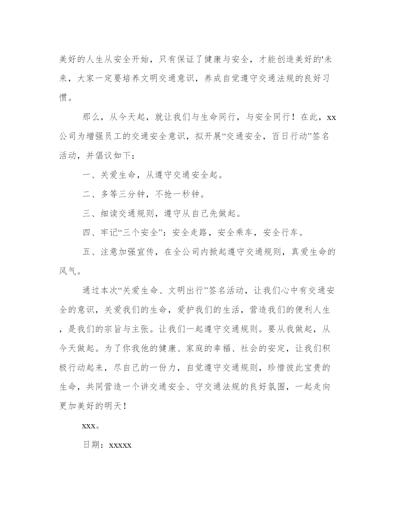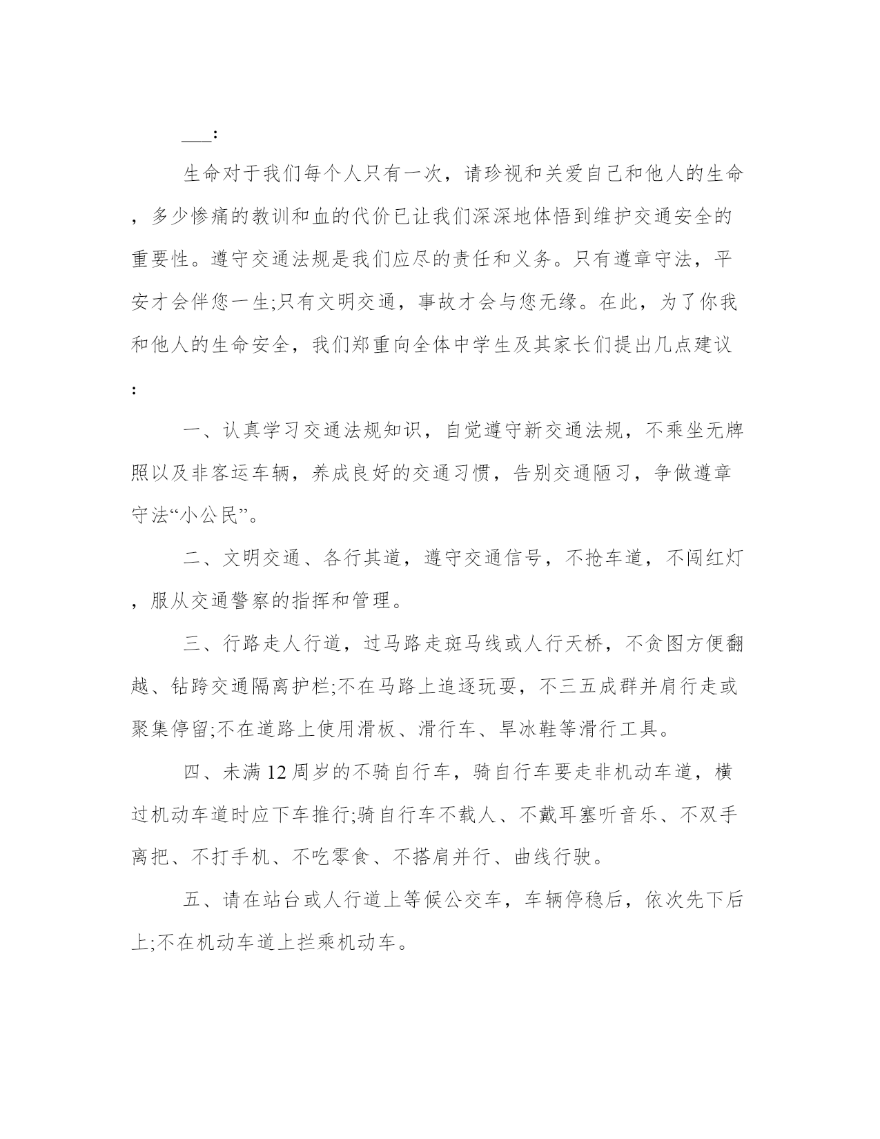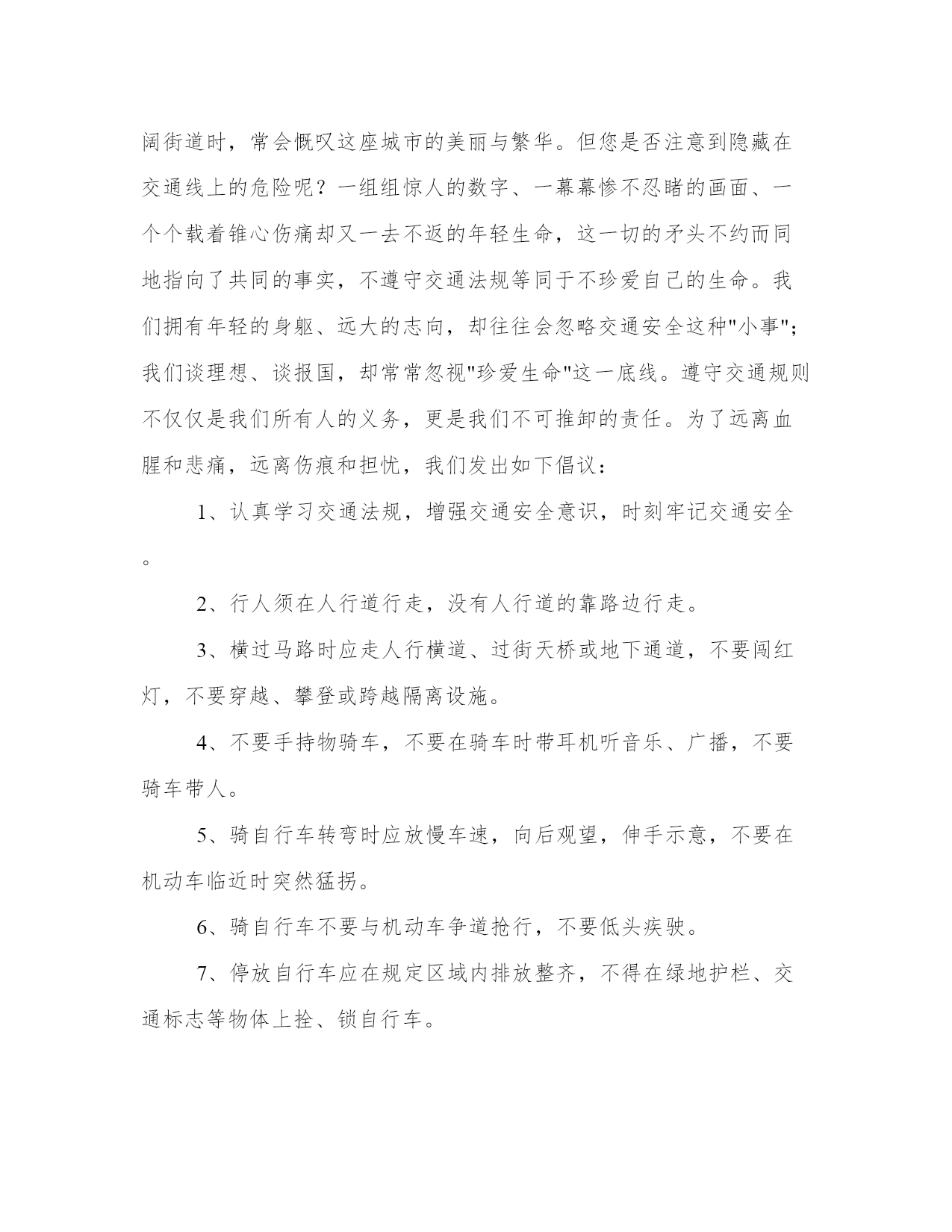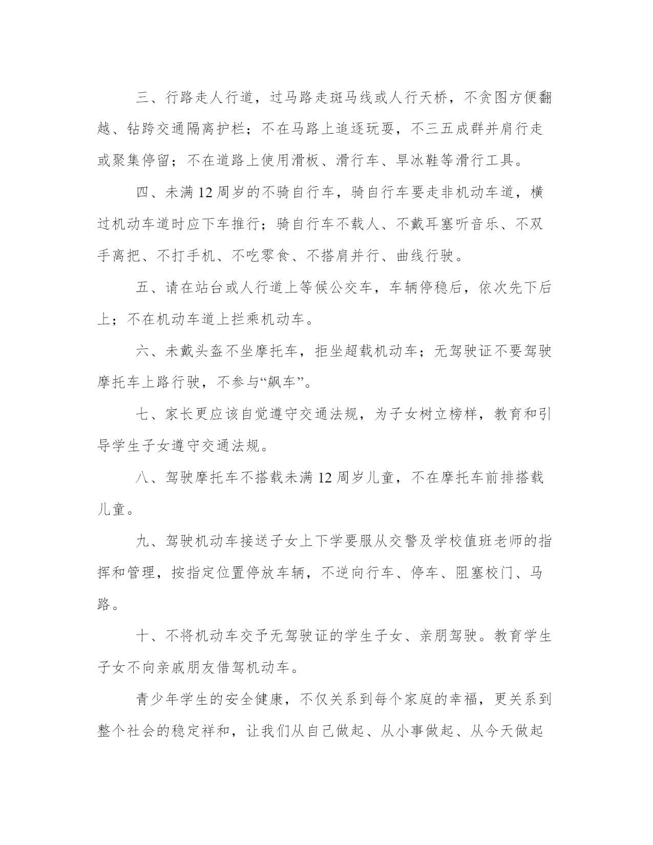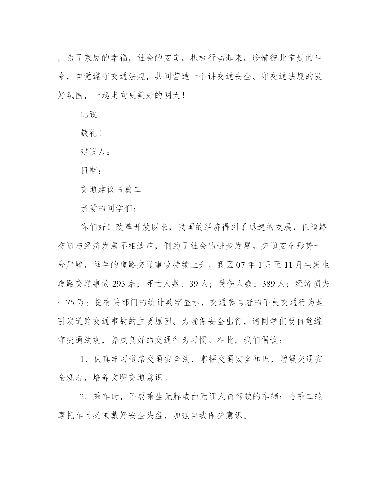 交通建议书(实用11篇)人的记忆力会随着岁月的流逝而衰退,写作可以弥补记忆的不足,将曾经的人生经历和感悟记录下来,也便于保存一份美好的回忆。相信许多人会觉得范文很难写?这里我整理了一些优秀的范文,希望对大家有所帮助,下面我们就来了解一下吧。交通建议书篇一同学们:生命对于我们每个人只有一次,请珍视和关爱自己和他人的生命,多少惨痛的教训和血的代价已让我们深深地体悟到维护交通安全的重要性。遵守交通法规是我们应尽的责任和义务。只有遵章守法,平安才会伴您一生;只有文明交通,事故才会与您无缘。在此,为了你我和他人的生命安全,我们郑重向全体中学生及其家长们提出几点建议:一、认真学习交通法规知识,自觉遵守新交通法规,不乘坐无牌照以及非客运车辆,养成良好的交通习惯,告别交通陋习,争做遵章守法“小公民”。二、文明交通、各行其道,遵守交通信号,不抢车道,不闯红灯,服从交通警察的指挥和管理。三、行路走人行道,过马路走斑马线或人行天桥,不贪图方便翻越、钻跨交通隔离护栏;不在马路上追逐玩耍,不三五成群并肩行走或聚集停留;不在道路上使用滑板、滑行车、旱冰鞋等滑行工具。四、未满12周岁的不骑自行车,骑自行车要走非机动车道,横过机动车道时应下车推行;骑自行车不载人、不戴耳塞听音乐、不双手离把、不打手机、不吃零食、不搭肩并行、曲线行驶。五、请在站台或人行道上等候公交车,车辆停稳后,依次先下后上;不在机动车道上拦乘机动车。六、未戴头盔不坐摩托车,拒坐超载机动车;无驾驶证不要驾驶摩托车上路行驶,不参与“飙车”。七、家长更应该自觉遵守交通法规,为子女树立榜样,教育和引导学生子女遵守交通法规。八、驾驶摩托车不搭载未满12周岁儿童,不在摩托车前排搭载儿童。九、驾驶机动车接送子女上下学要服从交警及学校值班老师的指挥和管理,按指定位置停放车辆,不逆向行车、停车、阻塞校门、马路。十、不将机动车交予无驾驶证的学生子女、亲朋驾驶。教育学生子女不向亲戚朋友借驾机动车。青少年学生的安全健康,不仅关系到每个家庭的幸福,更关系到整个社会的稳定祥和,让我们从自己做起、从小事做起、从今天做起,为了家庭的幸福,社会的安定,积极行动起来,珍惜彼此宝贵的生命,自觉遵守交通法规,共同营造一个讲交通安全、守交通法规的良好氛围,一起走向更美好的明天!此致敬礼!建议人:日期:交通建议书篇二亲爱的同学们:你们好!改革开放以来,我国的经济得到了迅速的发展,但道路交通与经济发展不相适应,制约了社会的进步发展。交通安全形势十分严峻,每年的道路交通事故持续上升。我区07年1月至11月共发生道路交通事故293宗;死亡人数:39人;受伤人数:389人;经济损失:75万;据有关部门的统计数字显示,交通参与者的不良交通行为是引发道路交通事故的主要原因。为确保安全出行,请同学们要自觉遵守交通法规,养成良好的交通行为习惯。在此,我们倡议:1、认真学习道路交通安全法,掌握交通安全知识,增强交通安全观念,培养文明交通意识。2、乘车时,不要乘坐无牌或由无证人员驾驶的车辆;搭乘二轮摩托车时必须戴好安全头盔,加强自我保护意识。3、候车时要在指定地点等候车辆,不要拥挤在车行道上,更不要在车行道上强行拦截来往车辆。上车后不要将身体任何部分伸出车窗外,下车时不要突然横穿公路。4、驾驶非机动车要走非机动车道,没有非机动车道的靠路边右侧通行。骑车时不准双手离把,不准互相追逐、并行或攀扶其他车辆。转弯前应减速慢行,伸手示意,不得突然猛拐。5、走路要走人行道,没有人行道的.靠路边行走。不要边走路边看书或追逐打闹。横过公路要走人行横道并要注意来往车辆,不要在车辆临近时突然横穿,做到“:一慢二看三通过”。6、通过有信号灯控制的路口,要走人行横道并服从交警和信号灯的指挥,不得闯红灯。7、要提高自我防范意识及遇到紧急情况时的处置能力。见到交通肇事逃逸车要设法记住车牌号码和车辆特征,并及时向公安机关报告。总的来讲我们的交通行为应当树立正确的守法意识、右侧通行意识、班马线意识、红绿灯意识、左右了望意识和各行其道意识。最后,祝同学们安全出行,健康欢乐!此致敬礼!20xx年xx月xx日。交通建议书篇三___:生命对于我们每个人只有一次,请珍视和关爱自己和他人的生命,多少惨痛的教训和血的代价已让我们深深地体悟到维护交通安全的重要性。遵守交通法规是我们应尽的责任和义务。只有遵章守法,平安才会伴您一生;只有文明交通,事故才会与您无缘。在此,为了你我和他人的生命安全,我们郑重向全体中学生及其家长们提出几点建议:一、认真学习交通法规知识,自觉遵守新交通法规,不乘坐无牌照以及非客运车辆,养成良好的交通习惯,告别交通陋习,争做遵章守法“小公民”。二、文明交通、各行其道,遵守交通信号,不抢车道,不闯红灯,