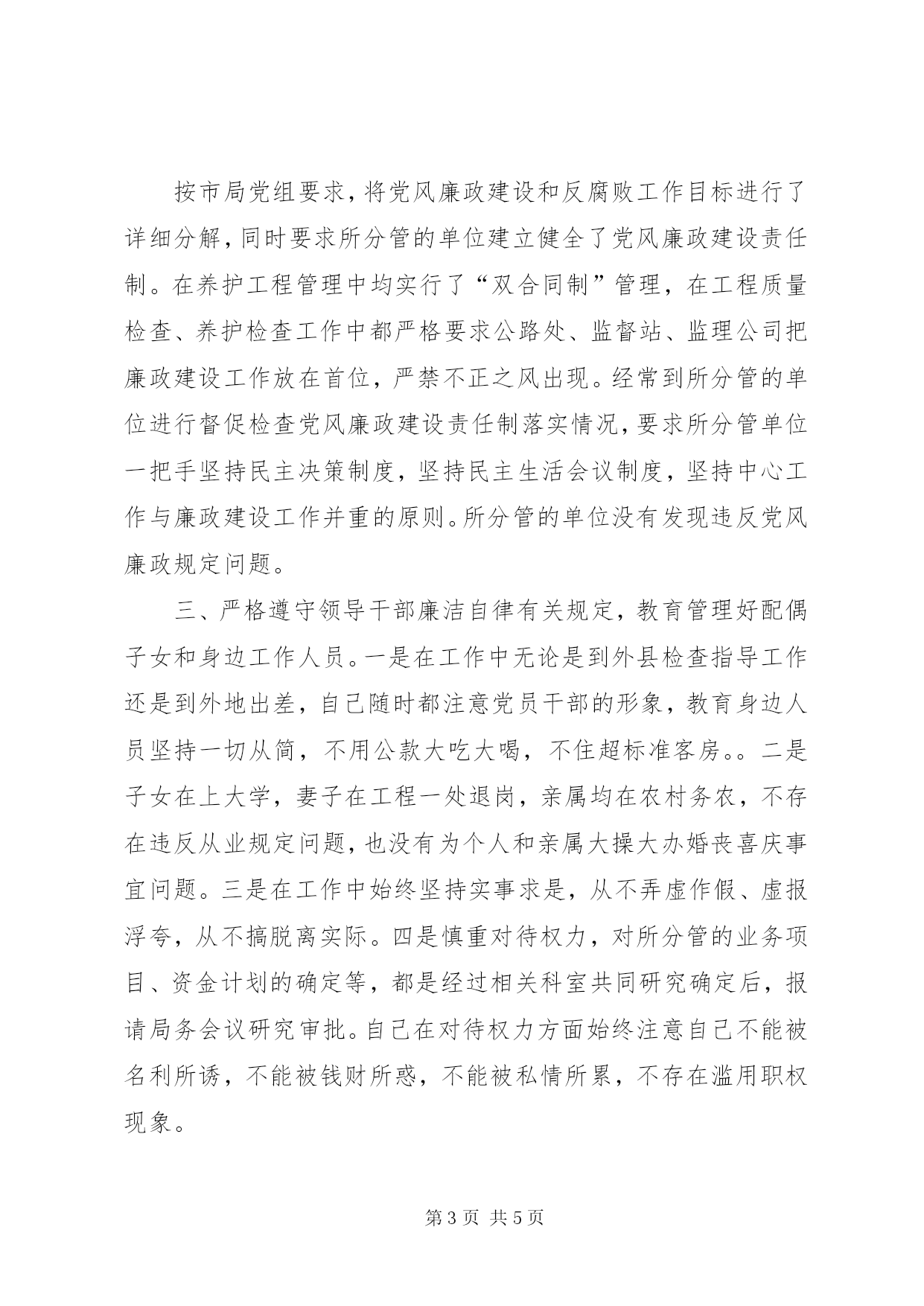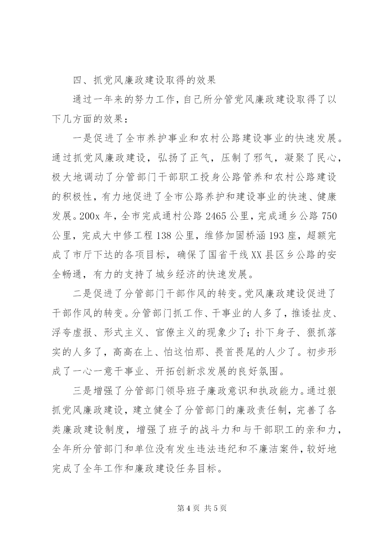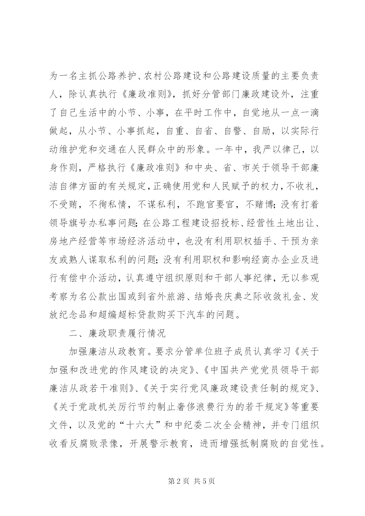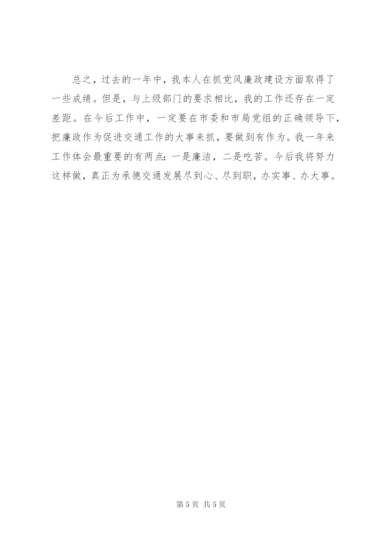第PAGE\*Arabic\*MERGEFORMAT5页共NUMPAGES\*MERGEFORMAT5页市交通局长述职报告述职报告按着党风廉政建设责任制分工,我主要负责所分管的公路养护、地方道路、监督监理方面的工作和所分管的公路处、地方道路管理处、京承公路管理处、交通直属分局、监督站、监理公司的单位廉政建设工作。一年来,本人在市局党组的领导下,在市局党组成员的协助下,通过所分管部门领导的共同努力,较好地完成了所分管部门的党风廉政建设工作任务。现就200x年所分管的廉政建设工作任务完成情况述职如下:一、本人廉洁自律情况党的十六大指出,“坚持反对和防止腐败,是全党的一项重大政治任务。不坚决惩治腐败,党同人民的血肉联系就会受到严重损害,党的执政地位就有丧失的危险,党就有可能走向自我毁灭。承德是一个经济欠发达地区,公路基础设施发展相对滞后,县乡公路建设任务还非常艰巨,人民经济水平还很低,在这样的条件下谋求发展,没有一支踏实苦干、为政清廉的干部队伍不行,没有一种清纯干净、积极向上的廉政风气不行。我作为一名党员领导干部,特别是作为一名主管农村公路建设的交通局副局长,自己的一举一动、一言一行都代表党和交通的形象。今年,我严以律己,以身作则,带头严格执行《廉政准则》和中央、省、市关于领导干部廉洁自律方面的有关规定,正确使用党和人民赋予的权力,不收礼,不受贿,不徇私情,不谋私利。我感觉到,作为一名主抓公路养护、农村公路建设和公路建设质量的主要负责人,除认真执行《廉政准则》,抓好分管部门廉政建设外,注重了自己生活中的小节、小事,在平时工作中,自觉地从一点一滴做起,从小节、小事抓起,自重、自省、自警、自励,以实际行动维护党和交通在人民群众中的形象。一年中,我严以律己,以身作则,严格执行《廉政准则》和中央、省、市关于领导干部廉洁自律方面的有关规定,正确使用党和人民赋予的权力,不收礼,不受贿,不徇私情,不谋私利,不跑官要官,不赌博;没有打着领导旗号办私事问题;在公路工程建设招投标、经营性土地出让、房地产经营等市场经济活动中,也没有利用职权插手、干预为亲友或熟人谋取私利的问题;没有利用职权和影响经商办企业及进行有偿中介活动,认真遵守组织原则和干部人事纪律,无以参观考察为名公款出国或到省外旅游、结婚丧庆典之际收敛礼金、发放纪念品和超编超标贷款购买下汽车的问题。二、廉政职责履行情况加强廉洁从政教育。要求分管单位班子成员认真学习《关于加强和改进党的作风建设的决定》、《中国共产党党员领导干部廉洁从政若干准则》、《关于实行党风廉政建设责任制的规定》、《关于党政机关厉行节约制止奢侈浪费行为的若干规定》等重要文件,以及党的“十六大”和中纪委二次全会精神,并专门组织收看反腐败录像,开展警示教育,进而增强抵制腐败的自觉性。按市局党组要求,将党风廉政建设和反腐败工作目标进行了详细分解,同时要求所分管的单位建立健全了党风廉政建设责任制。在养护工程管理中均实行了“双合同制”管理,在工程质量检查、养护检查工作中都严格要求公路处、监督站、监理公司把廉政建设工作放在首位,严禁不正之风出现。经常到所分管的单位进行督促检查党风廉政建设责任制落实情况,要求所分管单位一把手坚持民主决策制度,坚持民主生活会议制度,坚持中心工作与廉政建设工作并重的原则。所分管的单位没有发现违反党风廉政规定问题。三、严格遵守领导干部廉洁自律有关规定,教育管理好配偶子女和身边工作人员。一是在工作中无论是到外县检查指导工作还是到外地出差,自己随时都注意党员干部的形象,教育身边人员坚持一切从简,不用公款大吃大喝,不住超标准客房。。二是子女在上大学,妻子在工程一处退岗,亲属均在农村务农,不存在违反从业规定问题,也没有为个人和亲属大操大办婚丧喜庆事宜问题。三是在工作中始终坚持实事求是,从不弄虚作假、虚报浮夸,从不搞脱离实际。四是慎重对待权力,对所分管的业务项目、资金计划的确定等,都是经过相关科室共同研究确定后,报请局务会议研究审批。自己在对待权力方面始终注意自己不能被名利所诱,不能被钱财所惑,不能被私情所累,不存在滥用职权现象。四、抓党风廉政建设取得的效果通过一年来的努力工作,自己所分管党风廉政建设取得了以下几方面的效果:一是促进了全市养护事业和农村公路建设事业的快速发展。通过抓党风廉政建设,弘扬了正气,压制了邪气,凝聚了民心,极大地调动了分管部门干部职工投身公路管养和农村公路建设的积极性,有力地促进了全市公路养护和建设事业的快速、健康发展。200x年,全市完成通村公路2465公里,完成通乡公路750公里,完成大中修工程138公里,维修加固桥涵193座,超额完成了市厅下达的各项目标,确保了国省干线XX县区乡公路的安全畅通,有力的支持了城乡经济的快速发展。二是促进了分管部门干部作风的转变。党风廉政建