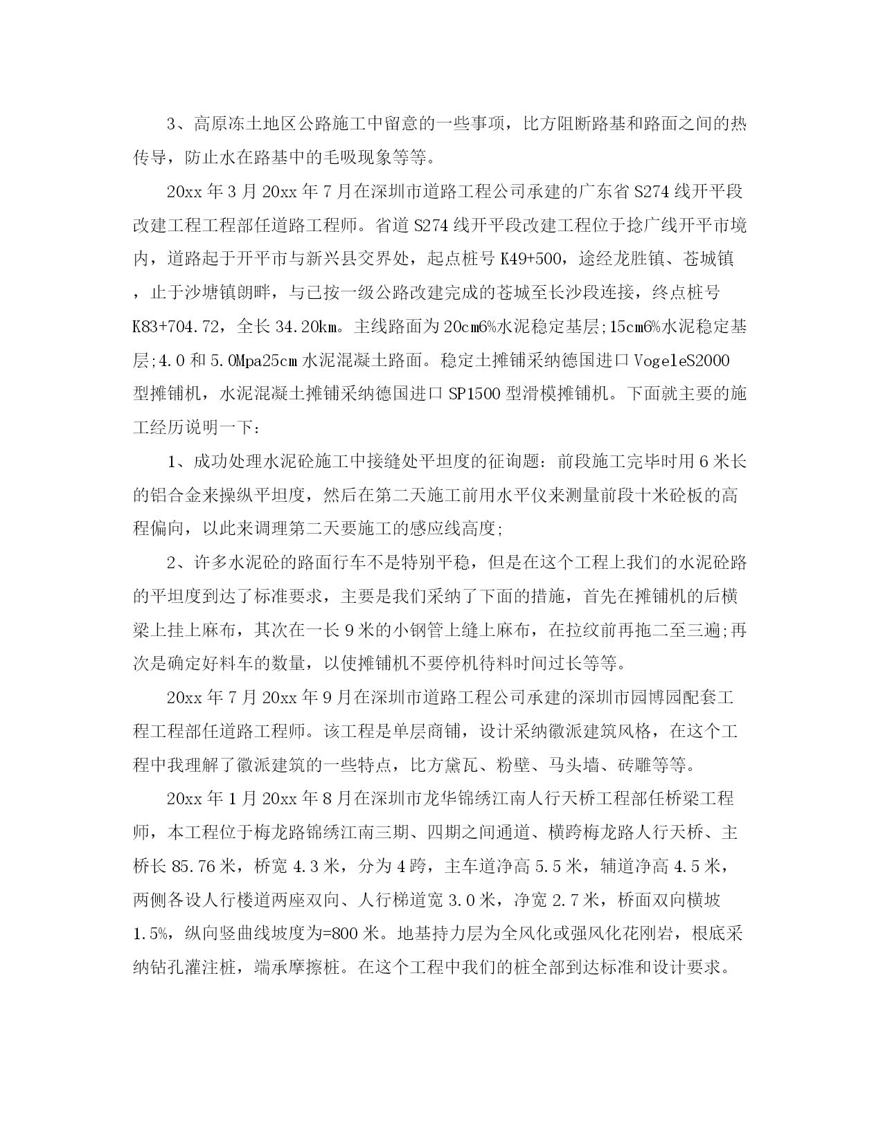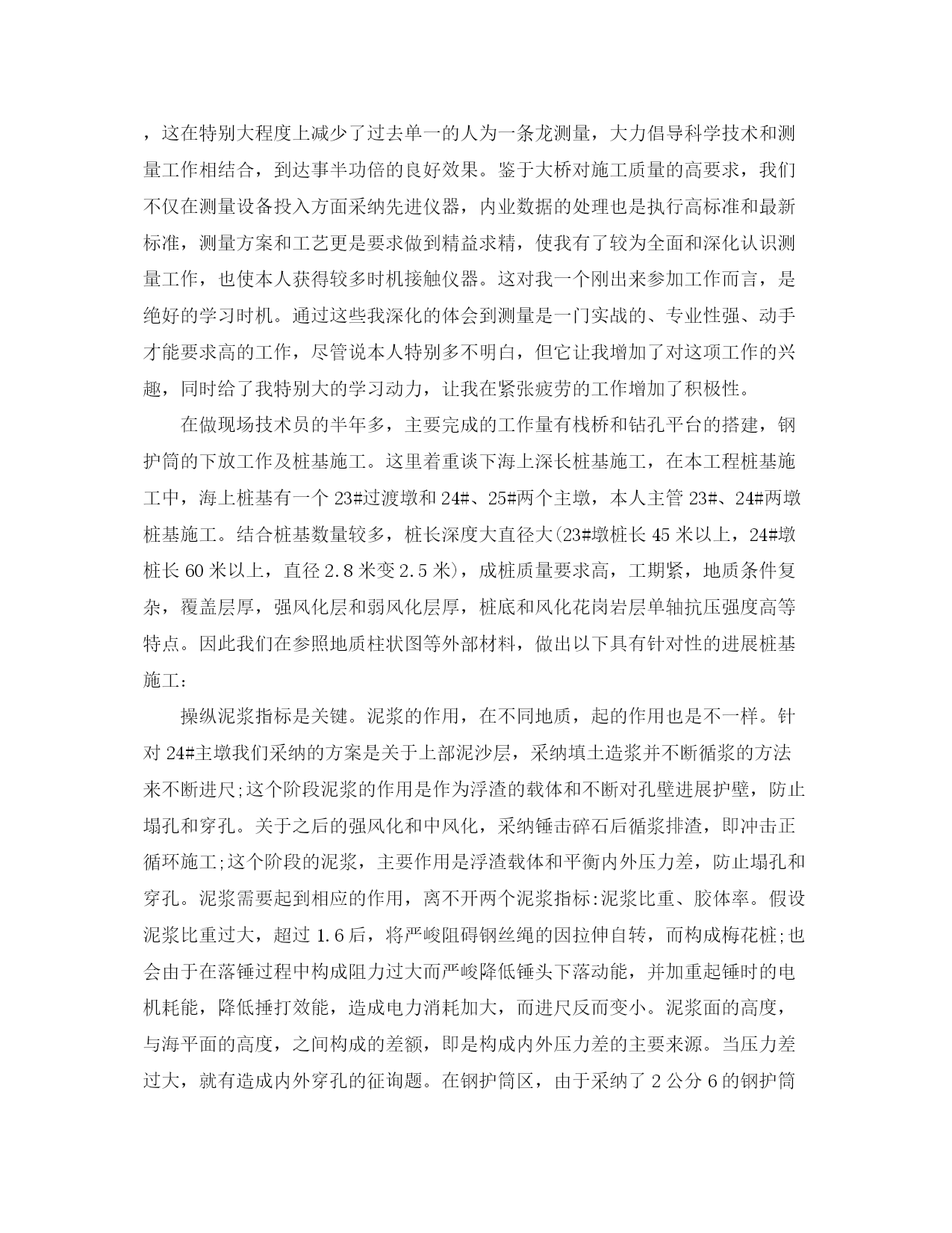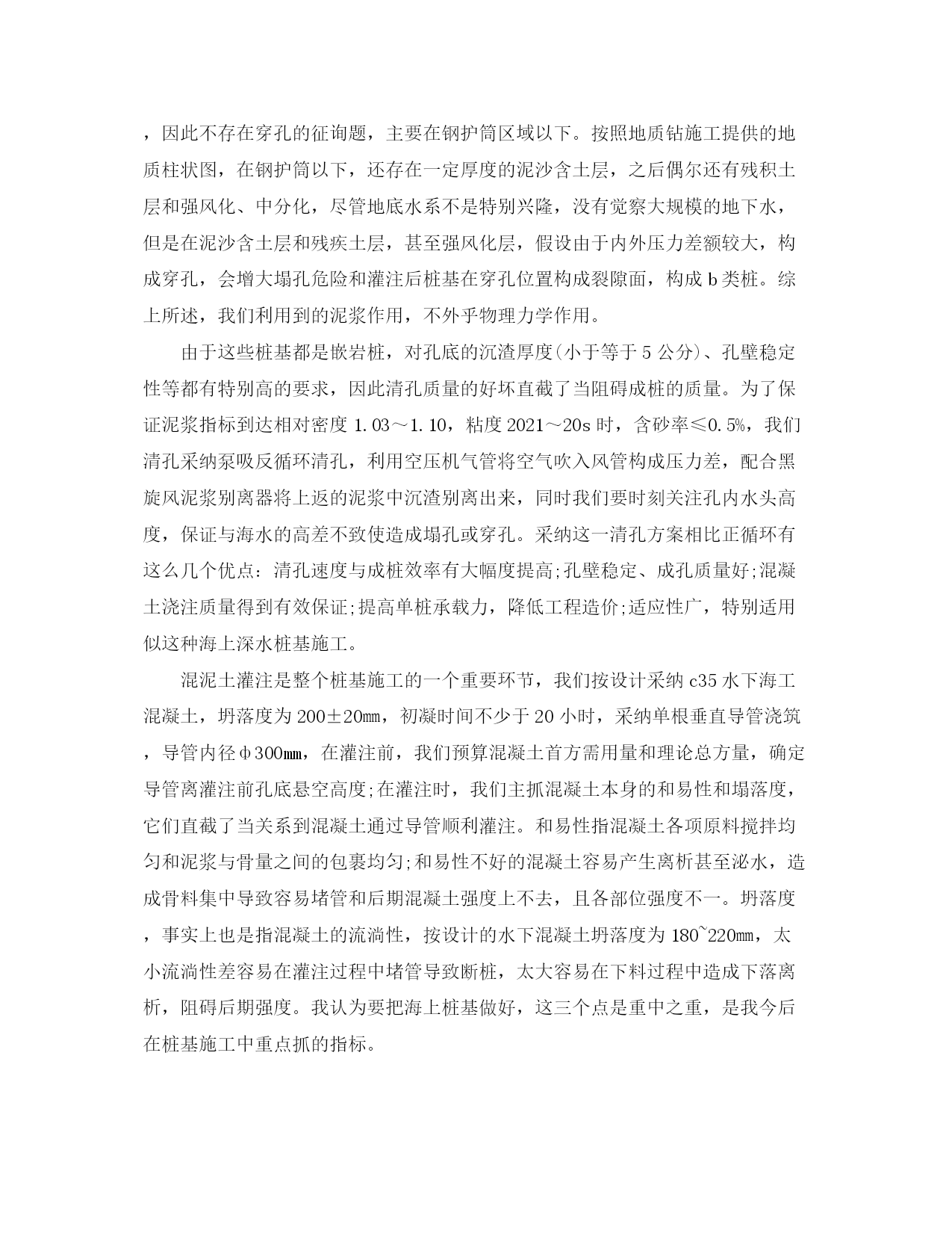 2021路桥专业技术工作参考总结范本路桥专业技术工作总结【一】本人自XX年7月来到xxx公司参加工作,已经快要一年了。还记得刚到公司报到时,公司为我们提供为期一周的短暂培训,这使我们特别快对公司各方面的开展有了较深化的认识,同时在思想上、工作上认识到本人肩负着一份更重的责任和义务。特别快我们各奔东西,去了公司分配的工程,我特别幸运的来到了我们局所谓的第一座海上桥施工的xx跨海大桥工程。一年里,我作为测量员和现场技术员两个不同岗位,我尽职尽责完本钱职工作,成绩虽小,感慨颇多。下面我就对本人这一年来的工作作一番简单的回忆与总结。在xx大桥工作的一年里,我不断坚持个人思想修养,使本人在思想上变得更加成熟稳住。我作为一名共青团员,不断以党员的标准严格要求本人,坚持党的四项根本原则,热爱交通土建事业,对工作不讲任何条件,只是尽本人最大的才能把工作做得更好。同时我在工作上和同事团结合作、生活上和睦互助。我想正由于如此,我在XX年5月有幸成为我工程入党积极分子的一员。在工作方面,刚开始工程部给我定的岗位是测量员,海上大桥的施工对测量工作的要求是特别严谨,又正值xx大桥7月进场的,特别多工作还处在预备阶段,因此前期测量的复测工作是相当频繁,同时需要测量的工程特别多,有跨海水准、二等水准、操纵点加密及红线放样和其他施工放样等工作。就说这跨海水准测量吧,我们为了提高复测数据的准确性,提高照准精度,运用两个大地四边形的布网方式,构成一个以跨海测线为主的具有外部检核条件的水准闭合环;通过间接测量仪器高、间接计算高差、间接求两差改正数的方法,获得了800米远间隔跨海水准测量的精准数据。另外在这个测量过程中,我们为了尽量减少大气折射所造成的不利阻碍,我们都选在天气良好的晚上时分测量,如此对我们数据的采集提高了可行性。在导线点复测时,为了减少误差和提高精度,我们也采纳黒白尺配合二等电子水准仪来测量,如此在数据记录也是仪器自动记录,然后通过专门的专业软件处理数据,数据是否可行一目了然,有效地减少了人为的记录、计算所带来的不必要错误,这在特别大程度上减少了过去单一的人为一条龙测量,大力倡导科学技术和测量工作相结合,到达事半功倍的良好效果。鉴于大桥对施工质量的高要求,我们不仅在测量设备投入方面采纳先进仪器,内业数据的处理也是执行高标准和最新标准,测量方案和工艺更是要求做到精益求精,使我有了较为全面和深化认识测量工作,也使本人获得较多时机接触仪器。这对我一个刚出来参加工作而言,是绝好的学习时机。通过这些我深化的体会到测量是一门实战的、专业性强、动手才能要求高的工作,尽管说本人特别多不明白,但它让我增加了对这项工作的兴趣,同时给了我特别大的学习动力,让我在紧张疲劳的工作增加了积极性。在做现场技术员的半年多,主要完成的工作量有栈桥和钻孔平台的搭建,钢护筒的下放工作及桩基施工。这里着重谈下海上深长桩基施工,在本工程桩基施工中,海上桩基有一个23#过渡墩和24#、25#两个主墩,本人主管23#、24#两墩桩基施工。结合桩基数量较多,桩长深度大直径大(23#墩桩长45米以上,24#墩桩长60米以上,直径2.8米变2.5米),成桩质量要求高,工期紧,地质条件复杂,覆盖层厚,强风化层和弱风化层厚,桩底和风化花岗岩层单轴抗压强度高等特点。因此我们在参照地质柱状图等外部材料,做出以下具有针对性的进展桩基施工:操纵泥浆指标是关键。泥浆的作用,在不同地质,起的作用也是不一样。针对24#主墩我们采纳的方案是关于上部泥沙层,采纳填土造浆并不断循浆的方法来不断进尺;这个阶段泥浆的作用是作为浮渣的载体和不断对孔壁进展护壁,防止塌孔和穿孔。关于之后的强风化和中风化,采纳锤击碎石后循浆排渣,即冲击正循环施工;这个阶段的泥浆,主要作用是浮渣载体和平衡内外压力差,防止塌孔和穿孔。泥浆需要起到相应的作用,离不开两个泥浆指标:泥浆比重、胶体率。假设泥浆比重过大,超过1.6后,将严峻阻碍钢丝绳的因拉伸自转,而构成梅花桩;也会由于在落锤过程中构成阻力过大而严峻降低锤头下落动能,并加重起锤时的电机耗能,降低捶打效能,造成电力消耗加大,而进尺反而变小。泥浆面的高度,与海平面的高度,之间构成的差额,即是构成内外压力差的主要来源。当压力差过大,就有造成内外穿孔的征询题。在钢护筒区,由于采纳了2公分6的钢护筒,因此不存在穿孔的征询题,主要在钢护筒区域以下。按照地质钻施工提供的地质柱状图,在钢护筒以下,还存在一定厚度的泥沙含土层,之后偶尔还有残积土层和强风化、中分化,尽管地底水系不是特别兴隆,没有觉察大规模的地下水,但是在泥沙含土层和残疾土层,甚至强风化层,假设由于内外压力差额较大,构成穿孔,会增大塌孔危险和灌注后桩基在穿孔位置构成裂隙面,构成b类桩。综上所述,我们利用到的泥浆作用,不外乎物理力学作用。由