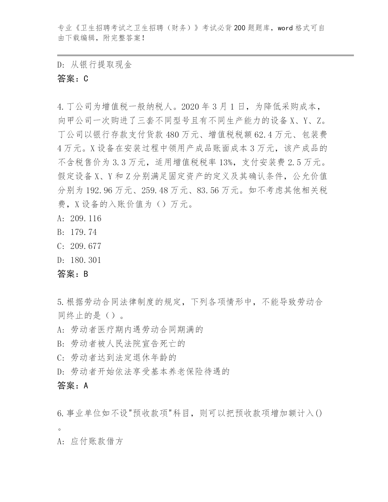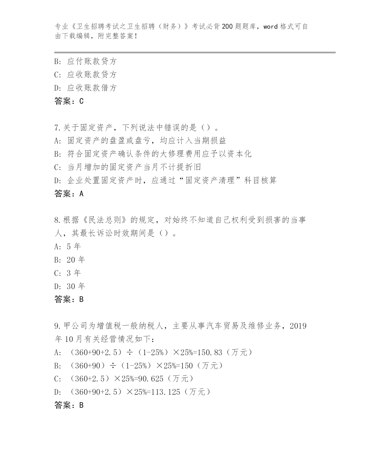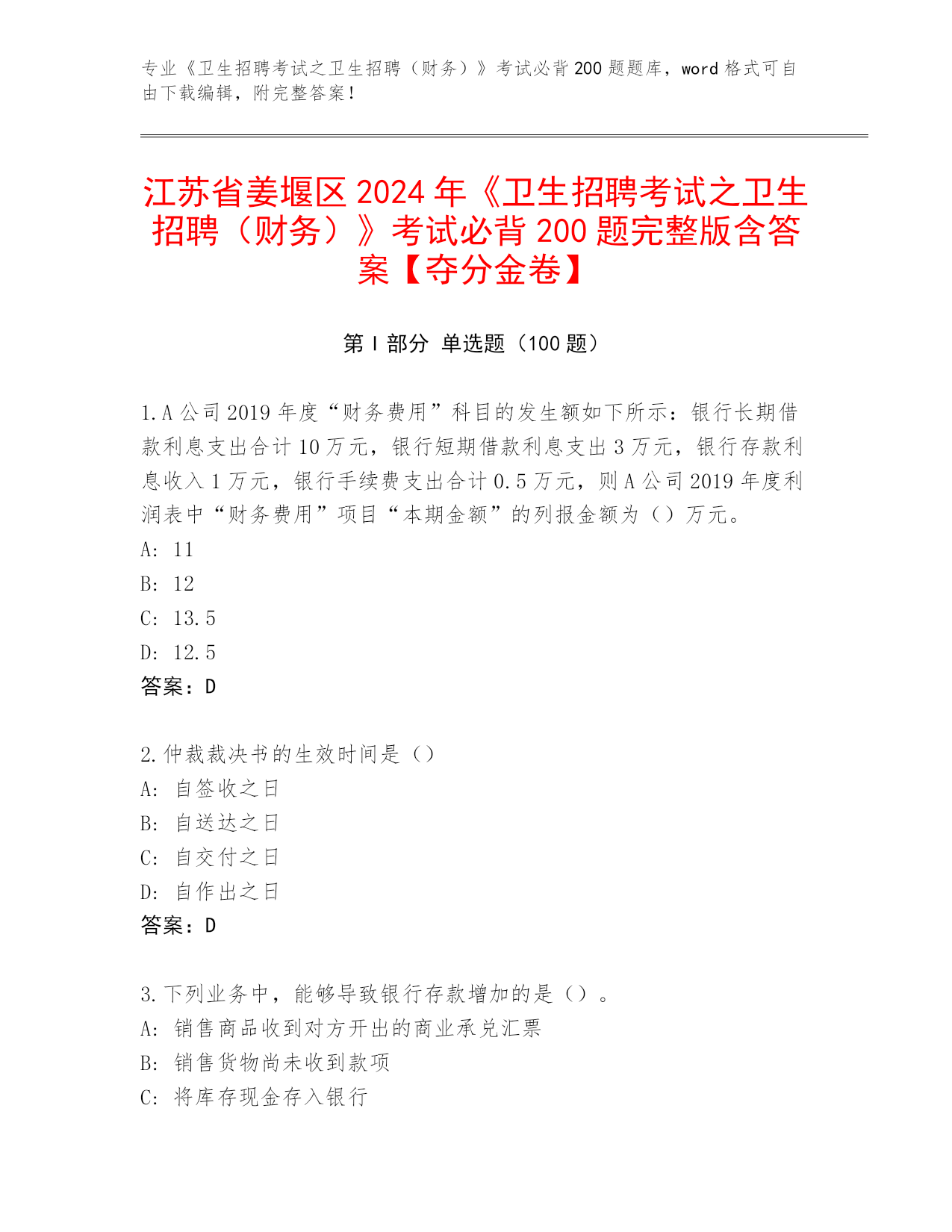 2024年江苏省姜堰区《卫生招聘考试之卫生招聘(财务)》资格考试必背200题通关秘籍题库附答案(夺分金卷)