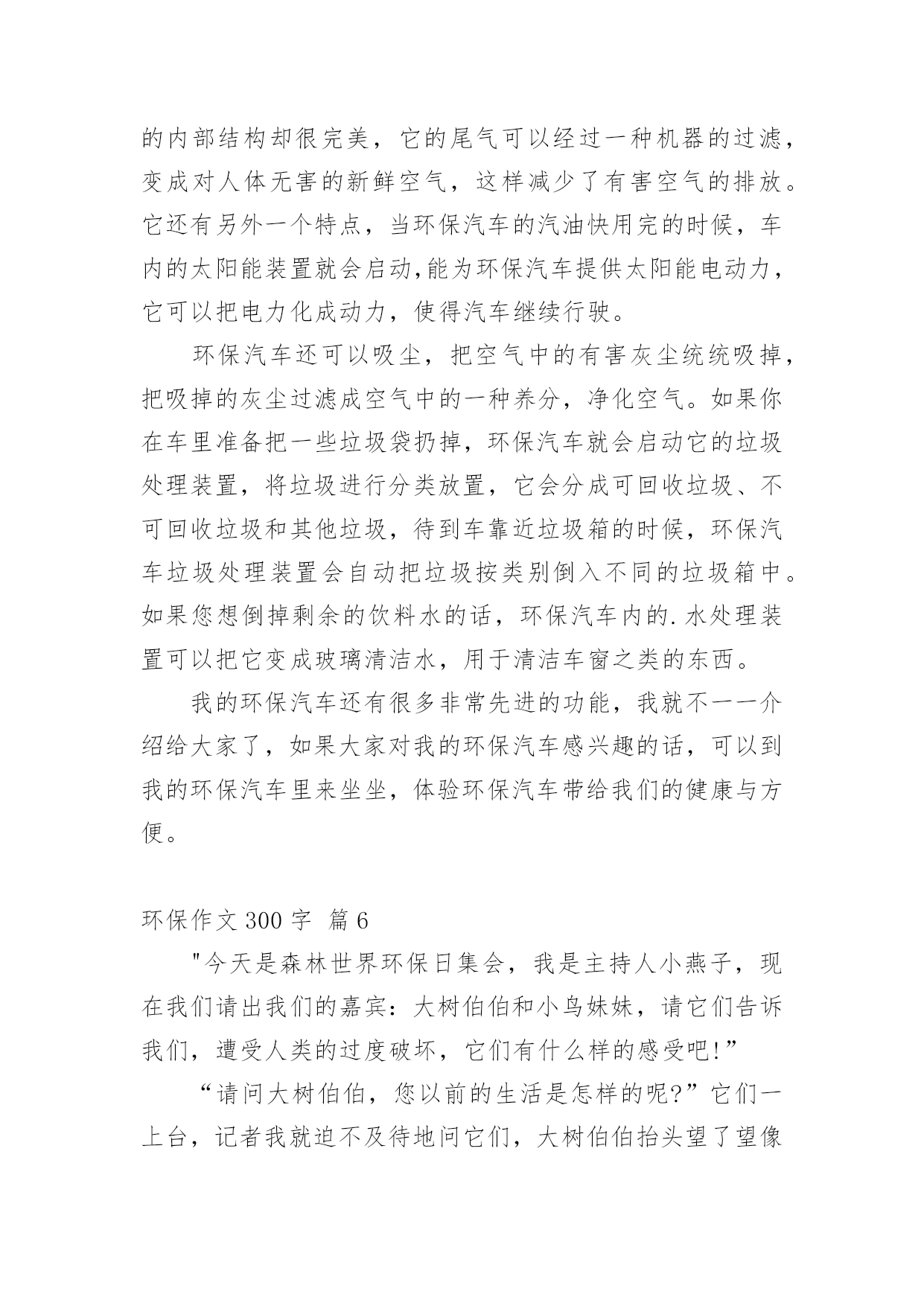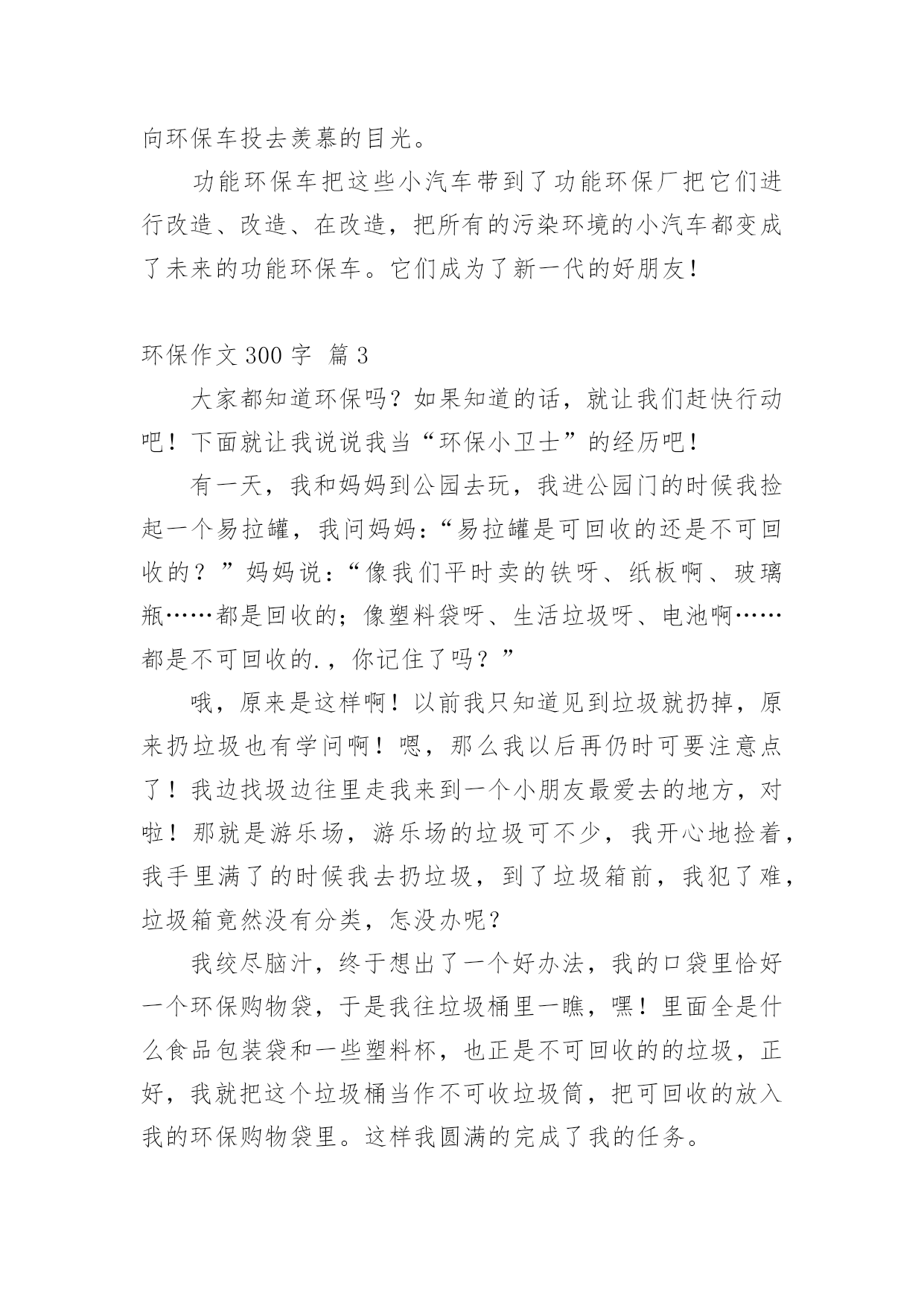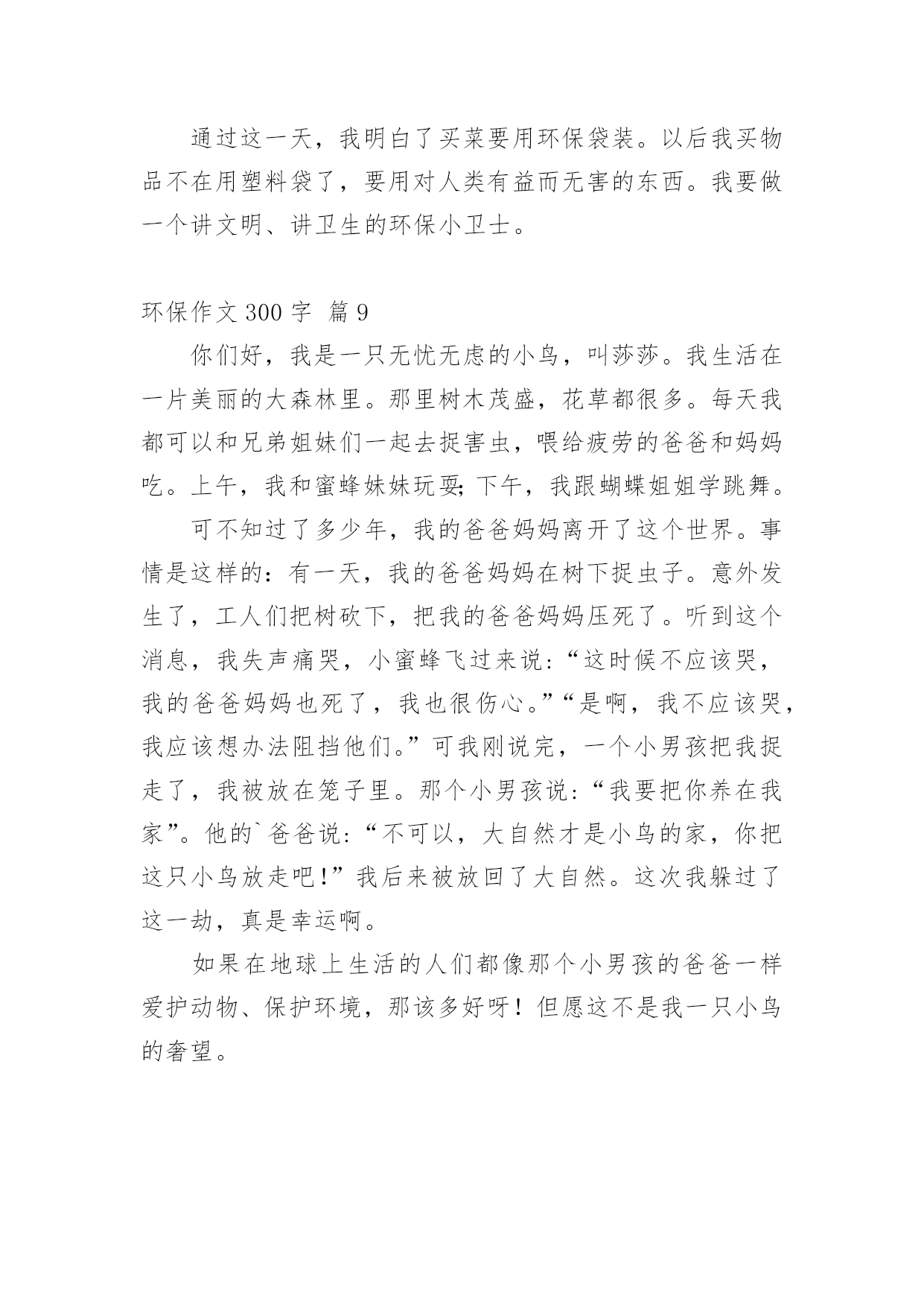 环保作文300字环保作文300字(9篇)在现实生活或工作学习中,说到作文,大家肯定都不陌生吧,作文是由文字组成,经过人的思想考虑,通过语言组织来表达一个主题意义的文体。那么你知道一篇好的作文该怎么写吗?以下是小编精心整理的环保作文300字9篇,仅供参考,希望能够帮助到大家。环保作文300字篇18月28日下午,美丽阳光假日小队的全队员在自己居住的小区做了一件非常有意义的事,在单元信报箱的旁边安装广告纸回收袋。每天去拿报纸的时候,信报箱里总是有很多数量不等的纸质小广告,而且信报箱的`旁边经常有被随手丢弃的广告废纸,非常影响小区的公共环境,现在这个问题可以得到解决了。28日下午,美丽阳光假日小队的队员们在单元信报箱的旁边安装了一只漂亮的“广告纸回收袋”。他们从家里拿来平时爸爸妈妈买东西装回来的纸袋,在后面贴上泡沫双面胶,在袋子的正面写上——广告纸回收袋。再在安装好的回收袋上方贴上环保小贴士——绿色生活从你我做起只要您用一点点心。提醒各位拿报纸的住户,养成爱护环境卫生的好习惯。有了这只漂亮的小回收袋,以后小区清洁员在每天清扫楼道时,可以顺便将其带走,当废纸张回收处理。这样既方便居民处理这些小广告垃圾,又将这些小广告回收成可利用的纸张。活动结束后,队员们看着一只只自己亲手制作安装的小小回收袋,都说以后拿报纸再也不用发愁可恶的小广告纸没地方放了。环保作文300字篇2大家好!我是来自未来的功能环保车,住在空气新鲜,环境优雅的城市里。嘀!嘀!功能环保车向一辆小汽车行驶过来,小汽车说:“你是谁?我怎么从来没见过你?”环保车说:“我是来自未来的功能环保车。”小汽车说:“未来?什么未来?现在的时间还没有过去呢!谈什么未来?有我们小汽车在,要什么你这样的破车呀!”“不要这样辱骂我,我是新一代的功能环保车。”环保车说。过了一会儿,功能环保车提议,你们不相信我比你们先进,那我们就比试比试,说着,它们就都把自己开到了广场。小汽车说:“比就比,我才不怕你呢!你说吧比什么?”“比速度,”环保车说。说着说着,它们就比了起来。它们分别由各种的'小汽车轮流和功能环保车比一场。车行驶在广场上,每辆小汽车的后面冒着浓浓的尾气,而功能环保车的后面却没有尾气炉,特别环保。这时这些小汽车把整个城市变得烟气腾腾,污染很重。小汽车落后环保车很长一段距离。在终点,这些小汽车看到城市被污染的样子,羞愧万分,都向环保车投去羡慕的目光。功能环保车把这些小汽车带到了功能环保厂把它们进行改造、改造、在改造,把所有的污染环境的小汽车都变成了未来的功能环保车。它们成为了新一代的好朋友!环保作文300字篇3大家都知道环保吗?如果知道的话,就让我们赶快行动吧!下面就让我说说我当“环保小卫士”的经历吧!有一天,我和妈妈到公园去玩,我进公园门的时候我捡起一个易拉罐,我问妈妈:“易拉罐是可回收的还是不可回收的?”妈妈说:“像我们平时卖的铁呀、纸板啊、玻璃瓶……都是回收的;像塑料袋呀、生活垃圾呀、电池啊……都是不可回收的.,你记住了吗?”哦,原来是这样啊!以前我只知道见到垃圾就扔掉,原来扔垃圾也有学问啊!嗯,那么我以后再仍时可要注意点了!我边找圾边往里走我来到一个小朋友最爱去的地方,对啦!那就是游乐场,游乐场的垃圾可不少,我开心地捡着,我手里满了的时候我去扔垃圾,到了垃圾箱前,我犯了难,垃圾箱竟然没有分类,怎没办呢?我绞尽脑汁,终于想出了一个好办法,我的口袋里恰好一个环保购物袋,于是我往垃圾桶里一瞧,嘿!里面全是什么食品包装袋和一些塑料杯,也正是不可回收的的垃圾,正好,我就把这个垃圾桶当作不可收垃圾筒,把可回收的放入我的环保购物袋里。这样我圆满的完成了我的任务。当“环保小卫士”有趣,我真去在平时生活中,我也要争当环保小卫士!环保作文300字篇4今天是植树节。为了环保,我们打算不开车,骑车去户外游玩。经过西湖边,我看见一棵棵柳树抽出了嫩叶,正如诗人贺知章写的碧玉妆成一树高,万条垂下绿丝绦。美丽极了。平时坐车的时候,窗外的风景总是匆匆而过,从来不曾引起我的注意,现在才发现骑车可以欣赏一路的美景。来到宝石山上,我们在山后找了一块向阳、松软的土地,拿出随身带来的`花籽,把花籽均匀地撒在土上,再盖上薄薄一层土。我还在花旁找到一块石头,在上面做了一个记号,打算经常去看它。下山的时候,我们发现有游客把零食袋扔在了地上,我们就把它捡起,扔进垃圾筒。地球已经存在了46亿年,而我们人类的历史只有几百万年。我想地球应该因为人类的出现更绿,更美好。环保作文300字篇5我经常感觉到周围的空气不新鲜,因为总是有汽车尾气的污染,既不环保又伤害人类健康,所以我长大要发明一种环保汽车。它外表的颜色是草绿色的,在草丛中很难看到它。但它的内部结构却很完美,它的尾气可以经过一种机器的过滤,变成对人体无害的新鲜空气,这样减少了有害空气的排放。它