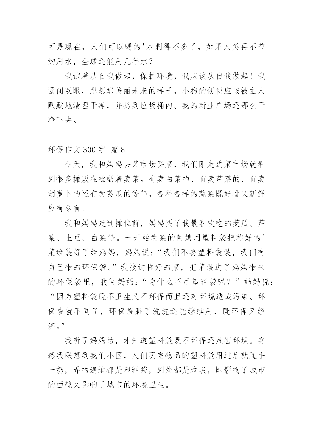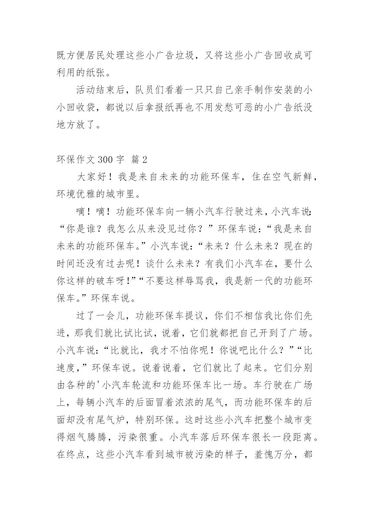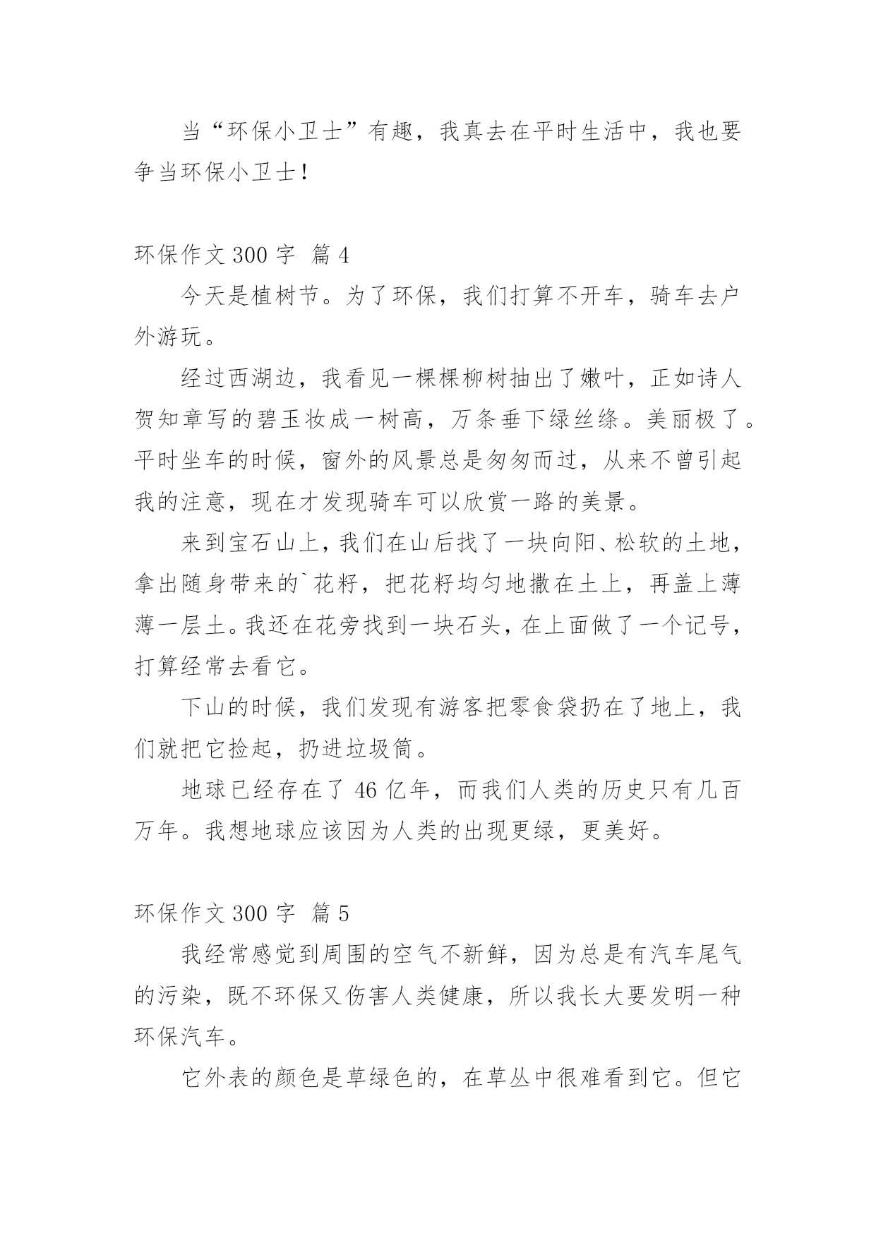 环保作文300字环保作文300字(9篇)在现实生活或工作学习中,说到作文,大家肯定都不陌生吧,作文是由文字组成,经过人的思想考虑,通过语言组织来表达一个主题意义的文体。那么你知道一篇好的作文该怎么写吗?以下是小编精心整理的环保作文300字9篇,仅供参考,希望能够帮助到大家。环保作文300字篇18月28日下午,美丽阳光假日小队的全队员在自己居住的小区做了一件非常有意义的事,在单元信报箱的旁边安装广告纸回收袋。每天去拿报纸的时候,信报箱里总是有很多数量不等的纸质小广告,而且信报箱的`旁边经常有被随手丢弃的广告废纸,非常影响小区的公共环境,现在这个问题可以得到解决了。28日下午,美丽阳光假日小队的队员们在单元信报箱的旁边安装了一只漂亮的“广告纸回收袋”。他们从家里拿来平时爸爸妈妈买东西装回来的纸袋,在后面贴上泡沫双面胶,在袋子的正面写上——广告纸回收袋。再在安装好的回收袋上方贴上环保小贴士——绿色生活从你我做起只要您用一点点心。提醒各位拿报纸的住户,养成爱护环境卫生的好习惯。有了这只漂亮的小回收袋,以后小区清洁员在每天清扫楼道时,可以顺便将其带走,当废纸张回收处理。这样既方便居民处理这些小广告垃圾,又将这些小广告回收成可利用的纸张。活动结束后,队员们看着一只只自己亲手制作安装的小小回收袋,都说以后拿报纸再也不用发愁可恶的小广告纸没地方放了。环保作文300字篇2大家好!我是来自未来的功能环保车,住在空气新鲜,环境优雅的城市里。嘀!嘀!功能环保车向一辆小汽车行驶过来,小汽车说:“你是谁?我怎么从来没见过你?”环保车说:“我是来自未来的功能环保车。”小汽车说:“未来?什么未来?现在的时间还没有过去呢!谈什么未来?有我们小汽车在,要什么你这样的破车呀!”“不要这样辱骂我,我是新一代的功能环保车。”环保车说。过了一会儿,功能环保车提议,你们不相信我比你们先进,那我们就比试比试,说着,它们就都把自己开到了广场。小汽车说:“比就比,我才不怕你呢!你说吧比什么?”“比速度,”环保车说。说着说着,它们就比了起来。它们分别由各种的'小汽车轮流和功能环保车比一场。车行驶在广场上,每辆小汽车的后面冒着浓浓的尾气,而功能环保车的后面却没有尾气炉,特别环保。这时这些小汽车把整个城市变得烟气腾腾,污染很重。小汽车落后环保车很长一段距离。在终点,这些小汽车看到城市被污染的样子,羞愧万分,都向环保车投去羡慕的目光。功能环保车把这些小汽车带到了功能环保厂把它们进行改造、改造、在改造,把所有的污染环境的小汽车都变成了未来的功能环保车。它们成为了新一代的好朋友!环保作文300字篇3大家都知道环保吗?如果知道的话,就让我们赶快行动吧!下面就让我说说我当“环保小卫士”的经历吧!有一天,我和妈妈到公园去玩,我进公园门的时候我捡起一个易拉罐,我问妈妈:“易拉罐是可回收的还是不可回收的?”妈妈说:“像我们平时卖的铁呀、纸板啊、玻璃瓶……都是回收的;像塑料袋呀、生活垃圾呀、电池啊……都是不可回收的.,你记住了吗?”哦,原来是这样啊!以前我只知道见到垃圾就扔掉,原来扔垃圾也有学问啊!嗯,那么我以后再仍时可要注意点了!我边找圾边往里走我来到一个小朋友最爱去的地方,对啦!那就是游乐场,游乐场的垃圾可不少,我开心地捡着,我手里满了的时候我去扔垃圾,到了垃圾箱前,我犯了难,垃圾箱竟然没有分类,怎没办呢?我绞尽脑汁,终于想出了一个好办法,我的口袋里恰好一个环保购物袋,于是我往垃圾桶里一瞧,嘿!里面全是什么食品包装袋和一些塑料杯,也正是不可回收的的垃圾,正好,我就把这个垃圾桶当作不可收垃圾筒,把可回收的放入我的环保购物袋里。这样我圆满的完成了我的任务。当“环保小卫士”有趣,我真去在平时生活中,我也要争当环保小卫士!环保作文300字篇4今天是植树节。为了环保,我们打算不开车,骑车去户外游玩。经过西湖边,我看见一棵棵柳树抽出了嫩叶,正如诗人贺知章写的碧玉妆成一树高,万条垂下绿丝绦。美丽极了。平时坐车的时候,窗外的风景总是匆匆而过,从来不曾引起我的注意,现在才发现骑车可以欣赏一路的美景。来到宝石山上,我们在山后找了一块向阳、松软的土地,拿出随身带来的`花籽,把花籽均匀地撒在土上,再盖上薄薄一层土。我还在花旁找到一块石头,在上面做了一个记号,打算经常去看它。下山的时候,我们发现有游客把零食袋扔在了地上,我们就把它捡起,扔进垃圾筒。地球已经存在了46亿年,而我们人类的历史只有几百万年。我想地球应该因为人类的出现更绿,更美好。环保作文300字篇5我经常感觉到周围的空气不新鲜,因为总是有汽车尾气的污染,既不环保又伤害人类健康,所以我长大要发明一种环保汽车。它外表的颜色是草绿色的,在草丛中很难看到它。但它的内部结构却很完美,它的尾气可以经过一种机器的过滤,变成对人体无害的新鲜空气,这样减少了有害空气的排放。它