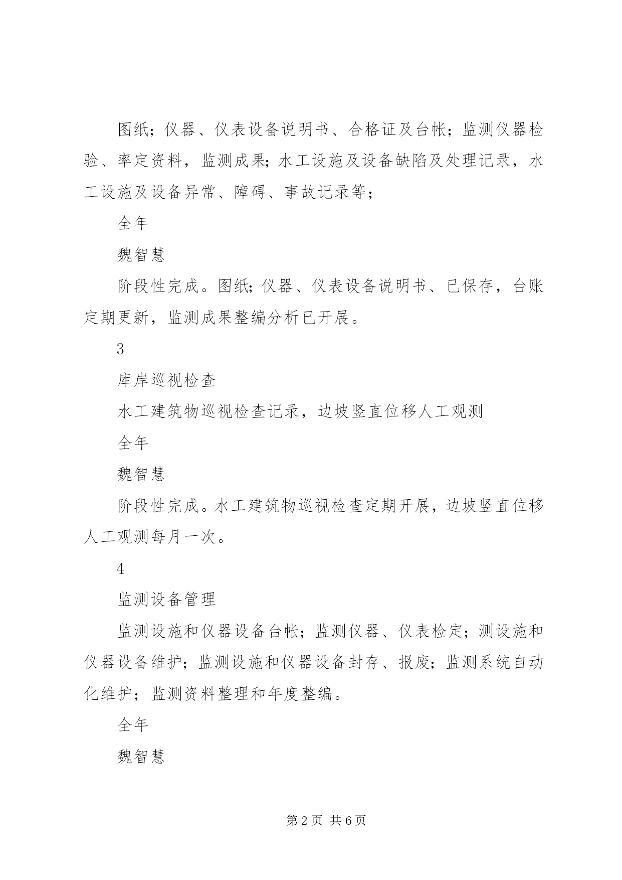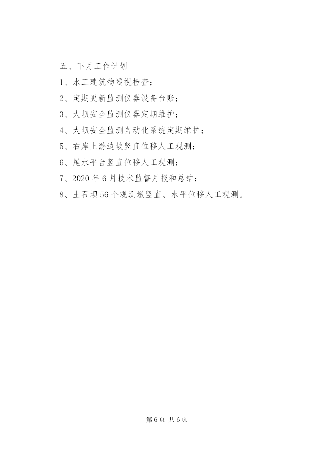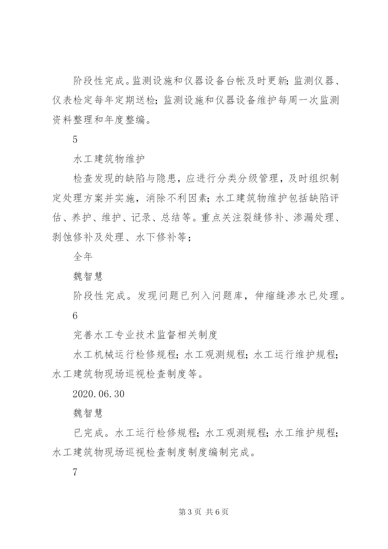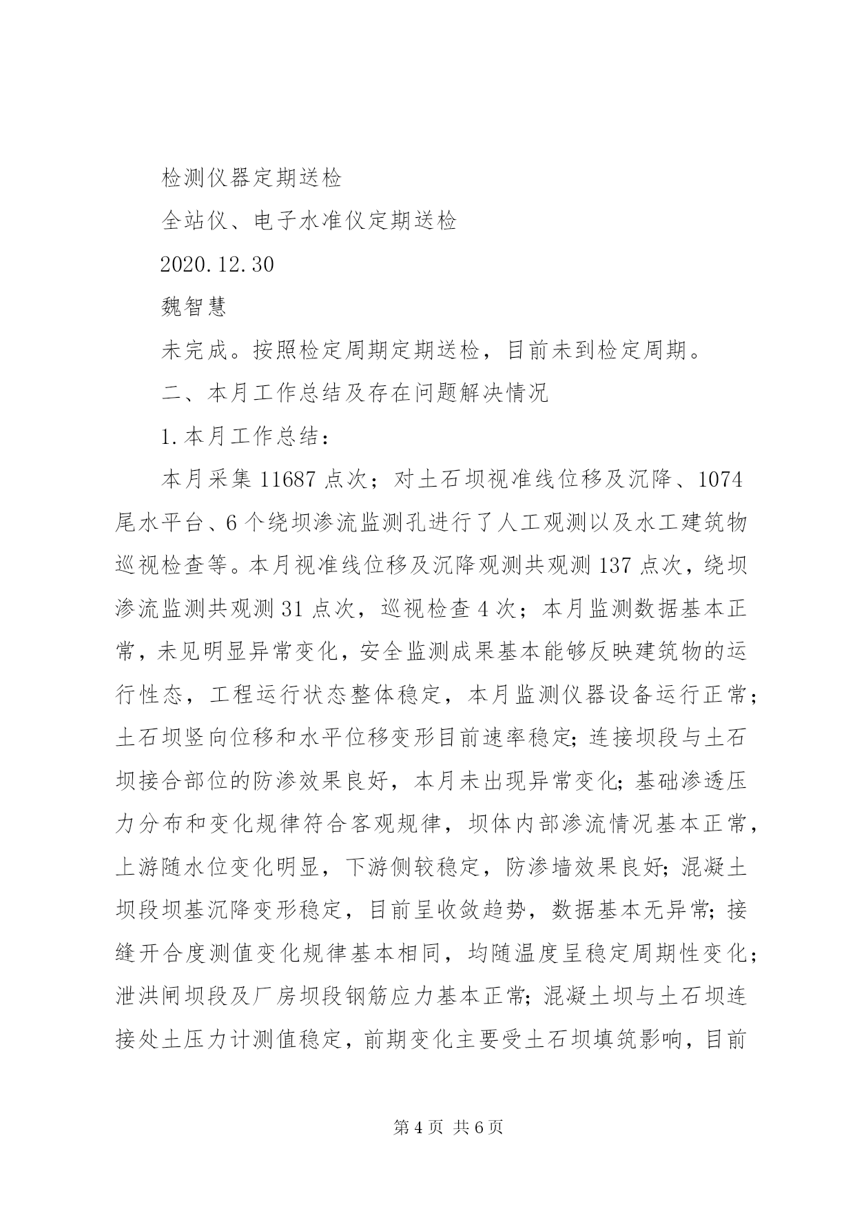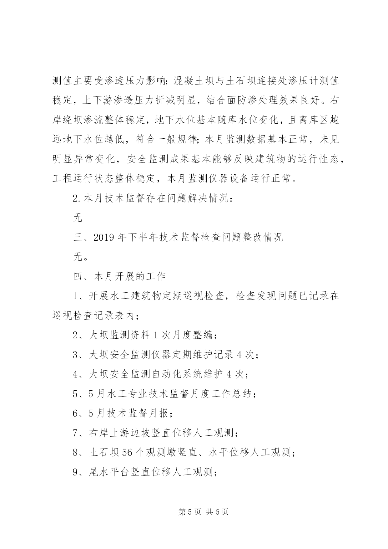 第PAGE\*Arabic\*MERGEFORMAT6页共NUMPAGES\*MERGEFORMAT6页安全生产水工专业技术监督工作总结一、计划完成情况(截止5月31日)水工专业全年共7项工作,按计划本月应完成0项,实际完成0项,完成率100%。详细见下表序号计划项目实施措施时间节点责任人完成情况(未完成原因)1水工建筑物安全检查水工建筑物巡视检查记录;汛前、汛后巡视检查;年度详查表全年魏智慧阶段性完成。汛前、汛中以及每周2次水工建筑物巡视检查定期开展。2技术档案图纸;仪器、仪表设备说明书、合格证及台帐;监测仪器检验、率定资料,监测成果;水工设施及设备缺陷及处理记录,水工设施及设备异常、障碍、事故记录等;全年魏智慧阶段性完成。图纸;仪器、仪表设备说明书、已保存,台账定期更新,监测成果整编分析已开展。3库岸巡视检查水工建筑物巡视检查记录,边坡竖直位移人工观测全年魏智慧阶段性完成。水工建筑物巡视检查定期开展,边坡竖直位移人工观测每月一次。4监测设备管理监测设施和仪器设备台帐;监测仪器、仪表检定;测设施和仪器设备维护;监测设施和仪器设备封存、报废;监测系统自动化维护;监测资料整理和年度整编。全年魏智慧阶段性完成。监测设施和仪器设备台帐及时更新;监测仪器、仪表检定每年定期送检;监测设施和仪器设备维护每周一次监测资料整理和年度整编。5水工建筑物维护检查发现的缺陷与隐患,应进行分类分级管理,及时组织制定处理方案并实施,消除不利因素;水工建筑物维护包括缺陷评估、养护、维护、记录、总结等。重点关注裂缝修补、渗漏处理、剥蚀修补及处理、水下修补等;全年魏智慧阶段性完成。发现问题已列入问题库,伸缩缝渗水已处理。6完善水工专业技术监督相关制度水工机械运行检修规程;水工观测规程;水工运行维护规程;水工建筑物现场巡视检查制度等。2020.06.30魏智慧已完成。水工运行检修规程;水工观测规程;水工维护规程;水工建筑物现场巡视检查制度制度编制完成。7检测仪器定期送检全站仪、电子水准仪定期送检2020.12.30魏智慧未完成。按照检定周期定期送检,目前未到检定周期。二、本月工作总结及存在问题解决情况1.本月工作总结:本月采集11687点次;对土石坝视准线位移及沉降、1074尾水平台、6个绕坝渗流监测孔进行了人工观测以及水工建筑物巡视检查等。本月视准线位移及沉降观测共观测137点次,绕坝渗流监测共观测31点次,巡视检查4次;本月监测数据基本正常,未见明显异常变化,安全监测成果基本能够反映建筑物的运行性态,工程运行状态整体稳定,本月监测仪器设备运行正常;土石坝竖向位移和水平位移变形目前速率稳定;连接坝段与土石坝接合部位的防渗效果良好,本月未出现异常变化;基础渗透压力分布和变化规律符合客观规律,坝体内部渗流情况基本正常,上游随水位变化明显,下游侧较稳定,防渗墙效果良好;混凝土坝段坝基沉降变形稳定,目前呈收敛趋势,数据基本无异常;接缝开合度测值变化规律基本相同,均随温度呈稳定周期性变化;泄洪闸坝段及厂房坝段钢筋应力基本正常;混凝土坝与土石坝连接处土压力计测值稳定,前期变化主要受土石坝填筑影响,目前测值主要受渗透压力影响;混凝土坝与土石坝连接处渗压计测值稳定,上下游渗透压力折减明显,结合面防渗处理效果良好。右岸绕坝渗流整体稳定,地下水位基本随库水位变化,且离库区越远地下水位越低,符合一般规律;本月监测数据基本正常,未见明显异常变化,安全监测成果基本能够反映建筑物的运行性态,工程运行状态整体稳定,本月监测仪器设备运行正常。2.本月技术监督存在问题解决情况:无三、2019年下半年技术监督检查问题整改情况无。四、本月开展的工作1、开展水工建筑物定期巡视检查,检查发现问题已记录在巡视检查记录表内;2、大坝监测资料1次月度整编;3、大坝安全监测仪器定期维护记录4次;4、大坝安全监测自动化系统维护4次;5、5月水工专业技术监督月度工作总结;6、5月技术监督月报;7、右岸上游边坡竖直位移人工观测;8、土石坝56个观测墩竖直、水平位移人工观测;9、尾水平台竖直位移人工观测;五、下月工作计划1、水工建筑物巡视检查;2、定期更新监测仪器设备台账;3、大坝安全监测仪器定期维护;4、大坝安全监测自动化系统定期维护;5、右岸上游边坡竖直位移人工观测;6、尾水平台竖直位移人工观测;7、2020年6月技术监督月报和总结;8、土石坝56个观测墩竖直、水平位移人工观测。