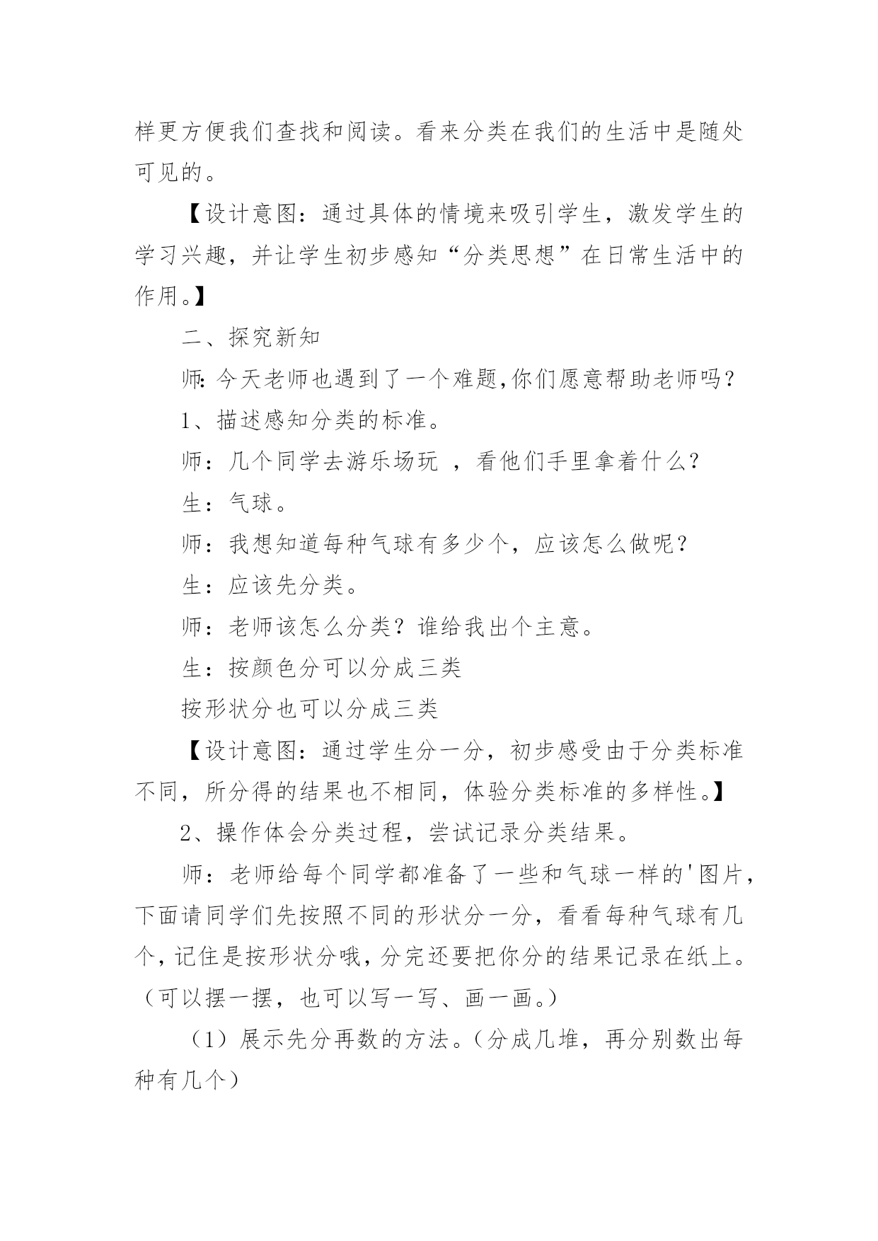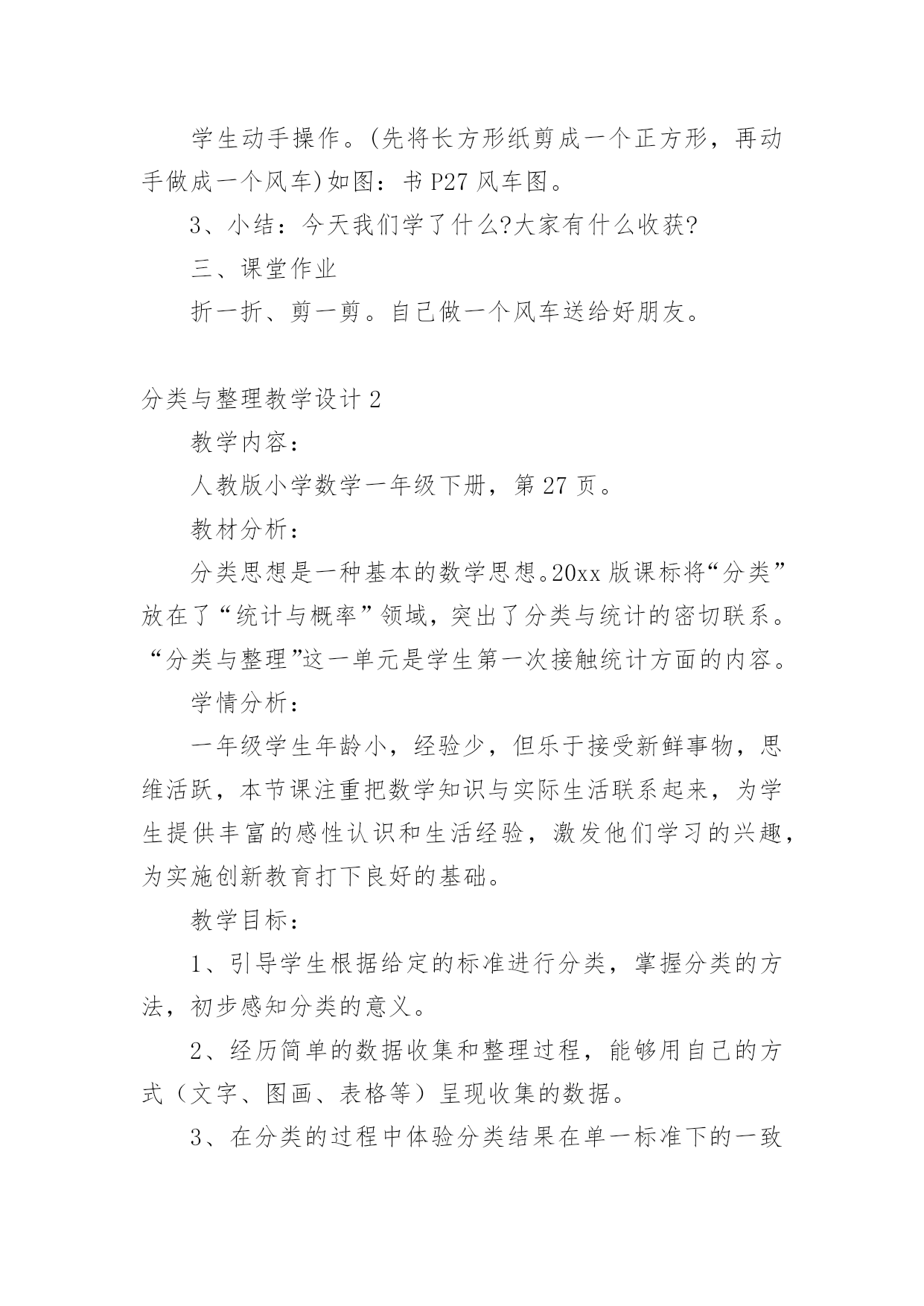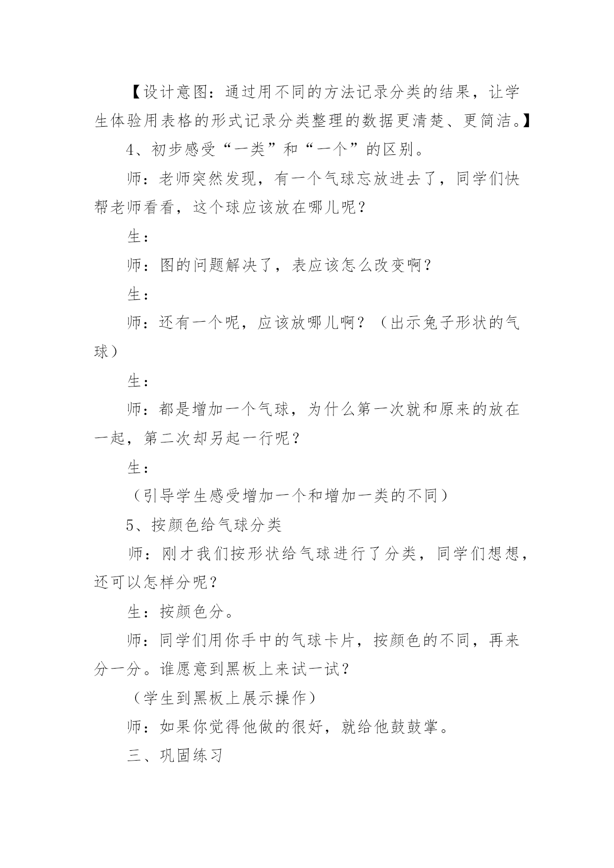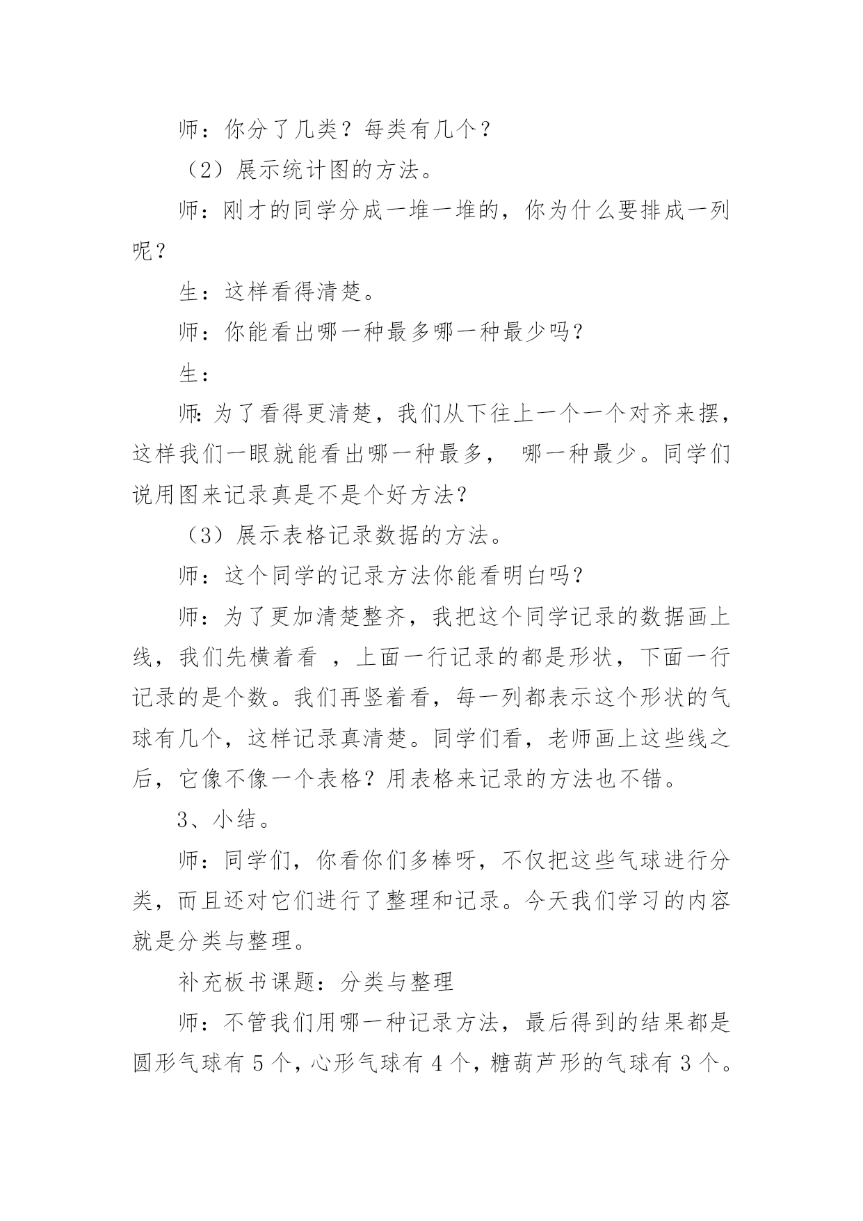 分类与整理教学设计作为一名教学工作者,时常要开展教学设计的准备工作,借助教学设计可以更好地组织教学活动。如何把教学设计做到重点突出呢?下面是小编精心整理的分类与整理教学设计,仅供参考,希望能够帮助到大家。分类与整理教学设计1教学内容:分类、整理教学目标:1、通过直观使学生知道长方形、正方形的形状和边的特点。2、通过折一折、摆一摆、剪一剪、拼一拼,加深对长方形和正方形的认识,能辨别、区分这两种图形。教学重点:通过操作让学生明白长方形和正方形各自的特点。教学难点:能够根据各自的特点进行简单区分与判断。教学过程:一、复习。出示长方形,请学生说一说长方形的边有什么特点。(两条长边相等,两条短边相等)再出示正方形,也请学生说一说正方形的边有什么特点。(四条边长度都相等)二、新课。1、拿出每人事先准备好的长方形、正方纸,师生共同操作。(1)引导学生先看正方形,先上下对折,边要对齐,看上下两部分是不是完全合在一起,上下两条边是不是完全合在一起;再左右对折,方法同上。然后把正方形纸的两个斜对着的角对齐,折后观察折痕两旁的部分是不是完全合在一起;再继续对折一次,观察折出的'几部分是不是完全合在一起,四条边是不是完全合在一起。(学生自己动手操作,得出结论)(2)用长方形纸折一折,看一看长方形的边长怎么样。要求学生先思考:怎样折长方形的纸,就能使分成的两部分完全合在一起?然后,自己动手折一折,以四人一小组进行讨论,再翻开课本进行核对。(3)区分长方形和正方形。拿出事先准备好的长方形和正方形(长方形的一边与正方形边长相等)先将两个图形重叠在一起,让学生观察:两个图形的边有什么关系?如图:2、学做风车。(1)先出示一个风车,将风车展开,让学生观察风车是由什么图形剪拼成的。(2)拿出准备的长方形纸,同桌互相商量,想一想要折一个风车该怎么做。学生动手操作。(先将长方形纸剪成一个正方形,再动手做成一个风车)如图:书P27风车图。3、小结:今天我们学了什么?大家有什么收获?三、课堂作业折一折、剪一剪。自己做一个风车送给好朋友。分类与整理教学设计2教学内容:人教版小学数学一年级下册,。教材分析:分类思想是一种基本的数学思想。20xx版课标将“分类”放在了“统计与概率”领域,突出了分类与统计的密切联系。“分类与整理”这一单元是学生第一次接触统计方面的内容。学情分析:一年级学生年龄小,经验少,但乐于接受新鲜事物,思维活跃,本节课注重把数学知识与实际生活联系起来,为学生提供丰富的感性认识和生活经验,激发他们学习的兴趣,为实施创新教育打下良好的基础。教学目标:1、引导学生根据给定的标准进行分类,掌握分类的方法,初步感知分类的意义。2、经历简单的数据收集和整理过程,能够用自己的方式(文字、图画、表格等)呈现收集的数据。3、在分类的过程中体验分类结果在单一标准下的一致性和不同标准下的多样性。教学重点难点:学会按不同标准进行分类,并记录分类结果。感受“一类”和“一个”的区别。教学过程:一、情境导入1、分礼物。师:今天老师给大家带来了一些礼物,谁能帮老师算一算一共有几件?生:4件红色的,2件蓝色的,4+2=6(件)师:还有不同意见吗?生:3件大的,3件小的,3+3=6(件)师:老师有一个疑问,都是想解决“一共有几件礼物”的问题,为什么同学们的方法却不一样呢?生:分成大的和小的,或者分成红的和蓝的。观察角度不同。师:不管是分成大的和小的,还是分成红的和蓝的,都是把这些礼物进行分类。今天我们就一起学习分类。板书课题:分类2、生活中的分类。师:你在生活中有没有见过分类现象呢?生:师:垃圾分类有利于环保,超市分类方便我们买东西,看我们学校的图书室,漂亮吗?这些书也是分类摆放的,这样更方便我们查找和阅读。看来分类在我们的生活中是随处可见的。【设计意图:通过具体的情境来吸引学生,激发学生的学习兴趣,并让学生初步感知“分类思想”在日常生活中的作用。】二、探究新知师:今天老师也遇到了一个难题,你们愿意帮助老师吗?1、描述感知分类的标准。师:几个同学去游乐场玩,看他们手里拿着什么?生:气球。师:我想知道每种气球有多少个,应该怎么做呢?生:应该先分类。师:老师该怎么分类?谁给我出个主意。生:按颜色分可以分成三类按形状分也可以分成三类【设计意图:通过学生分一分,初步感受由于分类标准不同,所分得的结果也不相同,体验分类标准的多样性。】2、操作体会分类过程,尝试记录分类结果。师:老师给每个同学都准备了一些和气球一样的'图片,下面请同学们先按照不同的形状分一分,看看每种气球有几个,记住是按形状分哦,分完还要把你分的结果记录在纸上。(可以摆一摆,也可以写一写、画一画。)(1)展示先分再数的方法。(分成几堆,再分别数出每种有几个)师:你分了几类?每类有几个?(2)展示统计图的方法。师:刚才的同学分成一堆一