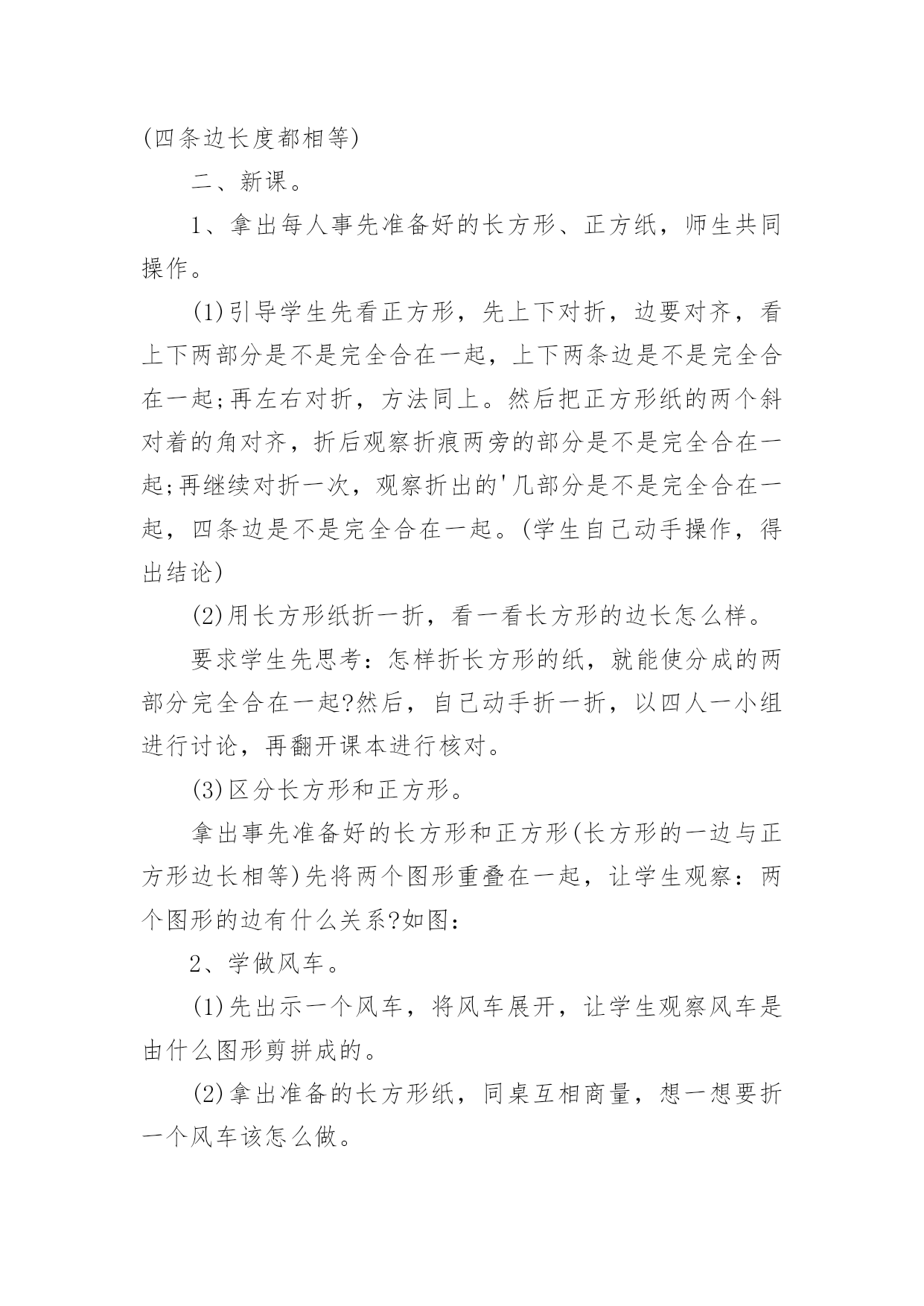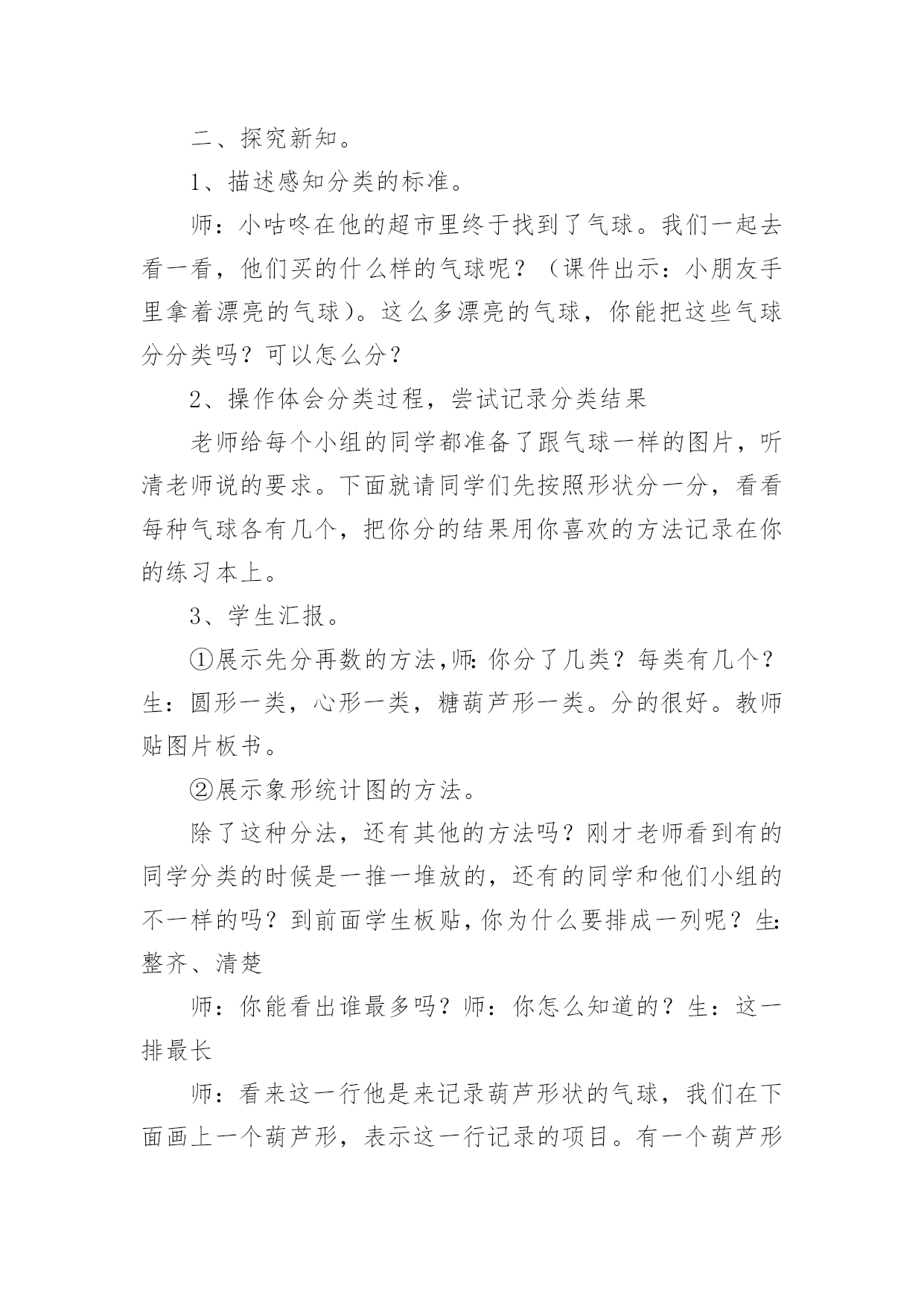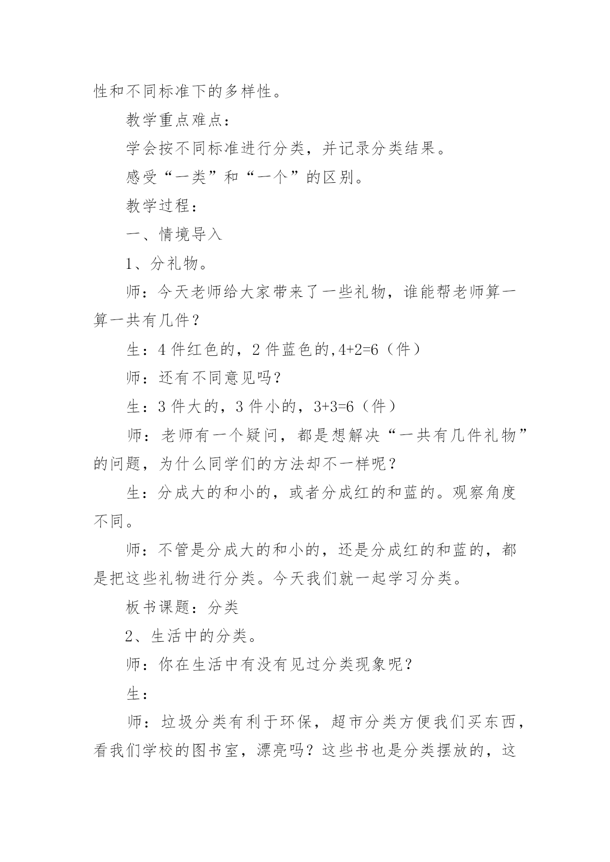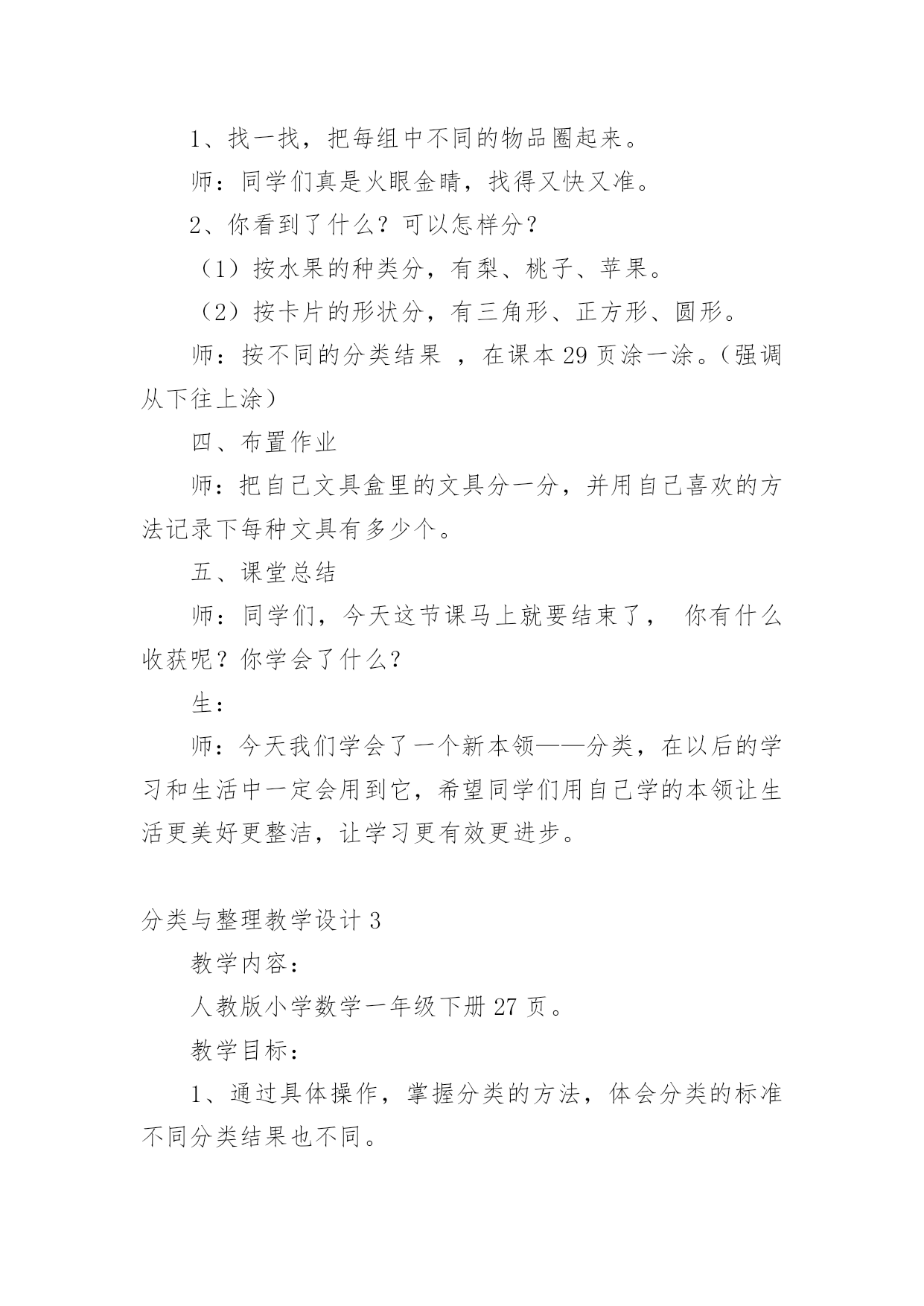 分类与整理教学设计作为一名教学工作者,时常要开展教学设计的准备工作,借助教学设计可以更好地组织教学活动。如何把教学设计做到重点突出呢?下面是小编精心整理的分类与整理教学设计,仅供参考,希望能够帮助到大家。分类与整理教学设计1教学内容:分类、整理教学目标:1、通过直观使学生知道长方形、正方形的形状和边的特点。2、通过折一折、摆一摆、剪一剪、拼一拼,加深对长方形和正方形的认识,能辨别、区分这两种图形。教学重点:通过操作让学生明白长方形和正方形各自的特点。教学难点:能够根据各自的特点进行简单区分与判断。教学过程:一、复习。出示长方形,请学生说一说长方形的边有什么特点。(两条长边相等,两条短边相等)再出示正方形,也请学生说一说正方形的边有什么特点。(四条边长度都相等)二、新课。1、拿出每人事先准备好的长方形、正方纸,师生共同操作。(1)引导学生先看正方形,先上下对折,边要对齐,看上下两部分是不是完全合在一起,上下两条边是不是完全合在一起;再左右对折,方法同上。然后把正方形纸的两个斜对着的角对齐,折后观察折痕两旁的部分是不是完全合在一起;再继续对折一次,观察折出的'几部分是不是完全合在一起,四条边是不是完全合在一起。(学生自己动手操作,得出结论)(2)用长方形纸折一折,看一看长方形的边长怎么样。要求学生先思考:怎样折长方形的纸,就能使分成的两部分完全合在一起?然后,自己动手折一折,以四人一小组进行讨论,再翻开课本进行核对。(3)区分长方形和正方形。拿出事先准备好的长方形和正方形(长方形的一边与正方形边长相等)先将两个图形重叠在一起,让学生观察:两个图形的边有什么关系?如图:2、学做风车。(1)先出示一个风车,将风车展开,让学生观察风车是由什么图形剪拼成的。(2)拿出准备的长方形纸,同桌互相商量,想一想要折一个风车该怎么做。学生动手操作。(先将长方形纸剪成一个正方形,再动手做成一个风车)如图:书P27风车图。3、小结:今天我们学了什么?大家有什么收获?三、课堂作业折一折、剪一剪。自己做一个风车送给好朋友。分类与整理教学设计2教学内容:人教版小学数学一年级下册,。教材分析:分类思想是一种基本的数学思想。20xx版课标将“分类”放在了“统计与概率”领域,突出了分类与统计的密切联系。“分类与整理”这一单元是学生第一次接触统计方面的内容。学情分析:一年级学生年龄小,经验少,但乐于接受新鲜事物,思维活跃,本节课注重把数学知识与实际生活联系起来,为学生提供丰富的感性认识和生活经验,激发他们学习的兴趣,为实施创新教育打下良好的基础。教学目标:1、引导学生根据给定的标准进行分类,掌握分类的方法,初步感知分类的意义。2、经历简单的数据收集和整理过程,能够用自己的方式(文字、图画、表格等)呈现收集的数据。3、在分类的过程中体验分类结果在单一标准下的一致性和不同标准下的多样性。教学重点难点:学会按不同标准进行分类,并记录分类结果。感受“一类”和“一个”的区别。教学过程:一、情境导入1、分礼物。师:今天老师给大家带来了一些礼物,谁能帮老师算一算一共有几件?生:4件红色的,2件蓝色的,4+2=6(件)师:还有不同意见吗?生:3件大的,3件小的,3+3=6(件)师:老师有一个疑问,都是想解决“一共有几件礼物”的问题,为什么同学们的方法却不一样呢?生:分成大的和小的,或者分成红的和蓝的。观察角度不同。师:不管是分成大的和小的,还是分成红的和蓝的,都是把这些礼物进行分类。今天我们就一起学习分类。板书课题:分类2、生活中的分类。师:你在生活中有没有见过分类现象呢?生:师:垃圾分类有利于环保,超市分类方便我们买东西,看我们学校的图书室,漂亮吗?这些书也是分类摆放的,这样更方便我们查找和阅读。看来分类在我们的生活中是随处可见的。【设计意图:通过具体的情境来吸引学生,激发学生的学习兴趣,并让学生初步感知“分类思想”在日常生活中的作用。】二、探究新知师:今天老师也遇到了一个难题,你们愿意帮助老师吗?1、描述感知分类的标准。师:几个同学去游乐场玩,看他们手里拿着什么?生:气球。师:我想知道每种气球有多少个,应该怎么做呢?生:应该先分类。师:老师该怎么分类?谁给我出个主意。生:按颜色分可以分成三类按形状分也可以分成三类【设计意图:通过学生分一分,初步感受由于分类标准不同,所分得的结果也不相同,体验分类标准的多样性。】2、操作体会分类过程,尝试记录分类结果。师:老师给每个同学都准备了一些和气球一样的'图片,下面请同学们先按照不同的形状分一分,看看每种气球有几个,记住是按形状分哦,分完还要把你分的结果记录在纸上。(可以摆一摆,也可以写一写、画一画。)(1)展示先分再数的方法。(分成几堆,再分别数出每种有几个)师:你分了几类?每类有几个?(2)展示统计图的方法。师:刚才的同学分成一堆一