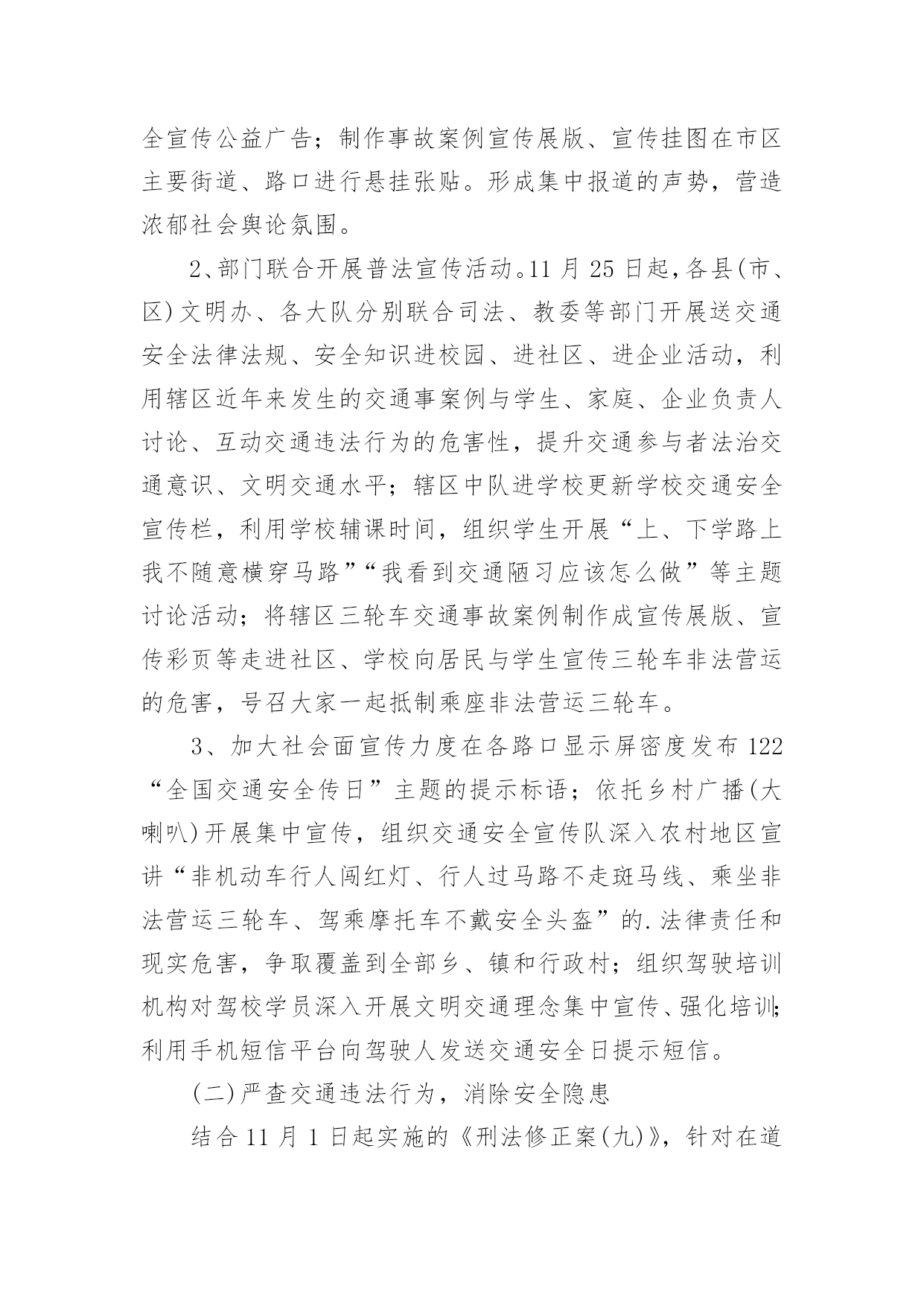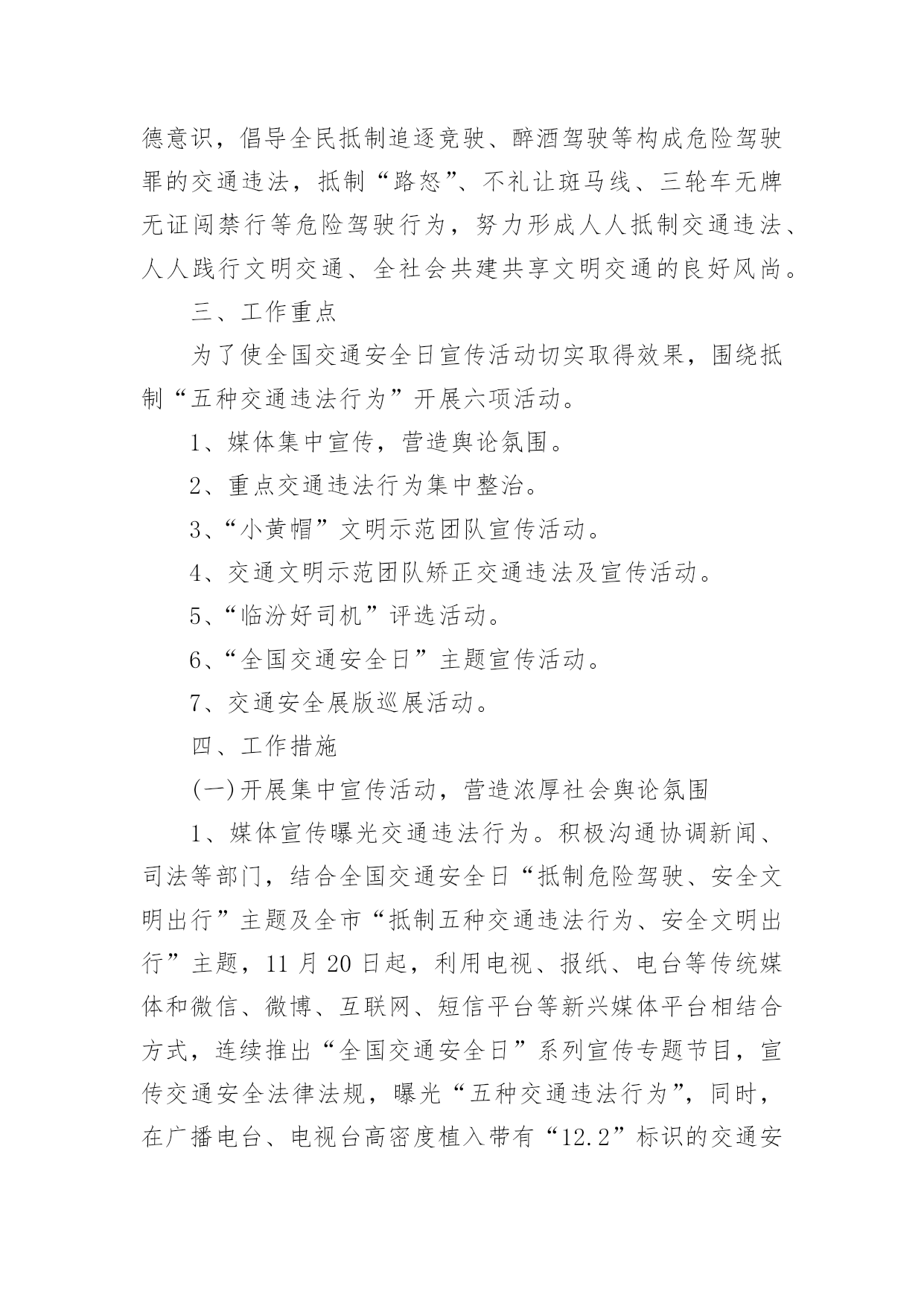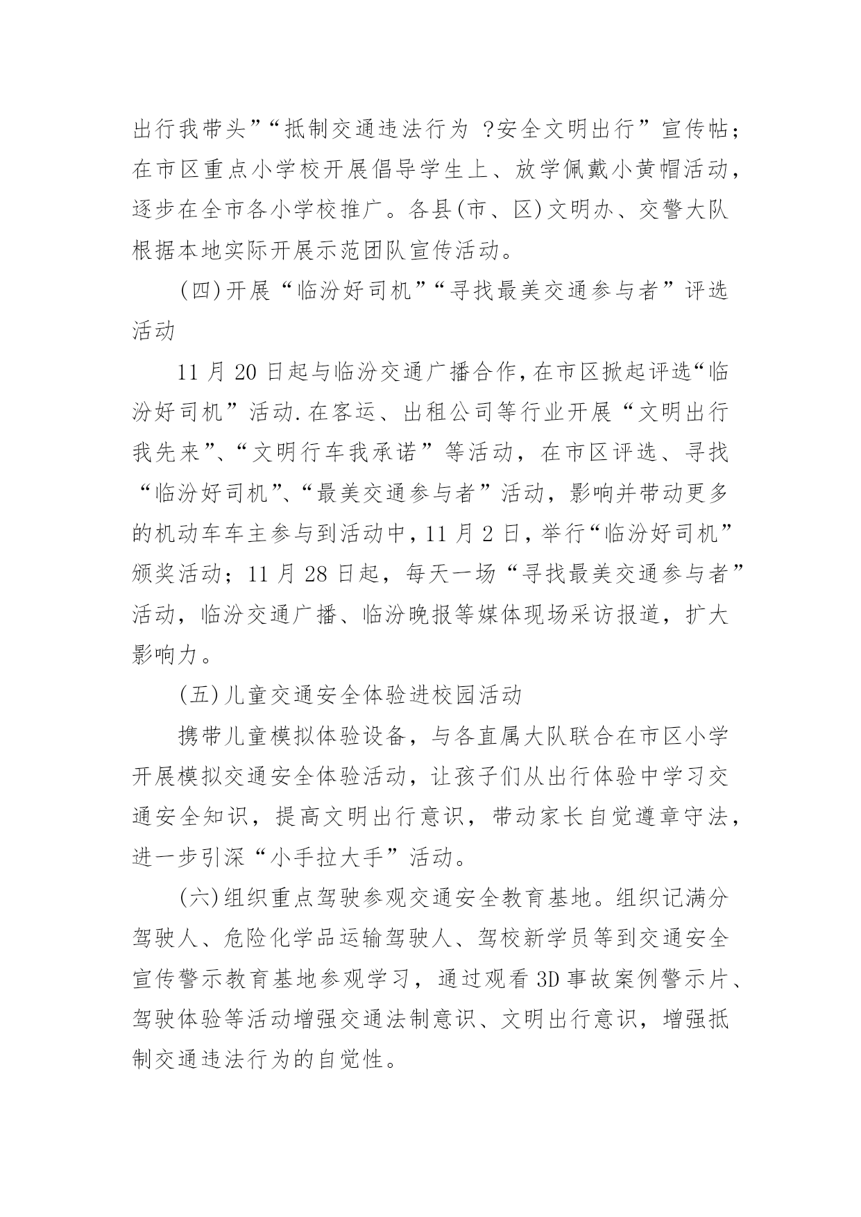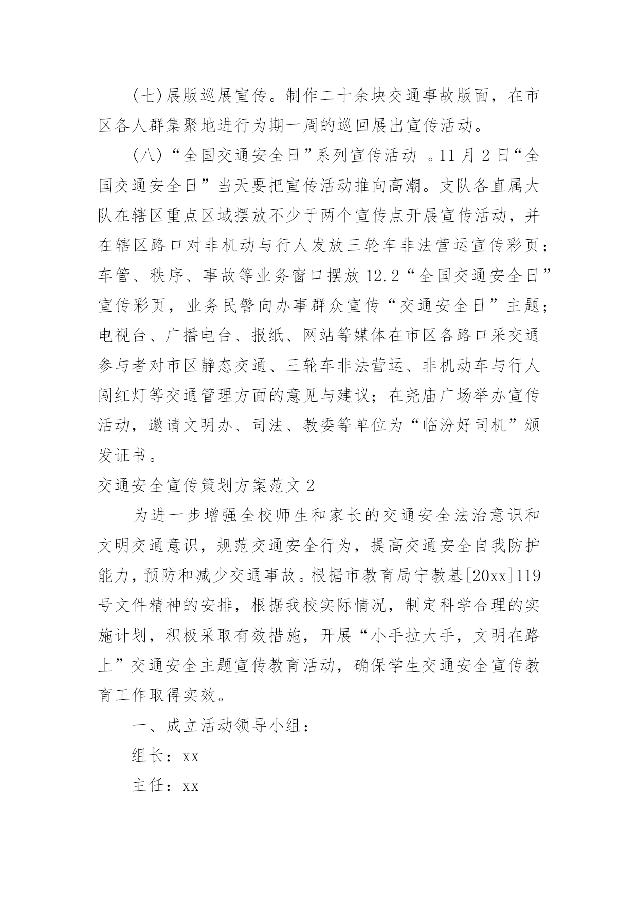 交通安全宣传策划方案交通安全宣传策划方案范文为有力保证事情或工作开展的水平质量,常常需要提前制定一份优秀的方案,方案的内容和形式都要围绕着主题来展开,最终达到预期的效果和意义。那么问题来了,方案应该怎么写?下面是小编收集整理的交通安全宣传策划方案范文,仅供参考,大家一起来看看吧。交通安全宣传策划方案范文1一、活动主题今年12月2日是国务院批准设立的第xx个“全国交通安全日”。根据临汾交通实际,确立临汾今年交通安全日主题为“抵制五种交通违法行为,安全文明出行”。五种交通违法行为即:非机动车行人闯红灯、行人过马路不走斑马线、乘坐非法营运三轮车、驾乘摩托车不戴安全头盔、机动车违法变道。二、工作目标紧紧围绕交通安全法律法规,结合全国交通安全日主题,针对临汾普遍存在的非机动车行人闯红灯等交通违法行为,组织122“全国交通安全日”主题活动,弘扬交通安全法治精神,普及交通安全风险防范知识,进一步倡导通行规则意识、守法自律意识、社会责任意识、文明交通意识、公共道德意识,倡导全民抵制追逐竞驶、醉酒驾驶等构成危险驾驶罪的交通违法,抵制“路怒”、不礼让斑马线、三轮车无牌无证闯禁行等危险驾驶行为,努力形成人人抵制交通违法、人人践行文明交通、全社会共建共享文明交通的良好风尚。三、工作重点为了使全国交通安全日宣传活动切实取得效果,围绕抵制“五种交通违法行为”开展六项活动。1、媒体集中宣传,营造舆论氛围。2、重点交通违法行为集中整治。3、“小黄帽”文明示范团队宣传活动。4、交通文明示范团队矫正交通违法及宣传活动。5、“临汾好司机”评选活动。6、“全国交通安全日”主题宣传活动。7、交通安全展版巡展活动。四、工作措施(一)开展集中宣传活动,营造浓厚社会舆论氛围1、媒体宣传曝光交通违法行为。积极沟通协调新闻、司法等部门,结合全国交通安全日“抵制危险驾驶、安全文明出行”主题及全市“抵制五种交通违法行为、安全文明出行”主题,11月20日起,利用电视、报纸、电台等传统媒体和微信、微博、互联网、短信平台等新兴媒体平台相结合方式,连续推出“全国交通安全日”系列宣传专题节目,宣传交通安全法律法规,曝光“五种交通违法行为”,同时,在广播电台、电视台高密度植入带有“12.2”标识的交通安全宣传公益广告;制作事故案例宣传展版、宣传挂图在市区主要街道、路口进行悬挂张贴。形成集中报道的声势,营造浓郁社会舆论氛围。2、部门联合开展普法宣传活动。11月25日起,各县(市、区)文明办、各大队分别联合司法、教委等部门开展送交通安全法律法规、安全知识进校园、进社区、进企业活动,利用辖区近年来发生的交通事案例与学生、家庭、企业负责人讨论、互动交通违法行为的危害性,提升交通参与者法治交通意识、文明交通水平;辖区中队进学校更新学校交通安全宣传栏,利用学校辅课时间,组织学生开展“上、下学路上我不随意横穿马路”“我看到交通陋习应该怎么做”等主题讨论活动;将辖区三轮车交通事故案例制作成宣传展版、宣传彩页等走进社区、学校向居民与学生宣传三轮车非法营运的危害,号召大家一起抵制乘座非法营运三轮车。3、加大社会面宣传力度在各路口显示屏密度发布122“全国交通安全传日”主题的提示标语;依托乡村广播(大喇叭)开展集中宣传,组织交通安全宣传队深入农村地区宣讲“非机动车行人闯红灯、行人过马路不走斑马线、乘坐非法营运三轮车、驾乘摩托车不戴安全头盔”的.法律责任和现实危害,争取覆盖到全部乡、镇和行政村;组织驾驶培训机构对驾校学员深入开展文明交通理念集中宣传、强化培训;利用手机短信平台向驾驶人发送交通安全日提示短信。(二)严查交通违法行为,消除安全隐患结合11月1日起实施的《刑法修正案(九)》,针对在道路上驾驶未取得校车使用许可的机动车从事校车业务或者校车、旅客运输车辆严重超员、严重超速,违规运输危险化学品等危险驾驶行为开展集中整治;临汾市区道路着重整治“非机动车行人闯红灯、行人过马路不走斑马线、乘坐非法营运三轮车、机动车违法变道”交通违法行为,邀请媒体随警采访,曝光典型违法行为,尤其是针对非法营运三轮车在加大整治力度的同时,要曝光及抄告乘座人所在单位、社区,特别是党员、干部、学生等群体乘座三轮被查后在抄告其所单位的同时,要在媒体予以曝光。在从根本上消除三轮车营运市场;各县市区交警大队要重点进行驾乘摩托车不带安全头盔的查处力度,进一步推动摩托车安全生命防护工程。(三)文明示范团队开展宣传活动充分发挥文明示范团队的示范效应,11月25日至12月2日,根据辖区实际,适时组织文明示范团队进行文明出行示范、非机动车与行人交通违法行为矫正及交通安全宣传活动。与《临汾晚报》合作,成立临汾晚报小记者文明示范团队,邀请小记者团队体验儿童交通安全模拟设施,赠送小记者文明出行小黄、发放小小文明出行监督员证,教育小记者自己文明出行的同时,提醒并