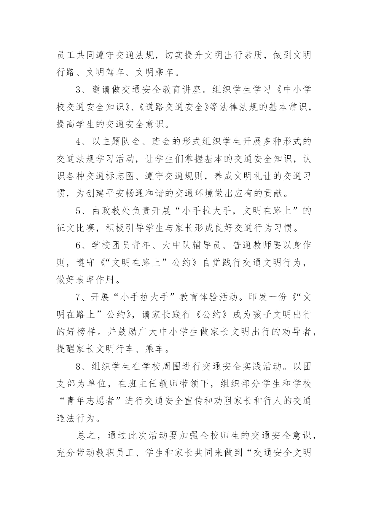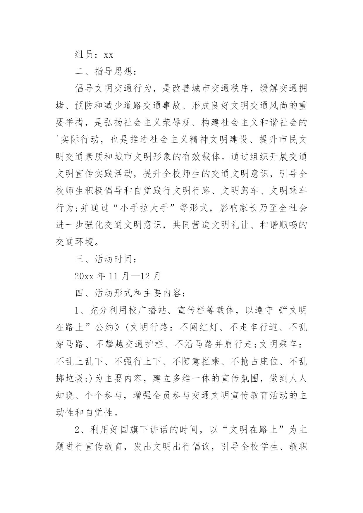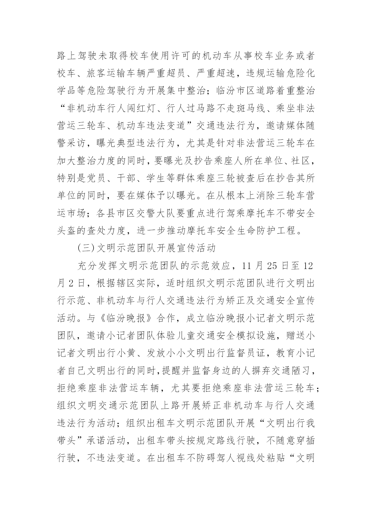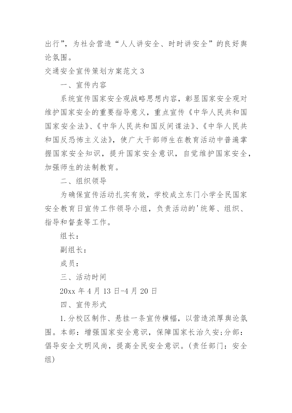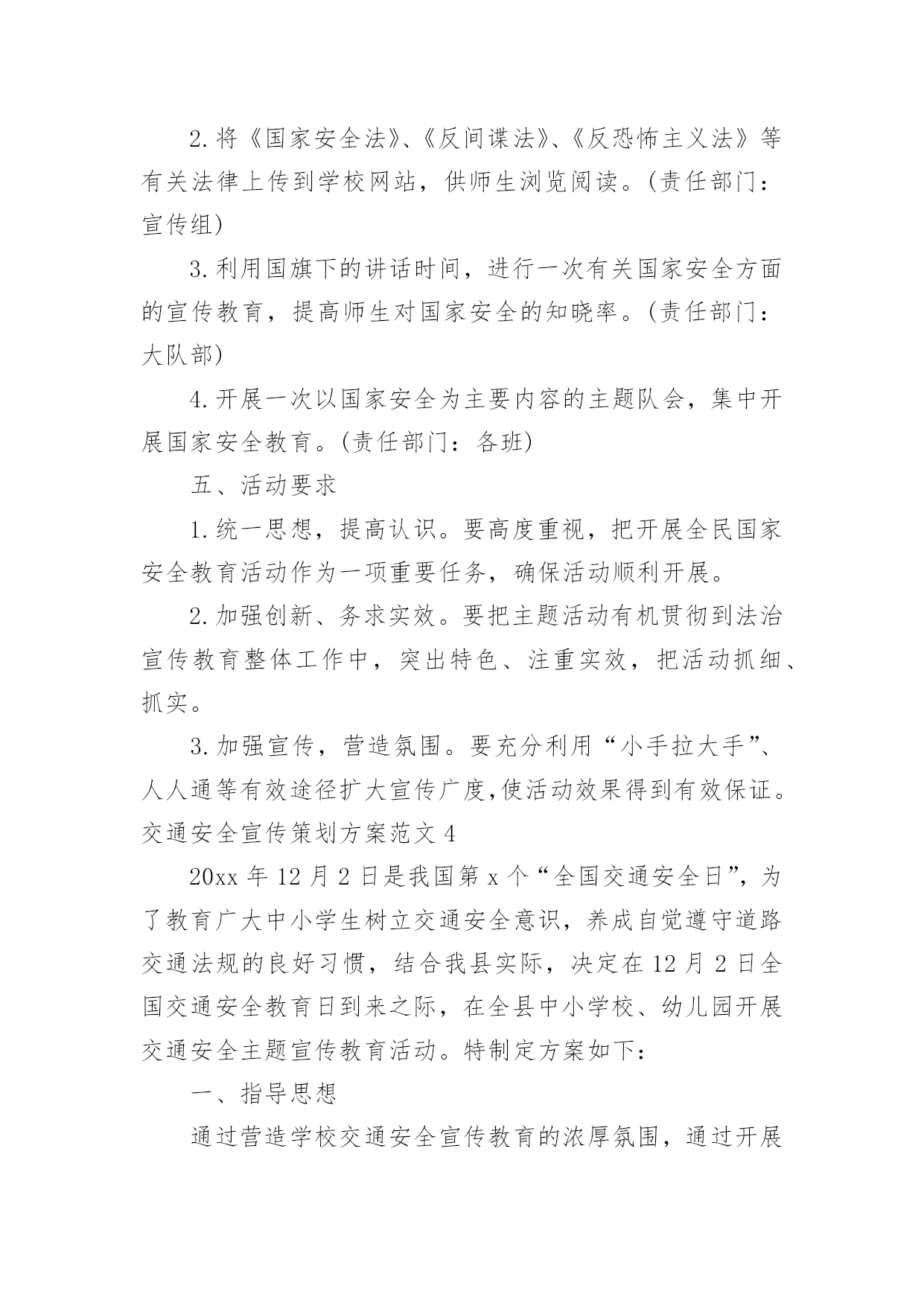 交通安全宣传策划方案交通安全宣传策划方案范文为有力保证事情或工作开展的水平质量,常常需要提前制定一份优秀的方案,方案的内容和形式都要围绕着主题来展开,最终达到预期的效果和意义。那么问题来了,方案应该怎么写?下面是小编收集整理的交通安全宣传策划方案范文,仅供参考,大家一起来看看吧。交通安全宣传策划方案范文1一、活动主题今年12月2日是国务院批准设立的第xx个“全国交通安全日”。根据临汾交通实际,确立临汾今年交通安全日主题为“抵制五种交通违法行为,安全文明出行”。五种交通违法行为即:非机动车行人闯红灯、行人过马路不走斑马线、乘坐非法营运三轮车、驾乘摩托车不戴安全头盔、机动车违法变道。二、工作目标紧紧围绕交通安全法律法规,结合全国交通安全日主题,针对临汾普遍存在的非机动车行人闯红灯等交通违法行为,组织122“全国交通安全日”主题活动,弘扬交通安全法治精神,普及交通安全风险防范知识,进一步倡导通行规则意识、守法自律意识、社会责任意识、文明交通意识、公共道德意识,倡导全民抵制追逐竞驶、醉酒驾驶等构成危险驾驶罪的交通违法,抵制“路怒”、不礼让斑马线、三轮车无牌无证闯禁行等危险驾驶行为,努力形成人人抵制交通违法、人人践行文明交通、全社会共建共享文明交通的良好风尚。三、工作重点为了使全国交通安全日宣传活动切实取得效果,围绕抵制“五种交通违法行为”开展六项活动。1、媒体集中宣传,营造舆论氛围。2、重点交通违法行为集中整治。3、“小黄帽”文明示范团队宣传活动。4、交通文明示范团队矫正交通违法及宣传活动。5、“临汾好司机”评选活动。6、“全国交通安全日”主题宣传活动。7、交通安全展版巡展活动。四、工作措施(一)开展集中宣传活动,营造浓厚社会舆论氛围1、媒体宣传曝光交通违法行为。积极沟通协调新闻、司法等部门,结合全国交通安全日“抵制危险驾驶、安全文明出行”主题及全市“抵制五种交通违法行为、安全文明出行”主题,11月20日起,利用电视、报纸、电台等传统媒体和微信、微博、互联网、短信平台等新兴媒体平台相结合方式,连续推出“全国交通安全日”系列宣传专题节目,宣传交通安全法律法规,曝光“五种交通违法行为”,同时,在广播电台、电视台高密度植入带有“12.2”标识的交通安全宣传公益广告;制作事故案例宣传展版、宣传挂图在市区主要街道、路口进行悬挂张贴。形成集中报道的声势,营造浓郁社会舆论氛围。2、部门联合开展普法宣传活动。11月25日起,各县(市、区)文明办、各大队分别联合司法、教委等部门开展送交通安全法律法规、安全知识进校园、进社区、进企业活动,利用辖区近年来发生的交通事案例与学生、家庭、企业负责人讨论、互动交通违法行为的危害性,提升交通参与者法治交通意识、文明交通水平;辖区中队进学校更新学校交通安全宣传栏,利用学校辅课时间,组织学生开展“上、下学路上我不随意横穿马路”“我看到交通陋习应该怎么做”等主题讨论活动;将辖区三轮车交通事故案例制作成宣传展版、宣传彩页等走进社区、学校向居民与学生宣传三轮车非法营运的危害,号召大家一起抵制乘座非法营运三轮车。3、加大社会面宣传力度在各路口显示屏密度发布122“全国交通安全传日”主题的提示标语;依托乡村广播(大喇叭)开展集中宣传,组织交通安全宣传队深入农村地区宣讲“非机动车行人闯红灯、行人过马路不走斑马线、乘坐非法营运三轮车、驾乘摩托车不戴安全头盔”的.法律责任和现实危害,争取覆盖到全部乡、镇和行政村;组织驾驶培训机构对驾校学员深入开展文明交通理念集中宣传、强化培训;利用手机短信平台向驾驶人发送交通安全日提示短信。(二)严查交通违法行为,消除安全隐患结合11月1日起实施的《刑法修正案(九)》,针对在道路上驾驶未取得校车使用许可的机动车从事校车业务或者校车、旅客运输车辆严重超员、严重超速,违规运输危险化学品等危险驾驶行为开展集中整治;临汾市区道路着重整治“非机动车行人闯红灯、行人过马路不走斑马线、乘坐非法营运三轮车、机动车违法变道”交通违法行为,邀请媒体随警采访,曝光典型违法行为,尤其是针对非法营运三轮车在加大整治力度的同时,要曝光及抄告乘座人所在单位、社区,特别是党员、干部、学生等群体乘座三轮被查后在抄告其所单位的同时,要在媒体予以曝光。在从根本上消除三轮车营运市场;各县市区交警大队要重点进行驾乘摩托车不带安全头盔的查处力度,进一步推动摩托车安全生命防护工程。(三)文明示范团队开展宣传活动充分发挥文明示范团队的示范效应,11月25日至12月2日,根据辖区实际,适时组织文明示范团队进行文明出行示范、非机动车与行人交通违法行为矫正及交通安全宣传活动。与《临汾晚报》合作,成立临汾晚报小记者文明示范团队,邀请小记者团队体验儿童交通安全模拟设施,赠送小记者文明出行小黄、发放小小文明出行监督员证,教育小记者自己文明出行的同时,提醒并