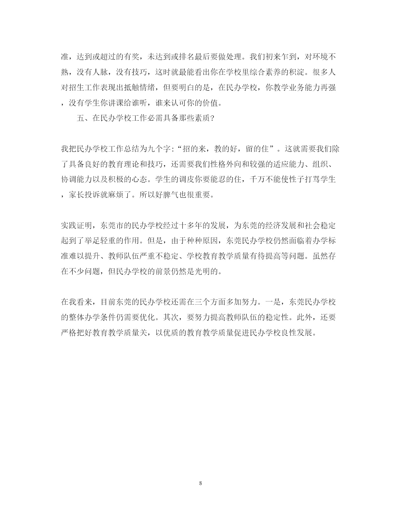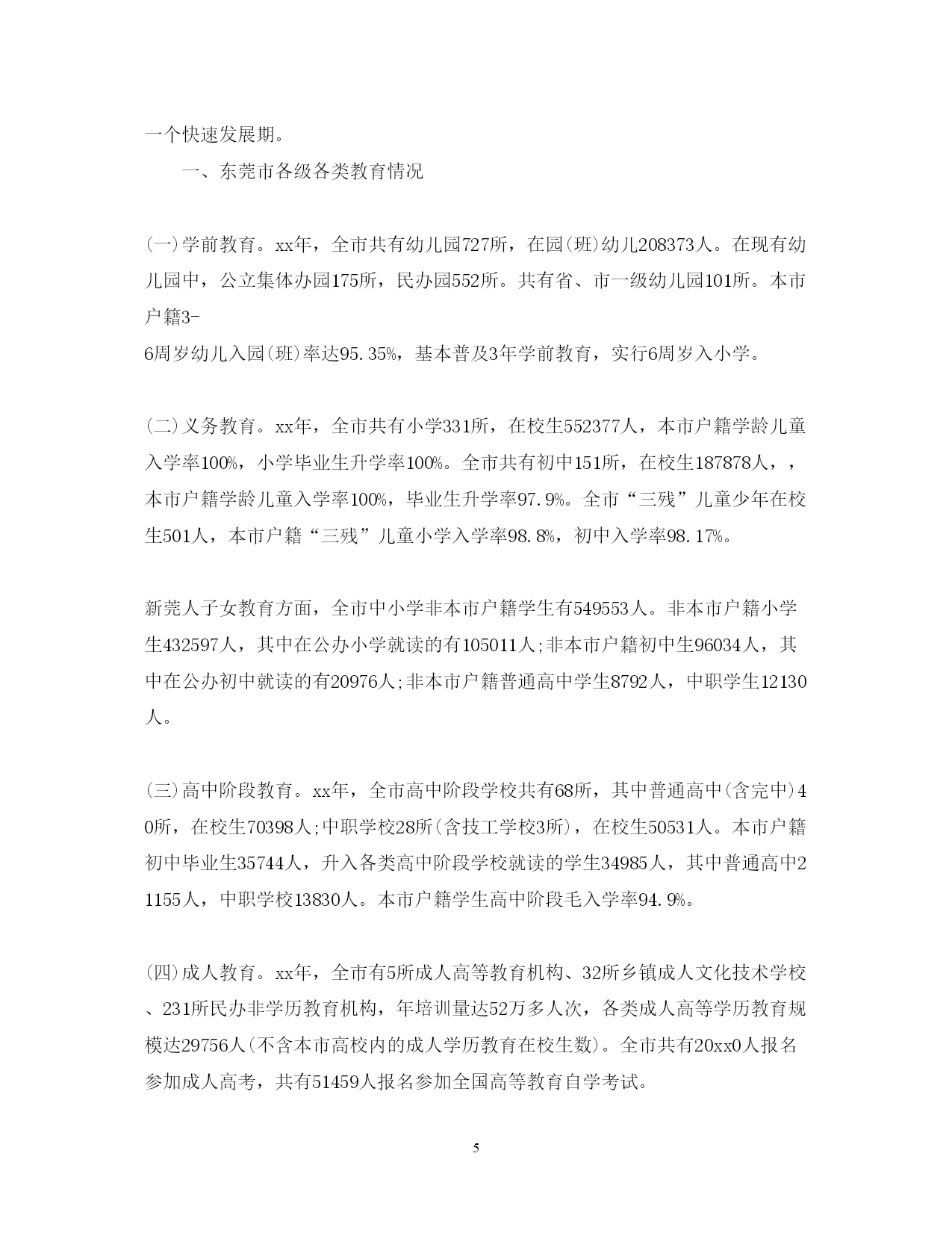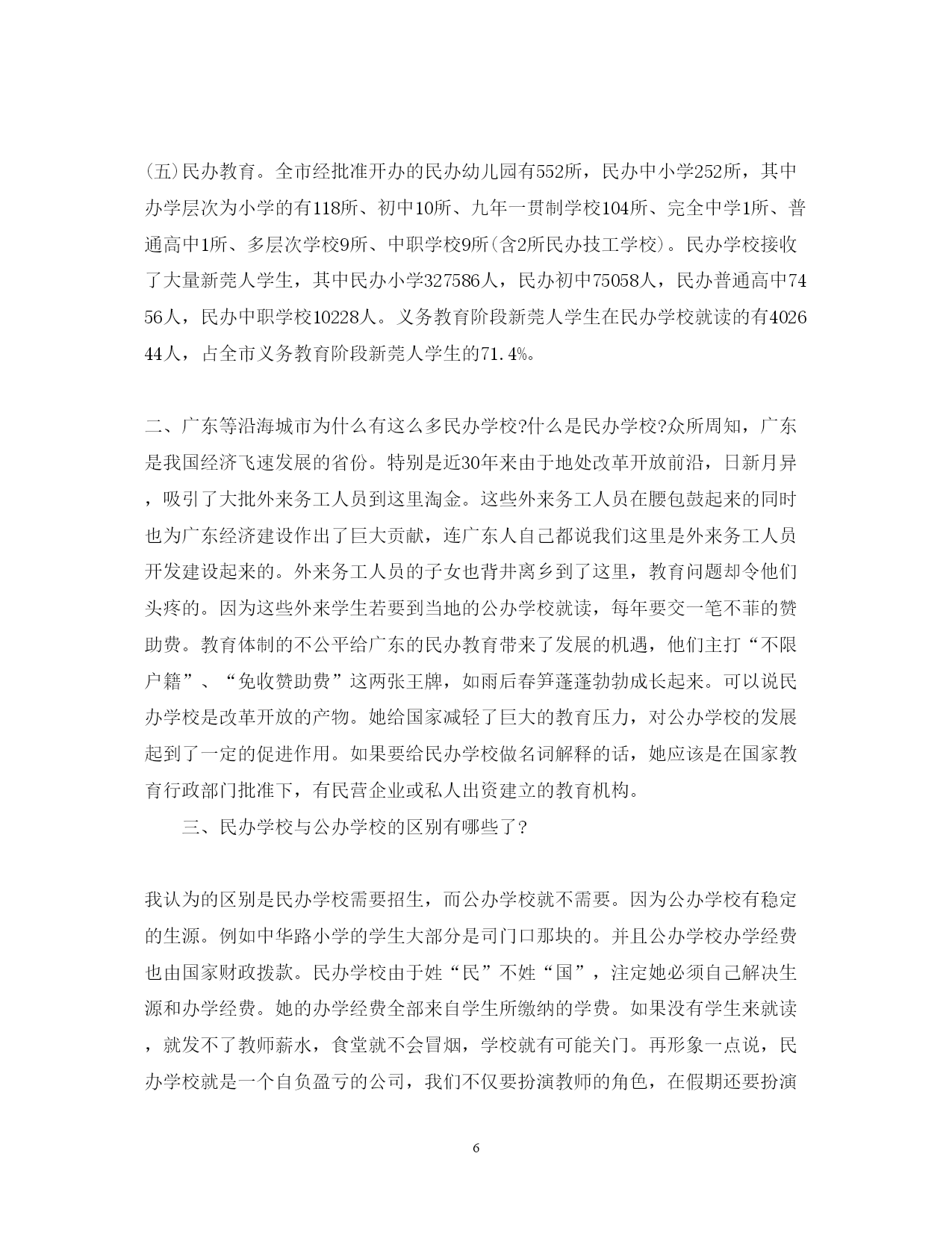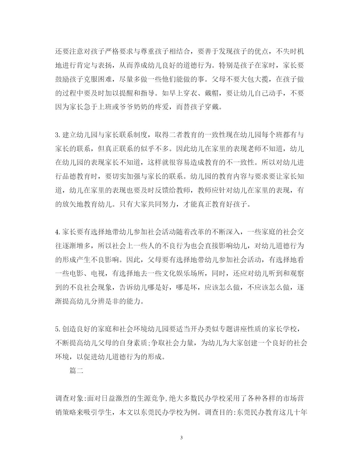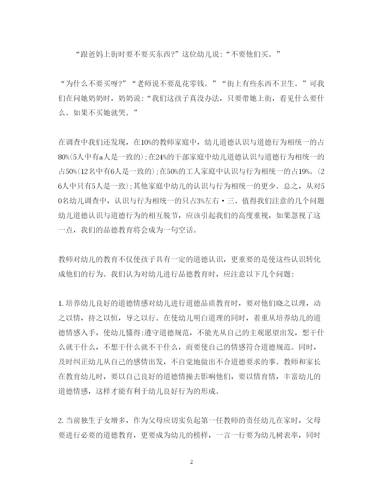 此资料由网络收集而来,如有侵权请告知上传者立即删除。资料共分享,我们负责传递知识。PAGEPAGE82020幼儿教育社会调查报告篇一在对幼儿进行品德教育时,我们常发现有的幼儿道德认识与道德行为不相一致。为什么会出现这样的现象?怎样才能使幼儿的道德认识与道德行为相一致呢?为此,我们做了认真的调查和分析。一、调查方法我们在全区调查了区属不同性质的幼儿园。调查对象:中班4-5岁幼儿200名。调查以开封市品德教育评估标准以及我区中心教研组制定的评估标准为依据。调查方法是采取随机抽样,以问卷为主,兼听、查、看等方法相结合进行。二、调查结果与分析从调查结果看,幼儿回答是令人满意的,回答问题正确的占幼儿总数90%以上。如回答跟爸妈上街要不要买东西?为什么?如果不买怎么办?正确率高达98%。由此可见幼儿对道德行为的好坏是能正确分辨的,说明幼儿园对幼儿进行品德教育是有成效的。为了弄清孩子的真实表现,我们又对其中50名幼儿进行了家庭调查。从调查结果看,幼儿的道德行为表现是很不理想的,幼儿的道德认识与行为是严重脱节的。如对幼儿提问的第一个问题“客人来了怎么办?客人走时怎么说?”有一位幼儿这样回答:“客人来我把他请进屋,然后给他倒水,再给他拿水果吃。客人走时我对他说再见,欢迎你下次再到我家来玩!”这样的回答,谁听了都会满意。可是,这位幼儿的妈妈却说:“这孩子,家里来客人他什么也不说,有时让他说他也不说。”如再问一幼儿:“跟爸妈上街时要不要买东西?”这位幼儿说:“不要他们买。”“为什么不要买呀?”“老师说不要乱花零钱。”“街上有些东西不卫生。”可我们在问她奶奶时,奶奶说:“我们这孩子真没办法,只要带她上街,看见什么要什么。如果不买她就哭。”在调查中我们还发现,在10%的教师家庭中,幼儿道德认识与道德行为相统一的占80%(5人中有a人是一致的);在24%的干部家庭中幼儿道德认识与道德行为相统一的占50%(12名中有6人是一致的);在50%的工人家庭中认识与行为相统一的占19%。(26人中只有5人是一致);其他家庭中幼儿的认识与行为相统一的更少。总之,从对50名幼儿调查中,认识与行为相统一的只占3%左右·三、值得我们注意的几个问题幼儿道德认识与道德行为的相互脱节,应该引起我们的高度重视,如果忽视了这一点,我们的品德教育将会成为一句空话。教师对幼儿的教育不仅使孩子具有一定的道德认识,更重要的是使这些认识转化成他们的行为。我们认为对幼儿进行品德教育时,应注意以下几个问题:1.培养幼儿良好的道德情感对幼儿进行道德品质教育时,要对他们晓之以理,动之以情,持之以恒,导之以行。在使幼儿明白道理的同时,着重从培养幼儿的道德情感入手,使幼儿懂得:遵守道德规范,不能光从自己的主观愿望出发,想干什么就干什么,不想干什么就不干什么,而要使自己的情感符合道德规范。同时,及时纠正幼儿从自己的感情出发,不自觉地做出不合道德要求的事。教师和家长在教育幼儿时,要以自己良好的道德情操去影响他们,要以情育情,丰富幼儿的道德情感,这样才能有利于幼儿良好行为的形成。2.当前独生子女增多,作为父母应切实负起第一任教师的责任幼儿在家时,父母要进行必要的道德教育,更要成为幼儿的榜样,一言一行要为幼儿树表率,同时还要注意对孩子严格要求与尊重孩子相结合,要善于发现孩子的优点,不失时机地进行肯定与表扬,从而养成幼儿良好的道德行为。特别是孩子在家时,家长要鼓励孩子克服困难,尽量多做一些他们能做的事。父母不要大包大揽,在孩子做的过程中要及时加以提醒和指导。如早上穿衣、戴帽,要让幼儿自己动手,不要因为家长急于上班或爷爷奶奶的疼爱,而替孩子穿戴。3.建立幼儿园与家长联系制度,取得二者教育的一致性现在幼儿园每个班都有与家长的联系,但真正联系的似乎不多。因此幼儿在家里的表现老师不知道,幼儿在幼儿园的表现家长不知道,这样就很容易造成教育的不一致性。所以对幼儿进行品德教育时,要切实加强与家长的联系。幼儿园的教育内容与要求要让家长知道,幼儿在家里的表现也要及时反馈给教师,教师应针对幼儿在家里的表现,有的放矢地教育幼儿。只有大家共同努力,才能真正教育好孩子。4.家长要有选择地带幼儿参加社会活动随着改革的不断深入,一些家庭的社会交往逐渐增多,所以社会上一些人的不良行为也会直接影响幼儿,对幼儿道德行为的形成产生不良影响。因此,父母要有选择地带幼儿参加社会活动,有选择地看一些电影、电视,有选择地去一些文化娱乐场所,同时,还应对幼儿听到和观察到的不良社会现象,告诉幼儿哪是好,哪是坏,应该怎么做,不应该怎么做,逐渐提高幼儿分辨是非的能力。5.创造良好的家庭和社会环境幼儿园要适当开办类似专题讲座性质的家长学校,不断提高幼儿父母的自身素质;争取社会力量,为幼儿为大家创建一个良好的社会环