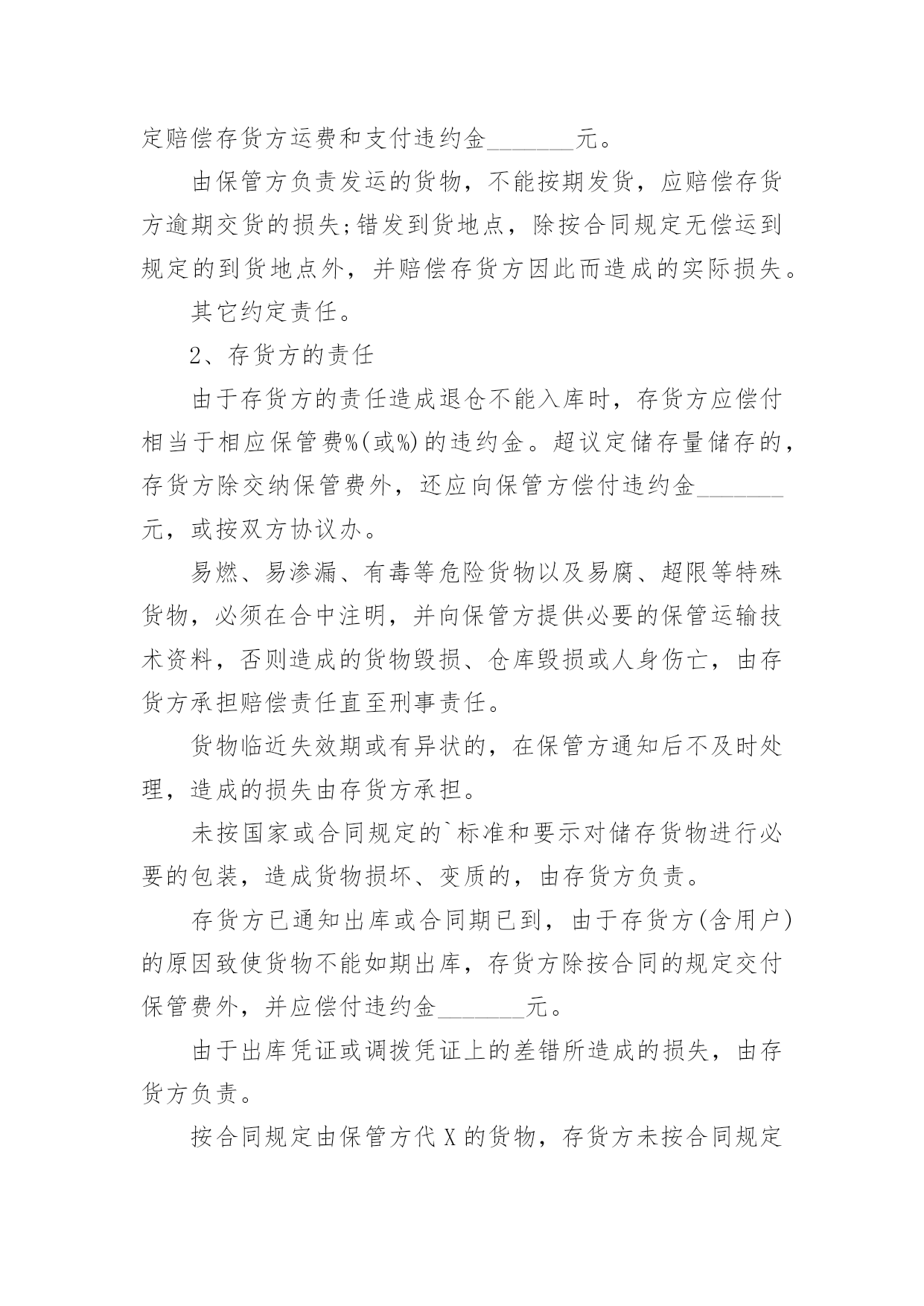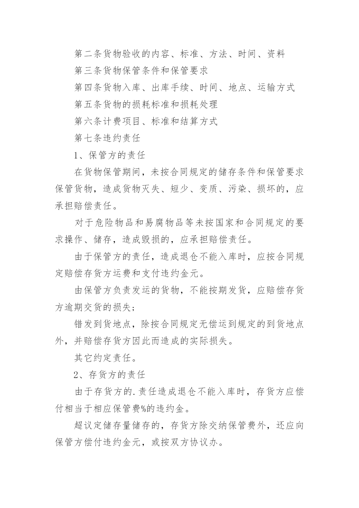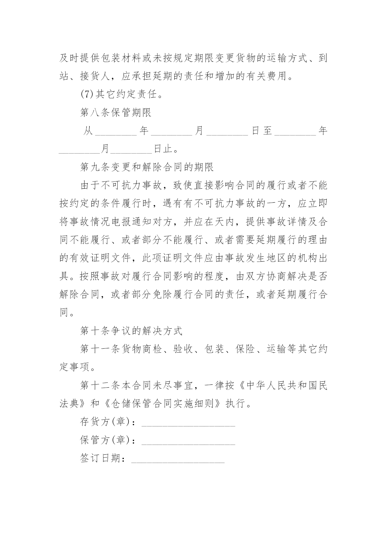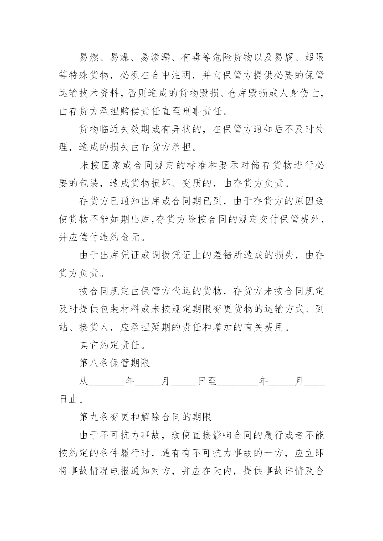 物品仓储保管合同物品仓储保管合同在当今社会,人们对合同愈发重视,我们用到合同的地方越来越多,签订合同能够较为有效的约束违约行为。那么常见的合同书是什么样的呢?以下是小编精心整理的物品仓储保管合同,希望对大家有所帮助。物品仓储保管合同1存货方:_________________保管方:_________________签订时间:______年______月_____日签订地点:_________________根据《民法典》和《仓储保管合同实施细则》的有关规定,存货方和保管方根据委托储存计划和仓储容量,经双方协商一致,签订本合同。第一条储存货物的品名、品种、规格、数量、质量、包装1、货物品名:2、品种规格:3、数量:4、质量:5、货物包装:第二条货物验收的内容、标准、方法、时间、资料第三条货物保管条件和保管要求第四条货物入库、出库手续、时间、地点、运输方式第五条货物的损耗标准和损耗处理第六条计费项目、标准和结算方式第七条违约责任1、保管方的责任在货物保管期间,未按合同规定的储存条件和保管要求保管货物,造成货物灭失、短少、变质、污染、损坏的,应承担赔偿责任。对于危险物品和易腐物品等未按国家和合同规定的要求操作、储存,造成毁损的,应承担赔偿责任。由于保管方的责任,造成退仓不能入库时,应按合同规定赔偿存货方运费和支付违约金元。由保管方负责发运的货物,不能按期发货,应赔偿存货方逾期交货的损失;错发到货地点,除按合同规定无偿运到规定的到货地点外,并赔偿存货方因此而造成的实际损失。其它约定责任。2、存货方的责任由于存货方的.责任造成退仓不能入库时,存货方应偿付相当于相应保管费%的违约金。超议定储存量储存的,存货方除交纳保管费外,还应向保管方偿付违约金元,或按双方协议办。易燃、易爆、易渗漏、有毒等危险货物以及易腐、超限等特殊货物,必须在合中注明,并向保管方提供必要的保管运输技术资料,否则造成的货物毁损、仓库毁损或人身伤亡,由存货方承担赔偿责任直至刑事责任。货物临近失效期或有异状的,在保管方通知后不及时处理,造成的损失由存货方承担。未按国家或合同规定的标准和要示对储存货物进行必要的包装,造成货物损坏、变质的,由存货方负责。存货方已通知出库或合同期已到,由于存货方的原因致使货物不能如期出库,存货方除按合同的规定交付保管费外,并应偿付违约金元。由于出库凭证或调拨凭证上的差错所造成的损失,由存货方负责。按合同规定由保管方代运的货物,存货方未按合同规定及时提供包装材料或未按规定期限变更货物的运输方式、到站、接货人,应承担延期的责任和增加的有关费用。其它约定责任。第八条保管期限从_______年_____月_____日至________年_____月____日止。第九条变更和解除合同的期限由于不可抗力事故,致使直接影响合同的履行或者不能按约定的条件履行时,遇有有不可抗力事故的一方,应立即将事故情况电报通知对方,并应在天内,提供事故详情及合同不能履行、或者部分不能履行、或者需要延期履行的理由的有效证明文件,此项证明文件应由事故发生地区的机构出具。按照事故对履行合同影响的程度,由双方协商解决是否解除合同,或者部分免除履行合同的责任,或者延期履行合同。第十条争议的解决方式第十一条货物商检、验收、包装、保险、运输等其它约定事项。第十二条本合同未尽事宜,一律按《民法典》和《仓储保管合同实施细则》执行。存货方:_________________保管方:_________________地址:_________________地址:_________________日期:_________________日期:_________________物品仓储保管合同2保管人:____存货人:_____签订地点:____签订时间:____年____月____日第一条仓储物仓储物名称:_____;品种规格:_____;性质:____;数量:____;质量:_____;包装:_______;件数:_______;标记:_______;仓储费:_______;合计人民币金额(大写):_______。第二条储存场所、储存物占用仓库位置及面积:_______。第三条仓储物(是否)有瑕疵。瑕疵是:_______。第四条仓储物(是否)需要采取特殊保管措施。特殊保管措施是:_______。第五条仓储物入库检验的方法、时间与地点:_______。第六条存货人交付仓储物后,保管当给付仓单。第七条储存期限:从______年____月____日至______年____月____日。第八条仓储物的损耗标准及计算方法:_______。第九条保管人发现仓储物有变质或损坏的,应及时通知存货人或仓单持有人。第十条仓储物(是否)已办理保险,险种名称:_______;保险金额:_______;保险期限:___