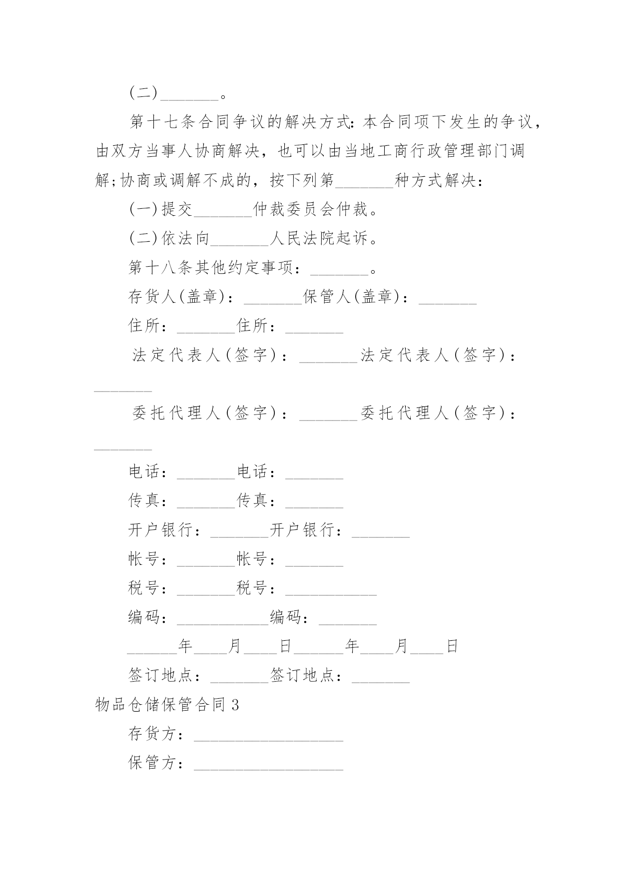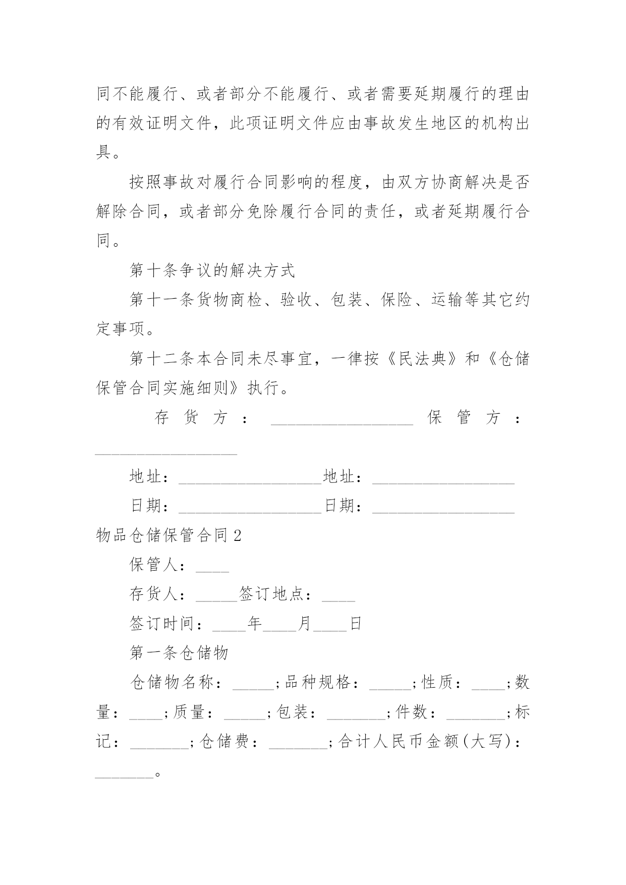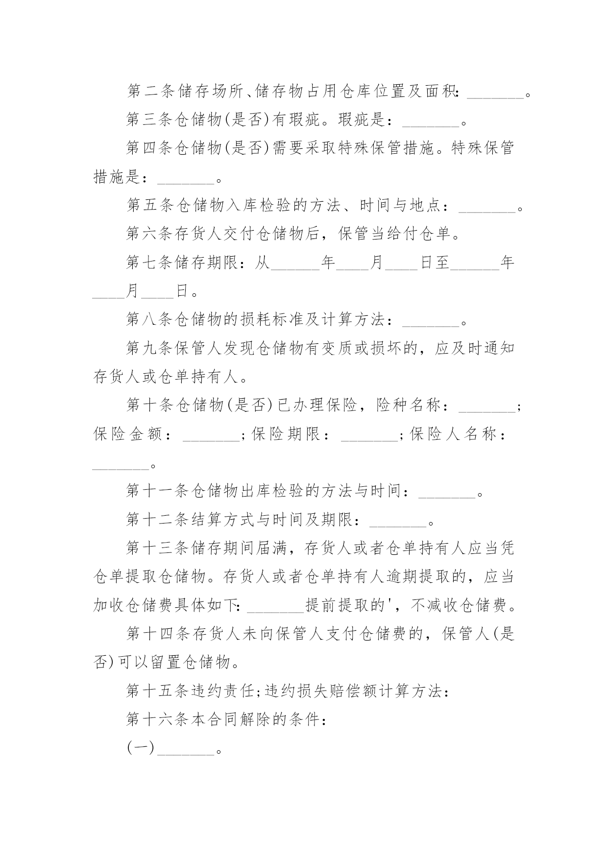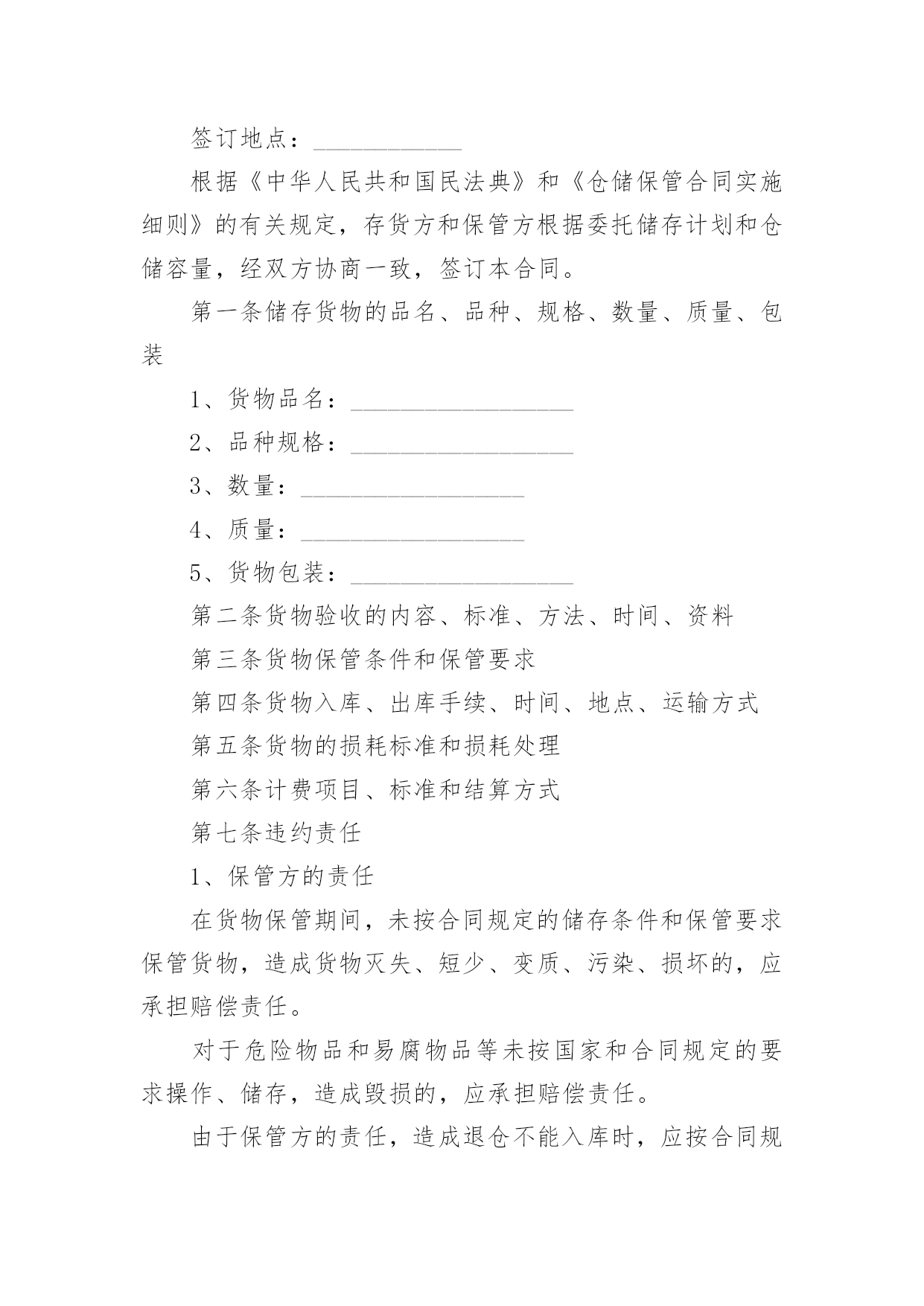 物品仓储保管合同物品仓储保管合同在当今社会,人们对合同愈发重视,我们用到合同的地方越来越多,签订合同能够较为有效的约束违约行为。那么常见的合同书是什么样的呢?以下是小编精心整理的物品仓储保管合同,希望对大家有所帮助。物品仓储保管合同1存货方:_________________保管方:_________________签订时间:______年______月_____日签订地点:_________________根据《民法典》和《仓储保管合同实施细则》的有关规定,存货方和保管方根据委托储存计划和仓储容量,经双方协商一致,签订本合同。第一条储存货物的品名、品种、规格、数量、质量、包装1、货物品名:2、品种规格:3、数量:4、质量:5、货物包装:第二条货物验收的内容、标准、方法、时间、资料第三条货物保管条件和保管要求第四条货物入库、出库手续、时间、地点、运输方式第五条货物的损耗标准和损耗处理第六条计费项目、标准和结算方式第七条违约责任1、保管方的责任在货物保管期间,未按合同规定的储存条件和保管要求保管货物,造成货物灭失、短少、变质、污染、损坏的,应承担赔偿责任。对于危险物品和易腐物品等未按国家和合同规定的要求操作、储存,造成毁损的,应承担赔偿责任。由于保管方的责任,造成退仓不能入库时,应按合同规定赔偿存货方运费和支付违约金元。由保管方负责发运的货物,不能按期发货,应赔偿存货方逾期交货的损失;错发到货地点,除按合同规定无偿运到规定的到货地点外,并赔偿存货方因此而造成的实际损失。其它约定责任。2、存货方的责任由于存货方的.责任造成退仓不能入库时,存货方应偿付相当于相应保管费%的违约金。超议定储存量储存的,存货方除交纳保管费外,还应向保管方偿付违约金元,或按双方协议办。易燃、易爆、易渗漏、有毒等危险货物以及易腐、超限等特殊货物,必须在合中注明,并向保管方提供必要的保管运输技术资料,否则造成的货物毁损、仓库毁损或人身伤亡,由存货方承担赔偿责任直至刑事责任。货物临近失效期或有异状的,在保管方通知后不及时处理,造成的损失由存货方承担。未按国家或合同规定的标准和要示对储存货物进行必要的包装,造成货物损坏、变质的,由存货方负责。存货方已通知出库或合同期已到,由于存货方的原因致使货物不能如期出库,存货方除按合同的规定交付保管费外,并应偿付违约金元。由于出库凭证或调拨凭证上的差错所造成的损失,由存货方负责。按合同规定由保管方代运的货物,存货方未按合同规定及时提供包装材料或未按规定期限变更货物的运输方式、到站、接货人,应承担延期的责任和增加的有关费用。其它约定责任。第八条保管期限从_______年_____月_____日至________年_____月____日止。第九条变更和解除合同的期限由于不可抗力事故,致使直接影响合同的履行或者不能按约定的条件履行时,遇有有不可抗力事故的一方,应立即将事故情况电报通知对方,并应在天内,提供事故详情及合同不能履行、或者部分不能履行、或者需要延期履行的理由的有效证明文件,此项证明文件应由事故发生地区的机构出具。按照事故对履行合同影响的程度,由双方协商解决是否解除合同,或者部分免除履行合同的责任,或者延期履行合同。第十条争议的解决方式第十一条货物商检、验收、包装、保险、运输等其它约定事项。第十二条本合同未尽事宜,一律按《民法典》和《仓储保管合同实施细则》执行。存货方:_________________保管方:_________________地址:_________________地址:_________________日期:_________________日期:_________________物品仓储保管合同2保管人:____存货人:_____签订地点:____签订时间:____年____月____日第一条仓储物仓储物名称:_____;品种规格:_____;性质:____;数量:____;质量:_____;包装:_______;件数:_______;标记:_______;仓储费:_______;合计人民币金额(大写):_______。第二条储存场所、储存物占用仓库位置及面积:_______。第三条仓储物(是否)有瑕疵。瑕疵是:_______。第四条仓储物(是否)需要采取特殊保管措施。特殊保管措施是:_______。第五条仓储物入库检验的方法、时间与地点:_______。第六条存货人交付仓储物后,保管当给付仓单。第七条储存期限:从______年____月____日至______年____月____日。第八条仓储物的损耗标准及计算方法:_______。第九条保管人发现仓储物有变质或损坏的,应及时通知存货人或仓单持有人。第十条仓储物(是否)已办理保险,险种名称:_______;保险金额:_______;保险期限:___