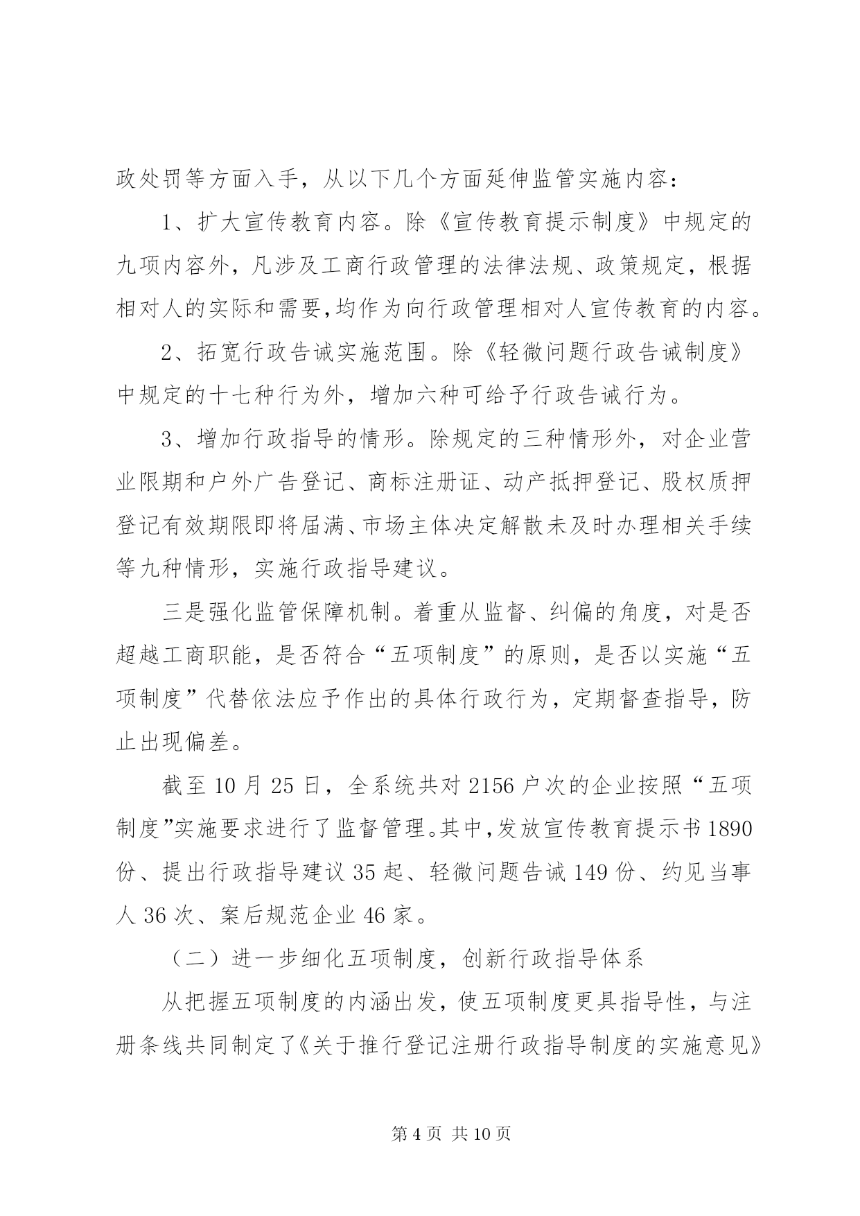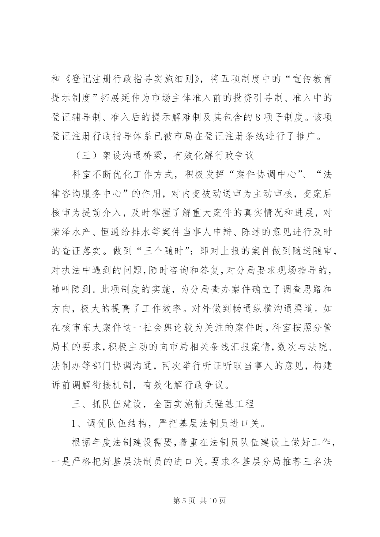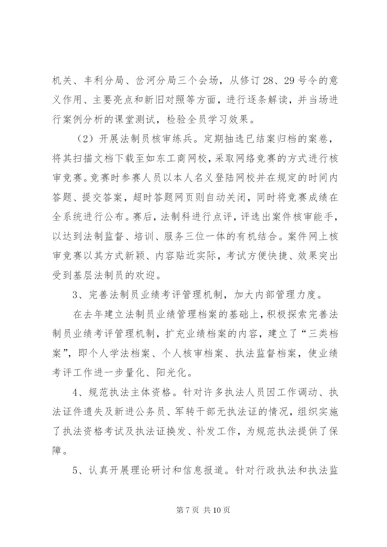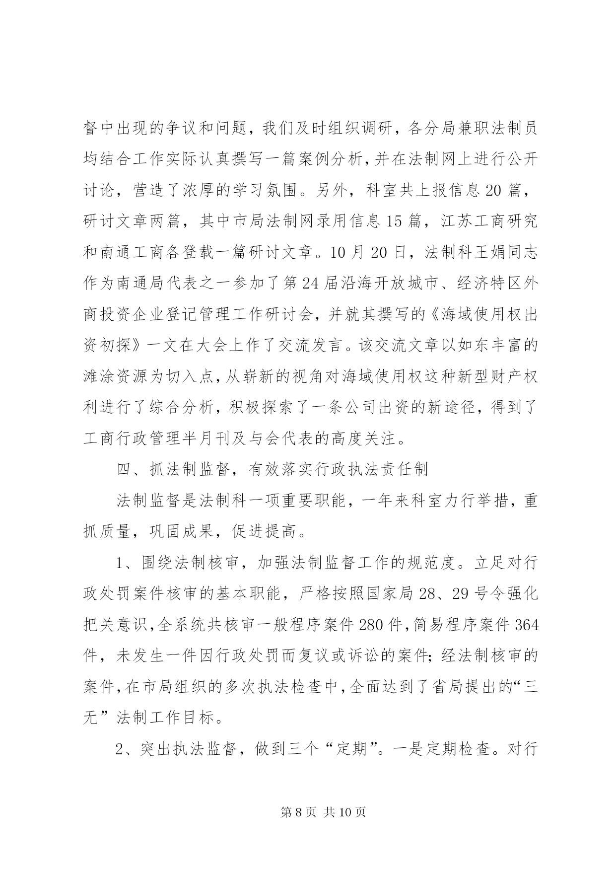 第PAGE\*Arabic\*MERGEFORMAT10页共NUMPAGES\*MERGEFORMAT10页工商所法制工作总结一、抓长效管理,着力完善依法行政的相关机制1、编制职权目录,推行行政权力网上公示制。(1)清理行政执法依据,准确界定职能权限。对全局行政职权法律依据进行全面、细致的梳理。一方面,坚持按照“职权法定”的原则,组织全系统采取自下而上的方式,对现已行使的各项职权及依据进行及时申报登记;另一方面,按照“谁行使、谁清理”的原则,采取自上而下的方式,组织机关科室认真对本条线行使的职权依据进行全面清理。坚持做到没有法律依据的职权要坚决停止,职权范围与权限不清的要明确,凡符合条件的准予备案。(2)在清理的基础上,对行使的426项行政许可、行政处罚、行政确认、行政征收等职权编制职权目录和自由裁量权行使规范,对职权行使依据、承办机构、服务指南、流程图、行政执法自由裁量标准和职权行使过程中的风险点予以明确,并通过政府信息网进行公开、公示。2、健全规范性文件办理机制,强化规范性文件办理工作。一是专题行文,明确规范性文件办理要求。今年,省、市局出台了规范性文件都必须经法制机构审核把关的相关规定,我局即制定下发了《如东工商局关于加强规范性文件办理工作的通知》,规定凡县局规范性文件及与相关部门会签文件在报批签发前,必须经过法制机构审核。未经法制科审核,办公室不得承办印发。二是外请专家,开展业务知识培训。为了使规范性文件制定合法、合规,举办规范性文件办理知识讲座,邀请县政府法制办负责人现场授课,从规范性文件的概念、特征、制定原则、行文结构、常见问题和审查备案等六个方面作了阐述,局党组成员和机关全体干部参加了培训。三是加强协调,规范内部操作流程。为使规范性文件办理工作不仅仅停留于文件规定,法制科主动与办公室、信息中心协商,在办公自动化收发文子系统中运用相关流程,实施规范性文件的法制审核,明确文件流转程序和操作方法。对未经法制审查的规范性文件,由办公室通过办公自动化提交法制审核或退回拟稿单位。四是关口前移,建立规范性文件审查报备联络员。明确各业务科室兼职法制员为规范性文件审查报备联络员,具体负责本部门起草的规范性文件初审和报审工作,将关口前移,提高文稿质量。截至10月25日,法制科共对36份规范性文件进行了审查、会签,并及时向市局法制处XX县区法制办进行了报备,备案率均达100%。3、规范执法程序及执法文书。一是根据28、29号令的要求,结合我局工作实际,修订了《如东工商局案件流程管理内部规程》,进一步规范办案程序,对以县局名义处罚的案件试行案件流程控制,从案前调查到立卷归档等十个环节进行全程监控,要求分局在报审每一案件时均附流程实时跟踪单,对各个环节的起止时间、承办人员、交接人、交接时间详细记载,使每个环节的办结期限和责任人一看就明了,有效杜绝了案件久拖不决、责任不明的状况。二是全面推行2009年版执法文书。总局78种新版执法文书正式公布执行后,科室迅速在全系统征集意见,并根据各单位的修改意见,向全系统编发了78种新版执法文书。并针对基层办案人员资料不足的问题,搜集整理了新版执法文书使用软件,为执法人员规范执法、便捷执法提供了基础保障。二、抓制度创新,积极拓宽依法行政方式途径(一)进一步深化五项制度,拓展和谐监管领域为贯彻落实科学发展观和支持企业又好又快发展的各项举措,谋求积极行政、和谐行政,深入推进“五项制度”,专题下发了《关于支持企业又好又快发展深入推进“执法为民和谐监管”五项制度的实施意见》,通过三项措施的落实,进一步丰富了“五项制度”的内涵。一是拓展监管方式方法。在不违背“五项制度”基本原则的前提下,只要有利于和谐监管目标的实现,可以灵活选择与运用相应的非强制性监管手段和方法。除书面通知外,还可包括口头告知、公示公告、召集座谈、开办培训等实施载体二是延伸监管实施内容。结合省、市局支持企业发展的相关举措,从广宣政策法规、善施行政告诫、勤于行政指导、慎定行政处罚等方面入手,从以下几个方面延伸监管实施内容:1、扩大宣传教育内容。除《宣传教育提示制度》中规定的九项内容外,凡涉及工商行政管理的法律法规、政策规定,根据相对人的实际和需要,均作为向行政管理相对人宣传教育的内容。2、拓宽行政告诫实施范围。除《轻微问题行政告诫制度》中规定的十七种行为外,增加六种可给予行政告诫行为。3、增加行政指导的情形。除规定的三种情形外,对企业营业限期和户外广告登记、商标注册证、动产抵押登记、股权质押登记有效期限即将届满、市场主体决定解散未及时办理相关手续等九种情形,实施行政指导建议。三是强化监管保障机制。着重从监督、纠偏的角度,对是否超越工商职能,是否符合“五项制度”的原则,是否以实施“五项制度”代替依法应予作出的具体行政行为,定期