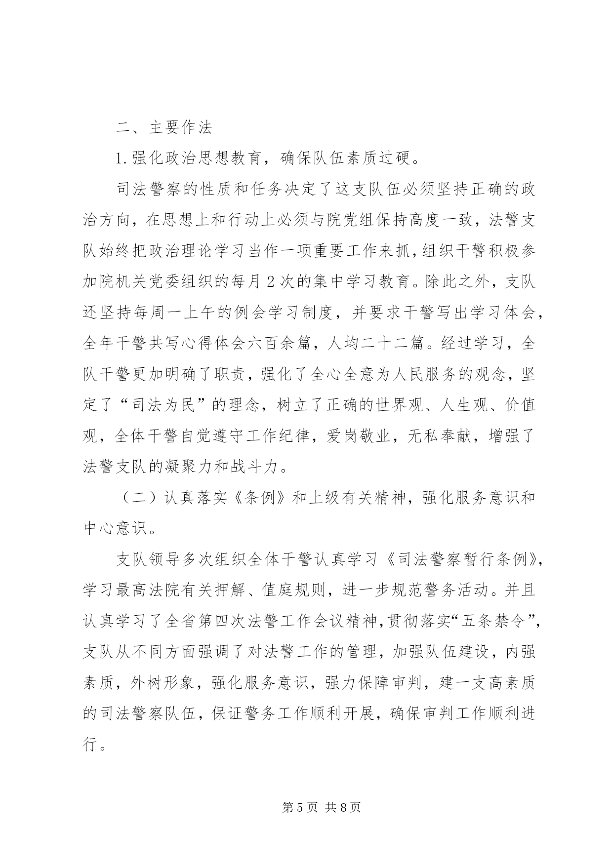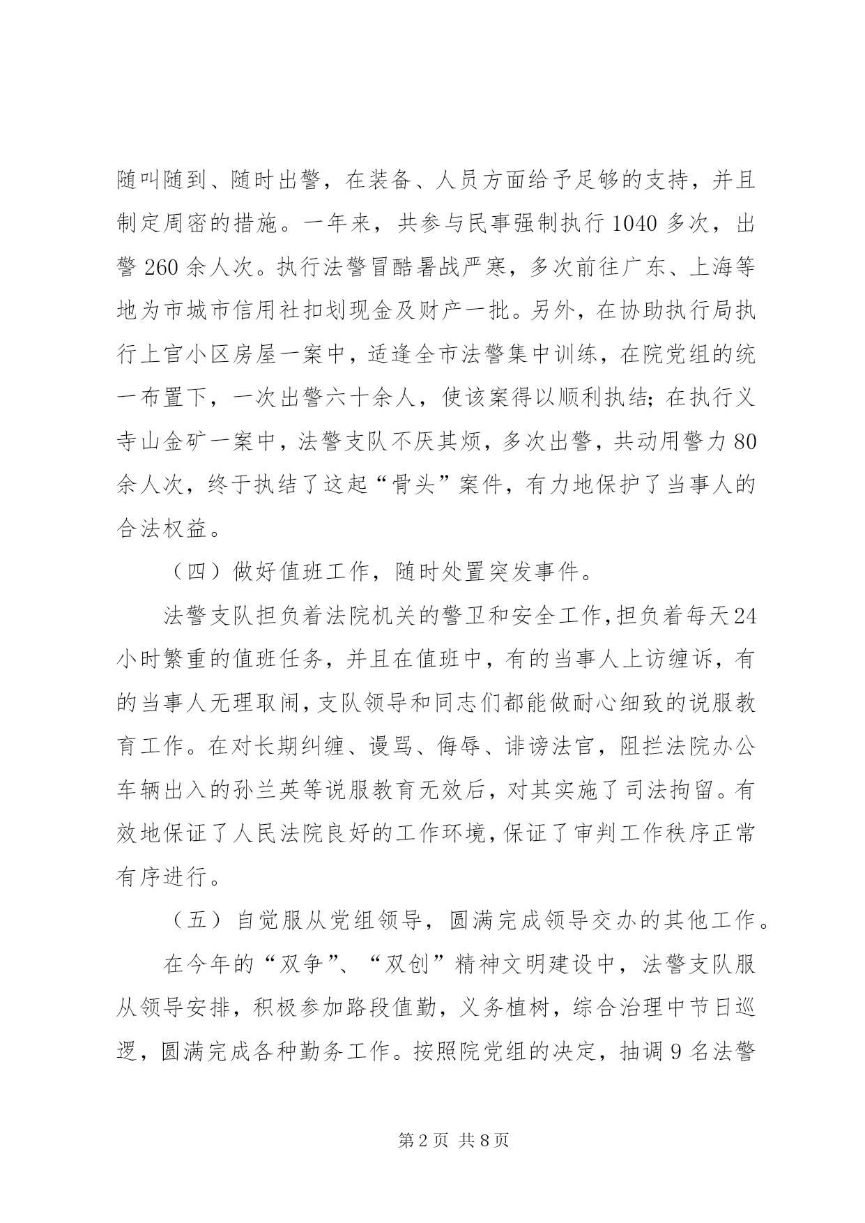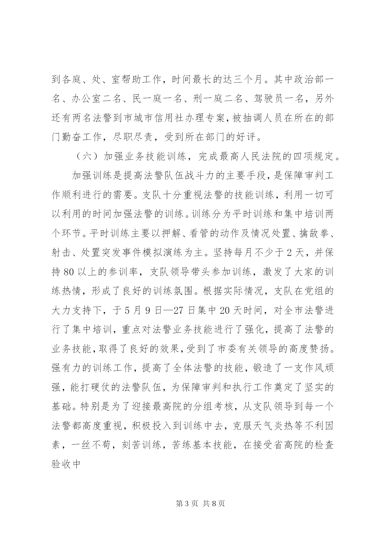 第PAGE\*Arabic\*MERGEFORMAT8页共NUMPAGES\*MERGEFORMAT8页司法警察个人工作总结(一)认真履行职责,积极为刑事审判工作提供强有力的保障。司法警察八项职责中的押解、看管、值庭、执行死刑工作,都是为刑事审判工作服务的。为了更有效地保障刑事审判工作顺利进行,支队领导周密部署,妥善安排,遇到重大庭审活动,积极向院党组及主管院长汇报,亲自带队押解、值庭,做到善始善终,确保万无一失。一年来,共值庭1120多场次,押解、看管被告1930多人次,组织执行死刑3批8场次,枪决死刑犯42人。其中在重大庭审活动中,支队领导总是提前了解案情,制订突发事件处置预案;并且有针对性地采取有效措施;在9月15日庭审结束后发生的一起出租车追囚车事件,由于处置及时得当,没有造成不良后果。该事件曾在报刊、电台、网络等媒体上报道过,收到良好的法制教育效果。(二)坚持“公正与效率”主题,积极配合民商事审判。一年来,共完成协助执行搜查109次,拘留76人,拘传112人,协助查封、扣押、冻结、划拨财产一批,标的近4000多万元,保障民(请登陆政法秘书网)商事审判工作的开展,协助进行诉前、诉中财产保全,有力地保护了当事人的合法权益。(三)积极参与执行工作,在解决“执行难”中作贡献。支队领导一直十分重视执行工作,在执行局申请用警时做到随叫随到、随时出警,在装备、人员方面给予足够的支持,并且制定周密的措施。一年来,共参与民事强制执行1040多次,出警260余人次。执行法警冒酷暑战严寒,多次前往广东、上海等地为市城市信用社扣划现金及财产一批。另外,在协助执行局执行上官小区房屋一案中,适逢全市法警集中训练,在院党组的统一布置下,一次出警六十余人,使该案得以顺利执结;在执行义寺山金矿一案中,法警支队不厌其烦,多次出警,共动用警力80余人次,终于执结了这起“骨头”案件,有力地保护了当事人的合法权益。(四)做好值班工作,随时处置突发事件。法警支队担负着法院机关的警卫和安全工作,担负着每天24小时繁重的值班任务,并且在值班中,有的当事人上访缠诉,有的当事人无理取闹,支队领导和同志们都能做耐心细致的说服教育工作。在对长期纠缠、谩骂、侮辱、诽谤法官,阻拦法院办公车辆出入的孙兰英等说服教育无效后,对其实施了司法拘留。有效地保证了人民法院良好的工作环境,保证了审判工作秩序正常有序进行。(五)自觉服从党组领导,圆满完成领导交办的其他工作。在今年的“双争”、“双创”精神文明建设中,法警支队服从领导安排,积极参加路段值勤,义务植树,综合治理中节日巡逻,圆满完成各种勤务工作。按照院党组的决定,抽调9名法警到各庭、处、室帮助工作,时间最长的达三个月。其中政治部一名、办公室二名、民一庭一名、刑一庭二名、驾驶员一名,另外还有两名法警到市城市信用社办理专案,被抽调人员在所在的部门勤奋工作,尽职尽责,受到所在部门的好评。(六)加强业务技能训练,完成最高人民法院的四项规定。加强训练是提高法警队伍战斗力的主要手段,是保障审判工作顺利进行的需要。支队十分重视法警的技能训练,利用一切可以利用的时间加强法警的训练。训练分为平时训练和集中培训两个环节。平时训练主要以押解、看管的动作及情况处置、擒敌拳、射击、处置突发事件模拟演练为主。坚持每月不少于2天,并保持80以上的参训率,支队领导带头参加训练,激发了大家的训练热情,形成了良好的训练氛围。根据实际情况,支队在党组的大力支持下,于5月9日—27日集中20天时间,对全市法警进行了集中培训,重点对法警业务技能进行了强化,提高了法警的业务技能,取得了良好的效果,受到了市委有关领导的高度赞扬。强有力的训练工作,提高了全体法警的技能,锻造了一支作风顽强,能打硬仗的法警队伍,为保障审判和执行工作奠定了坚实的基础。特别是为了迎接最高院的分组考核,从支队领导到每一个法警都高度重视,积极投入到训练中去,克服天气炎热等不利因素,一丝不苟,刻苦训练,苦练基本技能,在接受省高院的检查验收中,取得了优异的成绩。(七)强化素质教育,在争先创优中做贡献。支队一直十分重视素质教育,支队领导带头学习,不断提高全面素质,支队坚持每周一上午例会,每周半天的政治理论学习,共撰写学习体会、心得等三百余篇,有效地提高了支队的整体政治素质。今年是我院再创省级文明单位关键的一年,支队除了组织全体法警搞好理论学习外,还刊出“法警之窗”宣传板报12期,并且制作了法警工作板报,向社会宣传了法警的工作、学习、生活,展示了法警的良好形象,有效地提高了法警的良好素质,有力地促进了我院省级文明单位的创建工作。(八)狠抓队伍思想建设,不断提高法警素质。支队十分重视法警的思想教育和业务学习工作,鼓励法警参加学历学习,帮助制定学习计划,在法警面授、考试时提供时间,鼓励法警求学