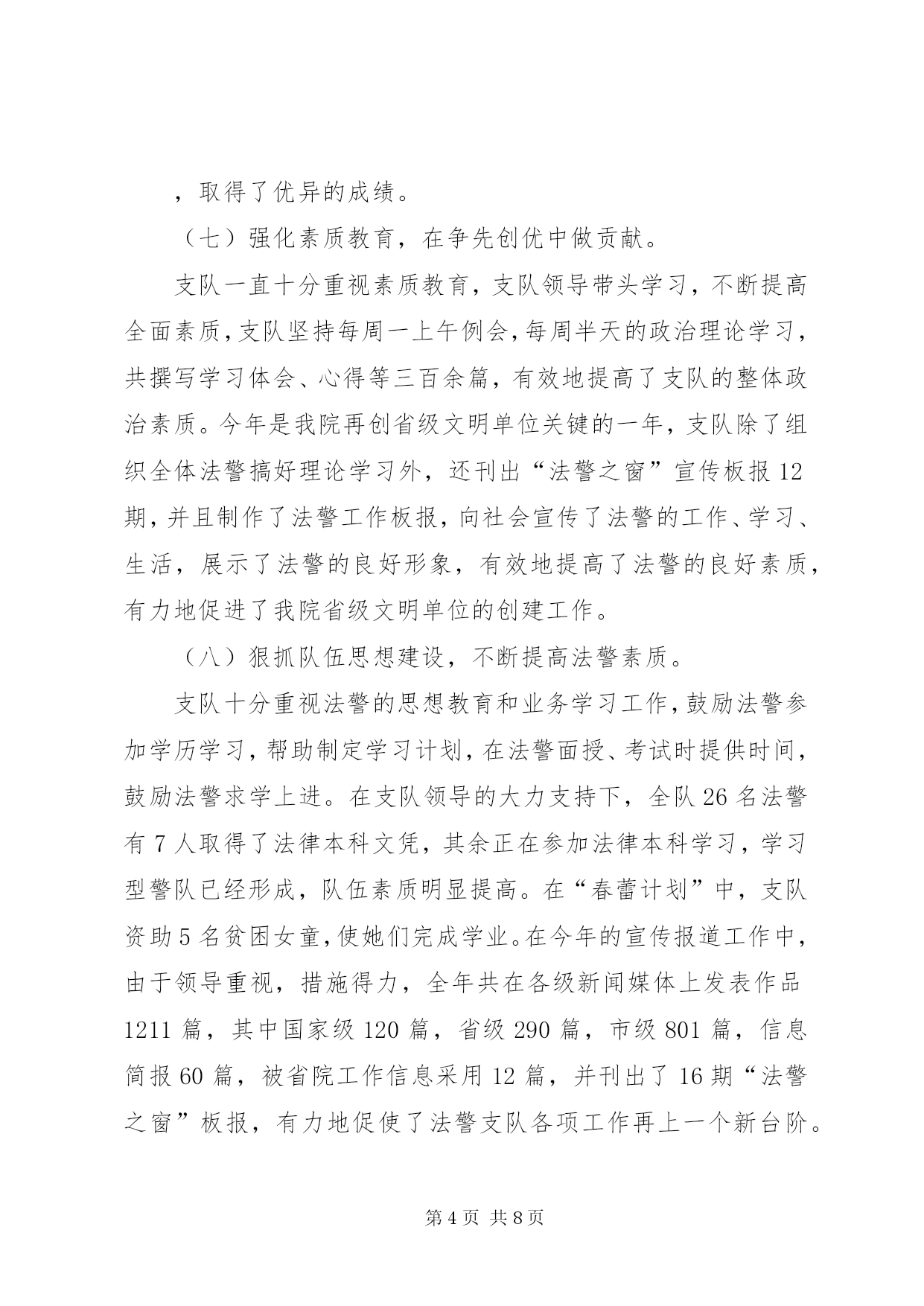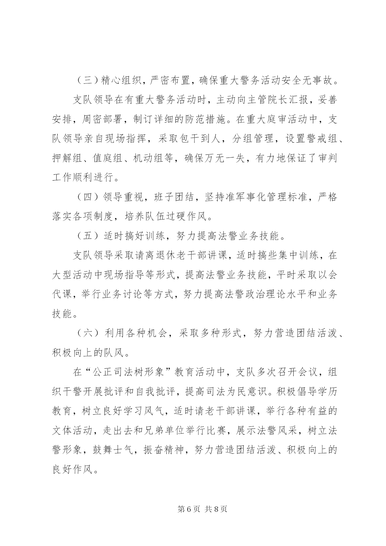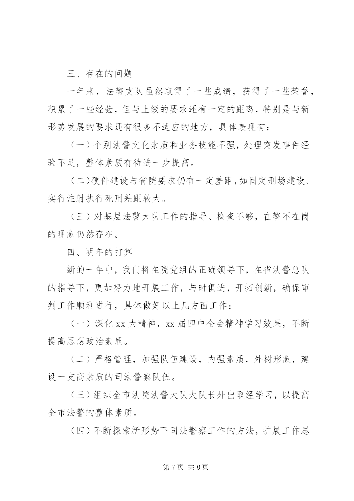 第PAGE\*Arabic\*MERGEFORMAT8页共NUMPAGES\*MERGEFORMAT8页司法警察个人工作总结(一)认真履行职责,积极为刑事审判工作提供强有力的保障。司法警察八项职责中的押解、看管、值庭、执行死刑工作,都是为刑事审判工作服务的。为了更有效地保障刑事审判工作顺利进行,支队领导周密部署,妥善安排,遇到重大庭审活动,积极向院党组及主管院长汇报,亲自带队押解、值庭,做到善始善终,确保万无一失。一年来,共值庭1120多场次,押解、看管被告1930多人次,组织执行死刑3批8场次,枪决死刑犯42人。其中在重大庭审活动中,支队领导总是提前了解案情,制订突发事件处置预案;并且有针对性地采取有效措施;在9月15日庭审结束后发生的一起出租车追囚车事件,由于处置及时得当,没有造成不良后果。该事件曾在报刊、电台、网络等媒体上报道过,收到良好的法制教育效果。(二)坚持“公正与效率”主题,积极配合民商事审判。一年来,共完成协助执行搜查109次,拘留76人,拘传112人,协助查封、扣押、冻结、划拨财产一批,标的近4000多万元,保障民(请登陆政法秘书网)商事审判工作的开展,协助进行诉前、诉中财产保全,有力地保护了当事人的合法权益。(三)积极参与执行工作,在解决“执行难”中作贡献。支队领导一直十分重视执行工作,在执行局申请用警时做到随叫随到、随时出警,在装备、人员方面给予足够的支持,并且制定周密的措施。一年来,共参与民事强制执行1040多次,出警260余人次。执行法警冒酷暑战严寒,多次前往广东、上海等地为市城市信用社扣划现金及财产一批。另外,在协助执行局执行上官小区房屋一案中,适逢全市法警集中训练,在院党组的统一布置下,一次出警六十余人,使该案得以顺利执结;在执行义寺山金矿一案中,法警支队不厌其烦,多次出警,共动用警力80余人次,终于执结了这起“骨头”案件,有力地保护了当事人的合法权益。(四)做好值班工作,随时处置突发事件。法警支队担负着法院机关的警卫和安全工作,担负着每天24小时繁重的值班任务,并且在值班中,有的当事人上访缠诉,有的当事人无理取闹,支队领导和同志们都能做耐心细致的说服教育工作。在对长期纠缠、谩骂、侮辱、诽谤法官,阻拦法院办公车辆出入的孙兰英等说服教育无效后,对其实施了司法拘留。有效地保证了人民法院良好的工作环境,保证了审判工作秩序正常有序进行。(五)自觉服从党组领导,圆满完成领导交办的其他工作。在今年的“双争”、“双创”精神文明建设中,法警支队服从领导安排,积极参加路段值勤,义务植树,综合治理中节日巡逻,圆满完成各种勤务工作。按照院党组的决定,抽调9名法警到各庭、处、室帮助工作,时间最长的达三个月。其中政治部一名、办公室二名、民一庭一名、刑一庭二名、驾驶员一名,另外还有两名法警到市城市信用社办理专案,被抽调人员在所在的部门勤奋工作,尽职尽责,受到所在部门的好评。(六)加强业务技能训练,完成最高人民法院的四项规定。加强训练是提高法警队伍战斗力的主要手段,是保障审判工作顺利进行的需要。支队十分重视法警的技能训练,利用一切可以利用的时间加强法警的训练。训练分为平时训练和集中培训两个环节。平时训练主要以押解、看管的动作及情况处置、擒敌拳、射击、处置突发事件模拟演练为主。坚持每月不少于2天,并保持80以上的参训率,支队领导带头参加训练,激发了大家的训练热情,形成了良好的训练氛围。根据实际情况,支队在党组的大力支持下,于5月9日—27日集中20天时间,对全市法警进行了集中培训,重点对法警业务技能进行了强化,提高了法警的业务技能,取得了良好的效果,受到了市委有关领导的高度赞扬。强有力的训练工作,提高了全体法警的技能,锻造了一支作风顽强,能打硬仗的法警队伍,为保障审判和执行工作奠定了坚实的基础。特别是为了迎接最高院的分组考核,从支队领导到每一个法警都高度重视,积极投入到训练中去,克服天气炎热等不利因素,一丝不苟,刻苦训练,苦练基本技能,在接受省高院的检查验收中,取得了优异的成绩。(七)强化素质教育,在争先创优中做贡献。支队一直十分重视素质教育,支队领导带头学习,不断提高全面素质,支队坚持每周一上午例会,每周半天的政治理论学习,共撰写学习体会、心得等三百余篇,有效地提高了支队的整体政治素质。今年是我院再创省级文明单位关键的一年,支队除了组织全体法警搞好理论学习外,还刊出“法警之窗”宣传板报12期,并且制作了法警工作板报,向社会宣传了法警的工作、学习、生活,展示了法警的良好形象,有效地提高了法警的良好素质,有力地促进了我院省级文明单位的创建工作。(八)狠抓队伍思想建设,不断提高法警素质。支队十分重视法警的思想教育和业务学习工作,鼓励法警参加学历学习,帮助制定学习计划,在法警面授、考试时提供时间,鼓励法警求学