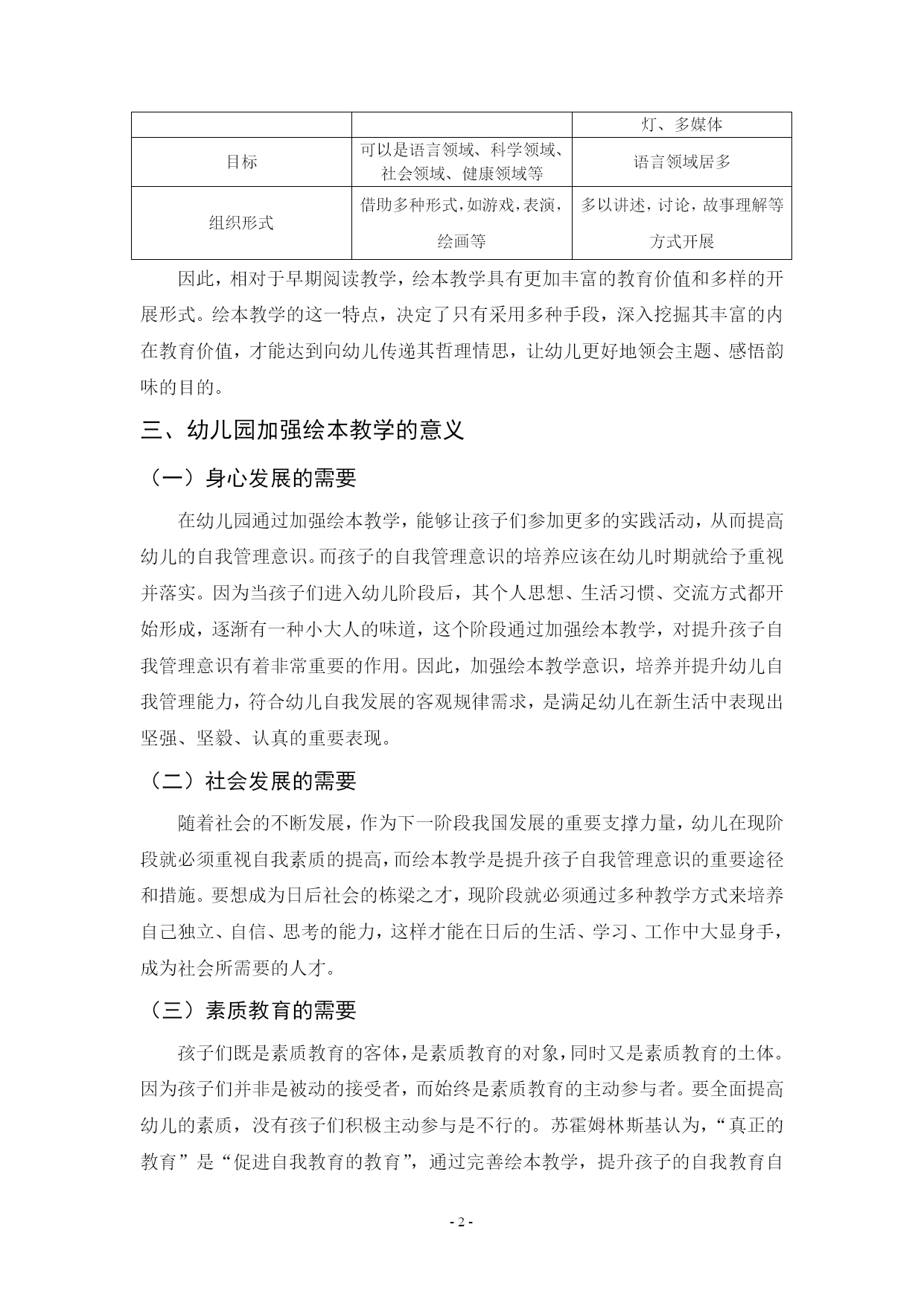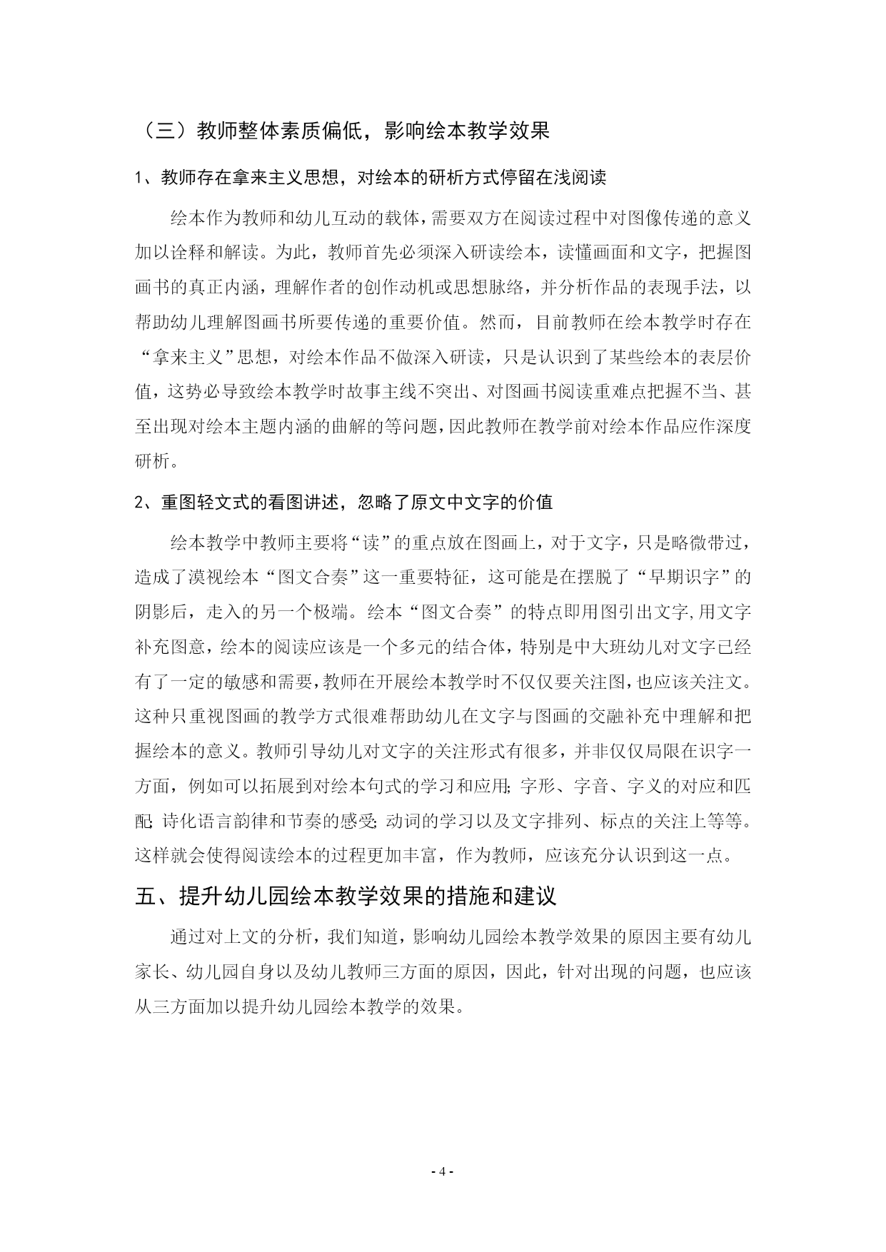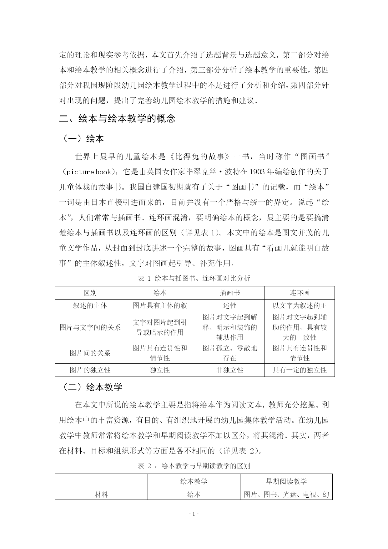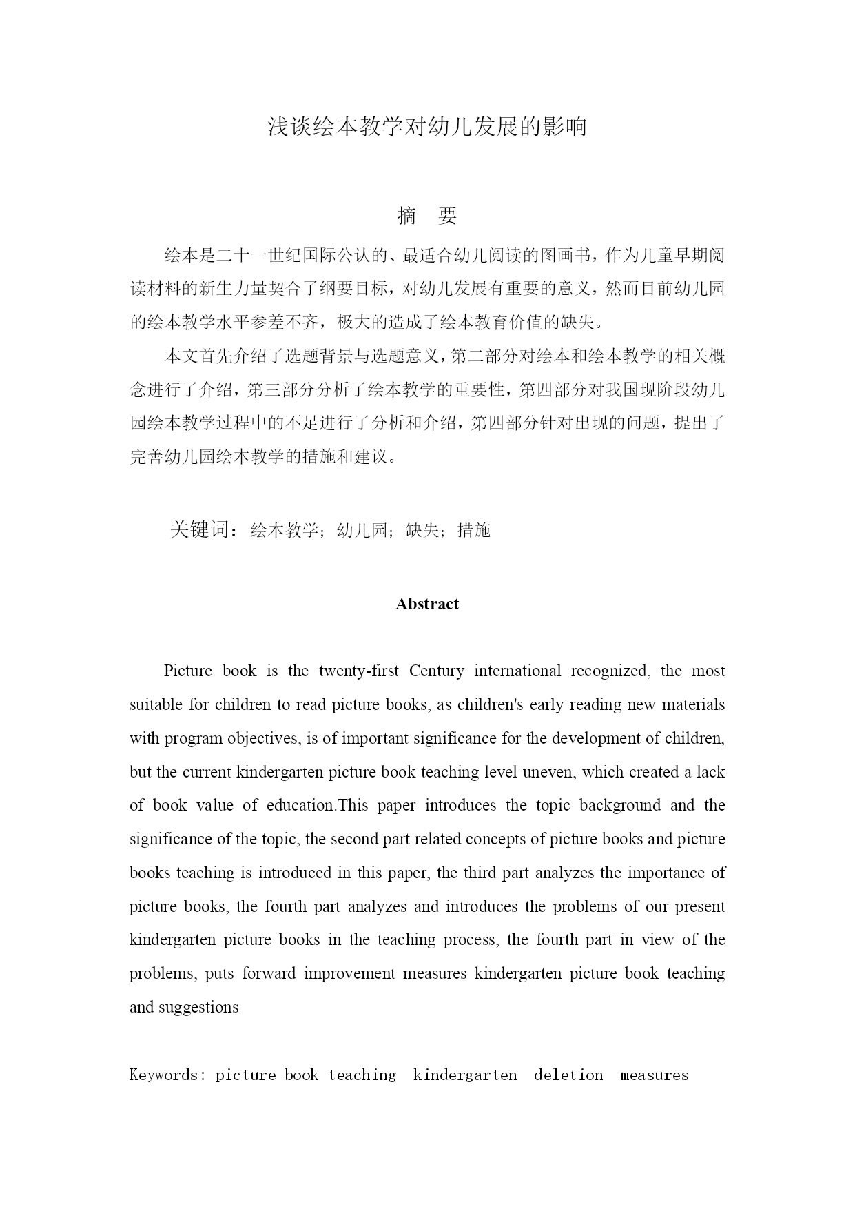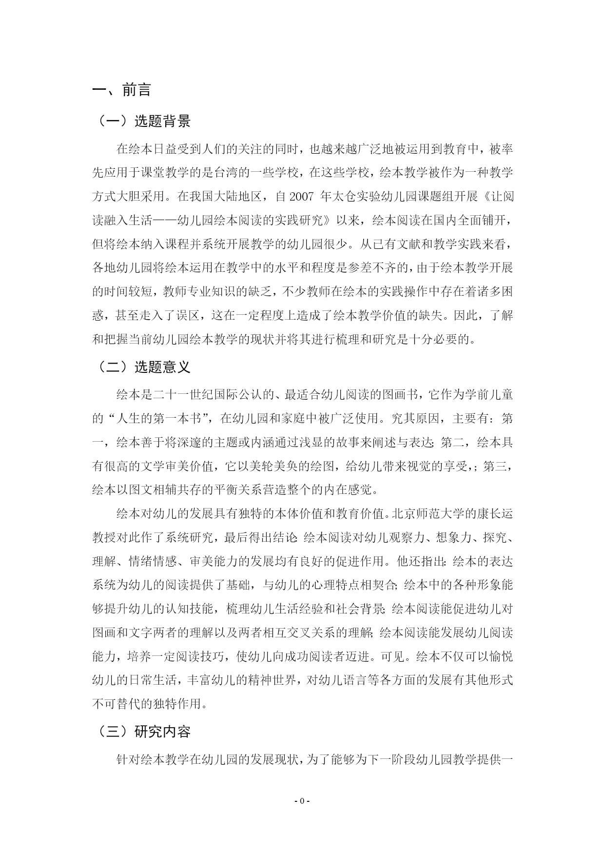 浅谈绘本教学对幼儿发展的影响摘要绘本是二十一世纪国际公认的、最适合幼儿阅读的图画书,作为儿童早期阅读材料的新生力量契合了纲要目标,对幼儿发展有重要的意义,然而目前幼儿园的绘本教学水平参差不齐,极大的造成了绘本教育价值的缺失。本文首先介绍了选题背景与选题意义,第二部分对绘本和绘本教学的相关概念进行了介绍,第三部分分析了绘本教学的重要性,第四部分对我国现阶段幼儿园绘本教学过程中的不足进行了分析和介绍,第四部分针对出现的问题,提出了完善幼儿园绘本教学的措施和建议。关键词:绘本教学;幼儿园;缺失;措施AbstractPicturebookisthetwenty-firstCenturyinternationalrecognized,themostsuitableforchildrentoreadpicturebooks,aschildren'searlyreadingnewmaterialswithprogramobjectives,isofimportantsignificanceforthedevelopmentofchildren,butthecurrentkindergartenpicturebookteachingleveluneven,whichcreatedalackofbookvalueofeducation.Thispaperintroducesthetopicbackgroundandthesignificanceofthetopic,thesecondpartrelatedconceptsofpicturebooksandpicturebooksteachingisintroducedinthispaper,thethirdpartanalyzestheimportanceofpicturebooks,thefourthpartanalyzesandintroducestheproblemsofourpresentkindergartenpicturebooksintheteachingprocess,thefourthpartinviewoftheproblems,putsforwardimprovementmeasureskindergartenpicturebookteachingandsuggestionsKeywords:picturebookteachingkindergartendeletionmeasures目录TOC\o"1-3"\h\z\uHYPERLINK\l"_Toc352229237"一、前言PAGEREF_Toc352229237\h1HYPERLINK\l"_Toc352229238"(一)选题背景PAGEREF_Toc352229238\h1HYPERLINK\l"_Toc352229239"(二)选题意义PAGEREF_Toc352229239\h1HYPERLINK\l"_Toc352229240"(三)研究内容PAGEREF_Toc352229240\h1HYPERLINK\l"_Toc352229241"二、绘本与绘本教学的概念PAGEREF_Toc352229241\h2HYPERLINK\l"_Toc352229242"(一)绘本PAGEREF_Toc352229242\h2HYPERLINK\l"_Toc352229243"(二)绘本教学PAGEREF_Toc352229243\h2HYPERLINK\l"_Toc352229244"三、幼儿园加强绘本教学的意义PAGEREF_Toc352229244\h3HYPERLINK\l"_Toc352229245"(一)身心发展的需要PAGEREF_Toc352229245\h3HYPERLINK\l"_Toc352229246"(二)社会发展的需要PAGEREF_Toc352229246\h3HYPERLINK\l"_Toc352229247"(三)素质教育的需要PAGEREF_Toc352229247\h3HYPERLINK\l"_Toc352229248"四、我国现阶段绘本教学的现状分析PAGEREF_Toc352229248\h4HYPERLINK\l"_Toc352229249"(一)家长因素的制约,影响绘本教学效果PAGEREF_Toc352229249\h4HYPERLINK\l"_Toc352229250"(二)学校因素制约,影响绘本教学的效果PAGEREF_Toc3