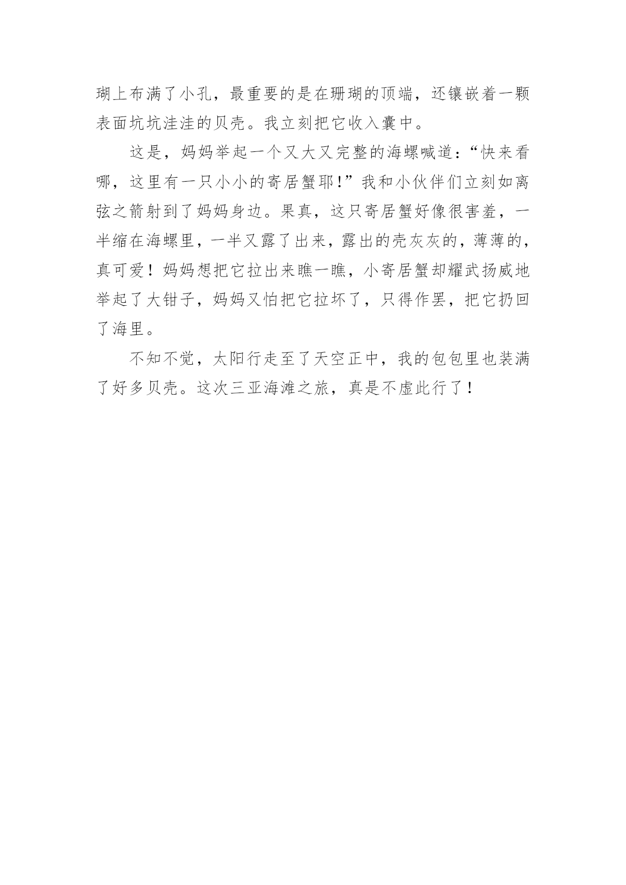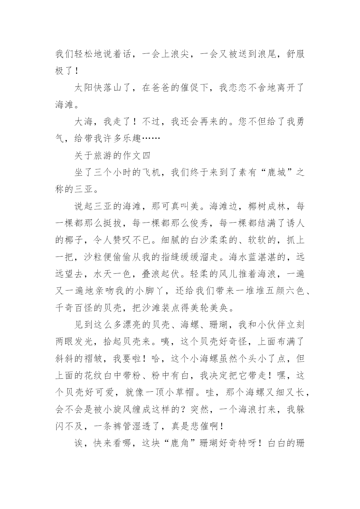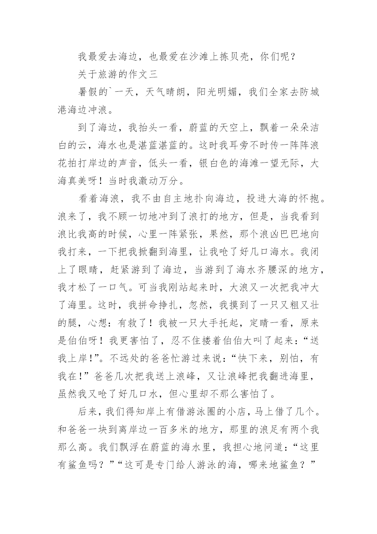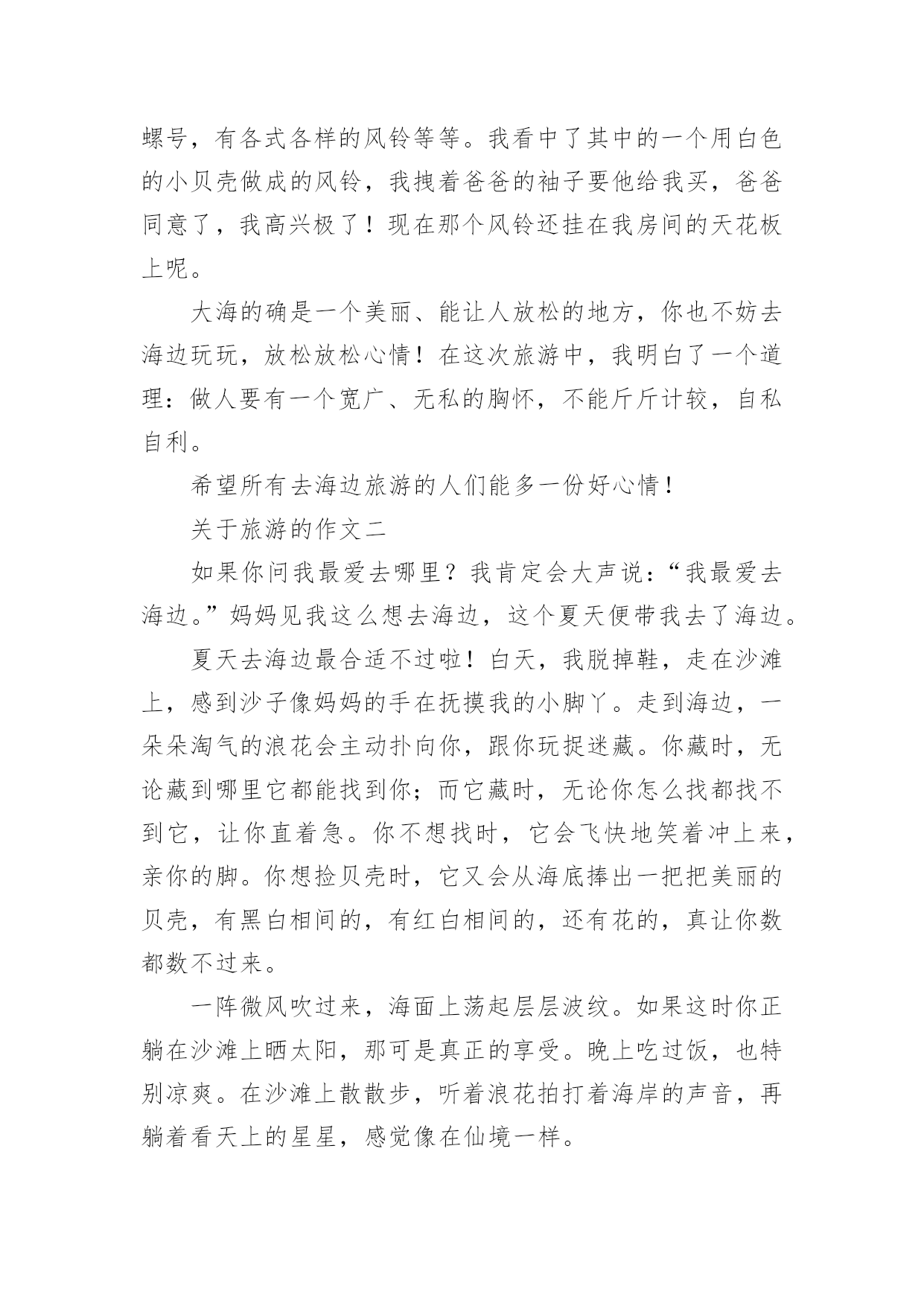 海边的旅游作文海边的旅游作文关于旅游的作文一大海蕴藏着许许多多的“宝藏”,在人类的心目中它可是一个资源丰富的“百宝箱”!听妈妈说,大海的景色很美丽。于是我便在心中想象大海的那种波澜壮阔、汹涌澎湃的景象来;那景象雄伟极了。我又日盼夜盼,能亲眼目睹一下大海的雄姿!终于有一天,我们一家去海边旅游,让我真正的领略了这雄壮的景色!来到海边,放眼望去是一望无际的蔚蓝色的海洋。举目四望,茫茫的一片海洋,万里的长空飘着几朵洁白的云朵,大海的碧波时而泛起朵朵涟漪。海天一色,沧海茫茫,看着潮起又潮落,聆听着浪花拍打着海岸的声音。我想这一定是大自然在为海岸上度假的人们演奏着悦耳动听的音乐,人们也正都在尽情地享受着大海的风情。沙滩上的人虽然不是很多,但使这片金黄的沙滩多了一份宁静,少了一份喧嚣。人们在岸上追逐嬉戏,玩得可开心拉!都早已把平时的烦恼抛到了九霄云外。海边的风很大,我和爸爸跃过一块又一块礁石,尽情地领略着赤足在礁石上的感觉。走在沙滩上,感到自己好像已经远离了从前的那些不愉快的事,也只剩下了对大海的依恋,依恋大海的宽广和无私,对大海油然而生肃然起敬之情。岸上卖着许许多多的工艺品,有贝壳做成的大小不一的螺号,有各式各样的风铃等等。我看中了其中的一个用白色的小贝壳做成的风铃,我拽着爸爸的袖子要他给我买,爸爸同意了,我高兴极了!现在那个风铃还挂在我房间的天花板上呢。大海的确是一个美丽、能让人放松的地方,你也不妨去海边玩玩,放松放松心情!在这次旅游中,我明白了一个道理:做人要有一个宽广、无私的胸怀,不能斤斤计较,自私自利。希望所有去海边旅游的人们能多一份好心情!关于旅游的作文二如果你问我最爱去哪里?我肯定会大声说:“我最爱去海边。”妈妈见我这么想去海边,这个夏天便带我去了海边。夏天去海边最合适不过啦!白天,我脱掉鞋,走在沙滩上,感到沙子像妈妈的手在抚摸我的小脚丫。走到海边,一朵朵淘气的浪花会主动扑向你,跟你玩捉迷藏。你藏时,无论藏到哪里它都能找到你;而它藏时,无论你怎么找都找不到它,让你直着急。你不想找时,它会飞快地笑着冲上来,亲你的脚。你想捡贝壳时,它又会从海底捧出一把把美丽的贝壳,有黑白相间的,有红白相间的,还有花的,真让你数都数不过来。一阵微风吹过来,海面上荡起层层波纹。如果这时你正躺在沙滩上晒太阳,那可是真正的享受。晚上吃过饭,也特别凉爽。在沙滩上散散步,听着浪花拍打着海岸的声音,再躺着看天上的星星,感觉像在仙境一样。我最爱去海边,也最爱在沙滩上拣贝壳,你们呢?关于旅游的作文三暑假的`一天,天气晴朗,阳光明媚,我们全家去防城港海边冲浪。到了海边,我抬头一看,蔚蓝的天空上,飘着一朵朵洁白的云,海水也是湛蓝湛蓝的。这时我耳旁不时传一阵阵浪花拍打岸边的声音,低头一看,银白色的海滩一望无际,大海真美呀!当时我激动万分。看着海浪,我不由自主地扑向海边,投进大海的怀抱。浪来了,我不顾一切地冲到了浪打的地方,但是,当我看到浪比我高的时候,心里一阵紧张,果然,那个浪凶巴巴地向我打来,一下把我掀翻到海里,让我呛了好几口海水。我闭上了眼睛,赶紧游到了海边,当游到了海水齐腰深的地方,我才松了一口气。可当我刚站起来时,大浪又一次把我冲大了海里。这时,我拼命挣扎,忽然,我摸到了一只又粗又壮的腿,心想:有救了!我被一只大手托起,定睛一看,原来是伯伯呀!我更害怕了,忍不住搂着伯伯大叫了起来:“送我上岸!”。不远处的爸爸忙游过来说:“快下来,别怕,有我在!”爸爸几次把我送上浪峰,又让浪峰把我翻进海里,虽然我又呛了好几口水,但心里却不那么害怕了。后来,我们得知岸上有借游泳圈的小店,马上借了几个。和爸爸一块到离岸边一百多米的地方,那里的浪足有两个我那么高。我们飘浮在蔚蓝的海水里,我担心地问道:“这里有鲨鱼吗?”“这可是专门给人游泳的海,哪来地鲨鱼?”我们轻松地说着话,一会上浪尖,一会又被送到浪尾,舒服极了!太阳快落山了,在爸爸的催促下,我恋恋不舍地离开了海滩。大海,我走了!不过,我还会再来的。您不但给了我勇气,给带我许多乐趣……关于旅游的作文四坐了三个小时的飞机,我们终于来到了素有“鹿城”之称的三亚。说起三亚的海滩,那可真叫美。海滩边,椰树成林,每一棵都那么挺拔,每一棵都那么俊秀,每一棵都结满了诱人的椰子,令人赞叹不已。细腻的白沙柔柔的、软软的,抓上一把,沙粒便偷偷从我的指缝缓缓溜走。海水蓝湛湛的,远远望去,水天一色,叠浪起伏。轻柔的风儿推着海浪,一遍又一遍地亲吻我的小脚丫,还给我们带来一堆堆五颜六色、千奇百怪的贝壳,把沙滩装点得美轮美奂。见到这么多漂亮的贝壳、海螺、珊瑚,我和小伙伴立刻两眼发光,拾起贝壳来。咦,这个贝壳好奇怪,上面布满了斜斜的褶皱,我要啦!哈,这个小海螺虽然个头小了点,但上面的花纹白中带粉、粉中有白,我决定把它带走!嘿,这个贝壳好可爱,就像一顶小草帽。哇,